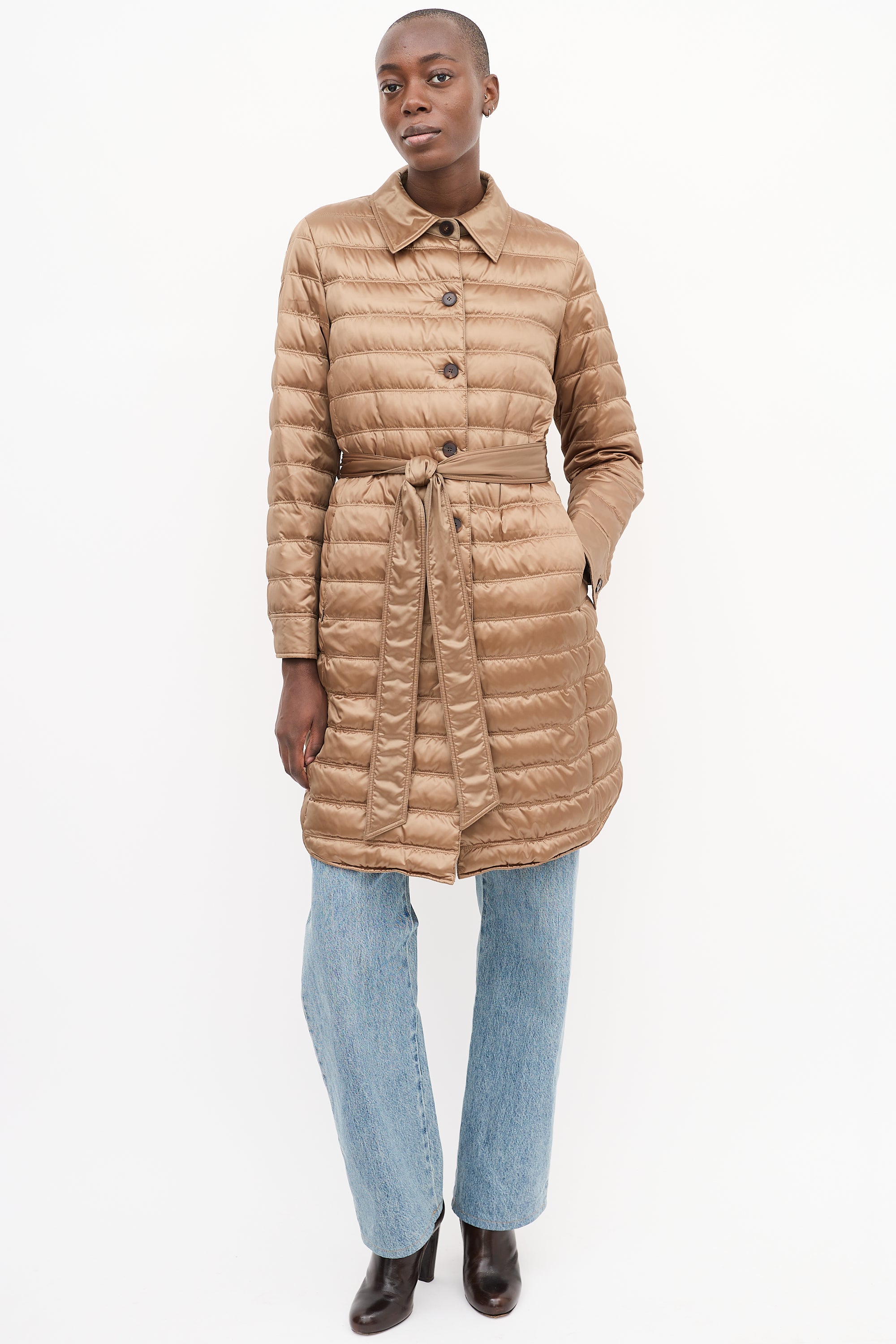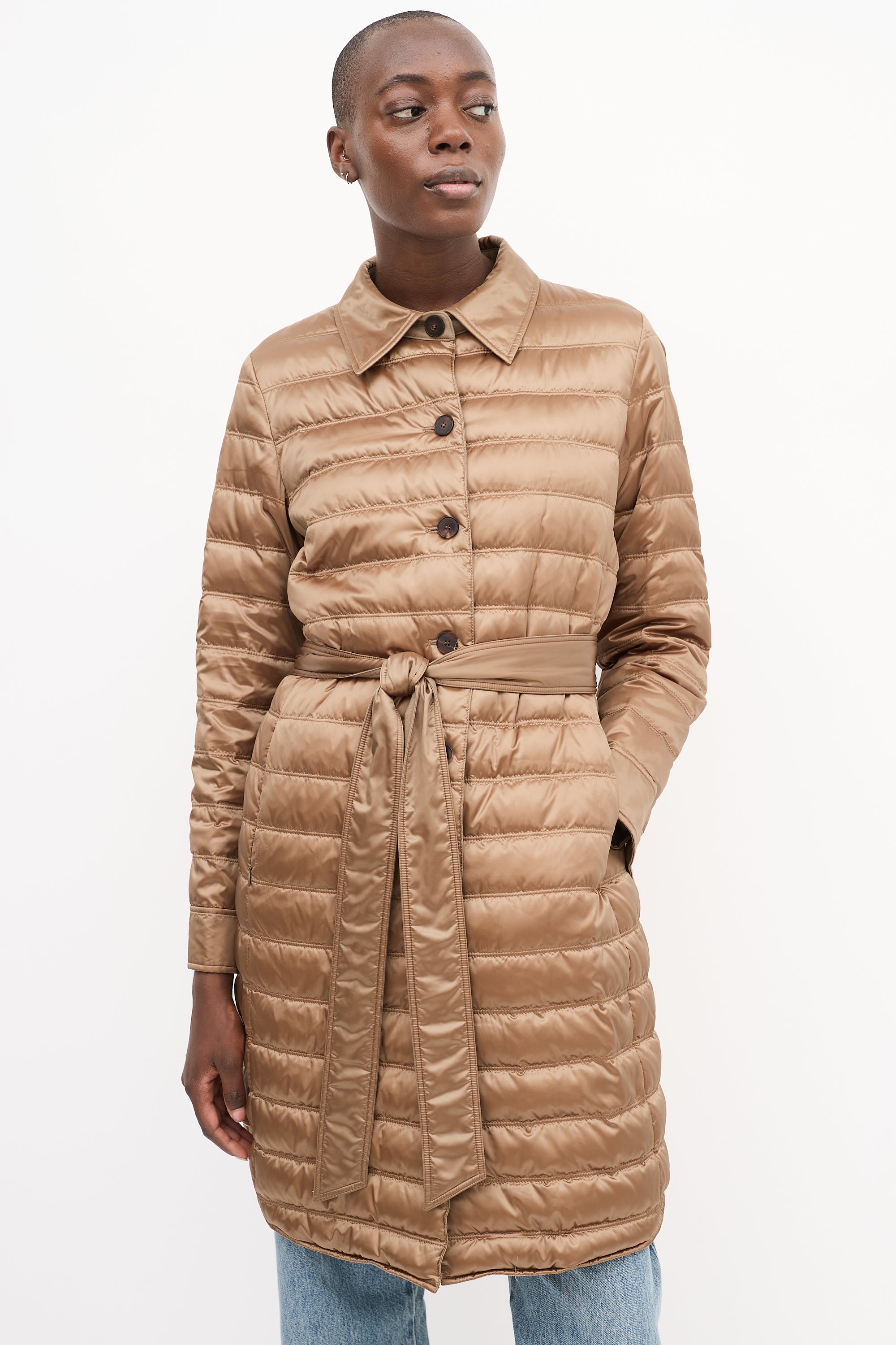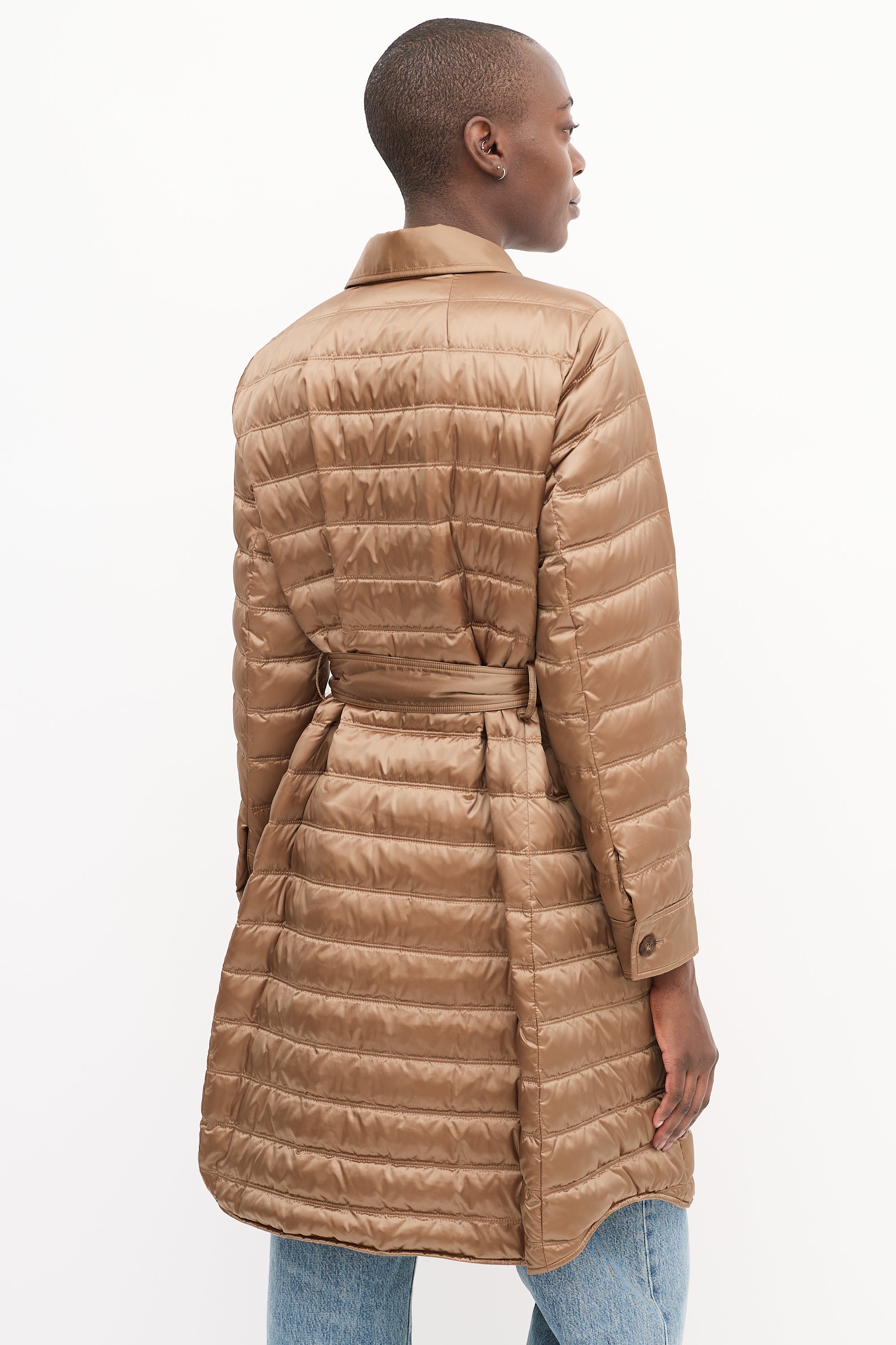 Pre-owned Lafayette 148 brown metallic down puffer coat featuring classic collar, buttoned front, buttoned cuffs, two zip pockets at hips, belt loops, and tonal self tie waist belt. Lined.