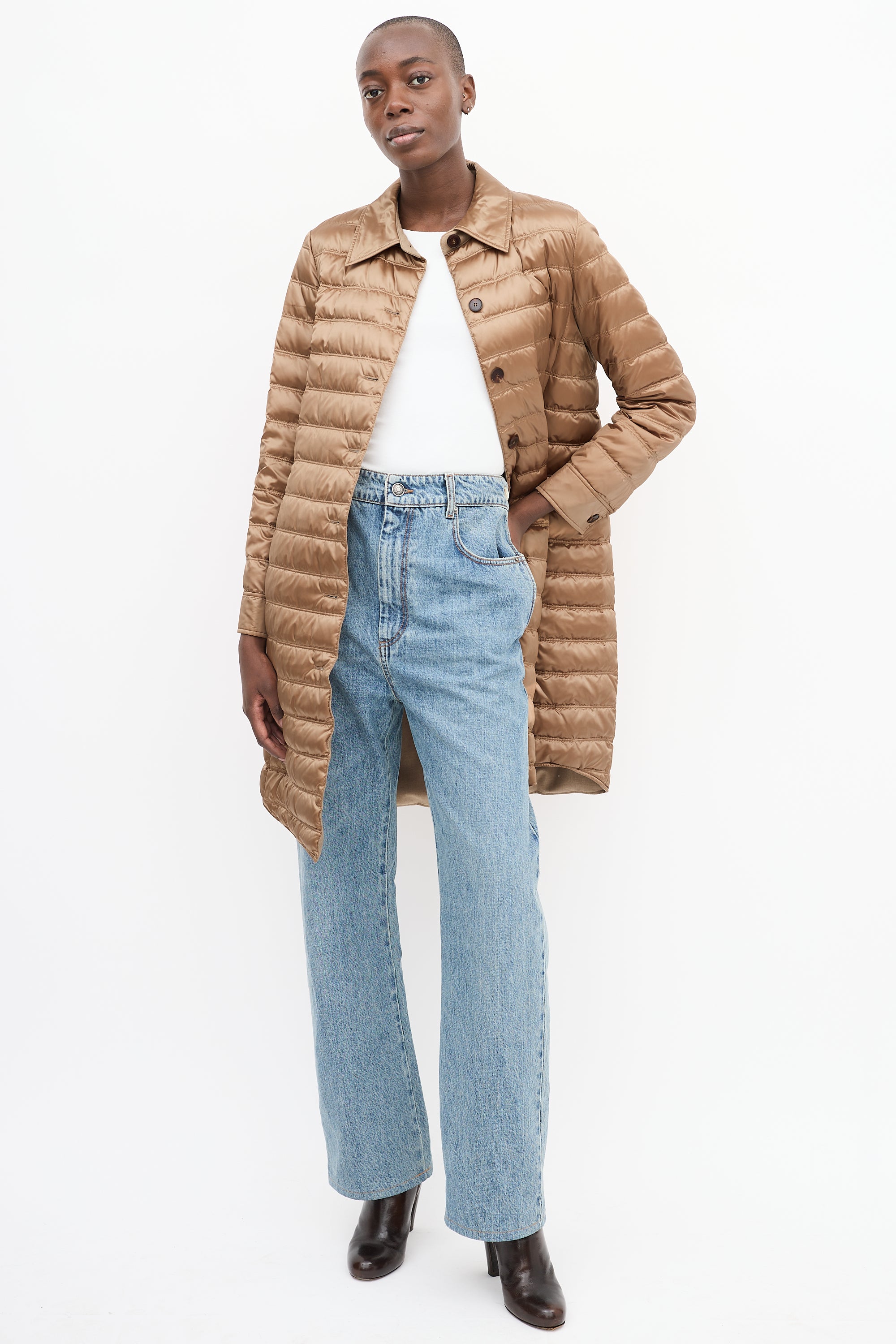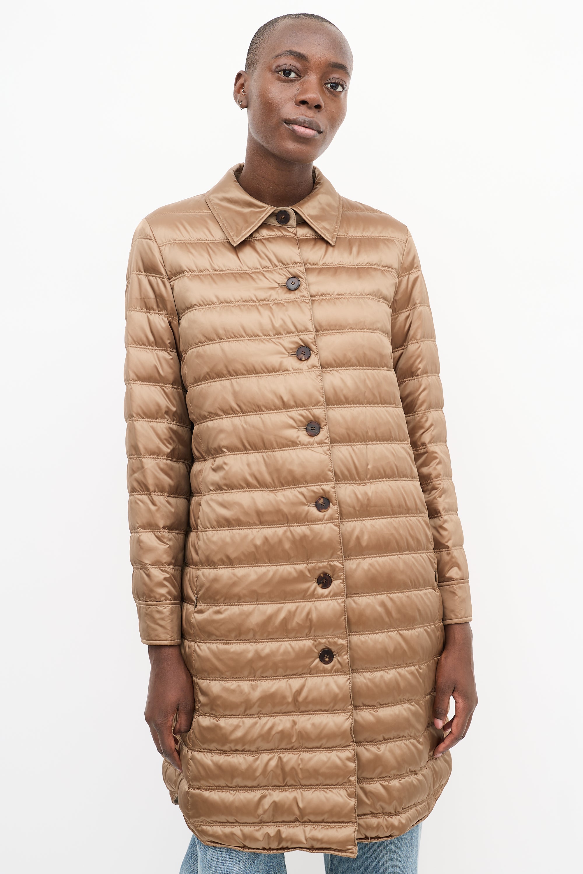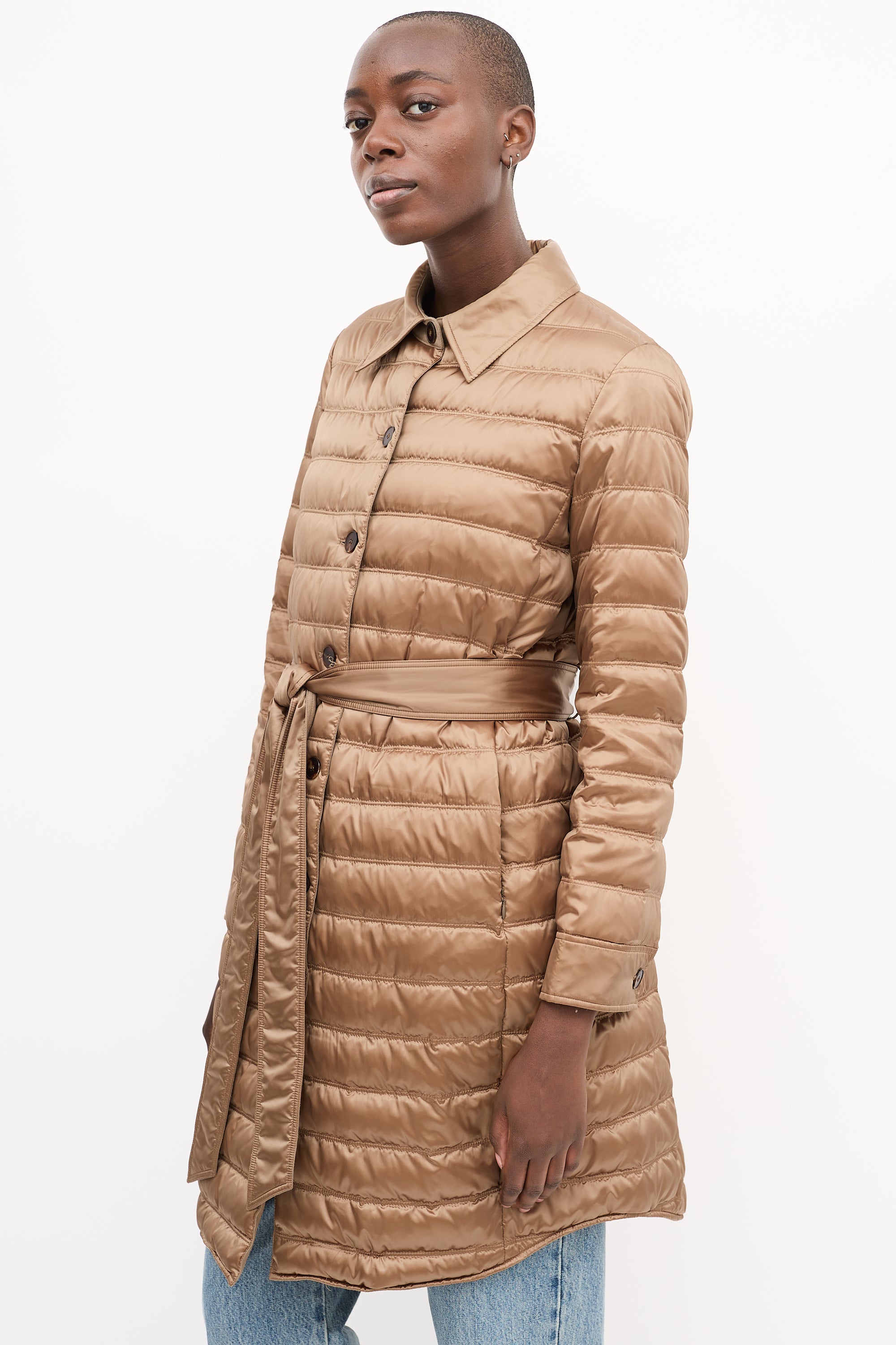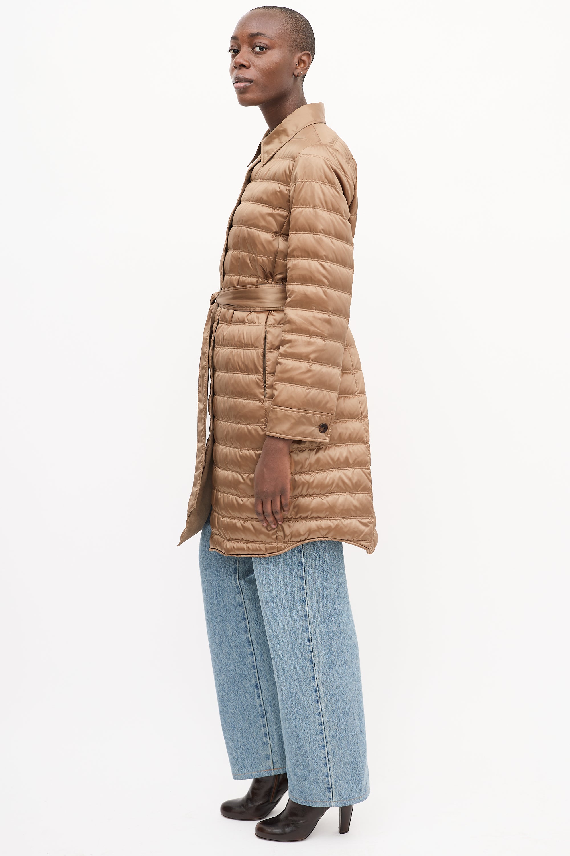 Pre-owned Lafayette 148 brown metallic down puffer coat featuring classic collar, buttoned front, buttoned cuffs, two zip pockets at hips, belt loops, and tonal self tie waist belt. Lined.