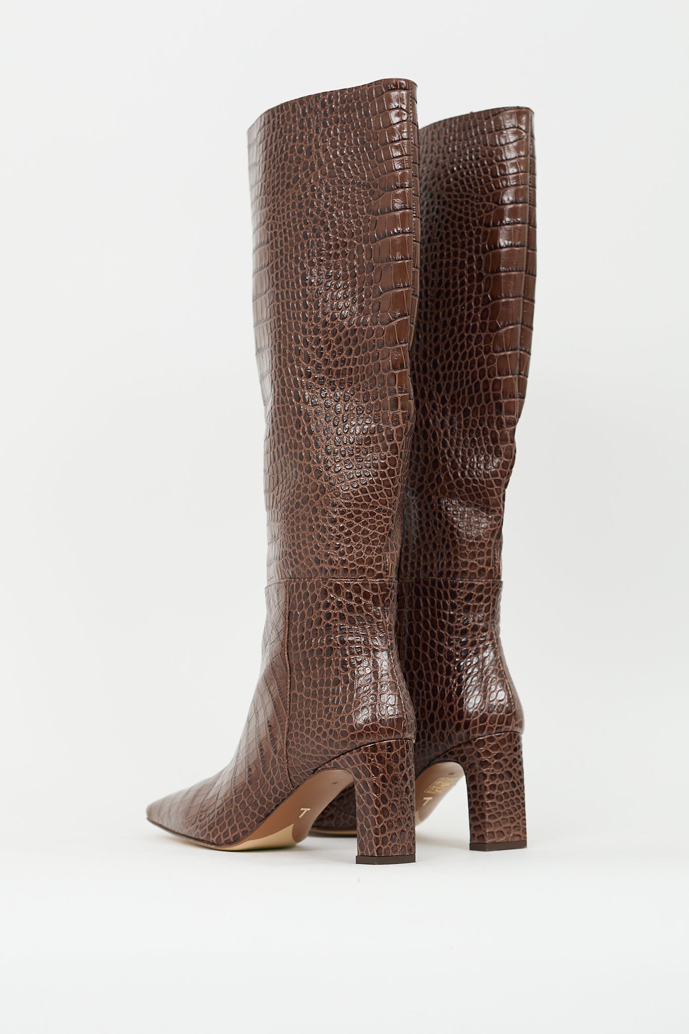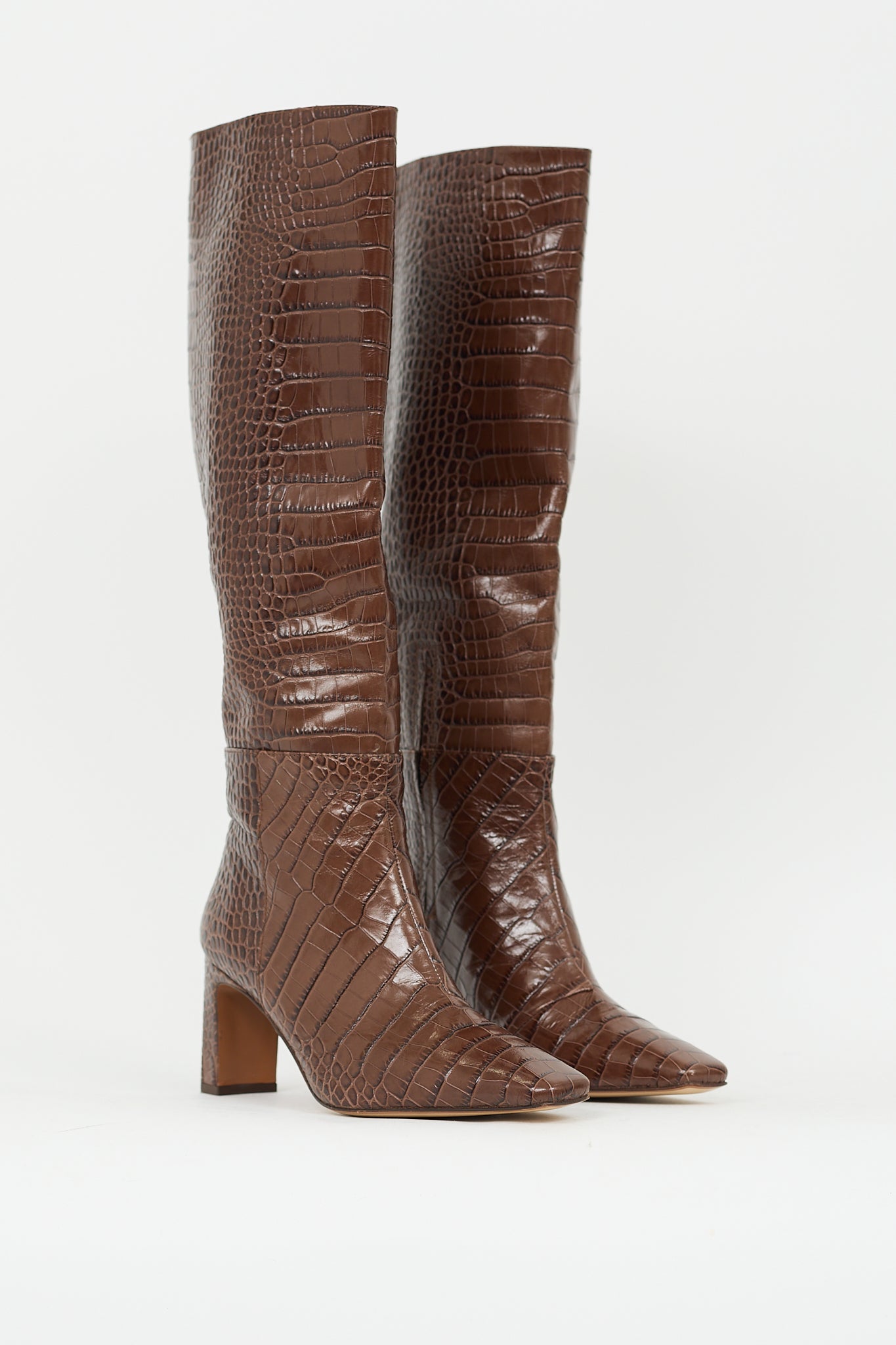 Pre-owned Lafayette 148 brown leather boots featuring tapered square toe, croc effect leather upper, covered block heel, and pull on entry.