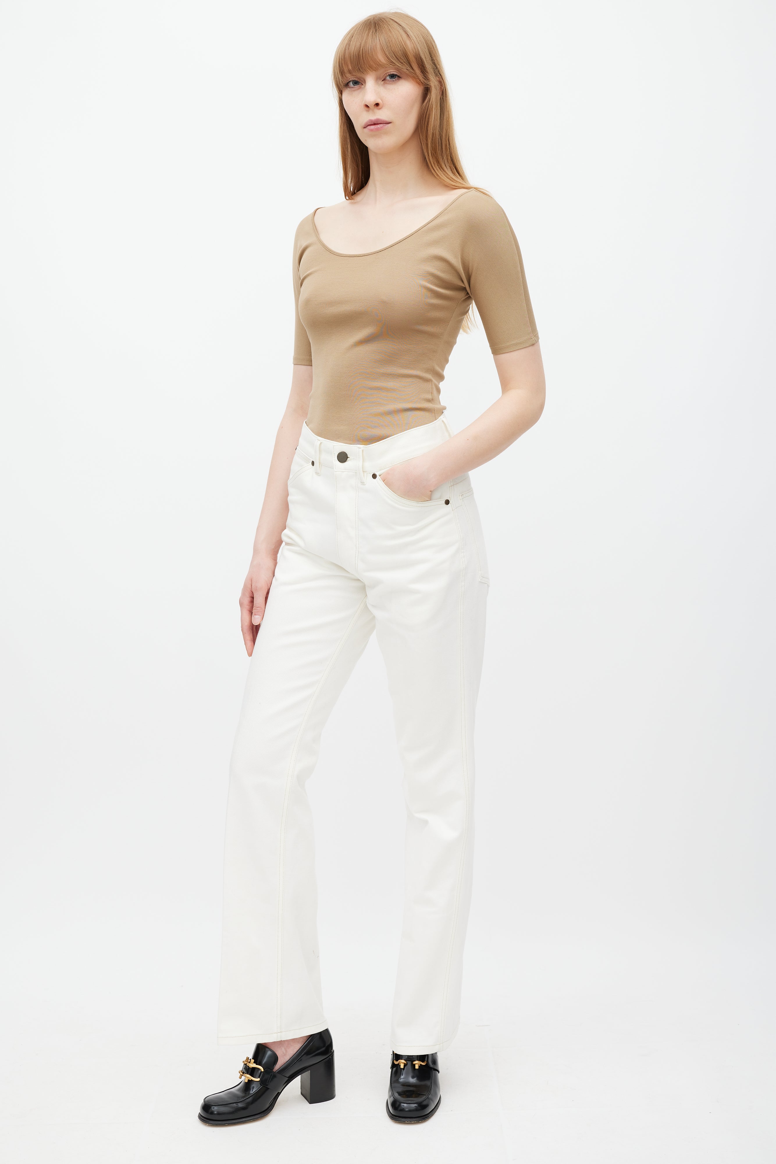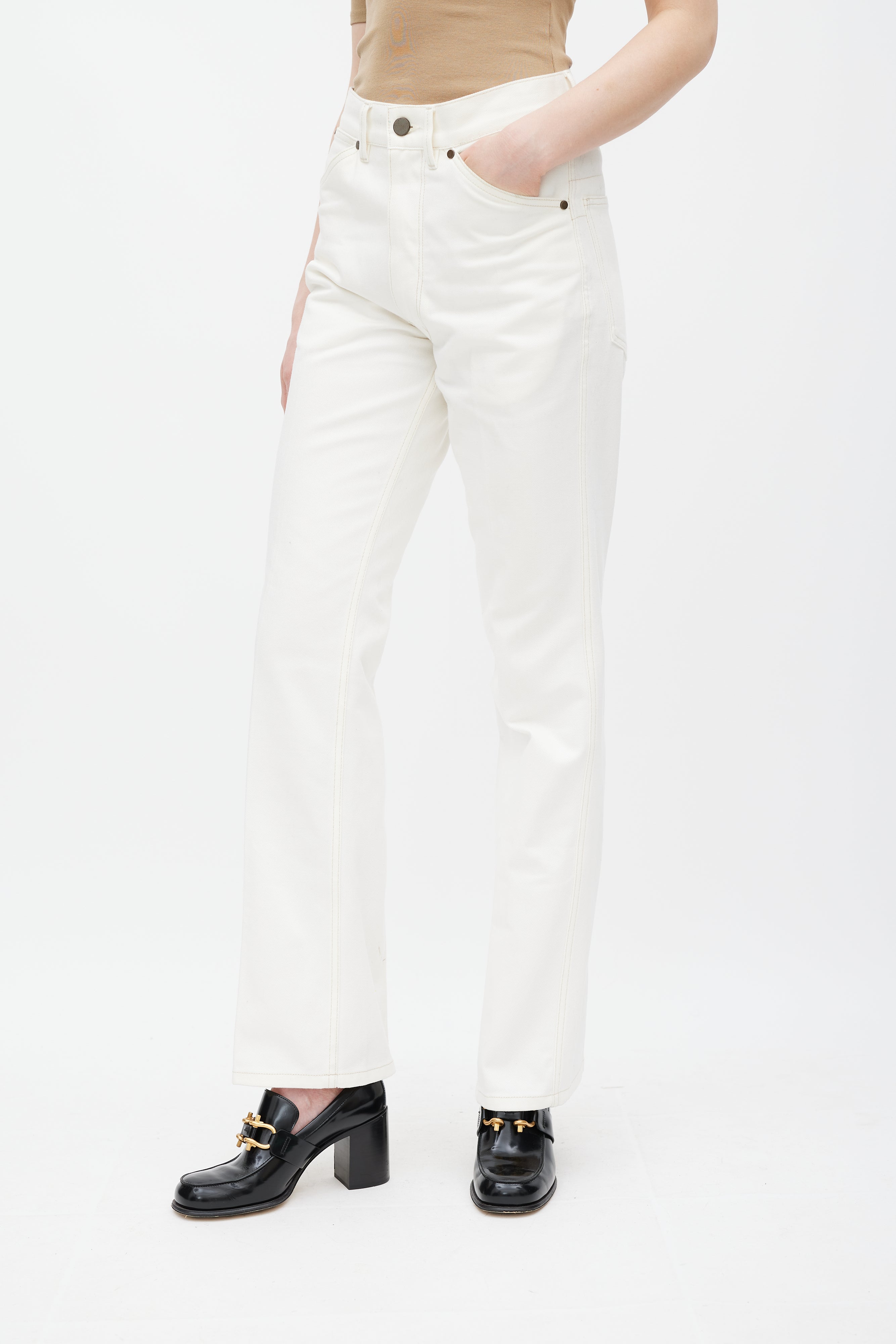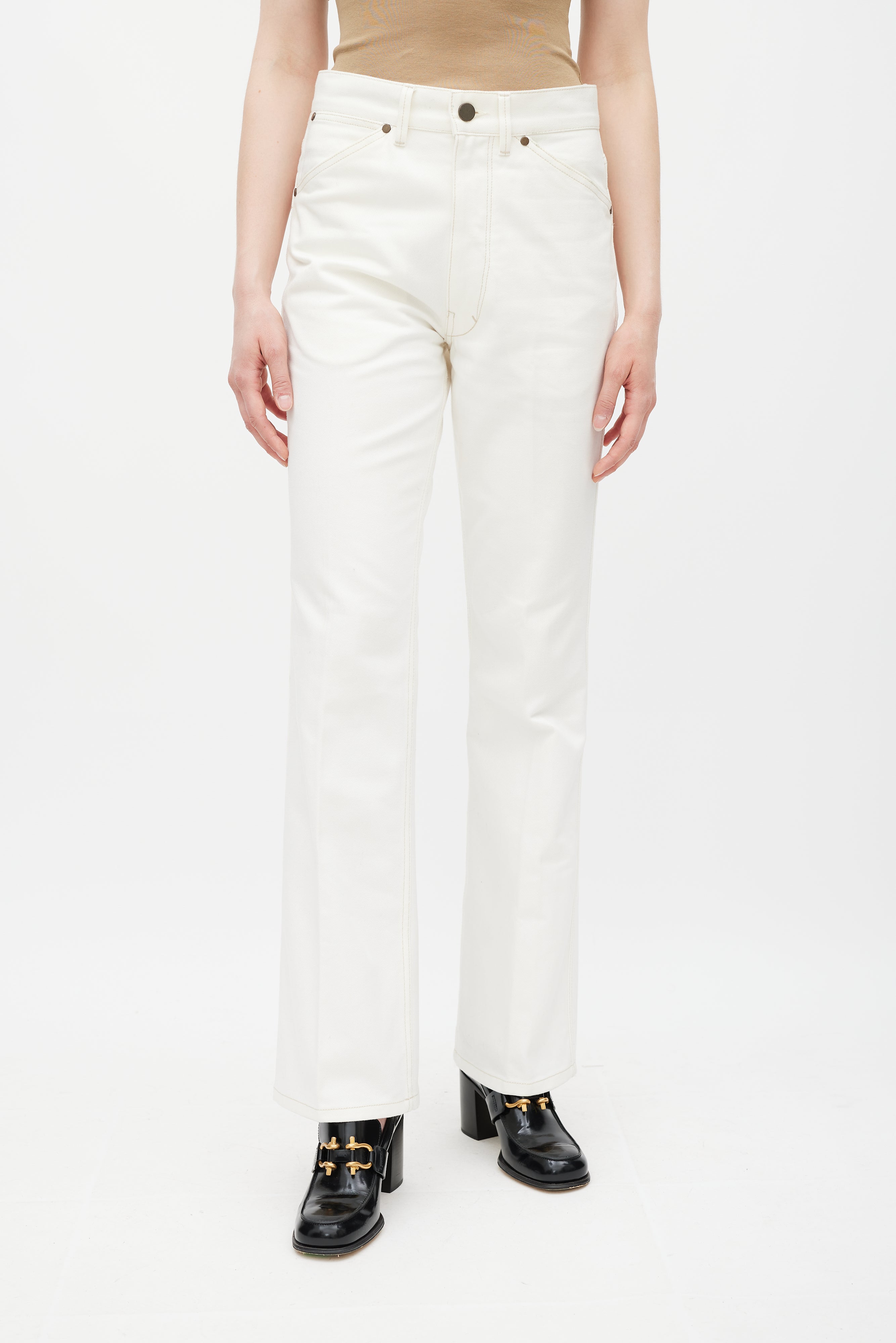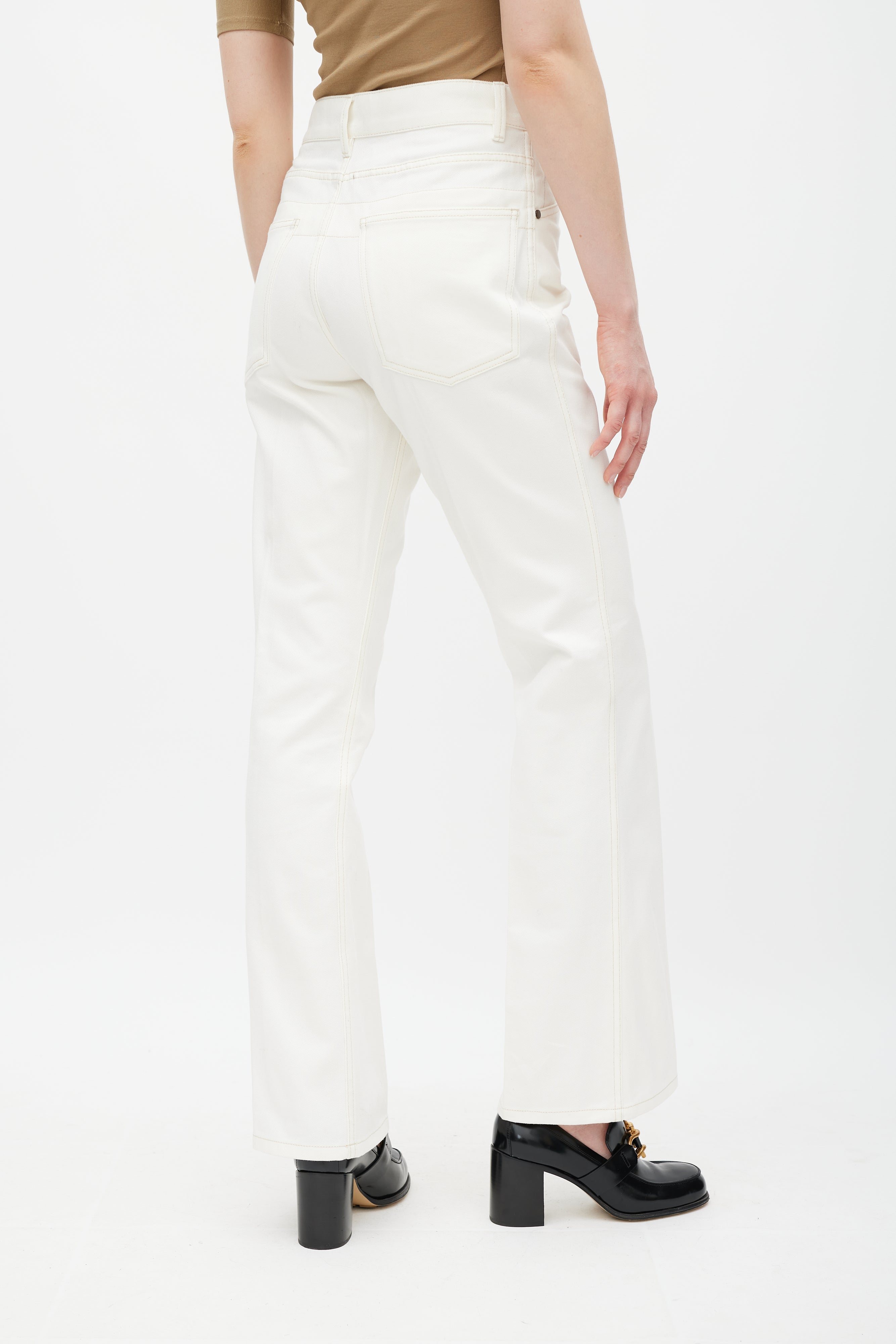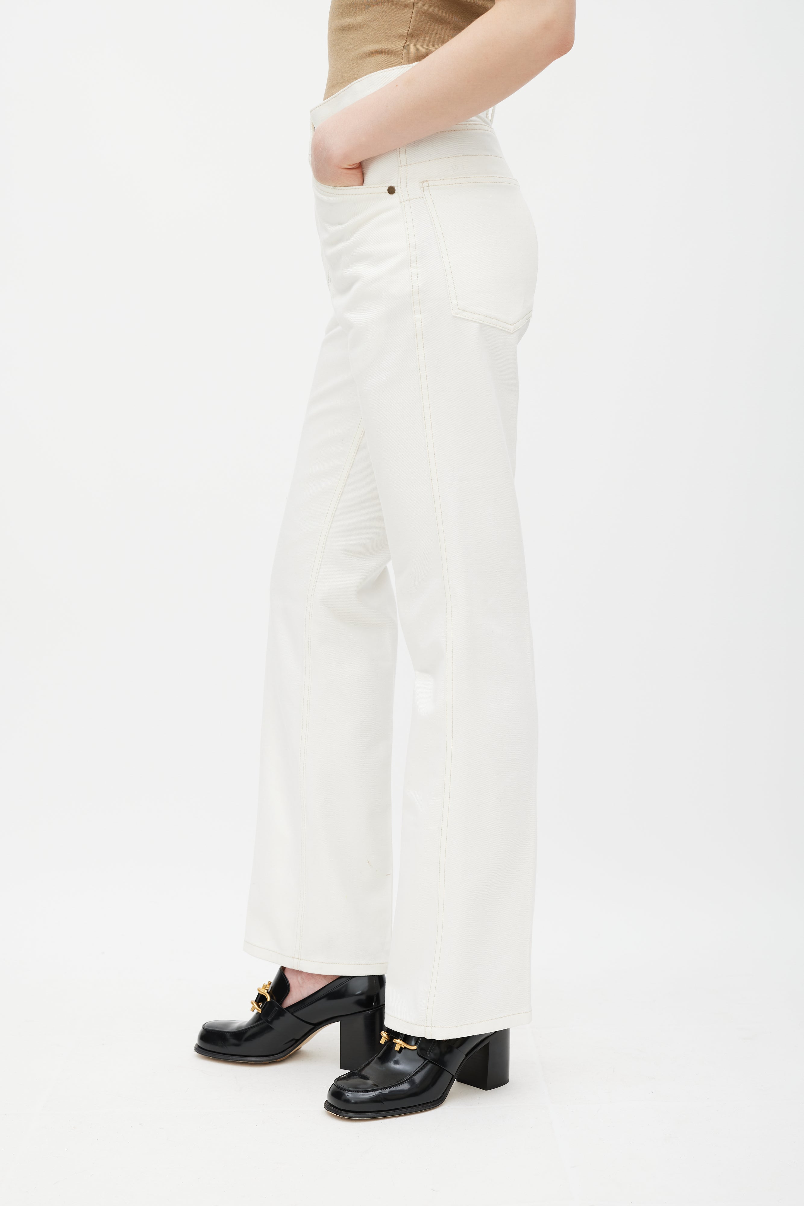 Pre-owned Lemaire white jeans featuring beige contrast stitching throughout, high waist, five pocket styling, straight leg with creases, and front zip with exposed top button fastening.