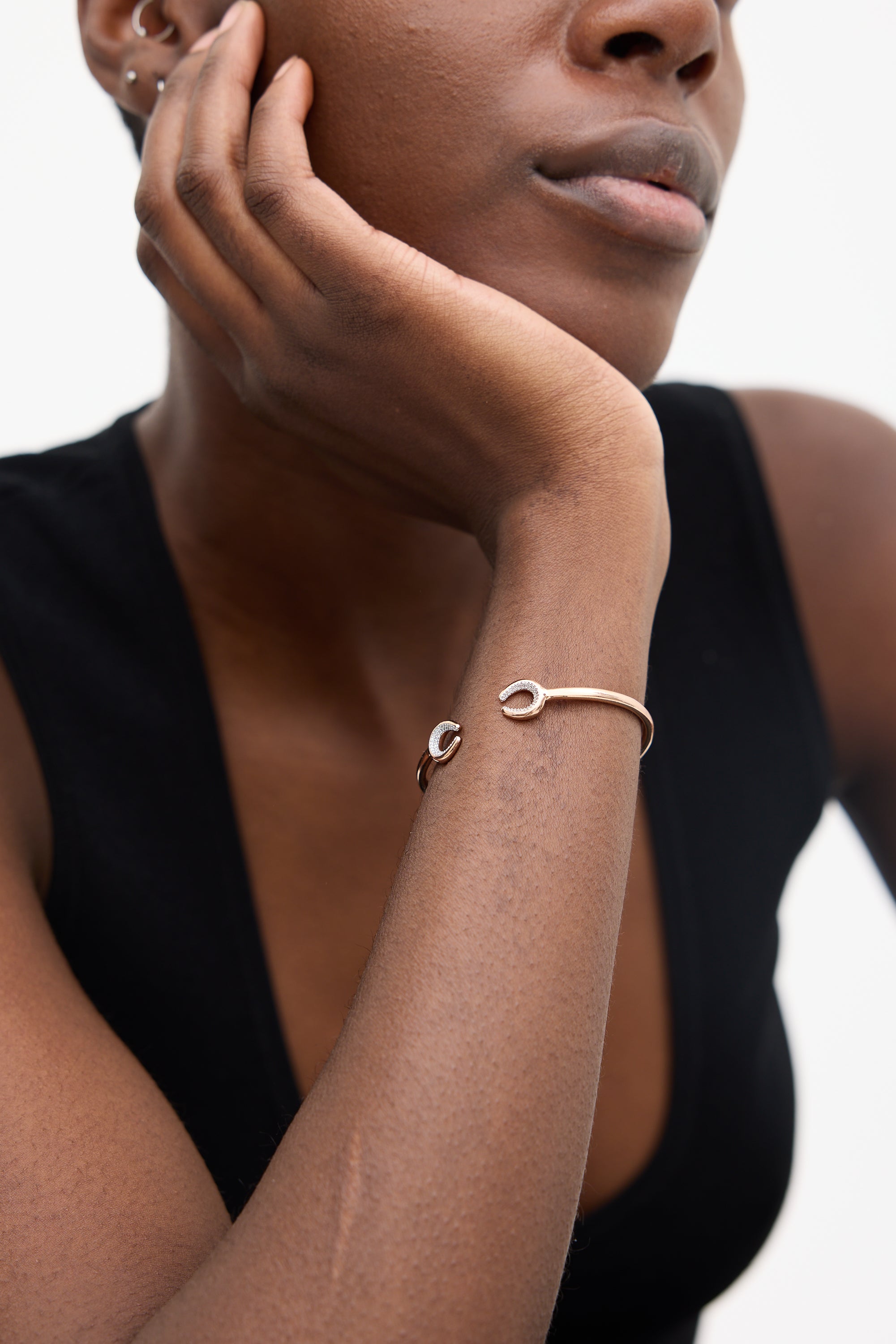 Pre-owned Links of London rose gold plated Ascott cuff bracelet featuring open design and dual diamond pavé horseshoe motifs at ends. Stamped with designer signature, hallmark symbols, "M", and "S925."