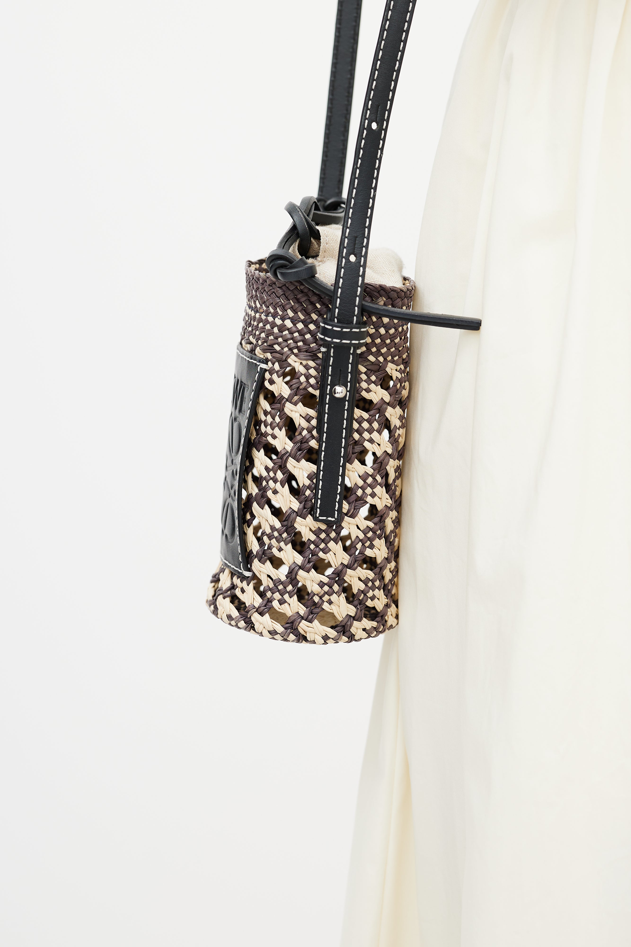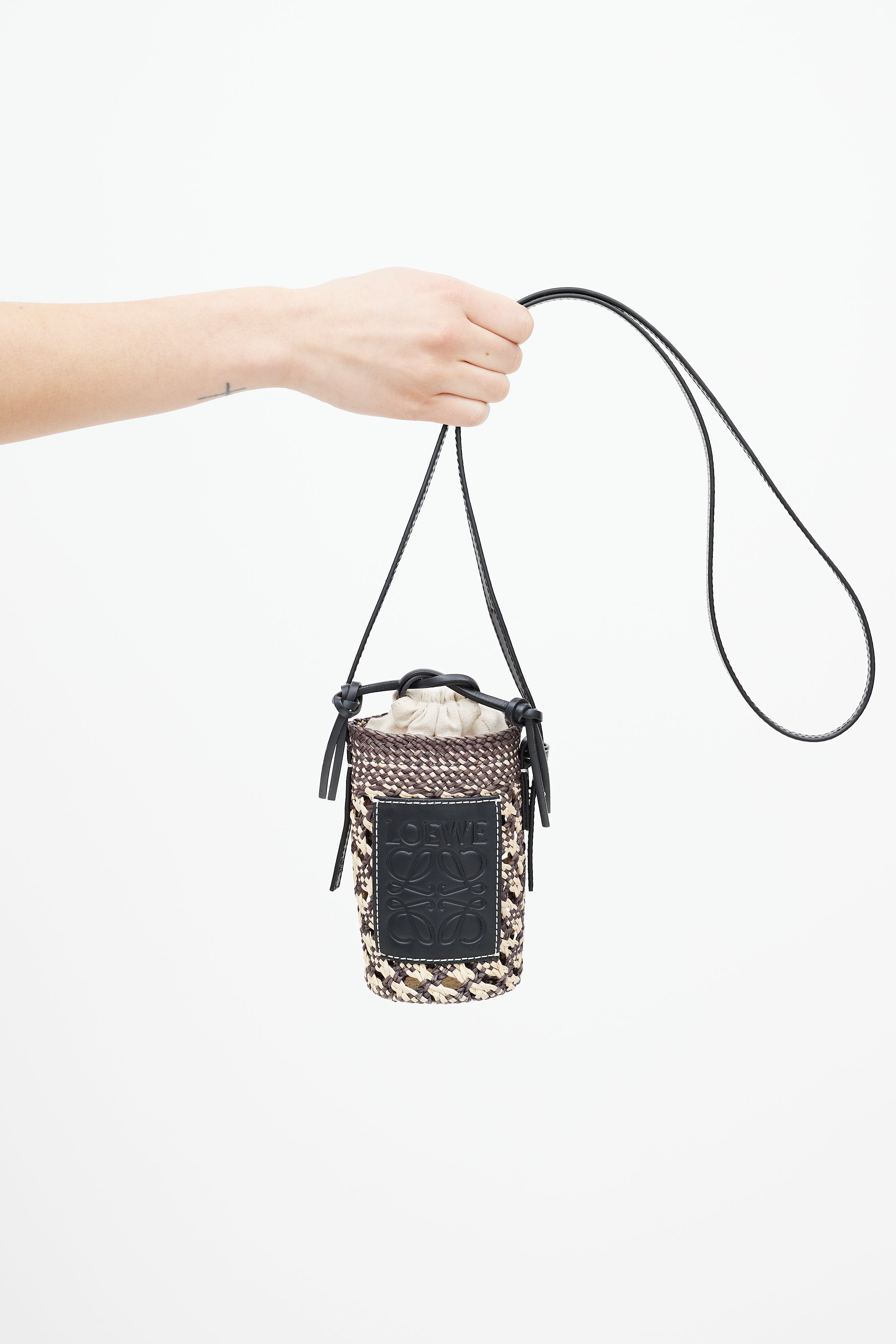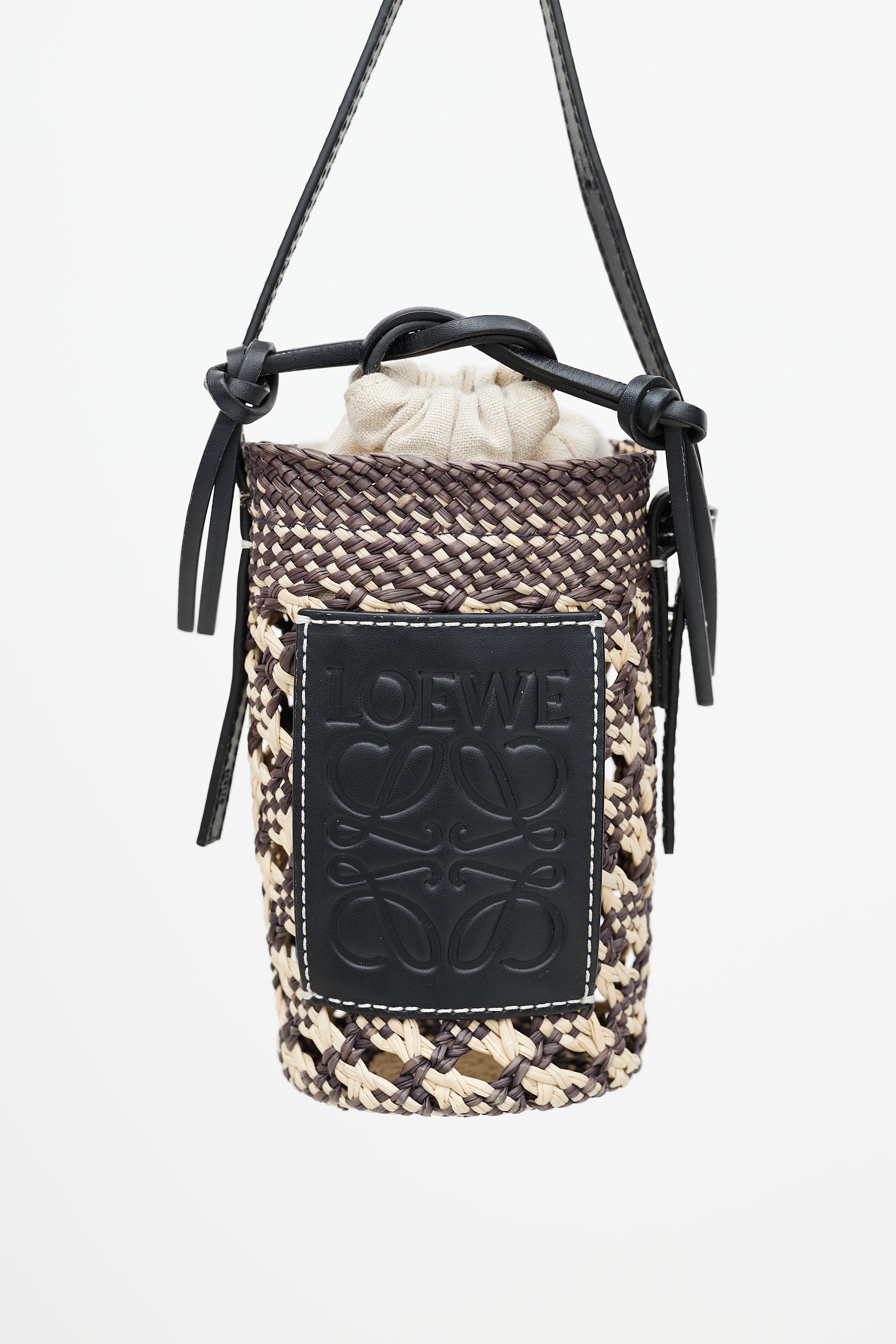 Pre-owned 2021 Loewe cylinder pocket bag featuring leather drawstring closure at top, silver tone hardware. single adjustable shoulder strap, black and neutral raffia, and leather tonal logo patch at front. Unlined. Comes with original dust bag and box. Entrupy Certificate Included.