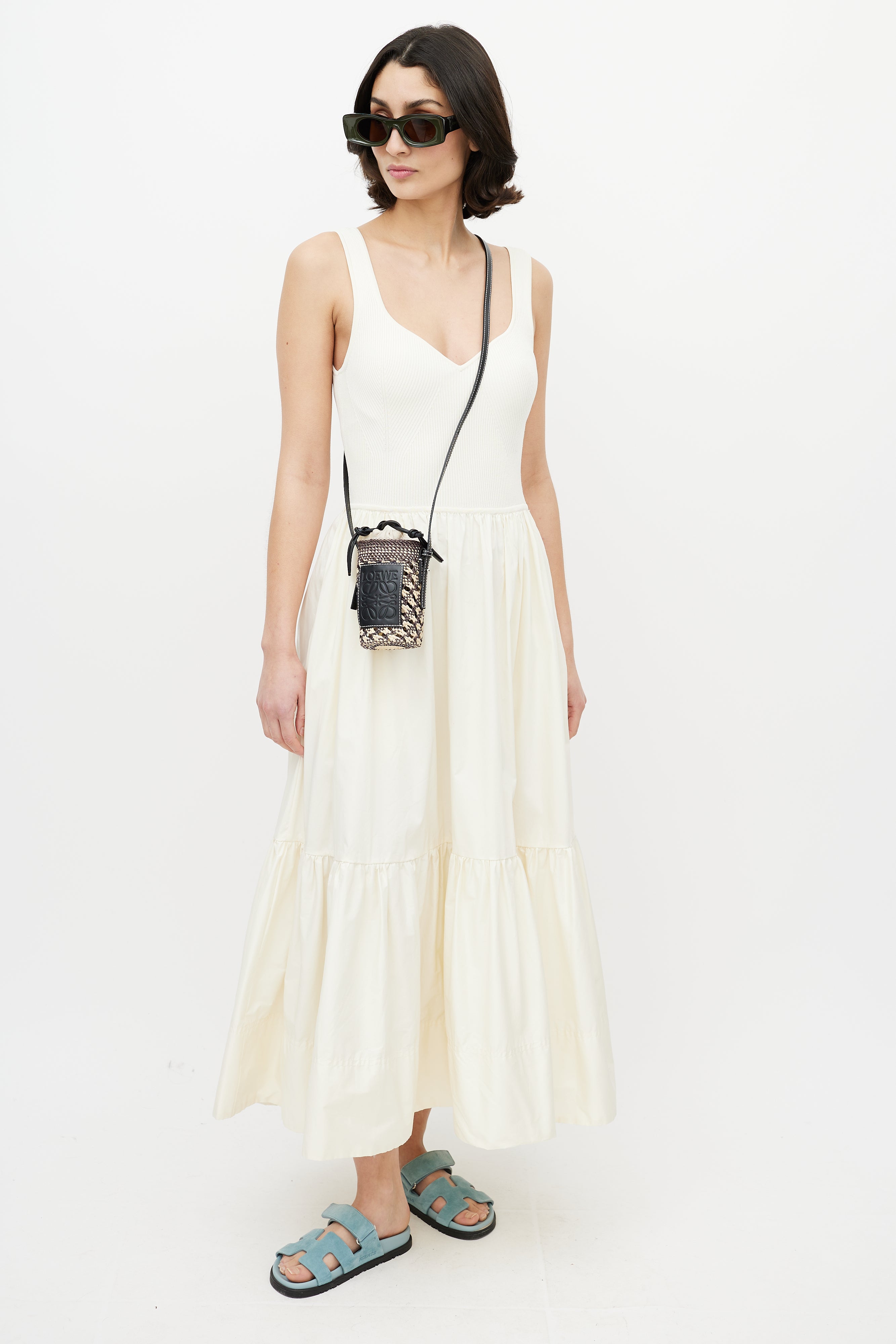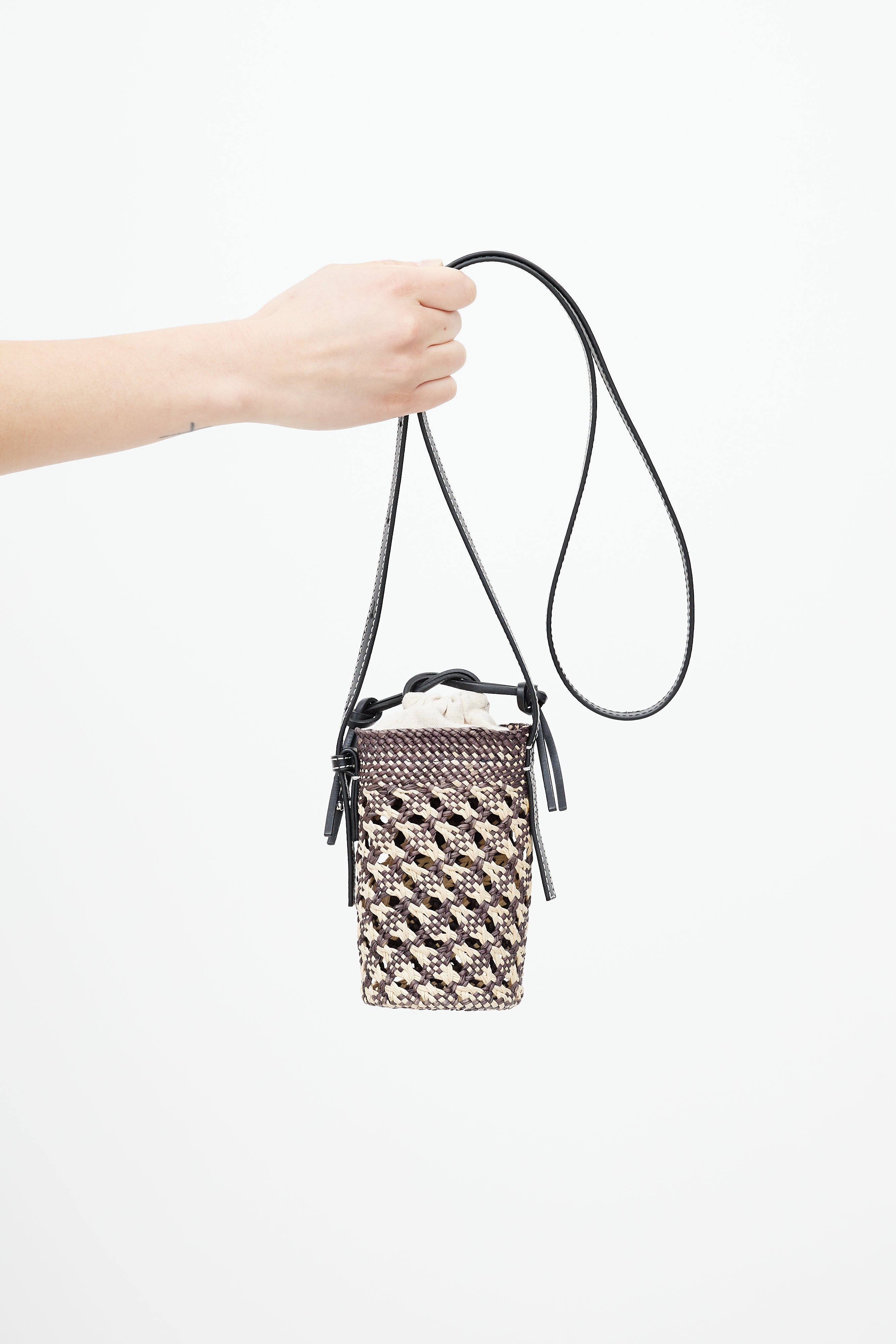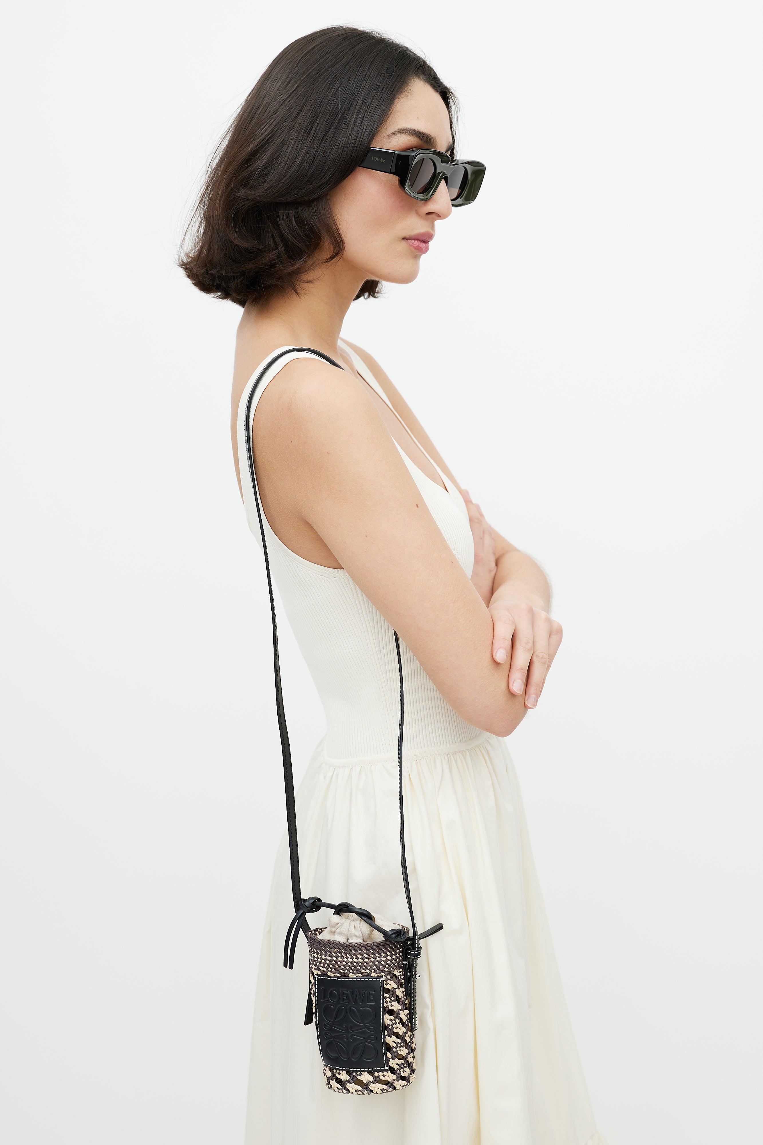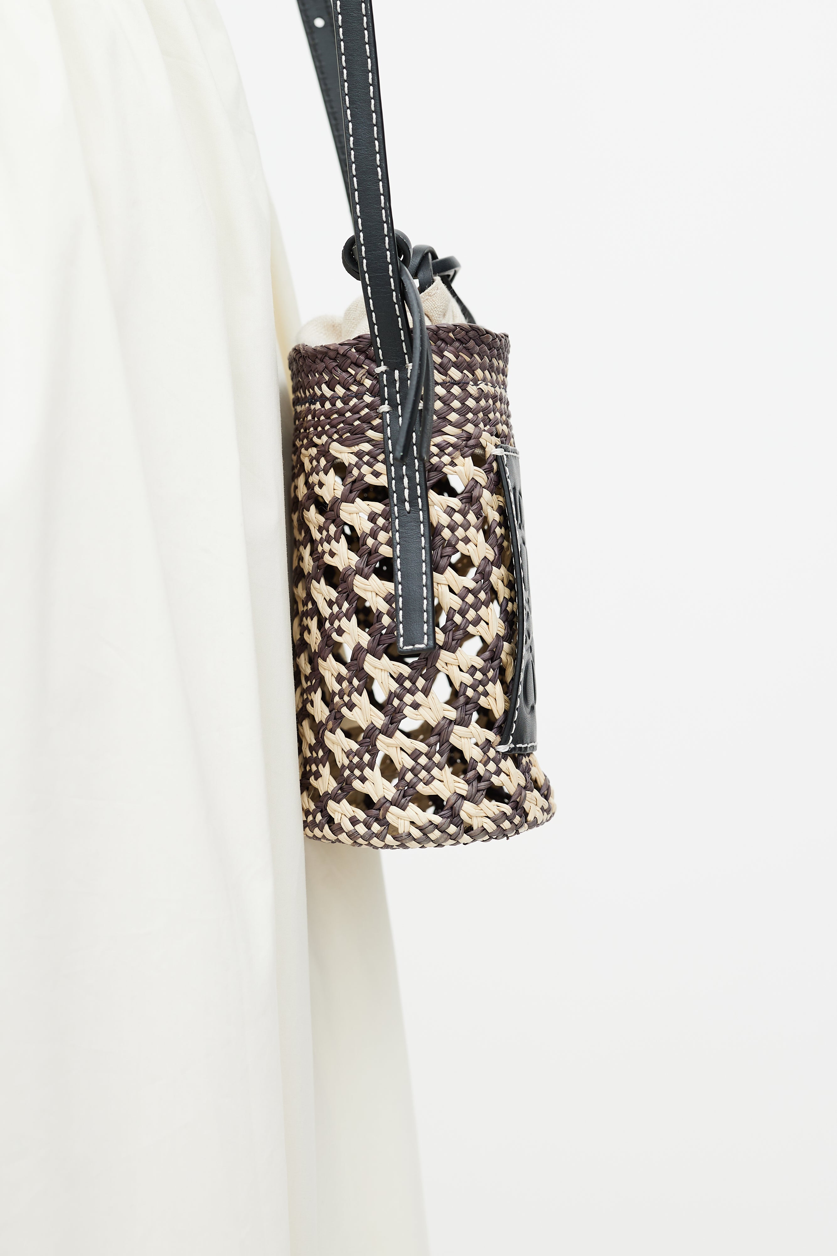 Pre-owned 2021 Loewe cylinder pocket bag featuring leather drawstring closure at top, silver tone hardware. single adjustable shoulder strap, black and neutral raffia, and leather tonal logo patch at front. Unlined. Comes with original dust bag and box. Entrupy Certificate Included.