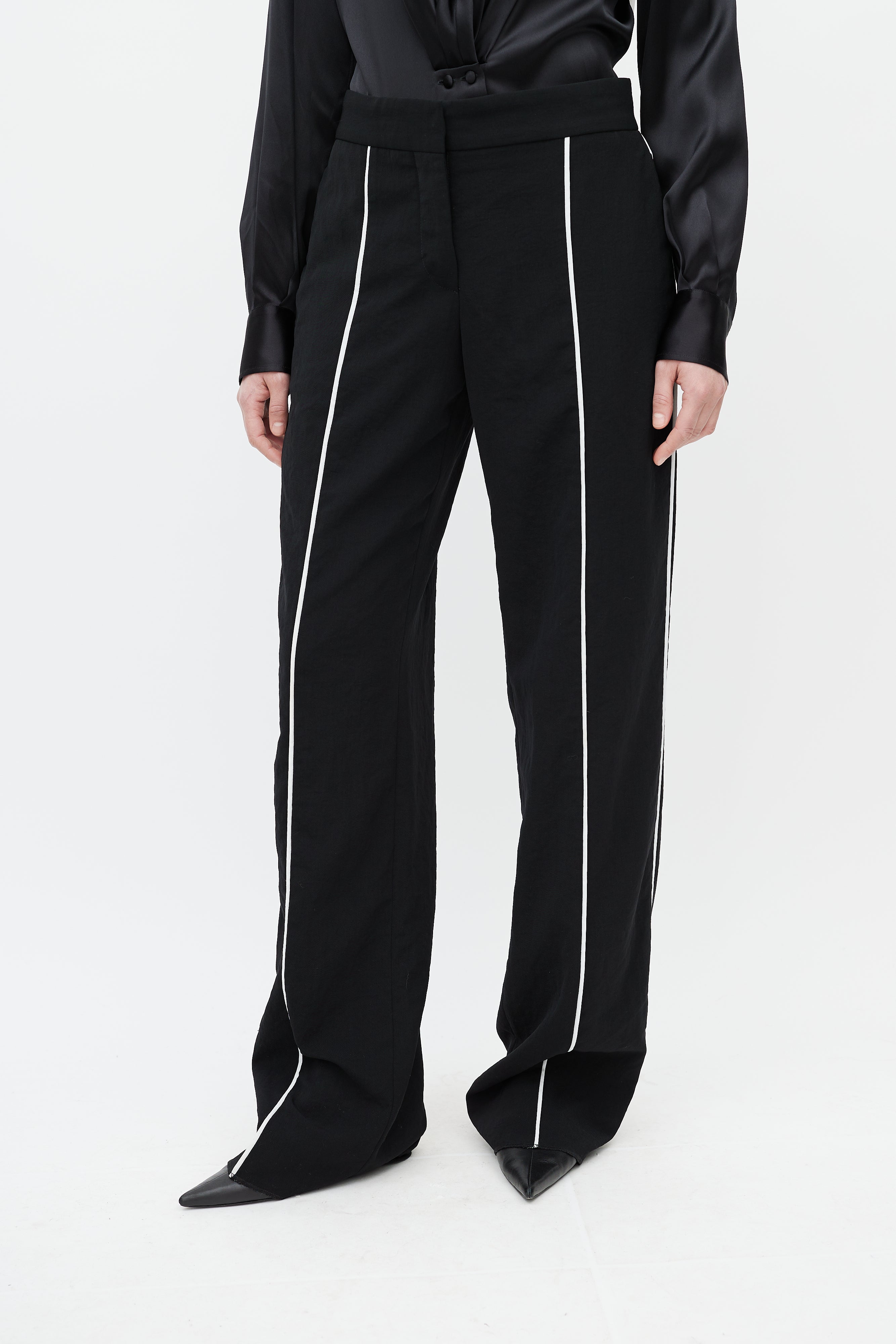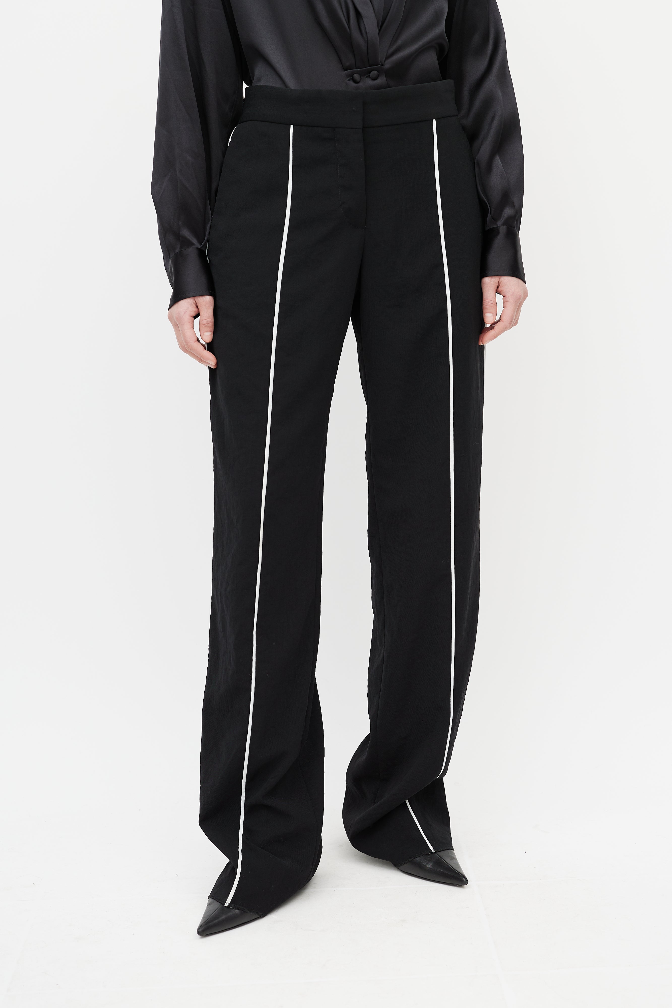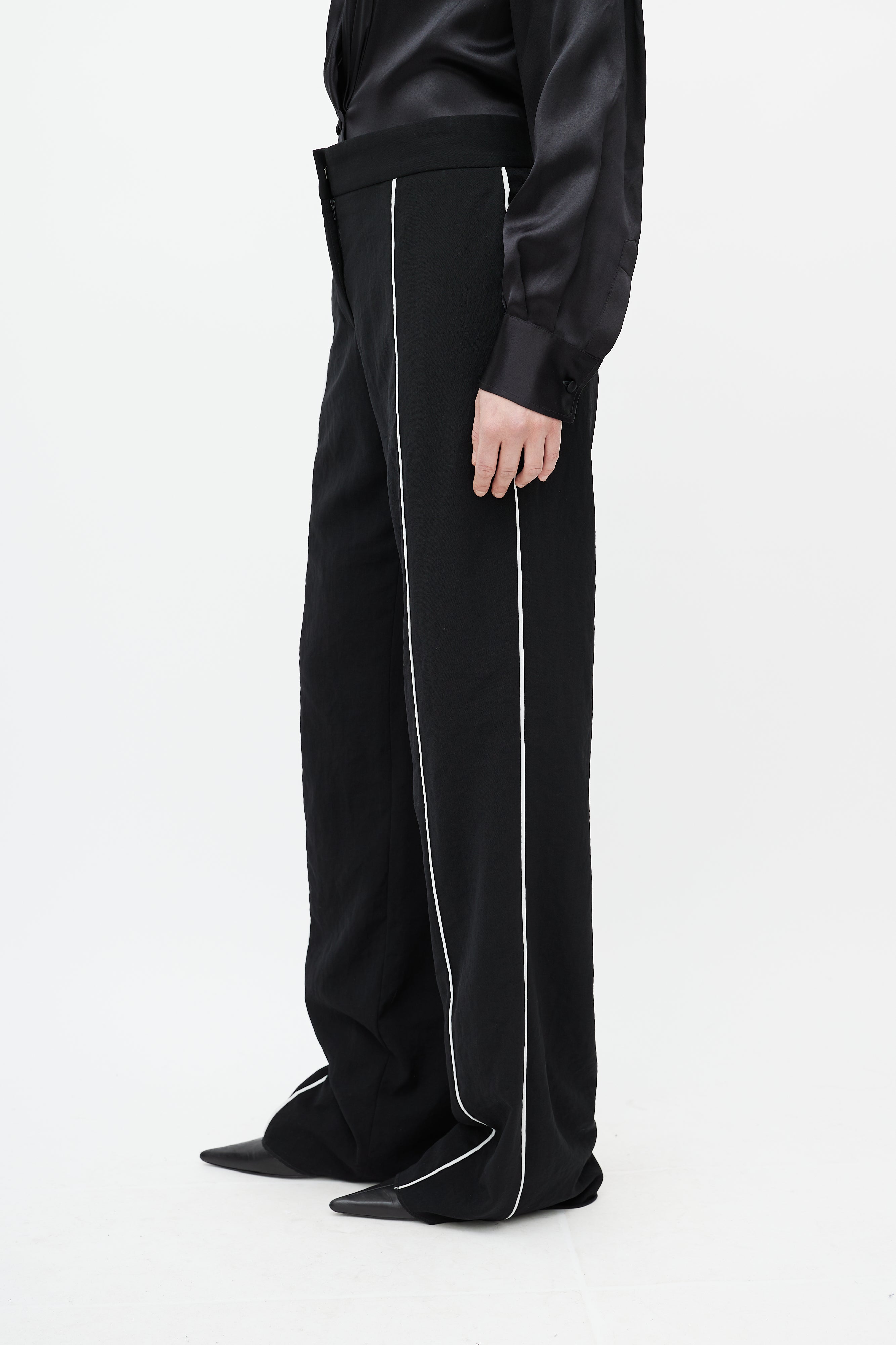 Pre-owned Loewe black trousers featuring white piping trim throughout, zip fly, two hip pockets, two welt pockets at back, and wide legs. Clipped to fit model.