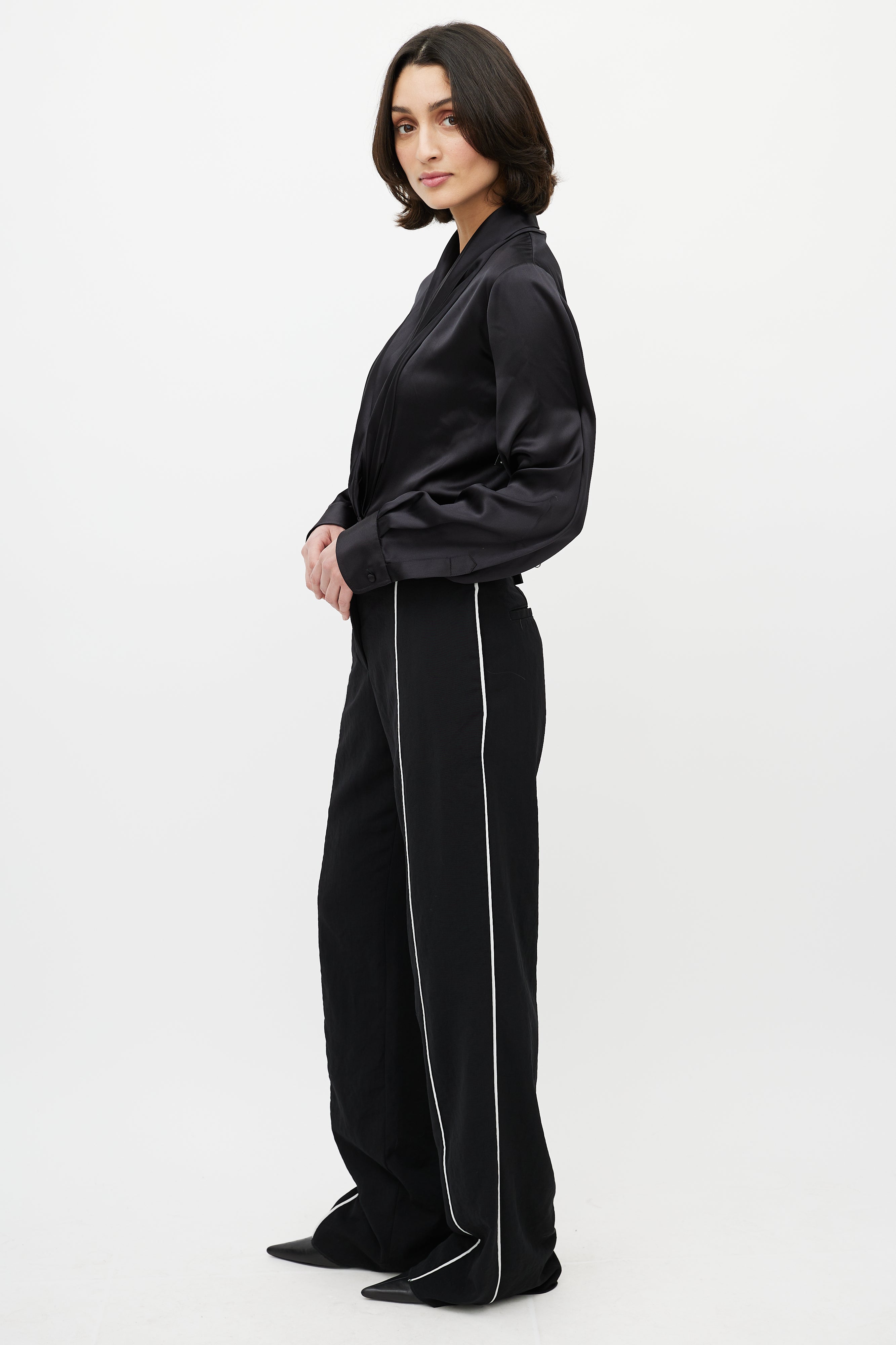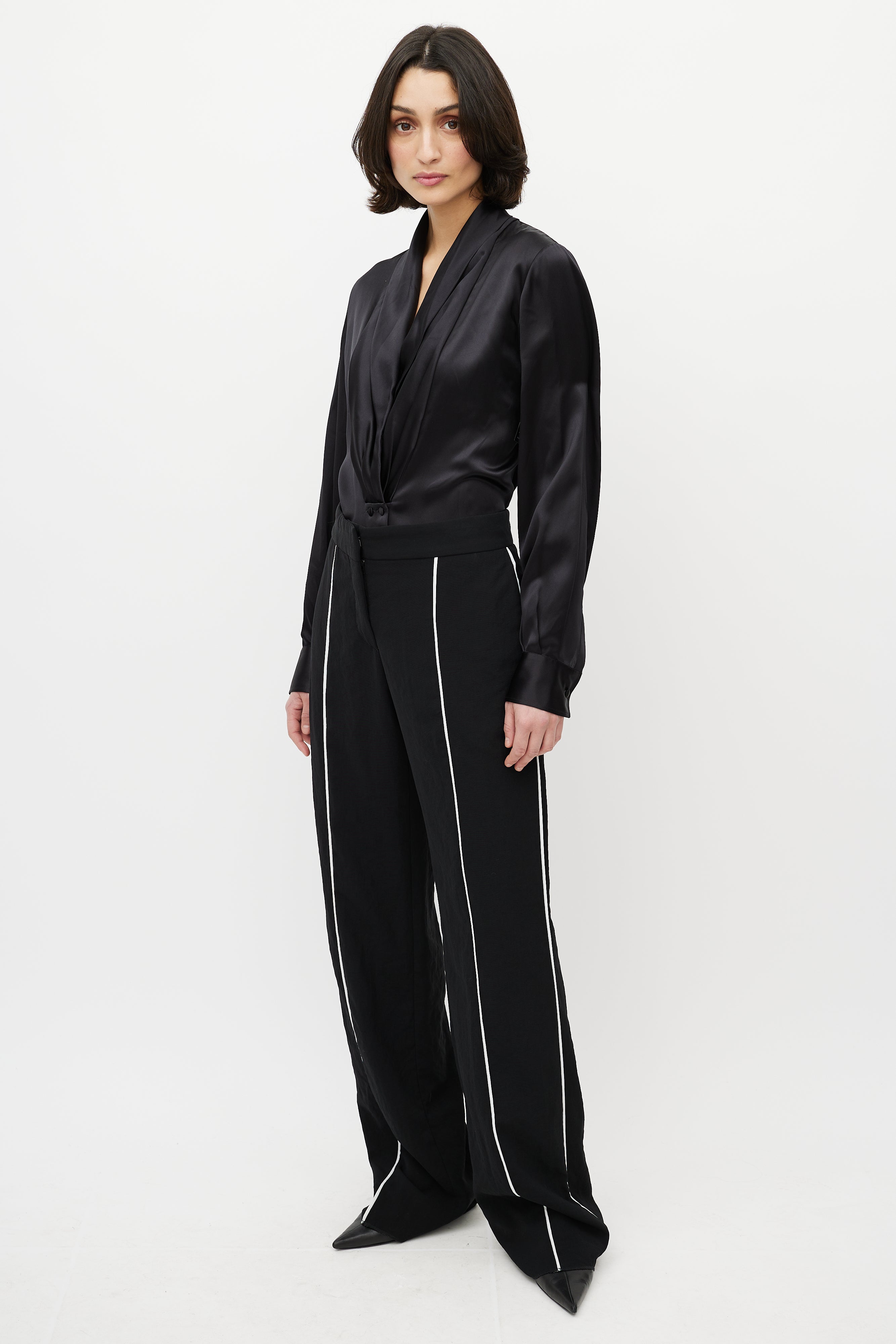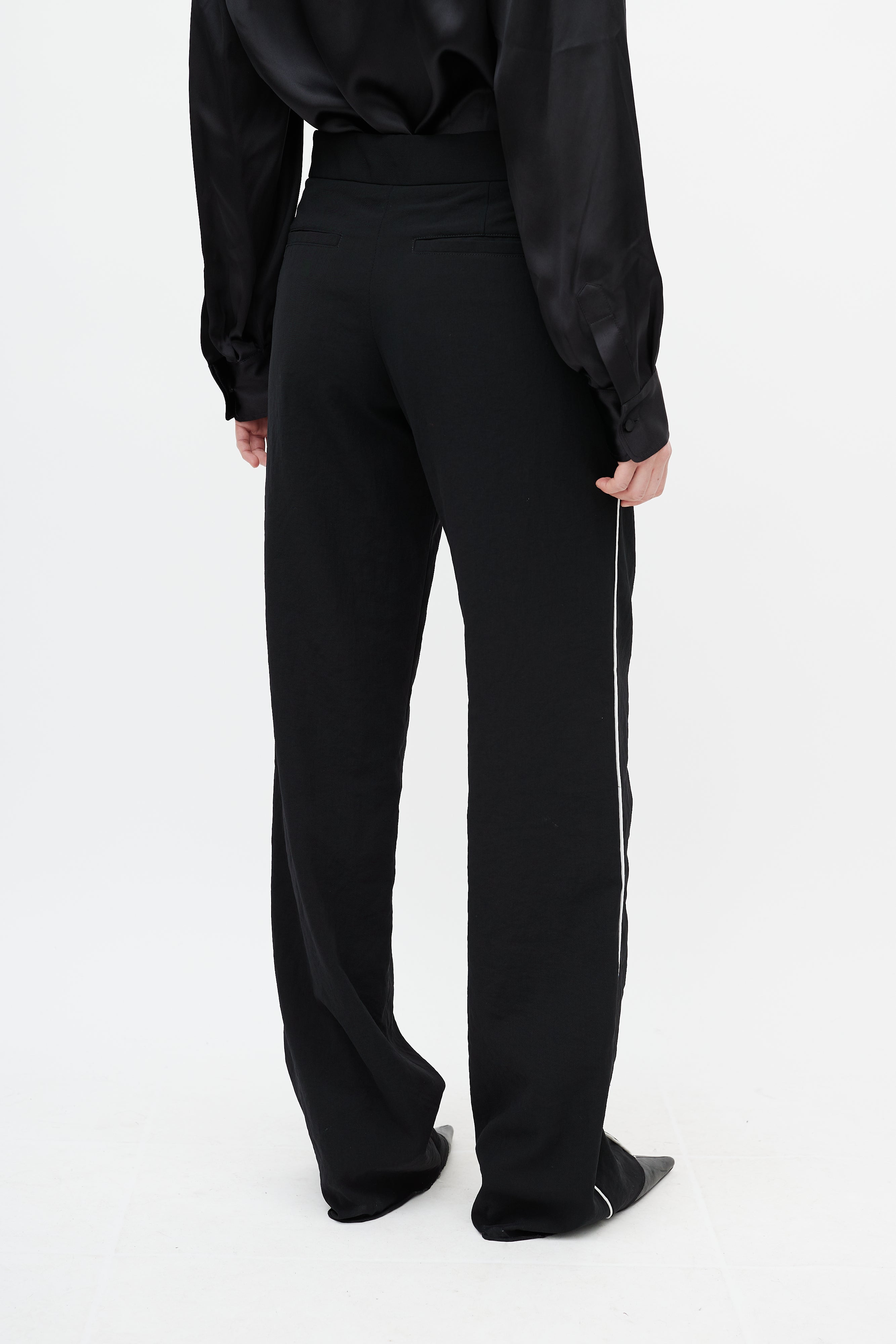 Pre-owned Loewe black trousers featuring white piping trim throughout, zip fly, two hip pockets, two welt pockets at back, and wide legs. Clipped to fit model.