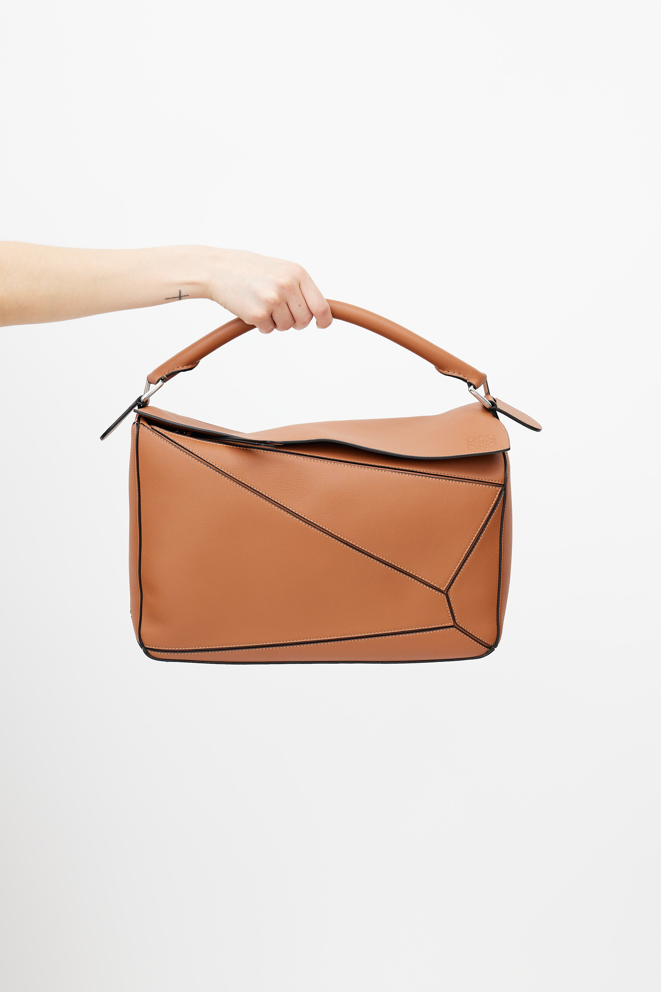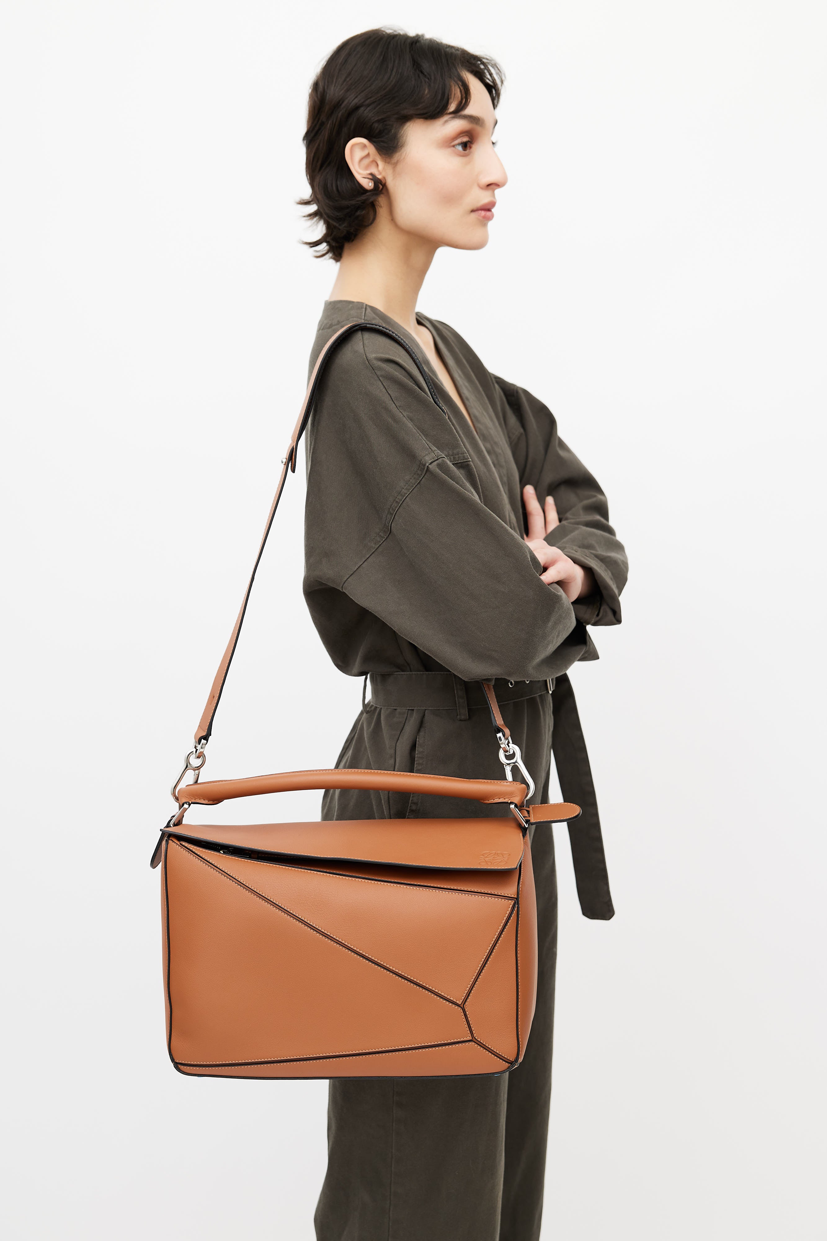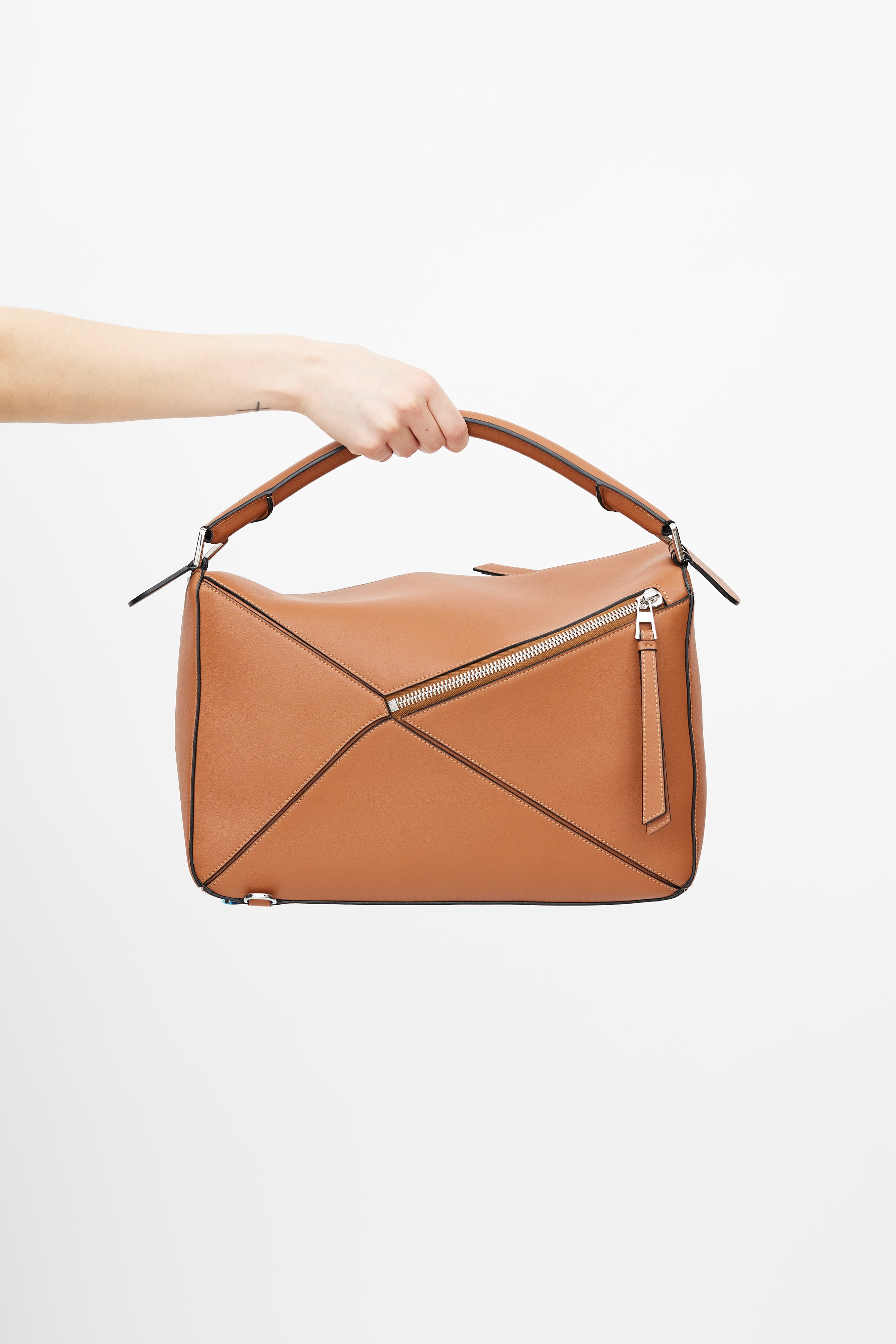 Pre-owned Loewe brown large Puzzle bag featuring tonal panelling throughout, top logo embossed flap with concealed silver tone zip closure, canvas lined interior with one main compartment and two slip pockets, leather embossed logo tab at interior, wrapped leather top handle, removable adjustable shoulder strap, silver tone protective feet at bottom of bag and silver tone zip closure at back. Comes with dust bag.