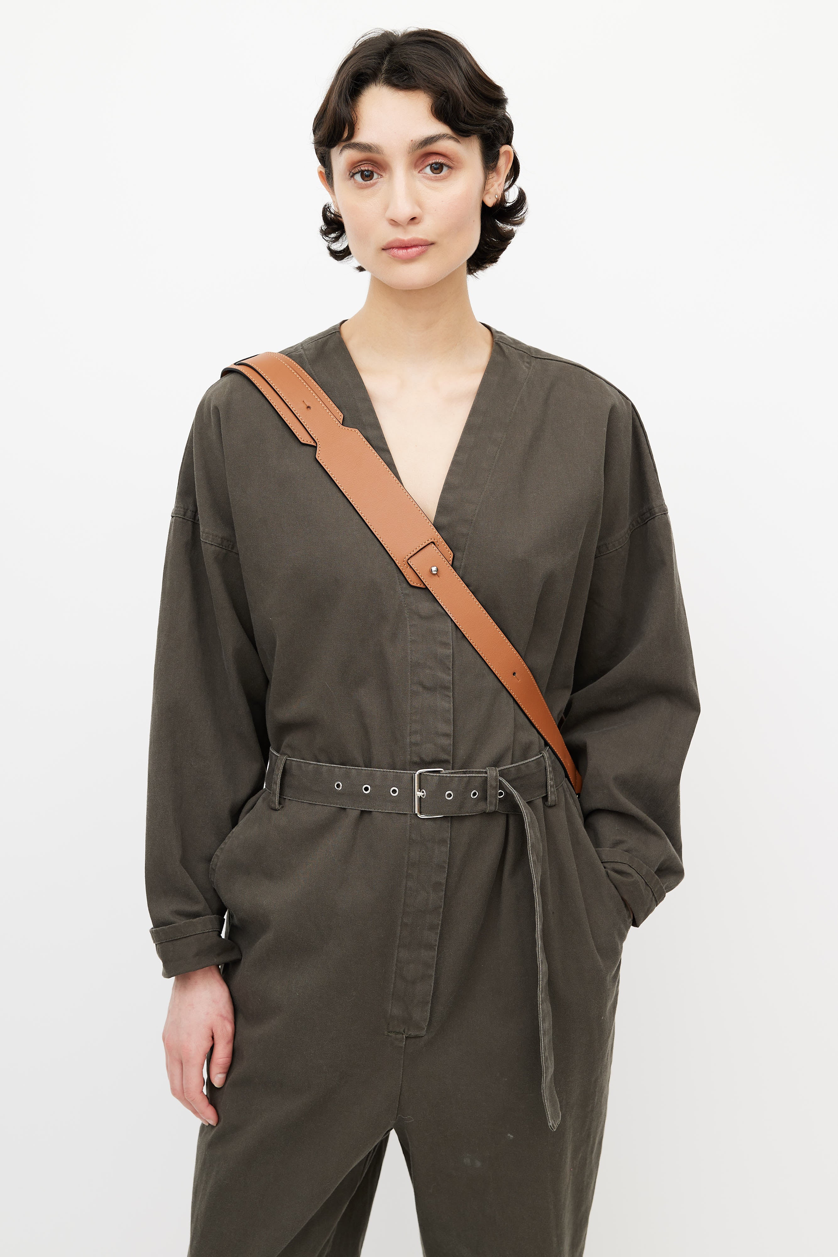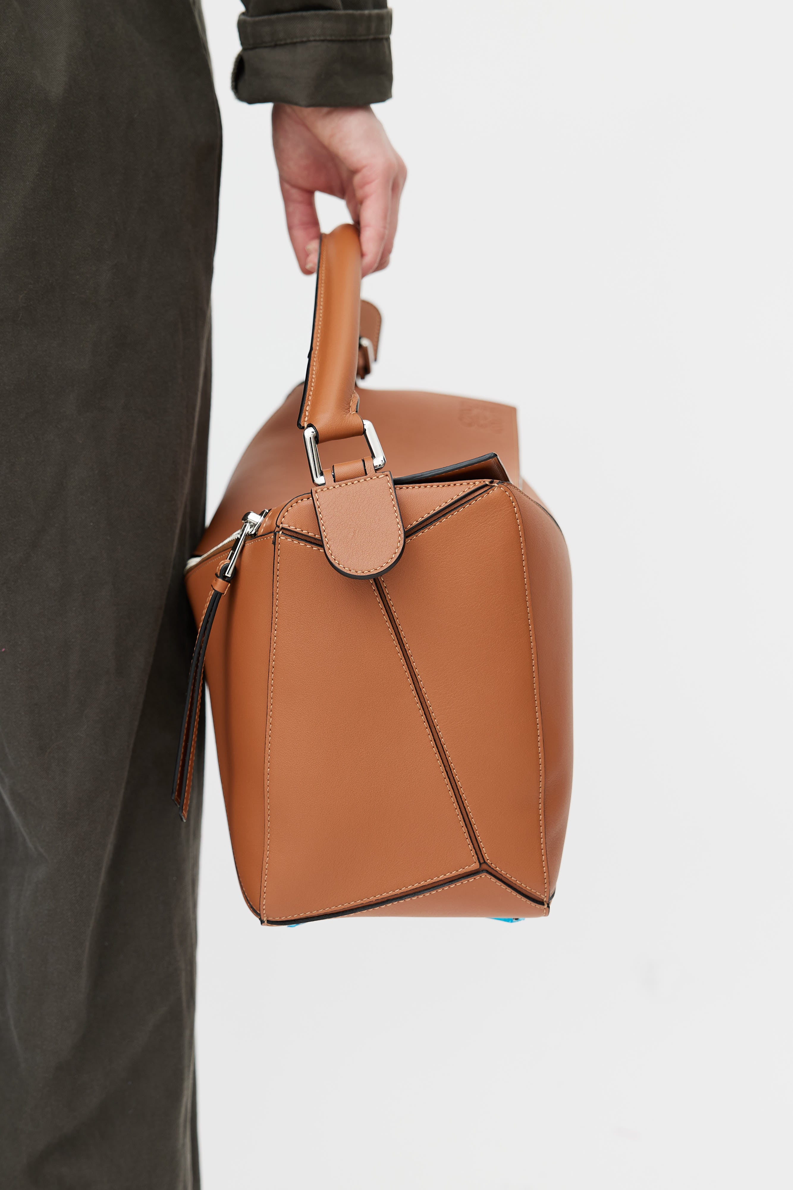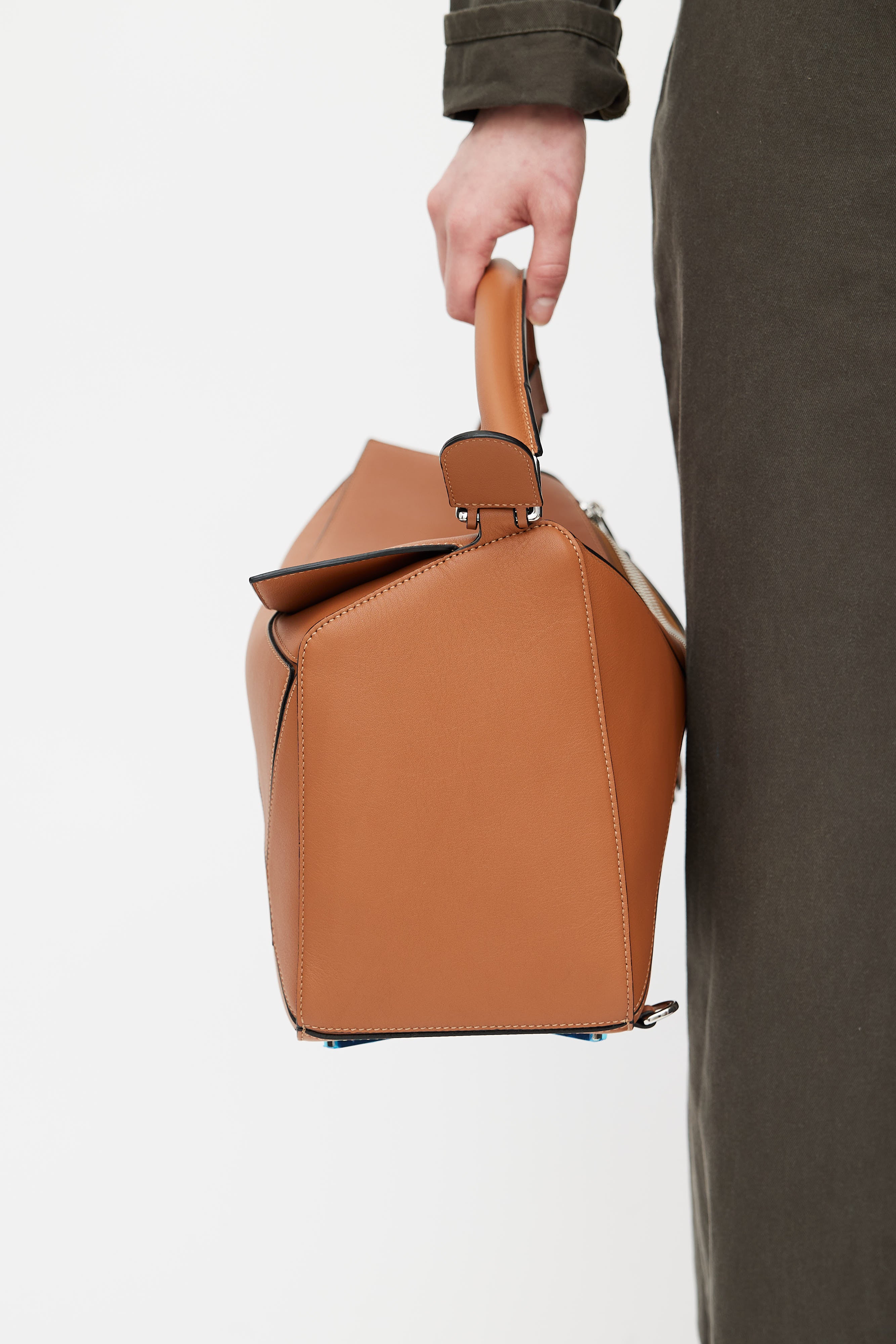 Pre-owned Loewe brown large Puzzle bag featuring tonal panelling throughout, top logo embossed flap with concealed silver tone zip closure, canvas lined interior with one main compartment and two slip pockets, leather embossed logo tab at interior, wrapped leather top handle, removable adjustable shoulder strap, silver tone protective feet at bottom of bag and silver tone zip closure at back. Comes with dust bag.