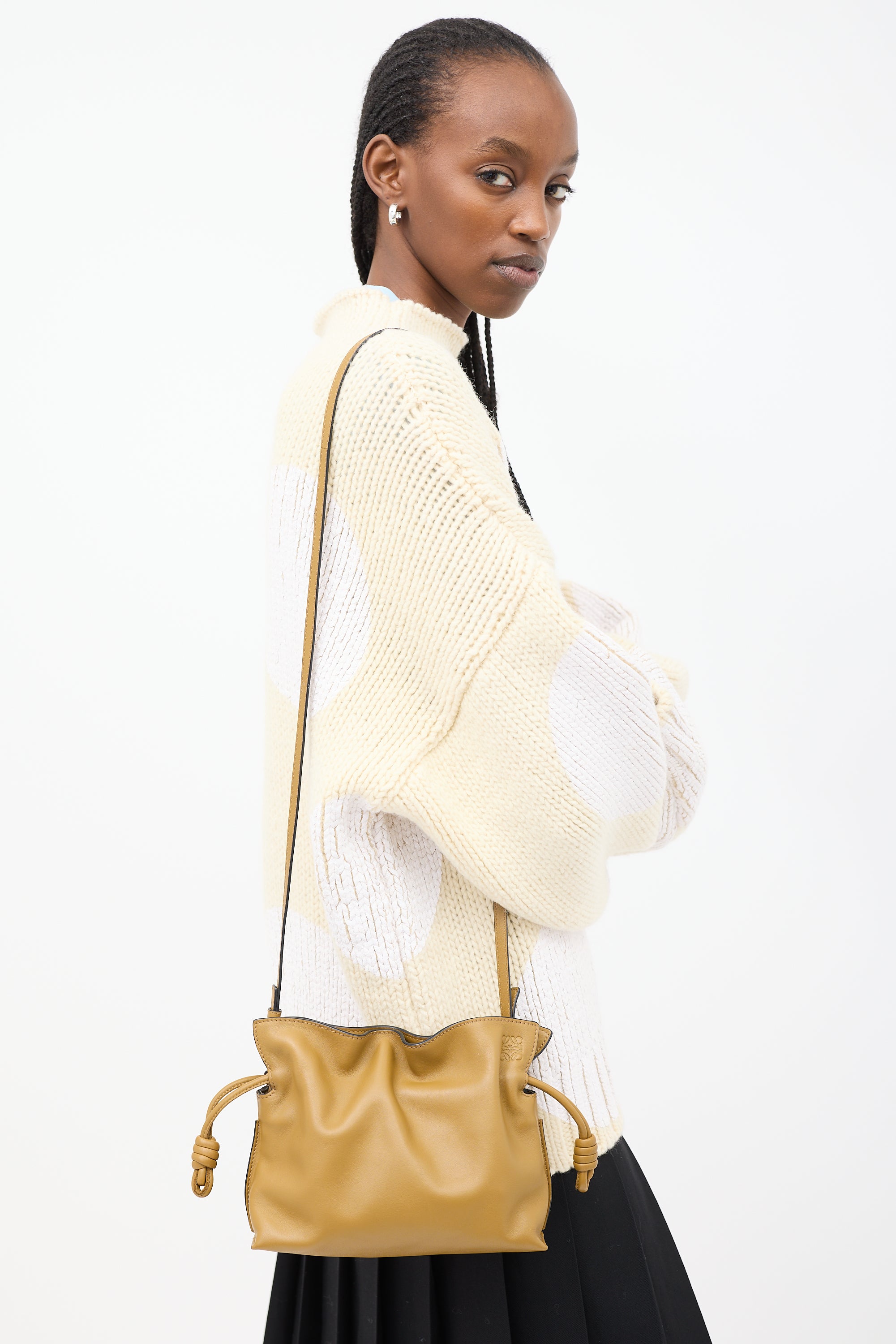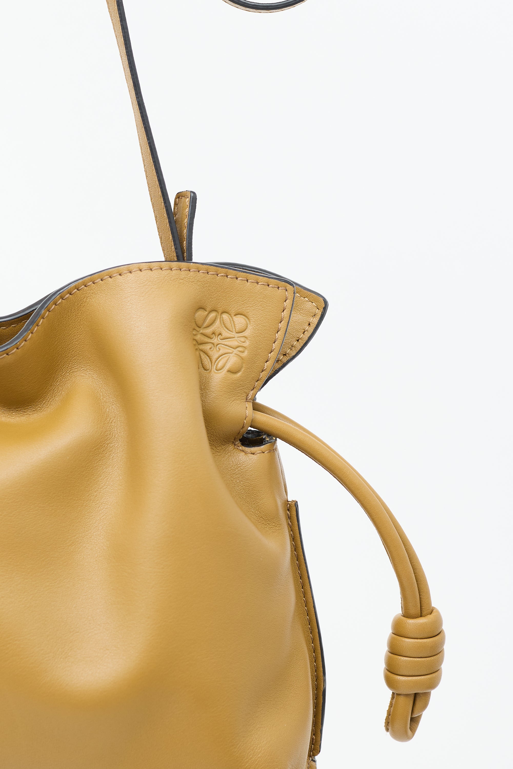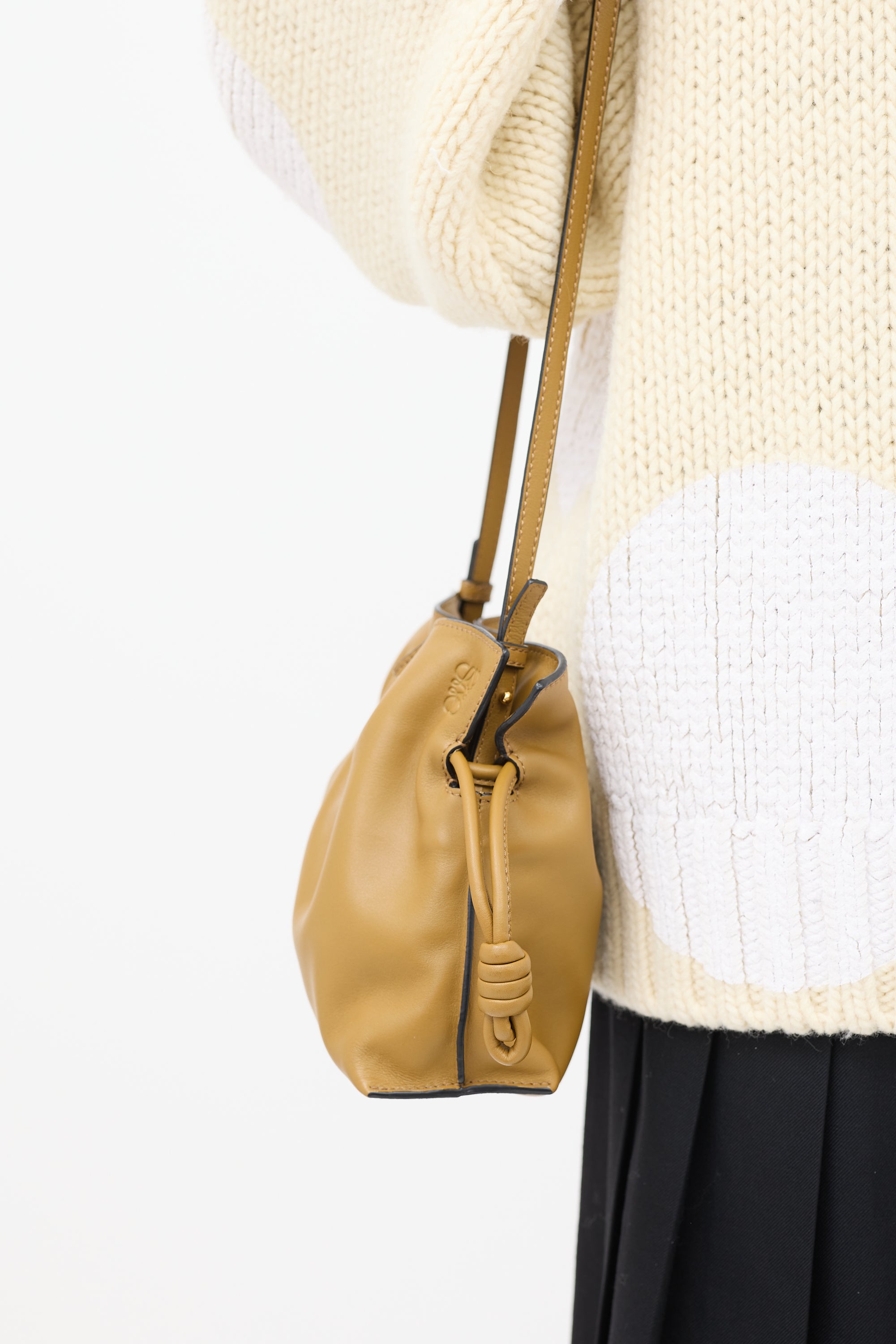 Pre-owned Loewe brown leather mini Flamenco Clutch bag featuring tonal stitching, embossed Anagram logo at front top right corner, drawstring sides with knotted straps, magnetic top closure, detachable and adjustable shoulder strap, and one lined main compartment. Comes with original dust bag.