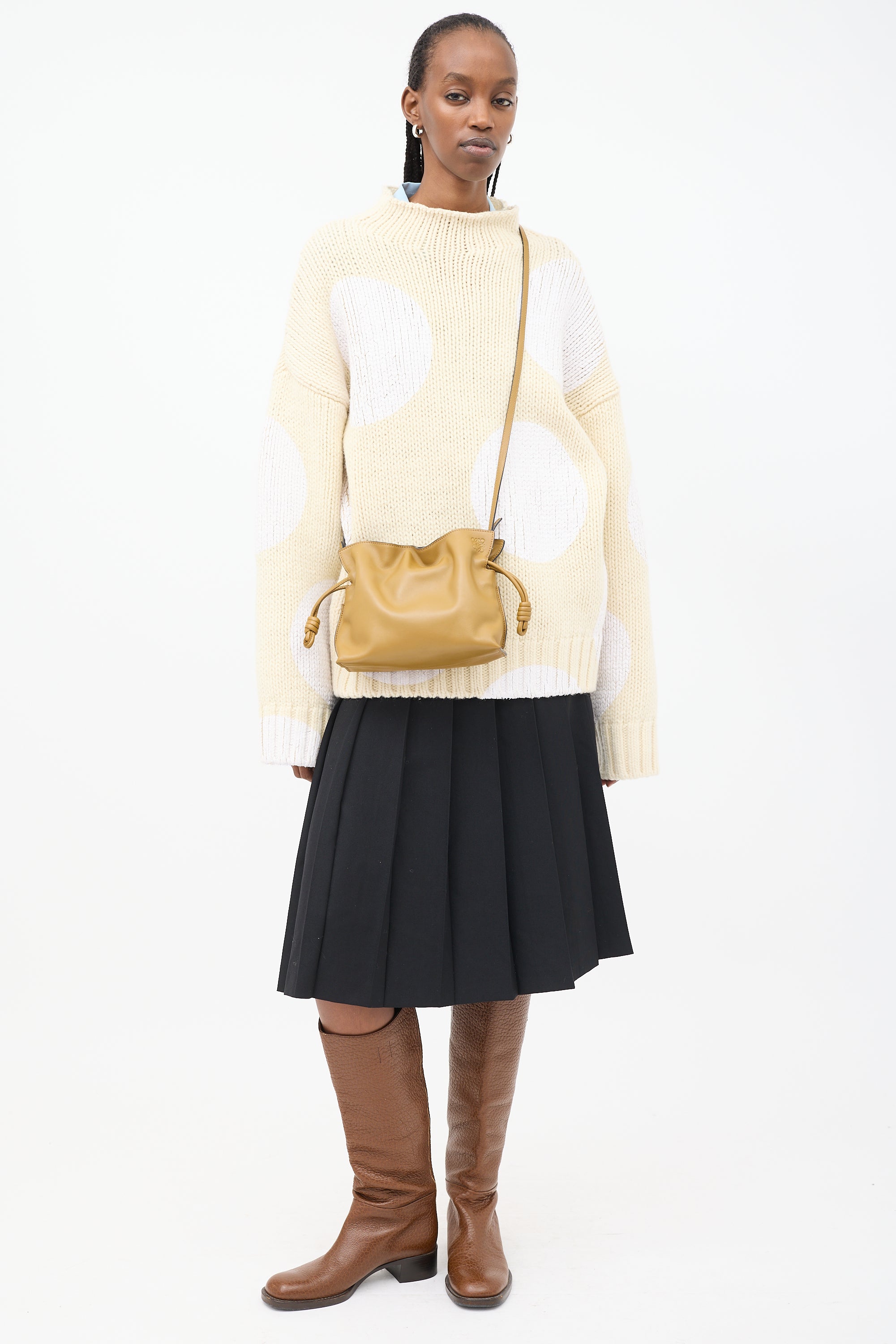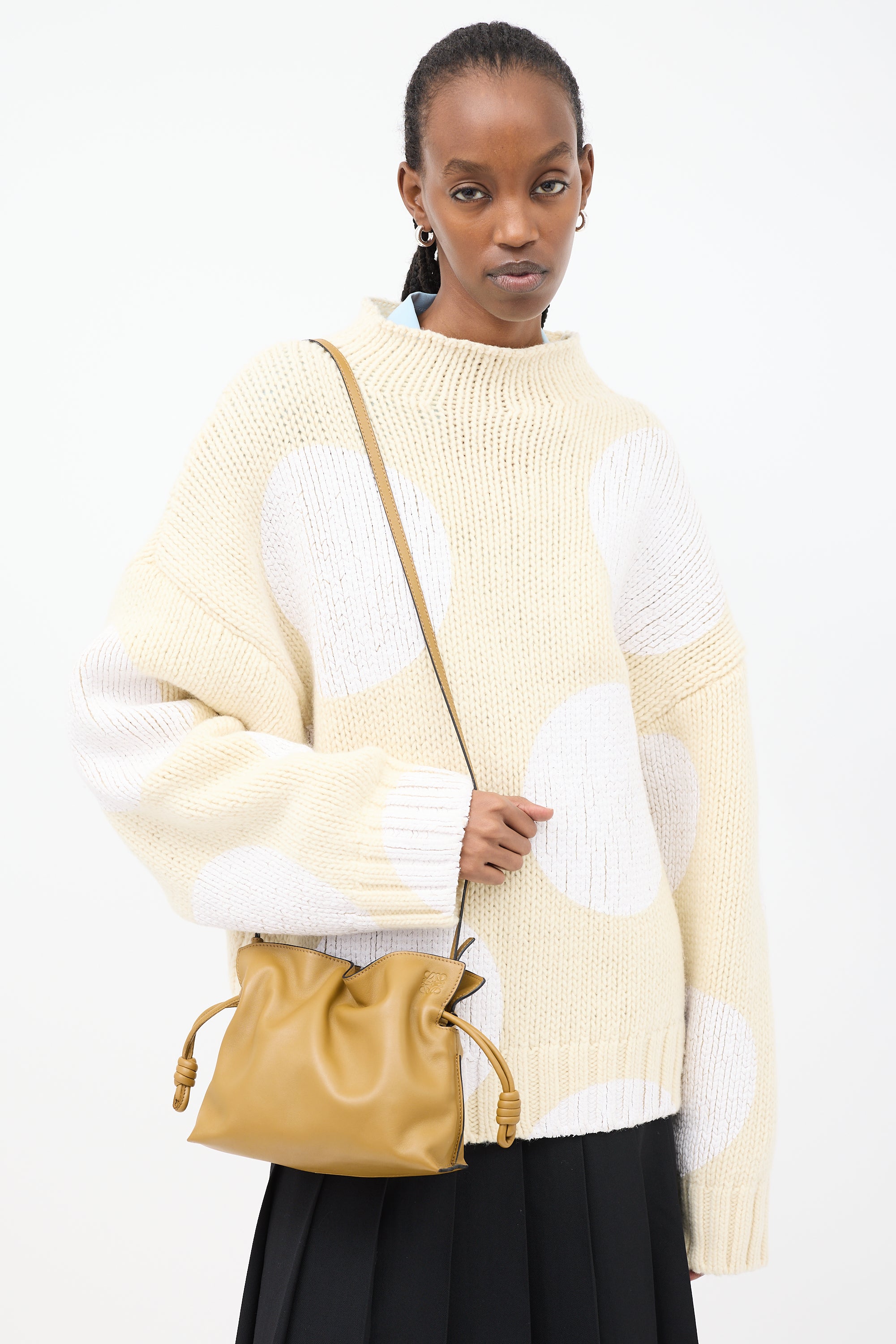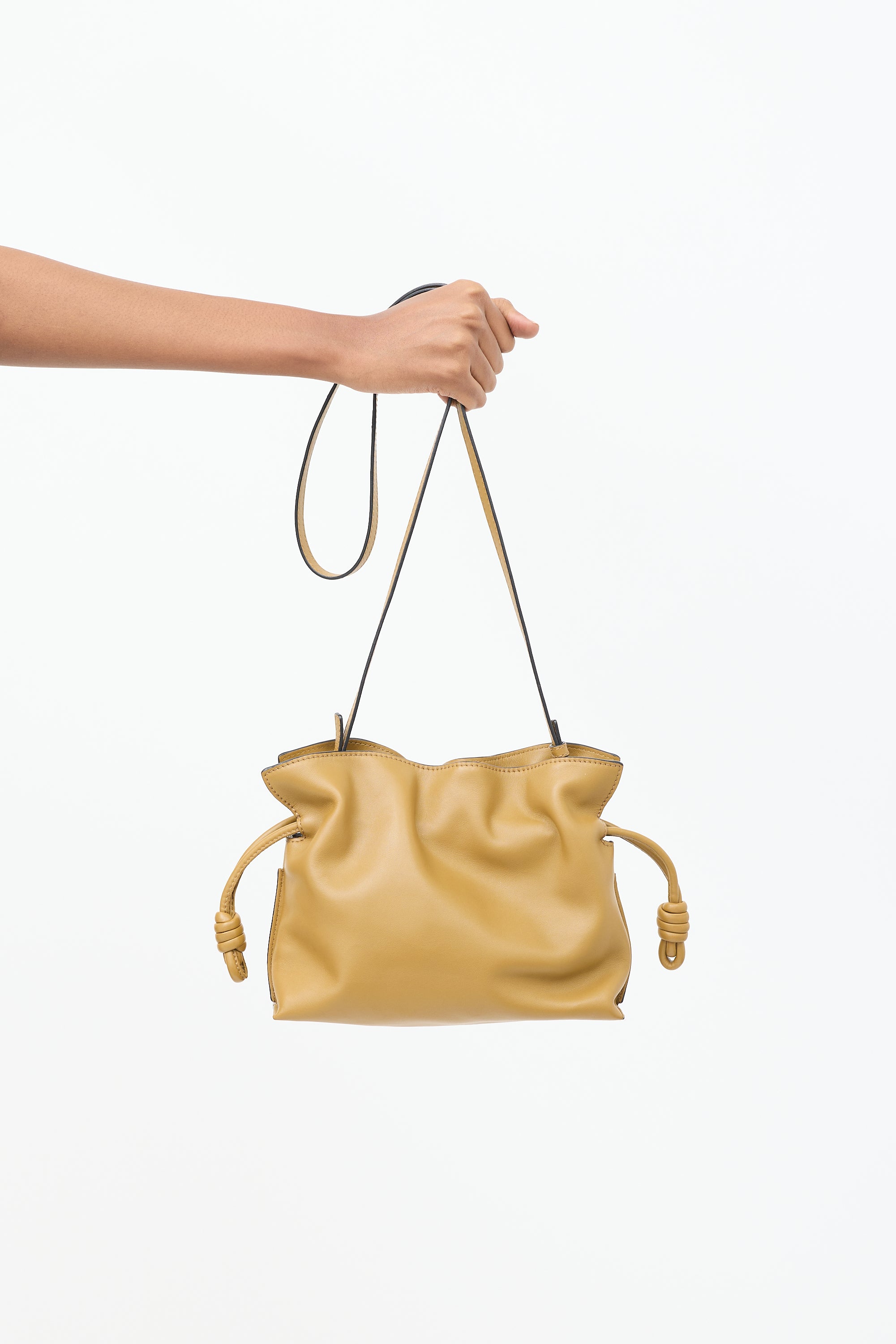 Pre-owned Loewe brown leather mini Flamenco Clutch bag featuring tonal stitching, embossed Anagram logo at front top right corner, drawstring sides with knotted straps, magnetic top closure, detachable and adjustable shoulder strap, and one lined main compartment. Comes with original dust bag.