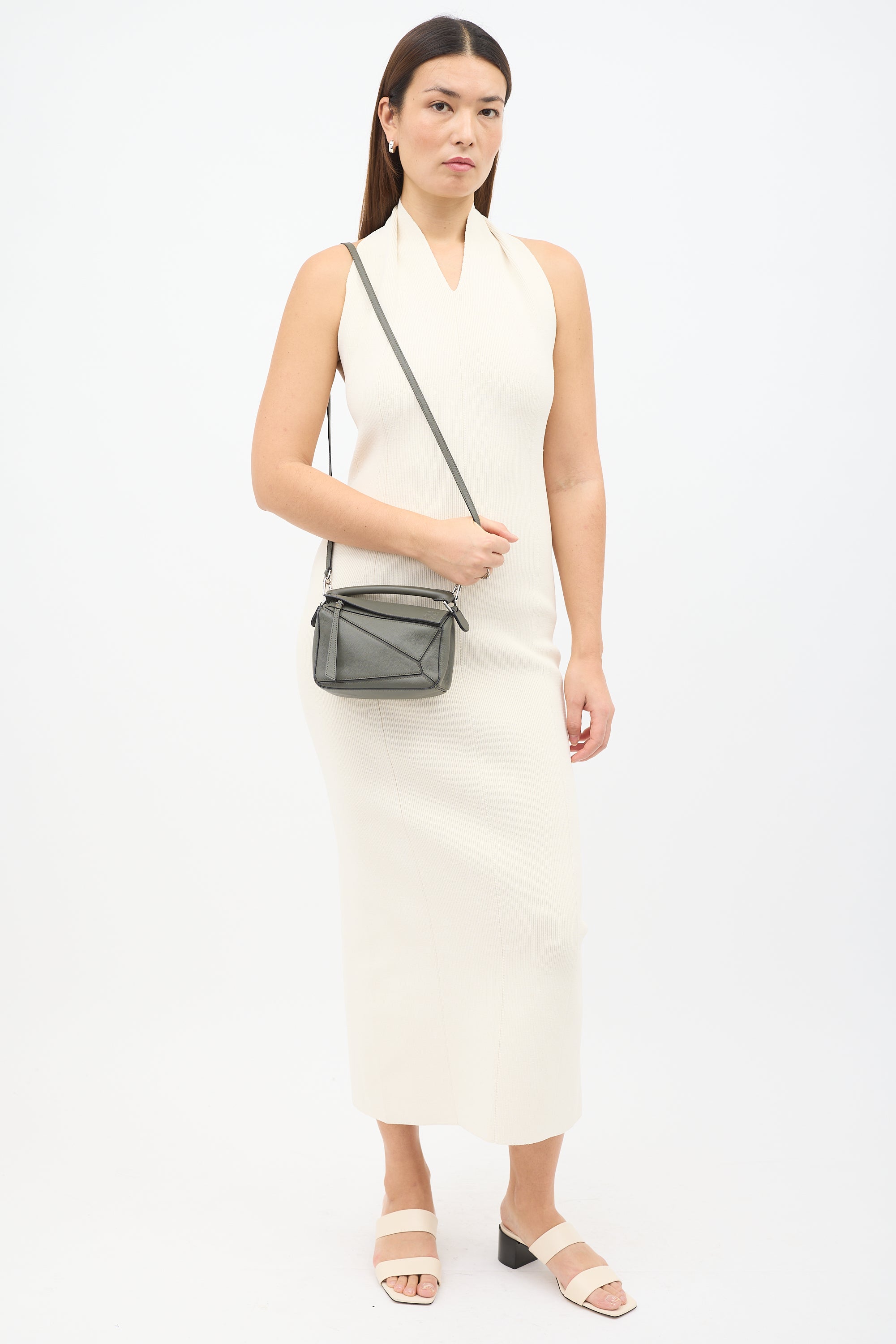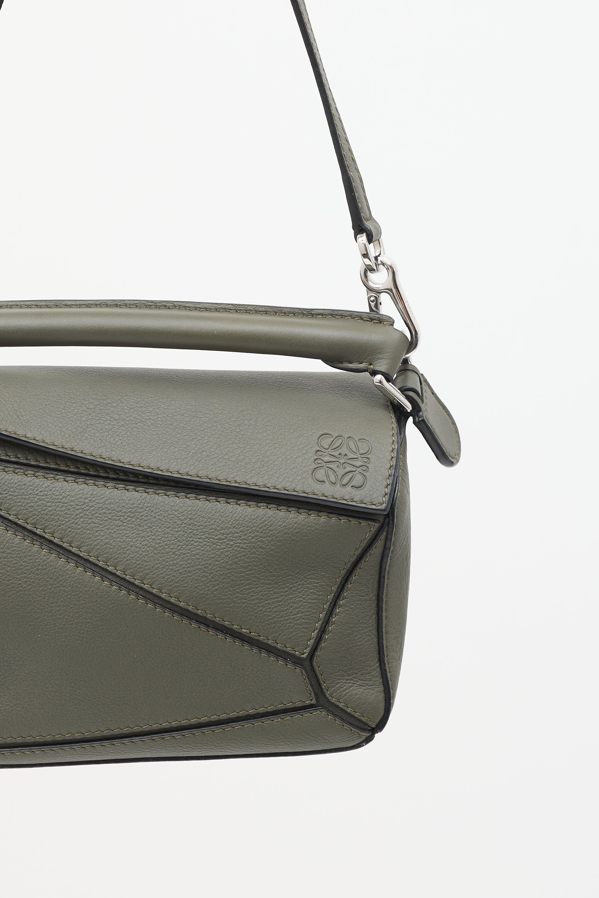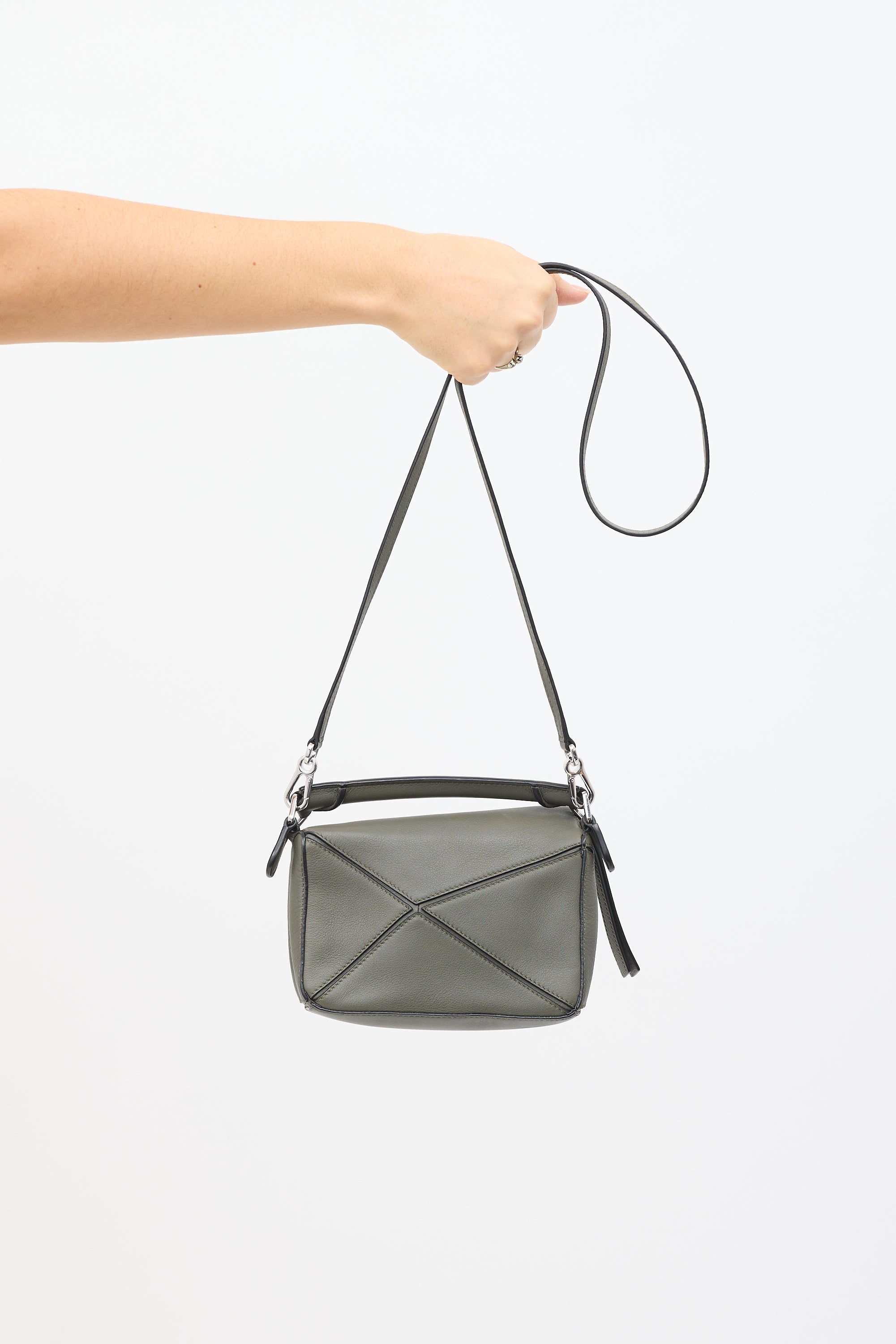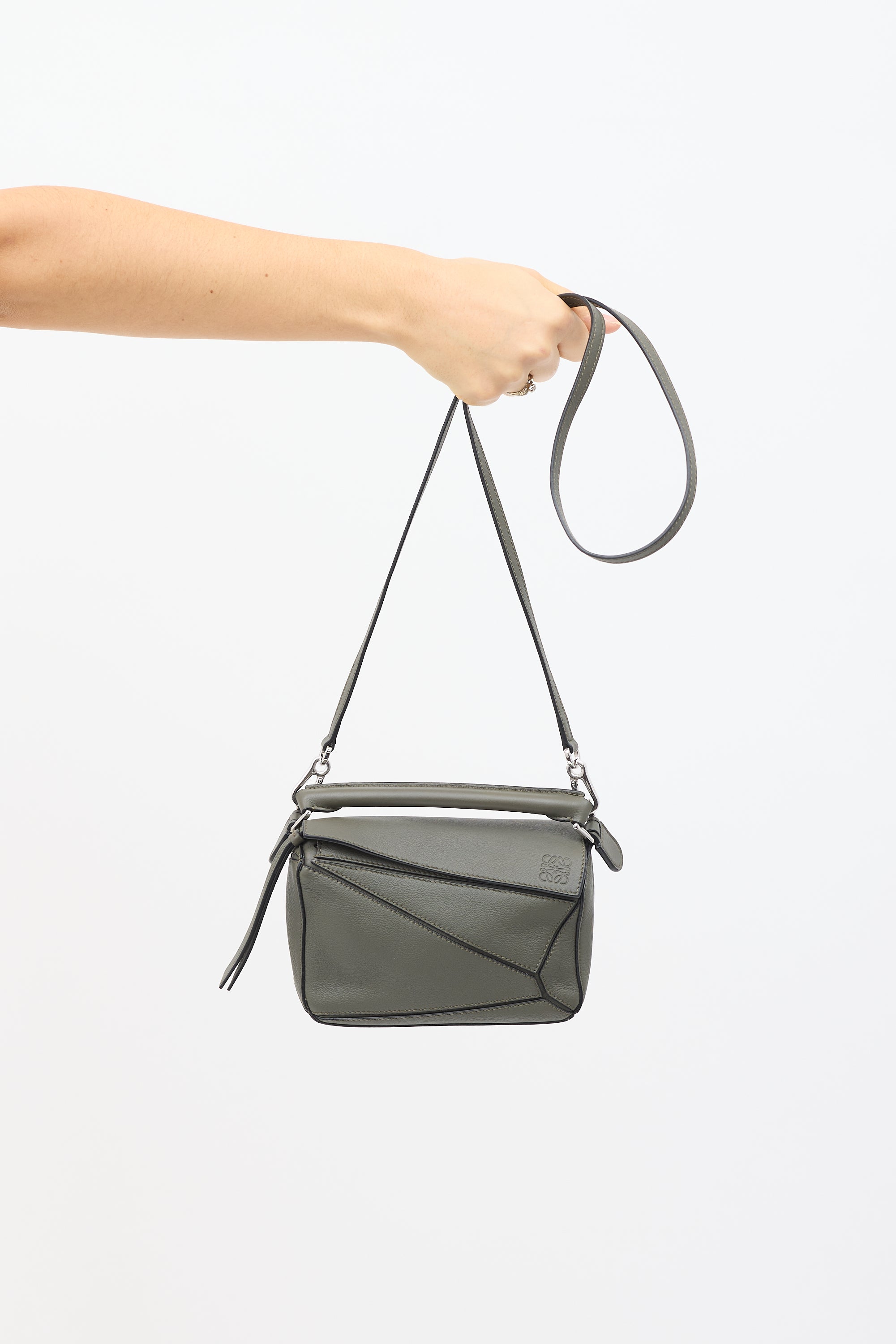 Pre-owned Loewe dark grey mini Puzzle shoulder bag featuring tonal panelling throughout, fixed top handle, detachable fixed shoulder strap, top flap with embossed Anagram logo at corner, zip closure under top flap, and herringbone canvas lining. Comes with original dust bag.