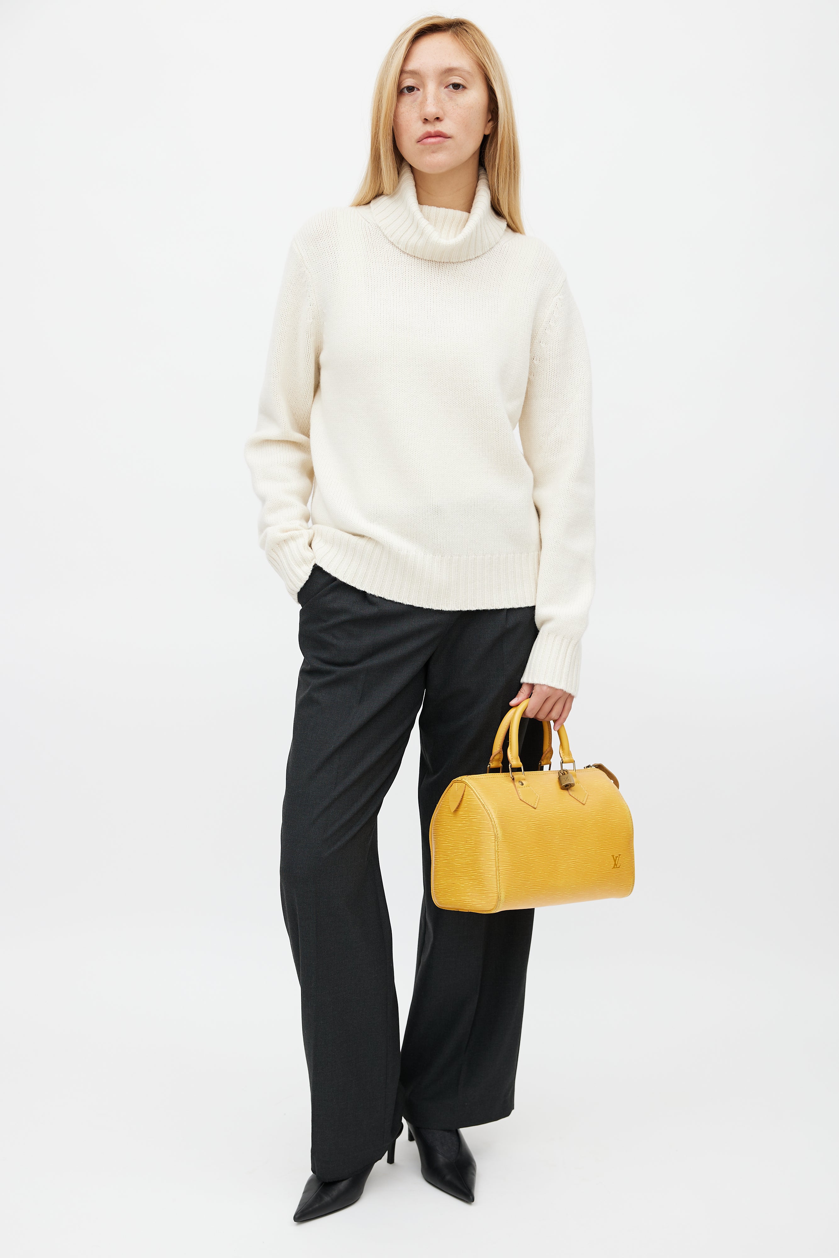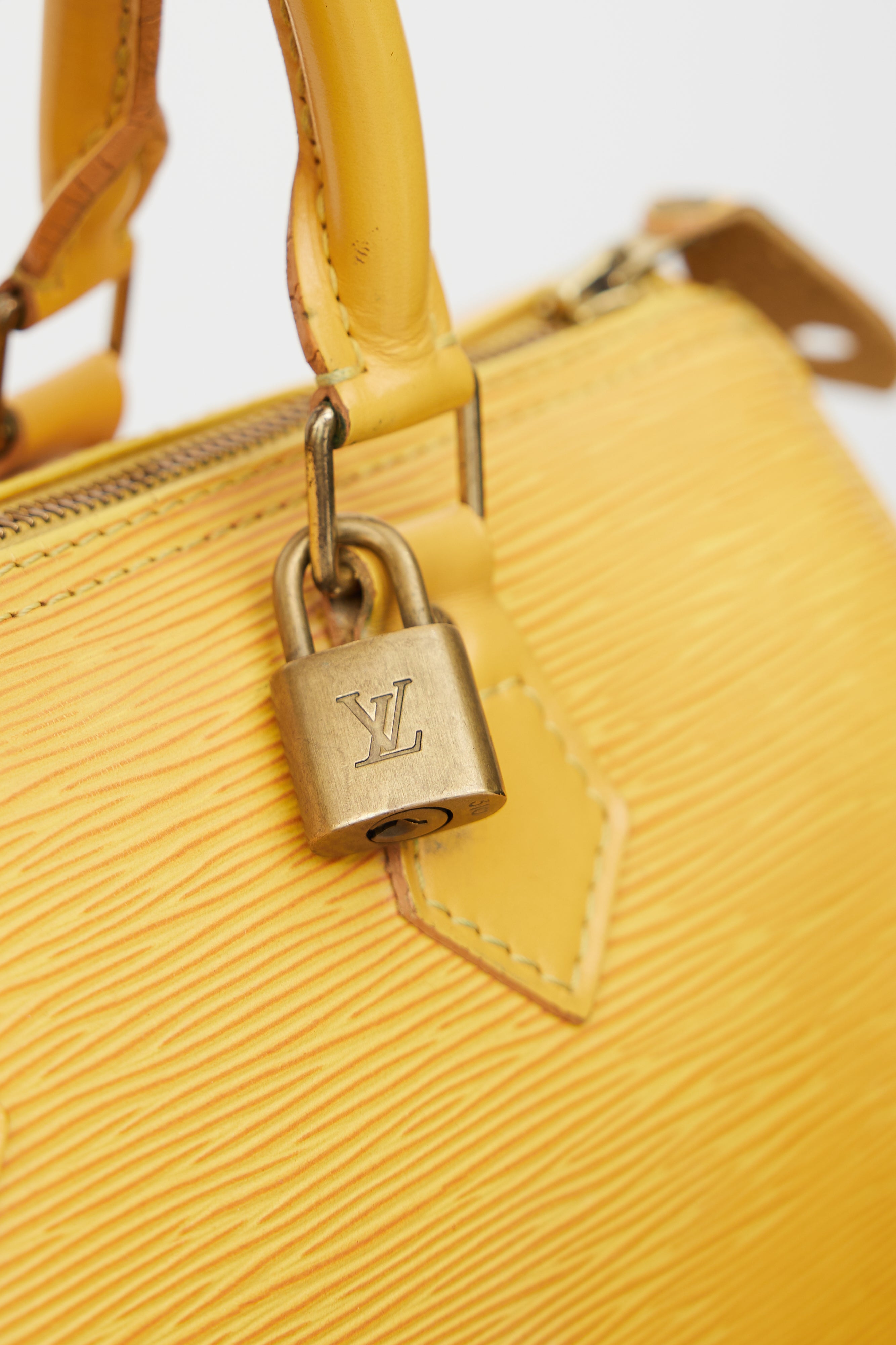 Pre-owned Louis Vuitton 1992 yellow Speedy 25 bag featuring Epi leather, dual rolled top handle, embossed logo at front and back left corner, exterior slip pocket at left, zip closure, microfibre lining, and one slip pocket inside.
