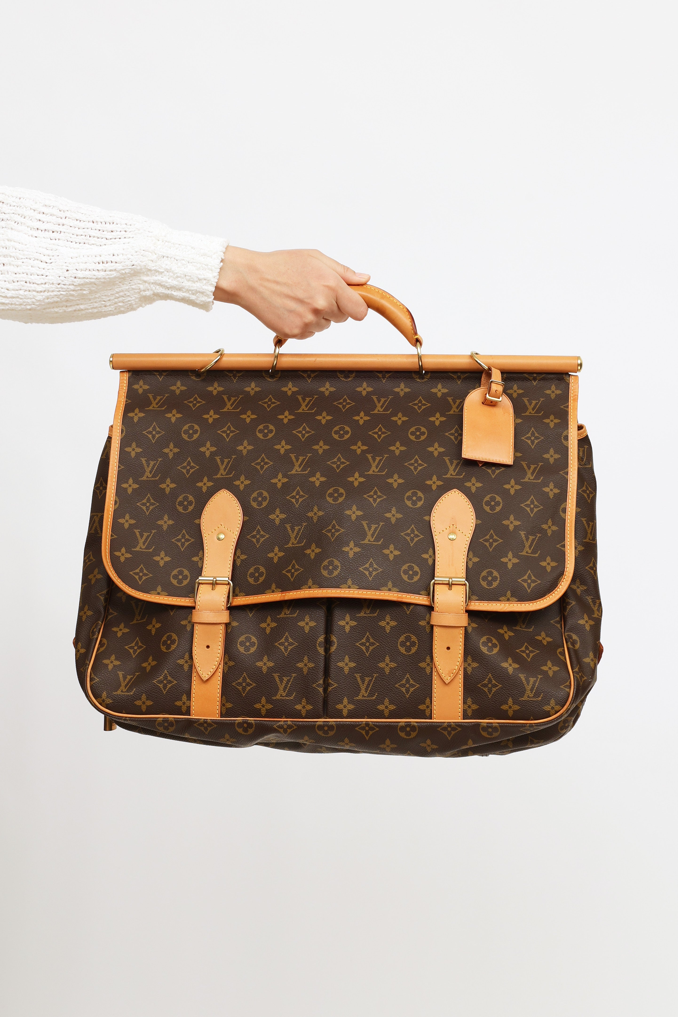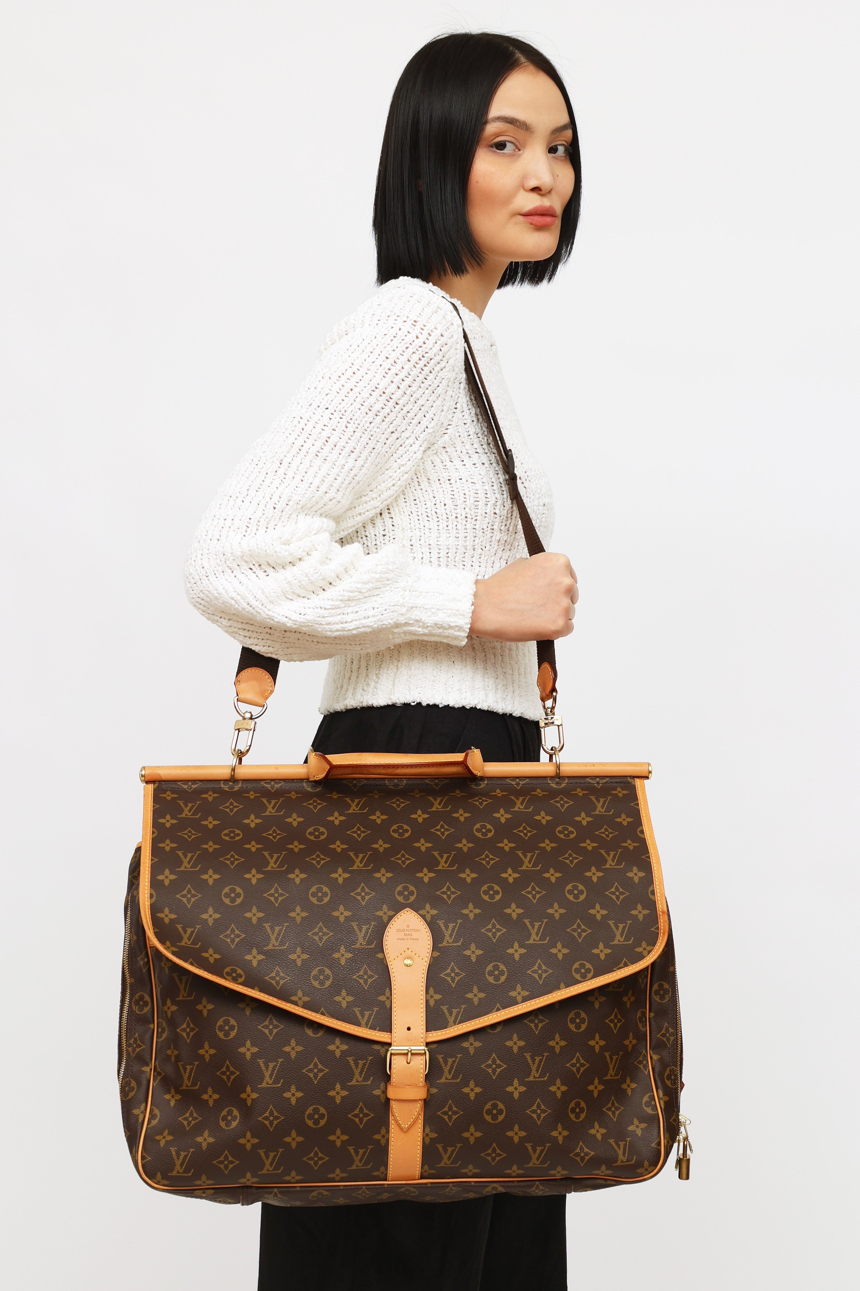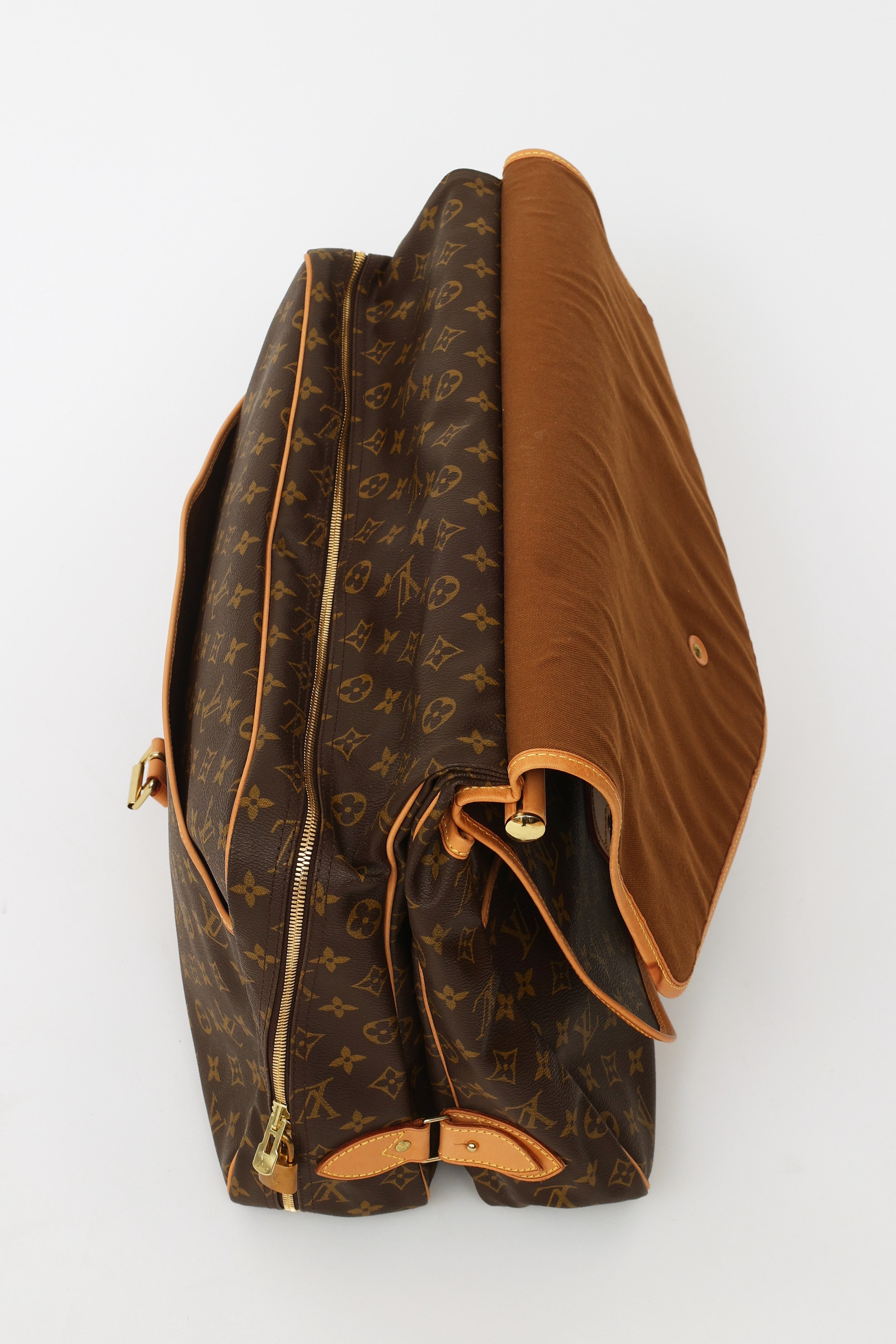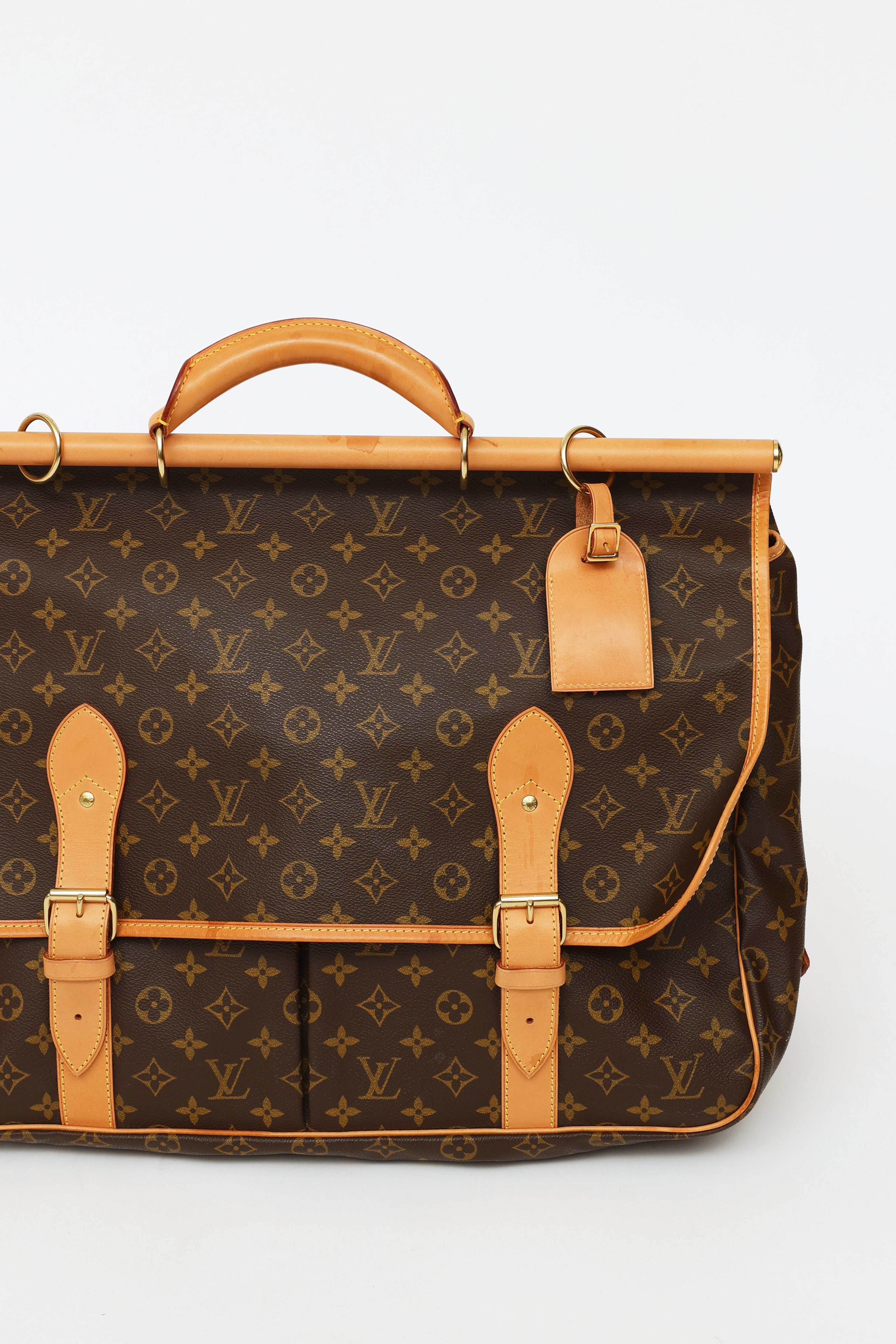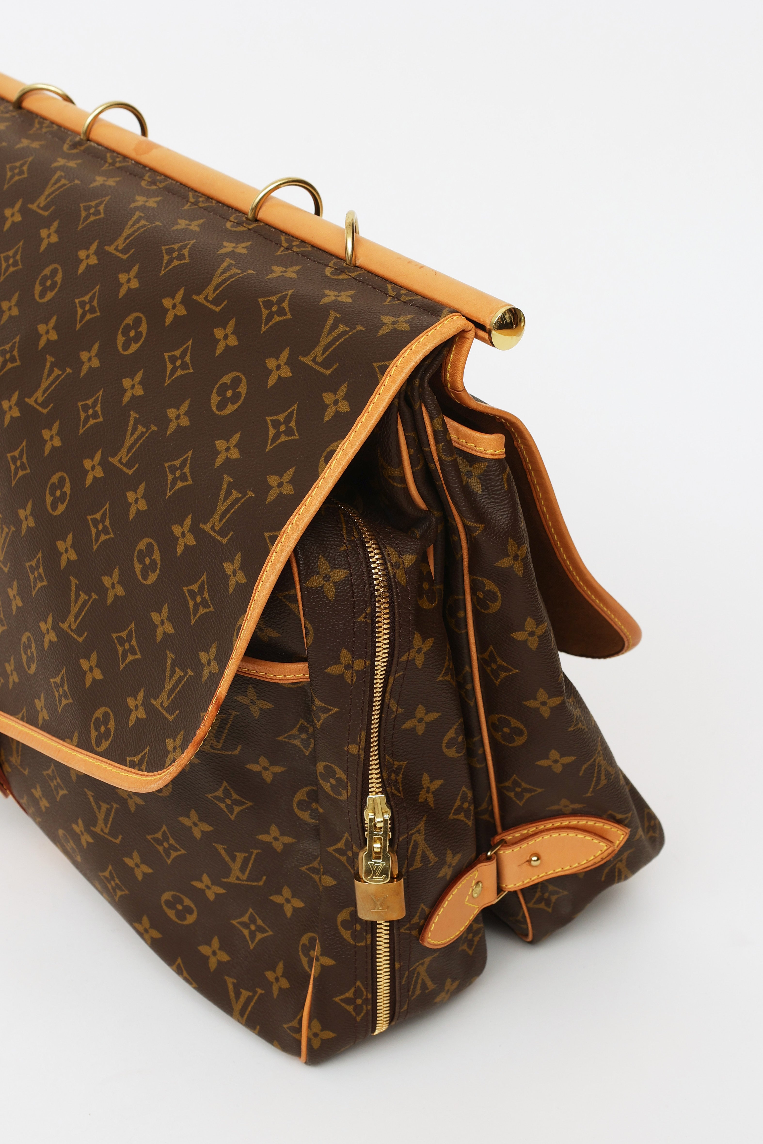 Pre-owned Louis Vuitton 1998 Monogram canvas Chasse Garment hunting travel bag featuring dual exterior compartments, singular rolled leather top handle with travel tag and additional gold-tone hook. Front compartment features dual buckle fastenings and two open-top pockets. Back compartment features singular buckle fastening, one large open-top pocket and one zipper closure compartment with gold-tone padlock with engraved logo text. Compartment features interior luggage straps. Leather trim throughout. Includes removable shoulder strap.