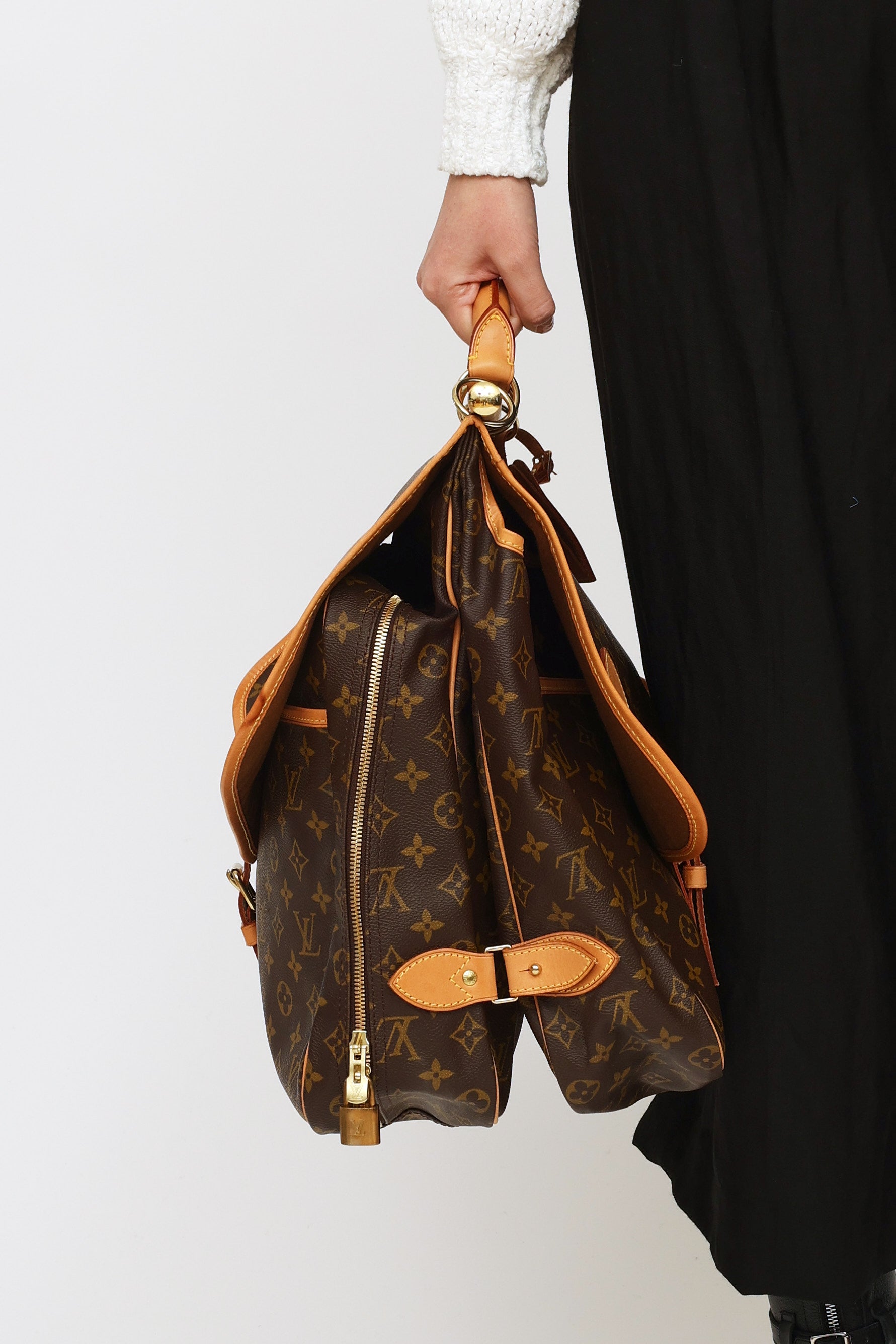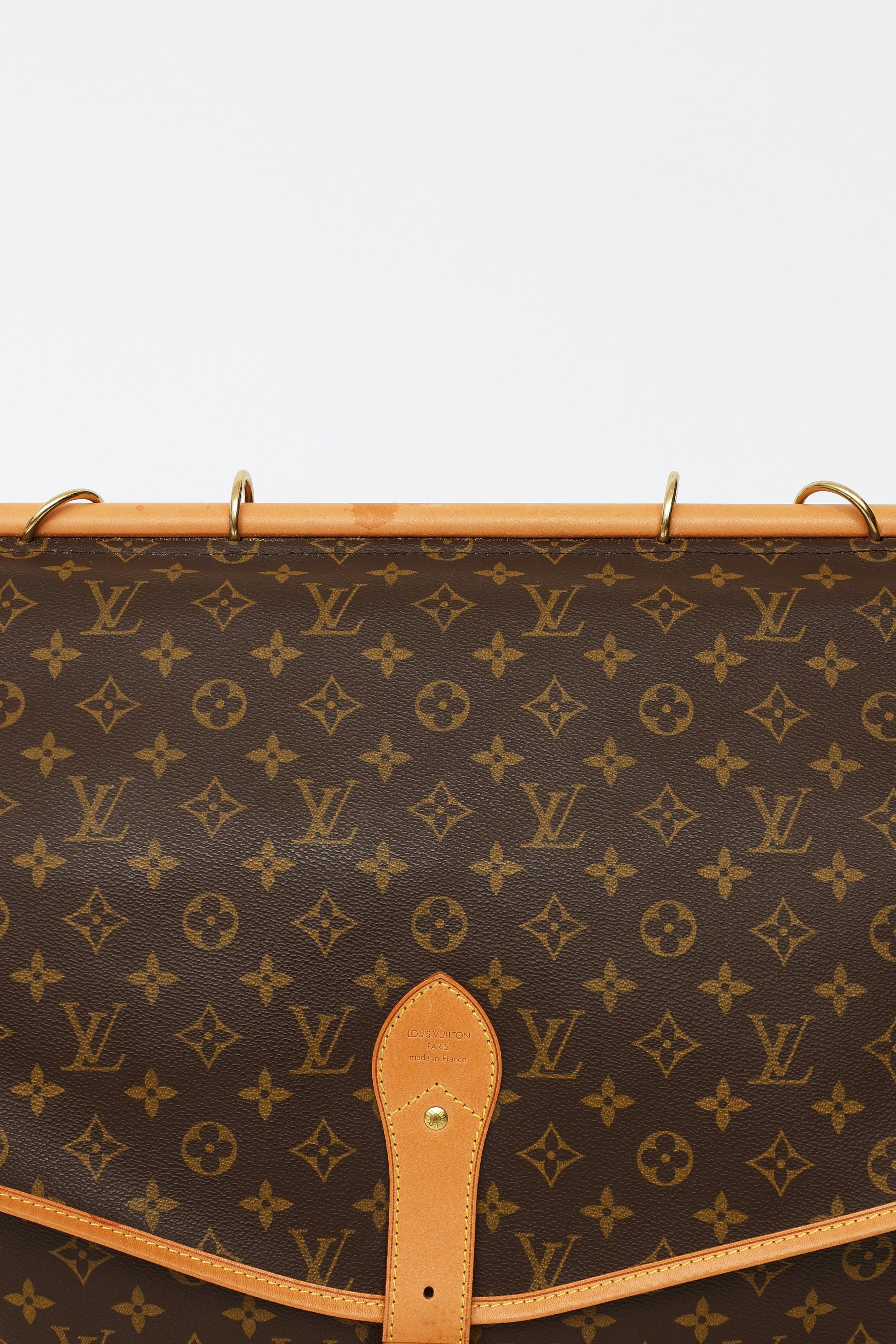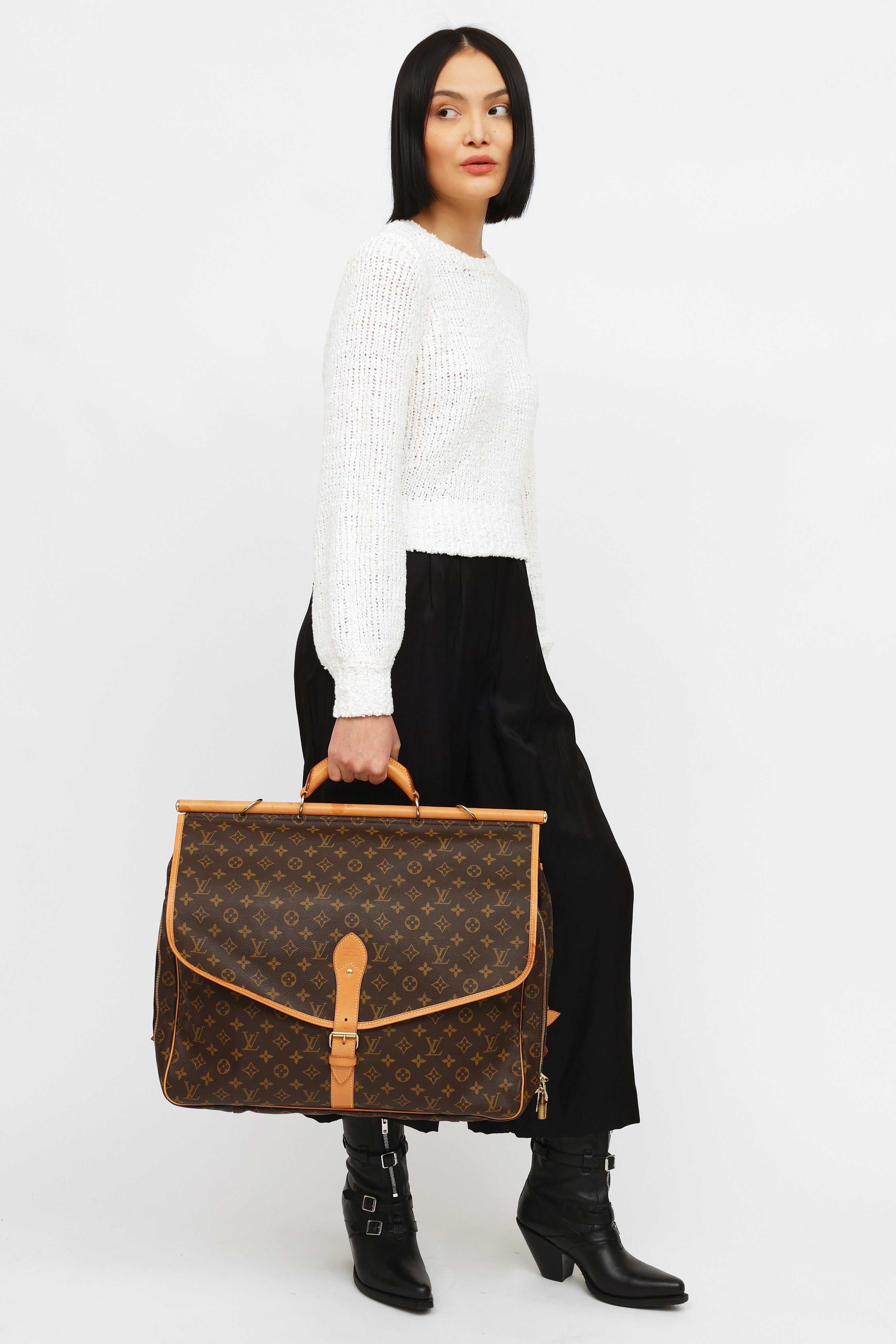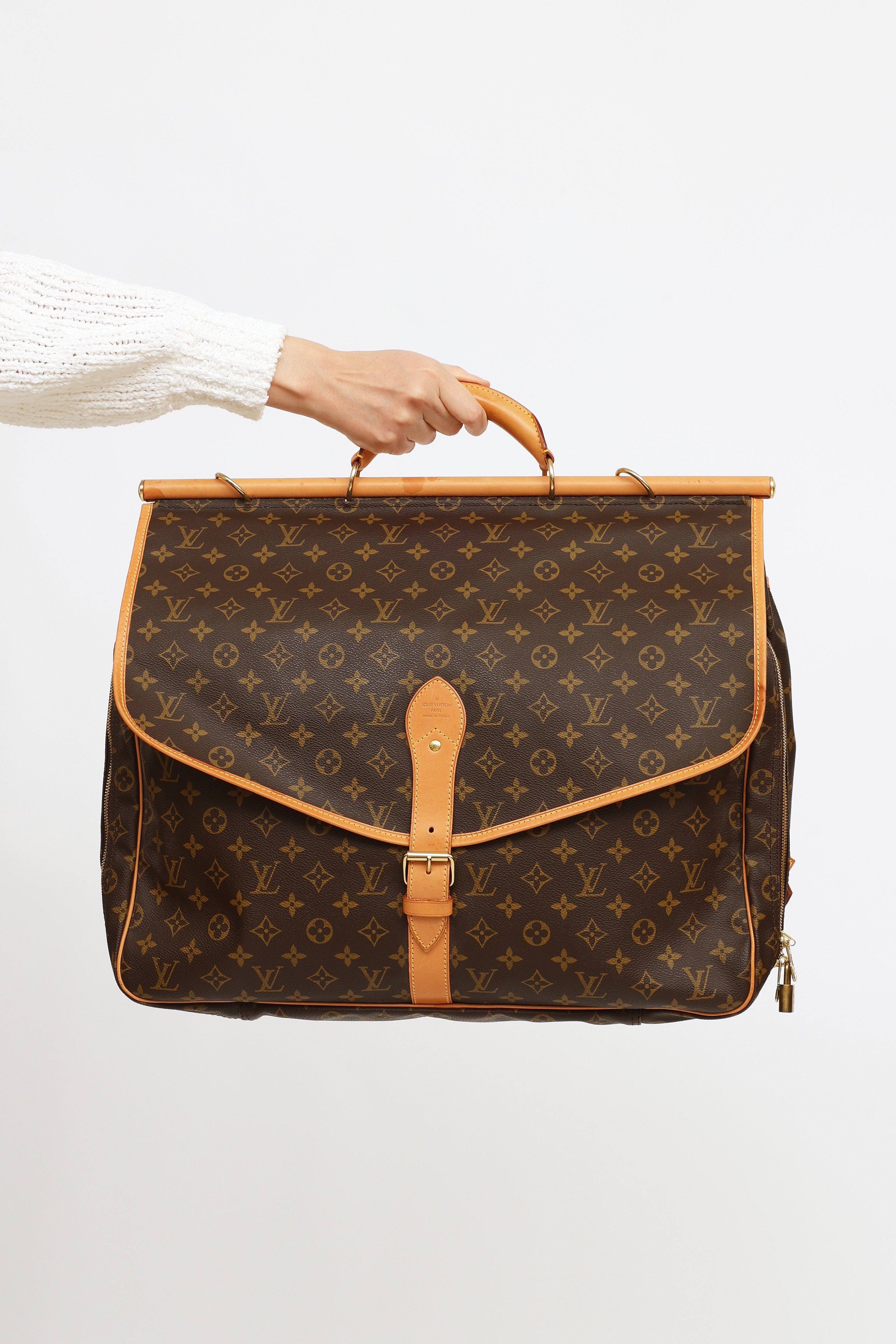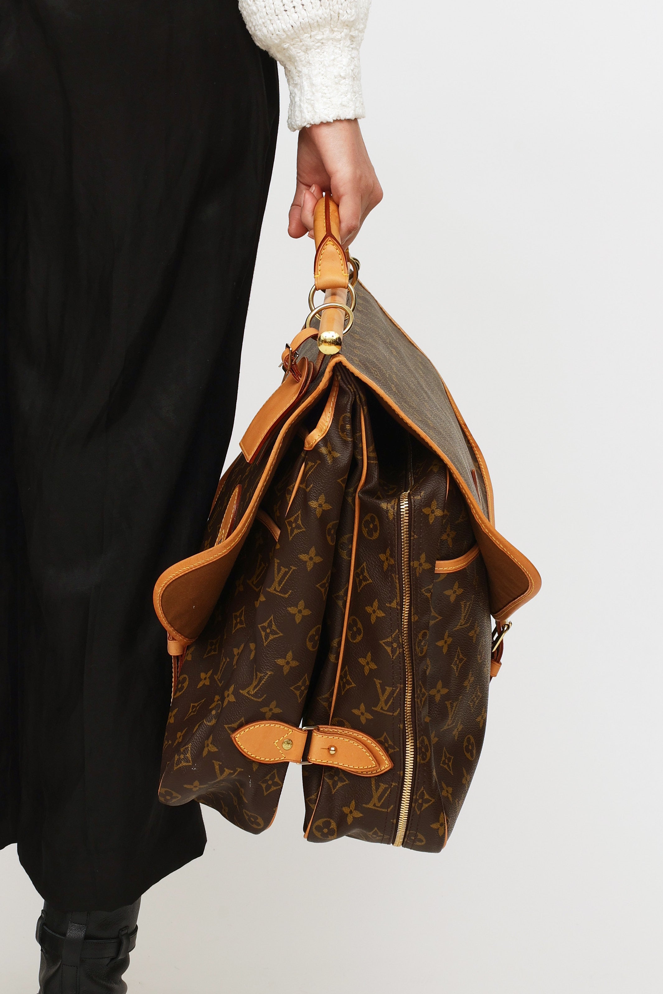 Pre-owned Louis Vuitton 1998 Monogram canvas Chasse Garment hunting travel bag featuring dual exterior compartments, singular rolled leather top handle with travel tag and additional gold-tone hook. Front compartment features dual buckle fastenings and two open-top pockets. Back compartment features singular buckle fastening, one large open-top pocket and one zipper closure compartment with gold-tone padlock with engraved logo text. Compartment features interior luggage straps. Leather trim throughout. Includes removable shoulder strap.
