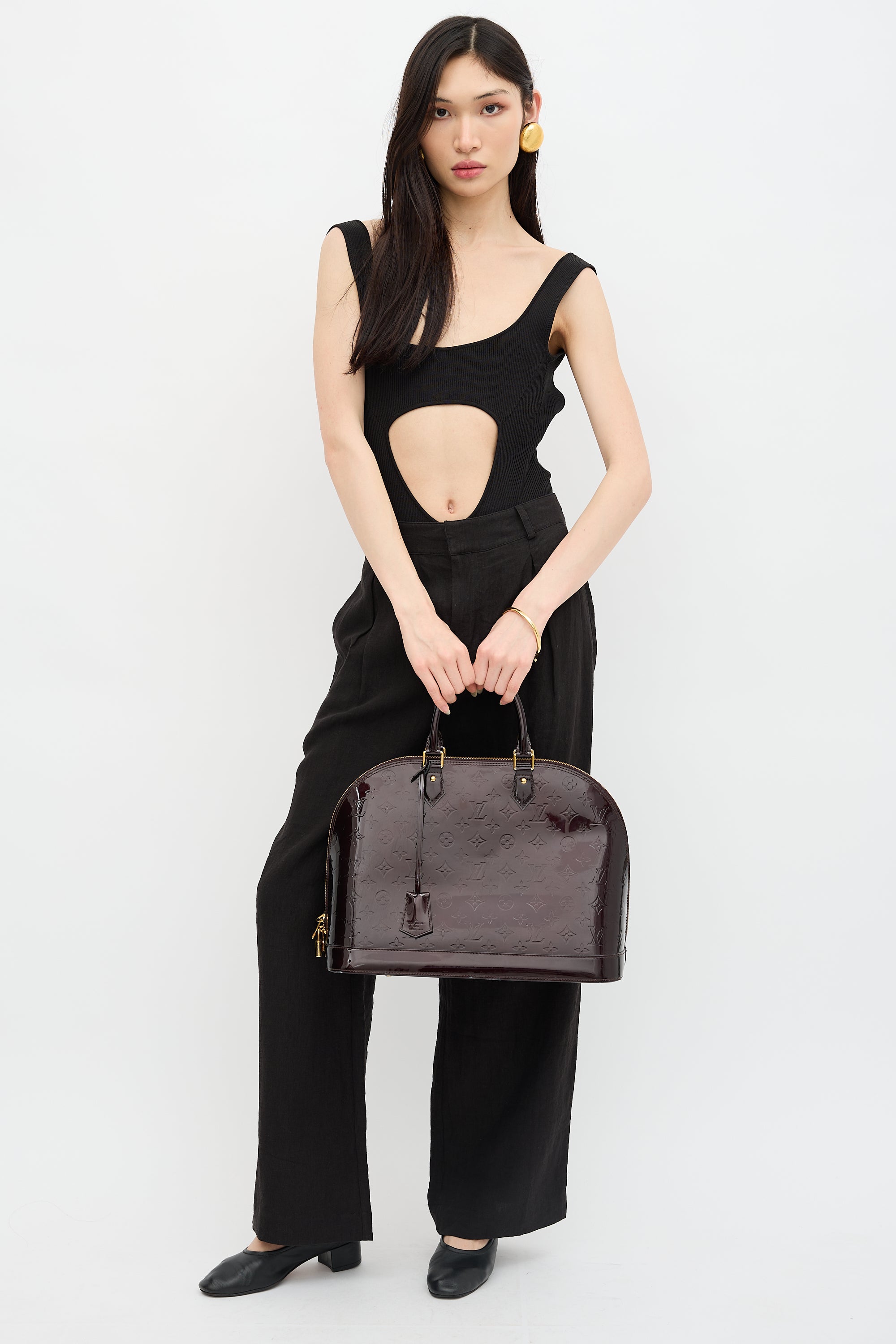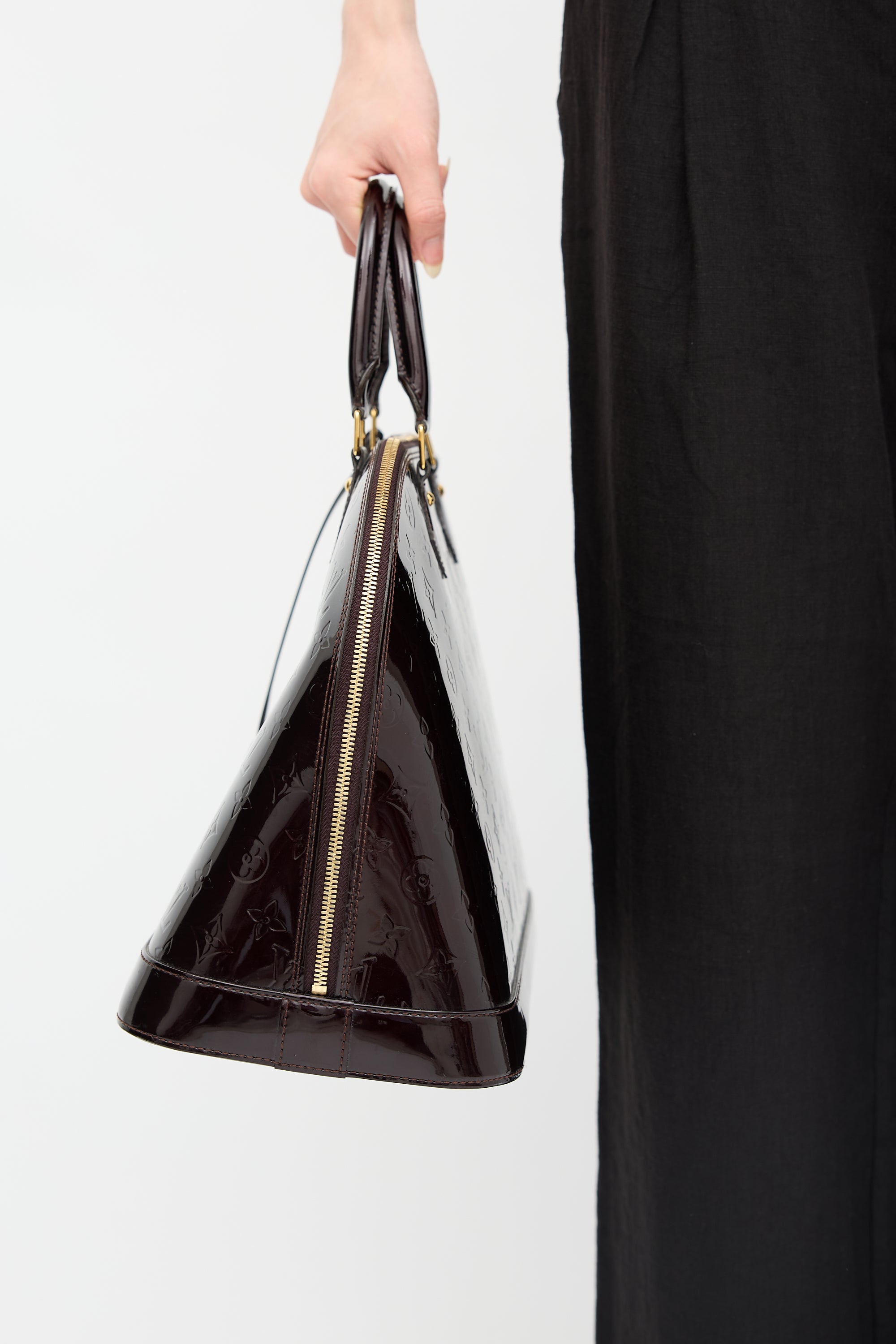 Pre-owned Louis Vuitton 2010 burgundy Vernis Alma bag featuring dual rolled top handles, gold tone hardware, detachable clochette, protective feet at base, dual zip closure top with logo debossed lock, and one lined main compartment with two slip pockets. Comes with original dust bag.