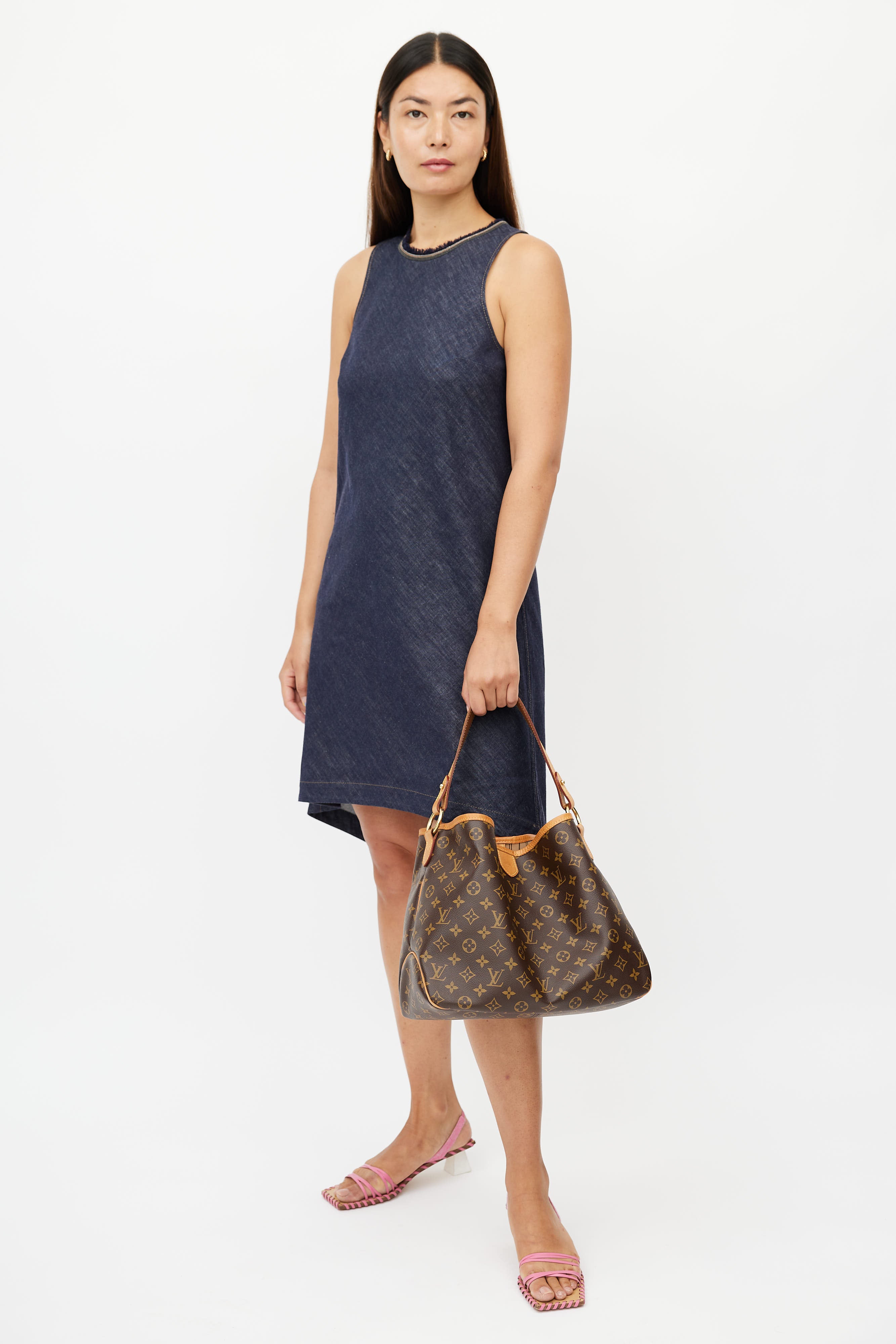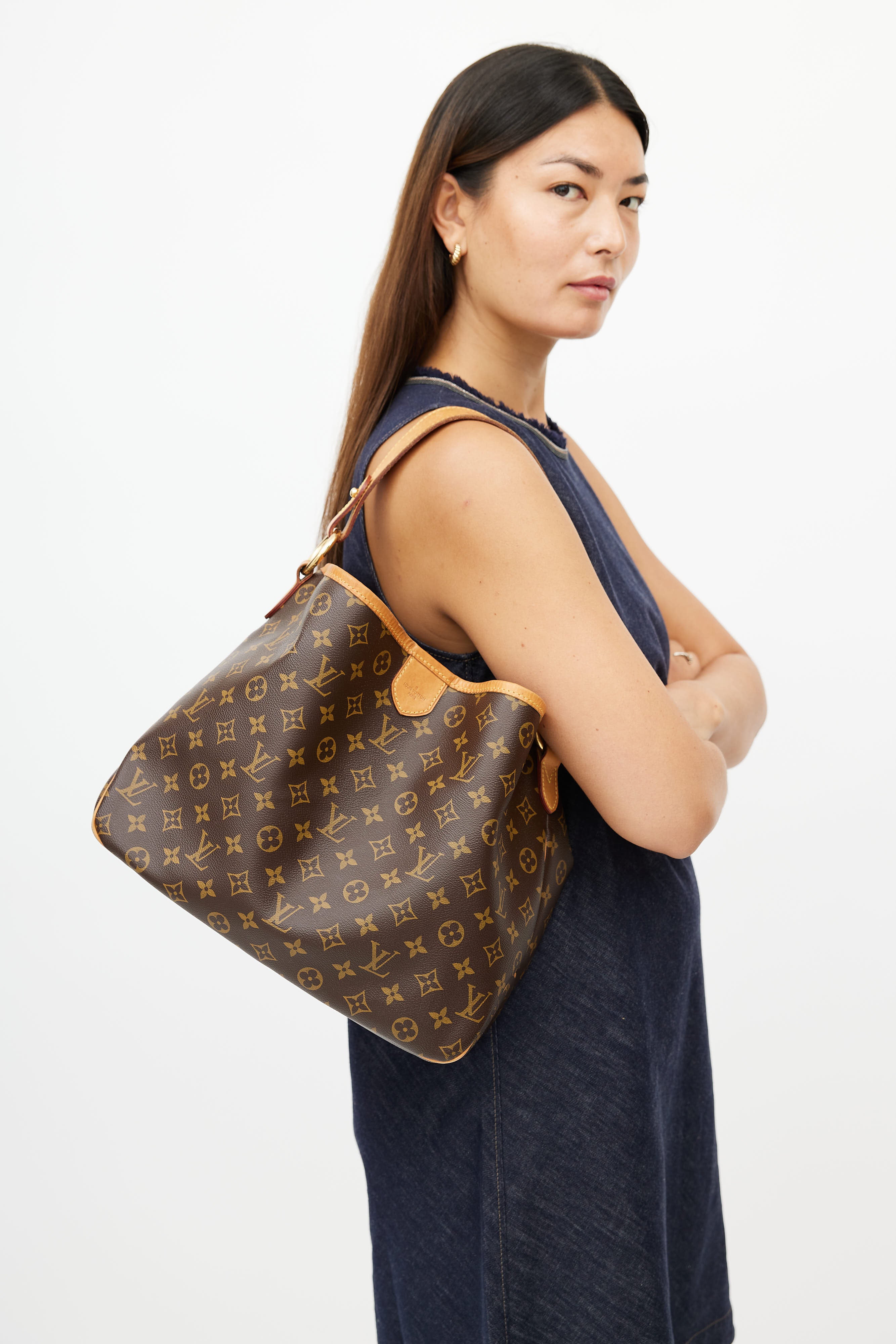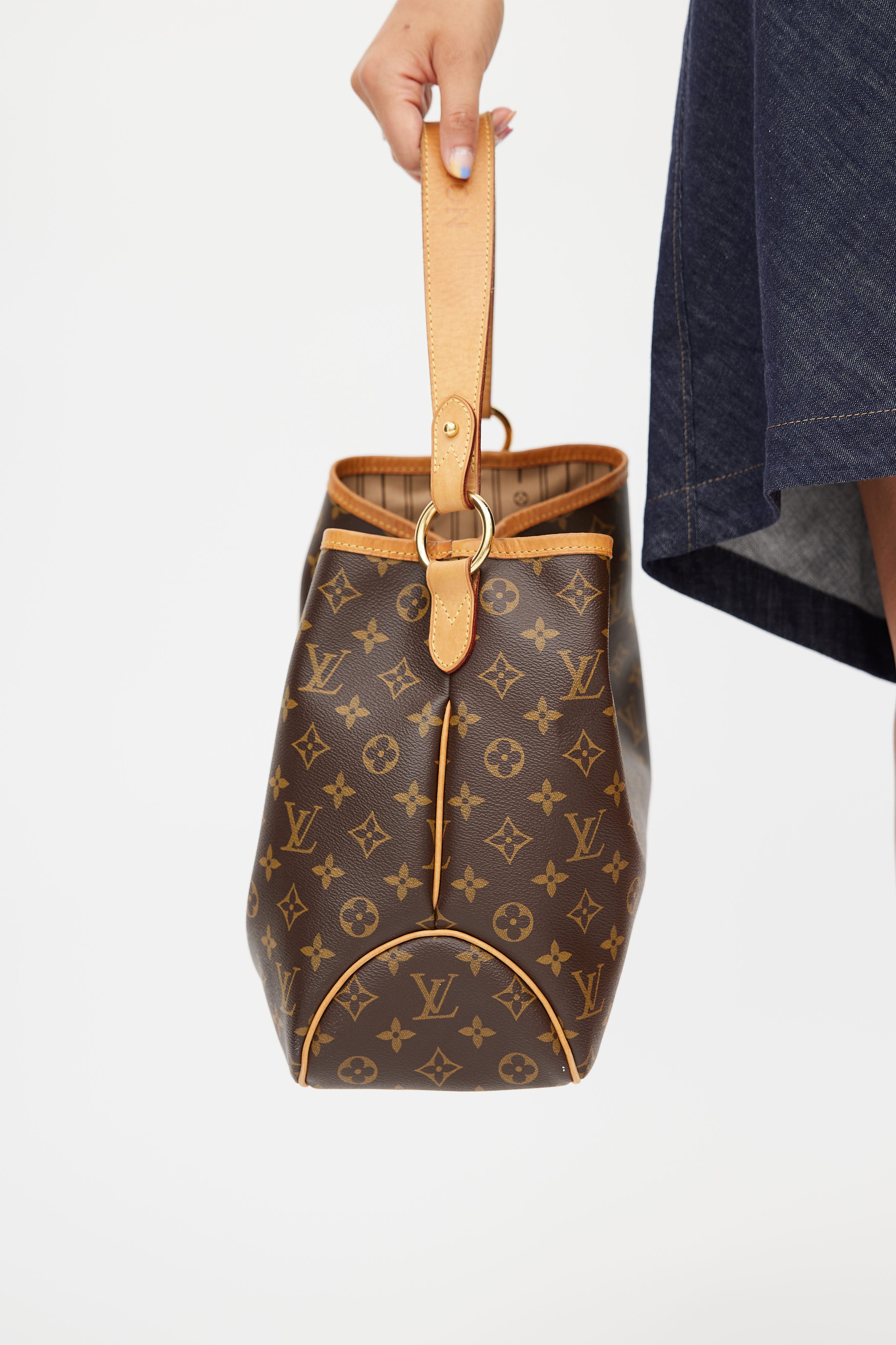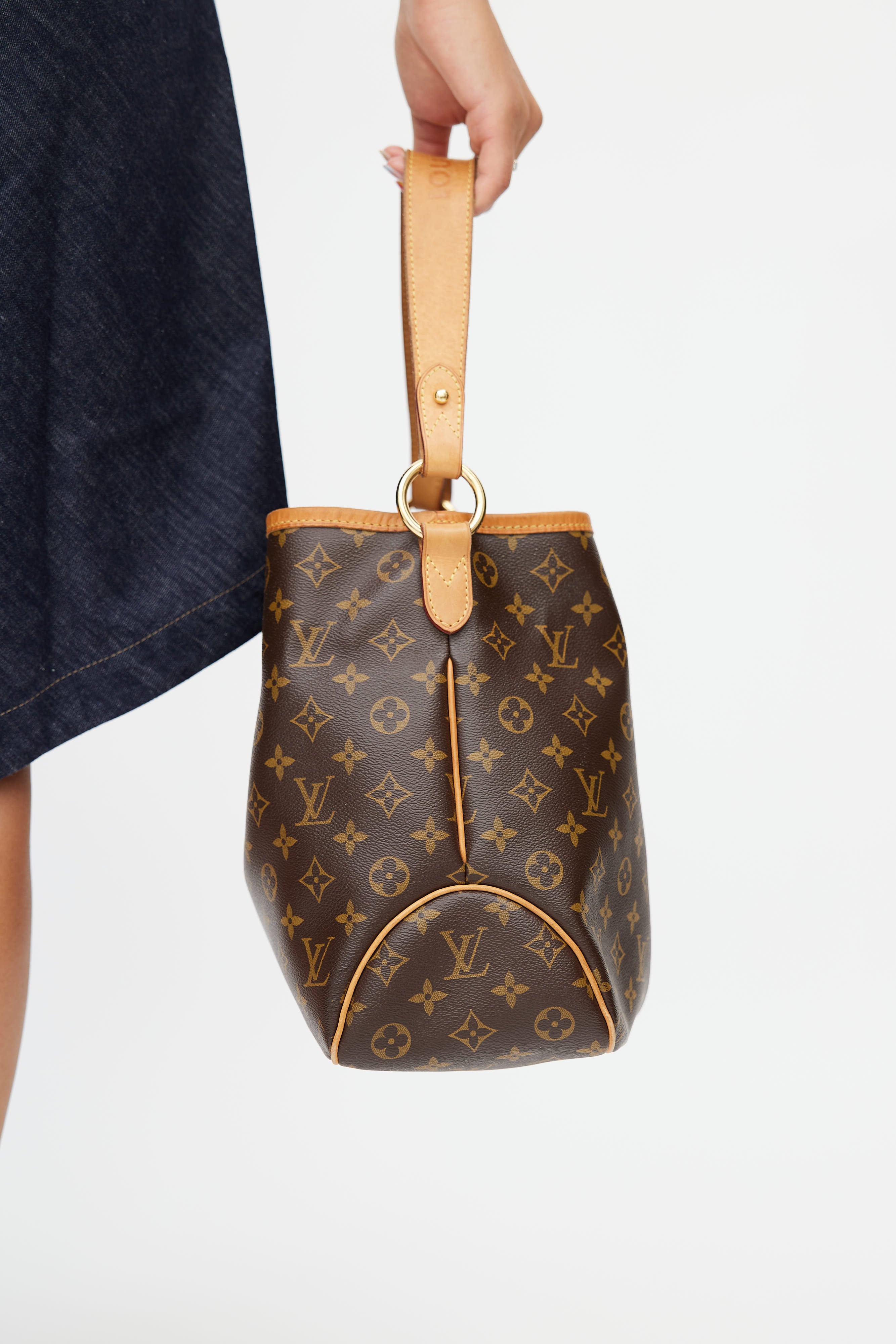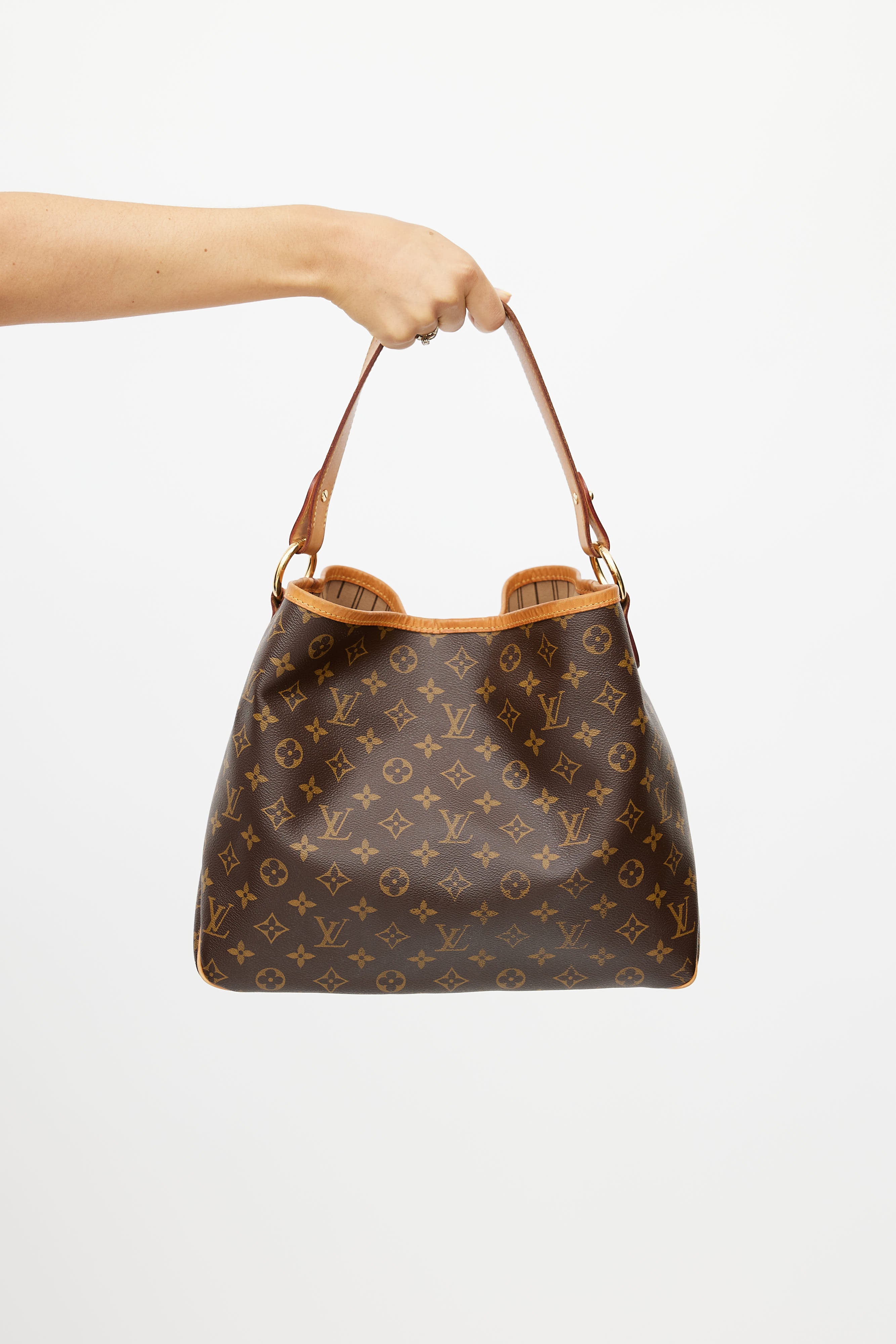 Pre-owned 2014 Louis Vuitton brown Delightful shoulder bag featuring signature Monogram coated canvas, light brown Vachetta leather trim, logo tab at front, open compartment with clasp closure, branded canvas lining, interior zip pocket, and fixed shoulder strap with engraved logo. Comes with dust bag.