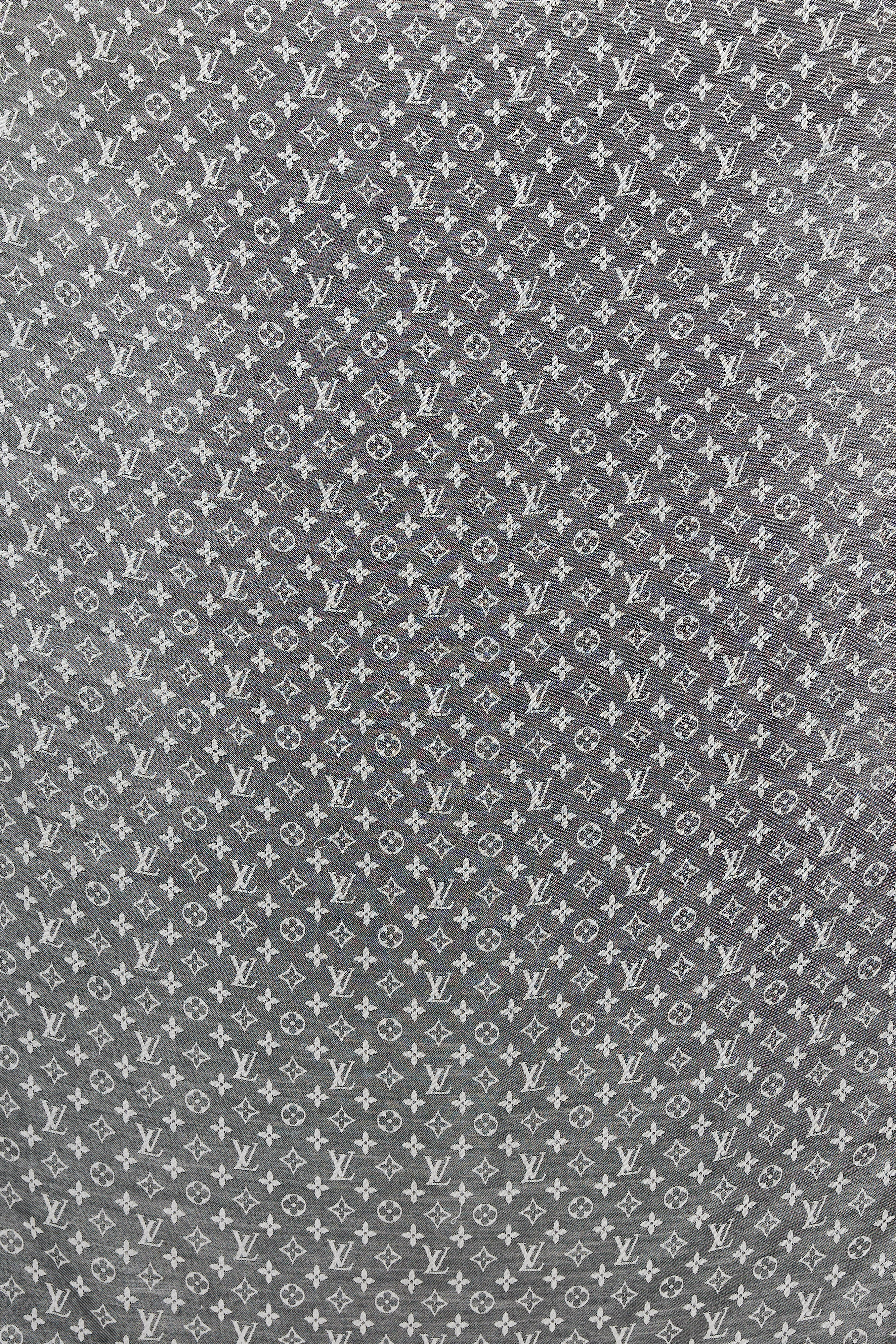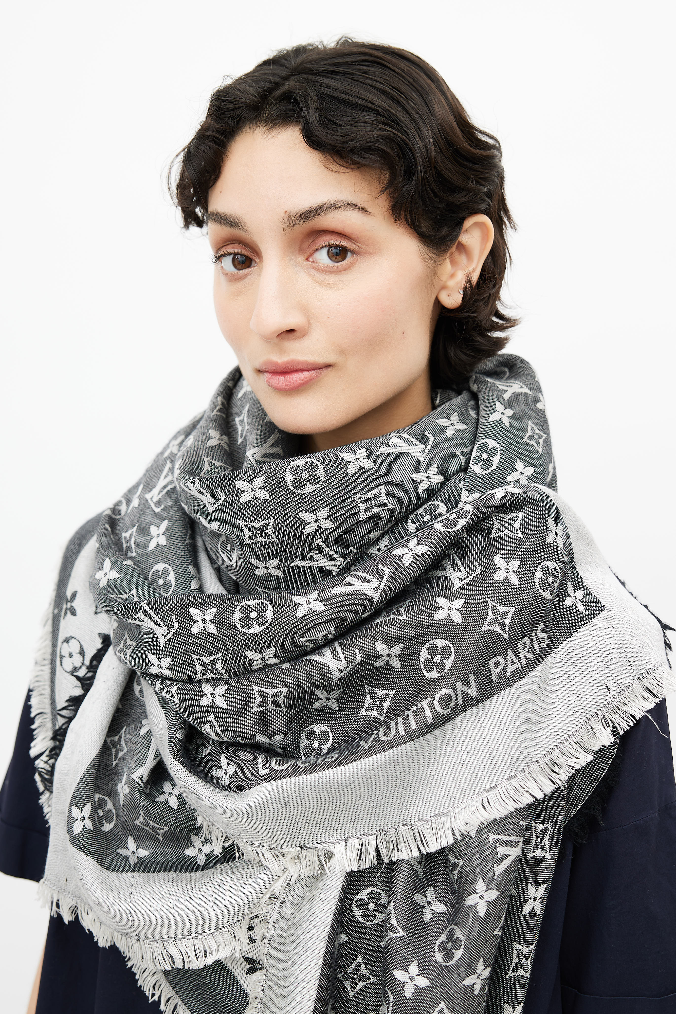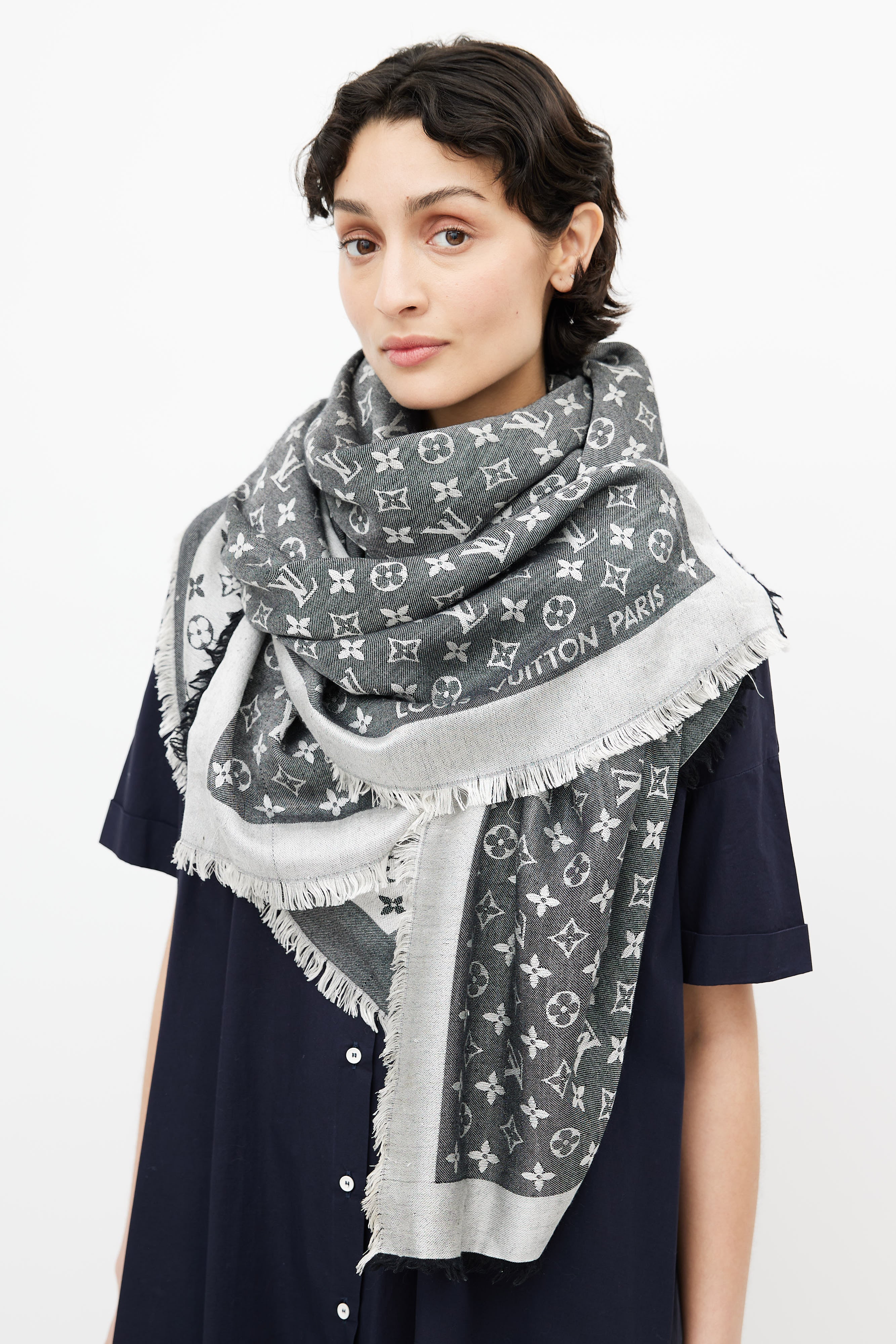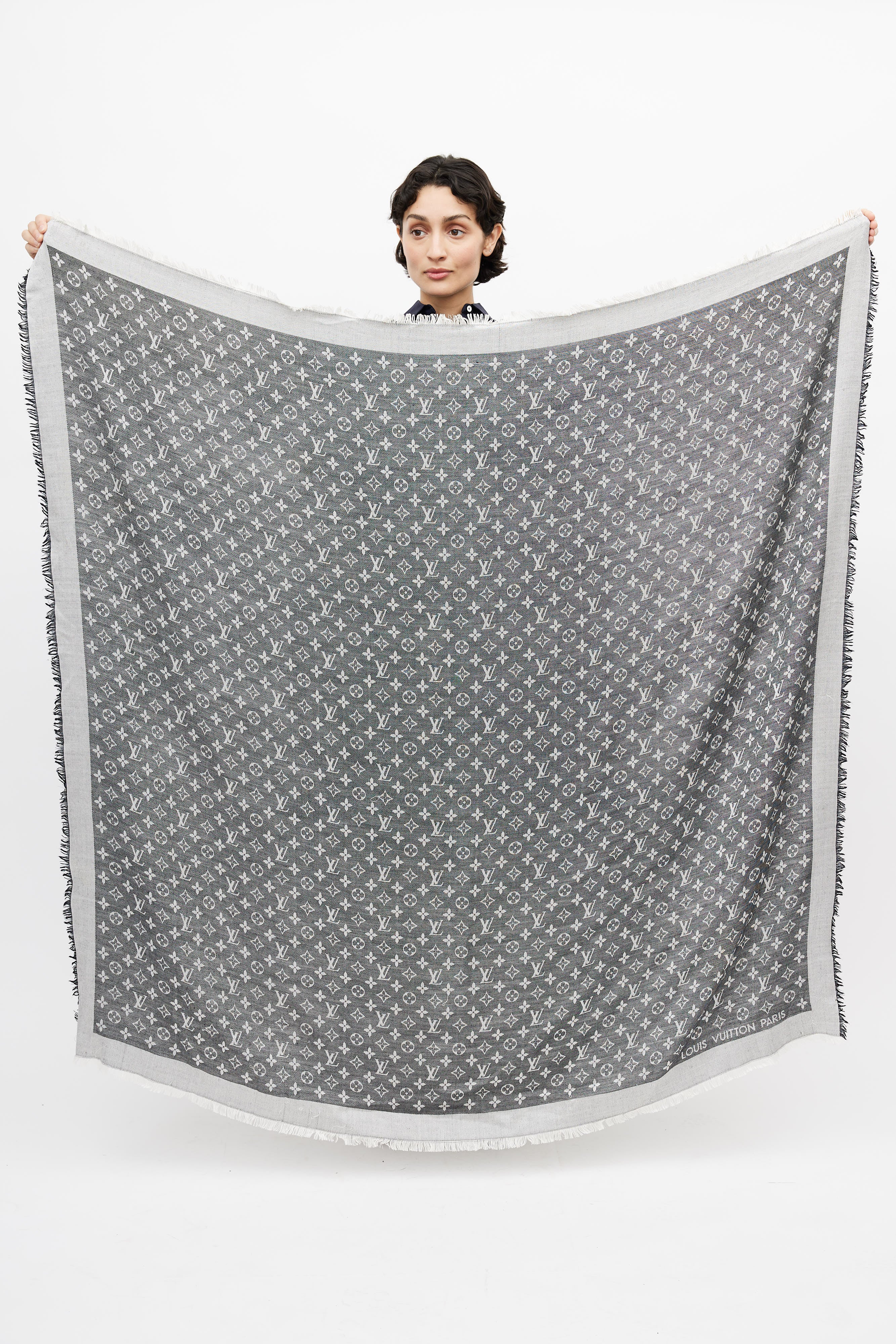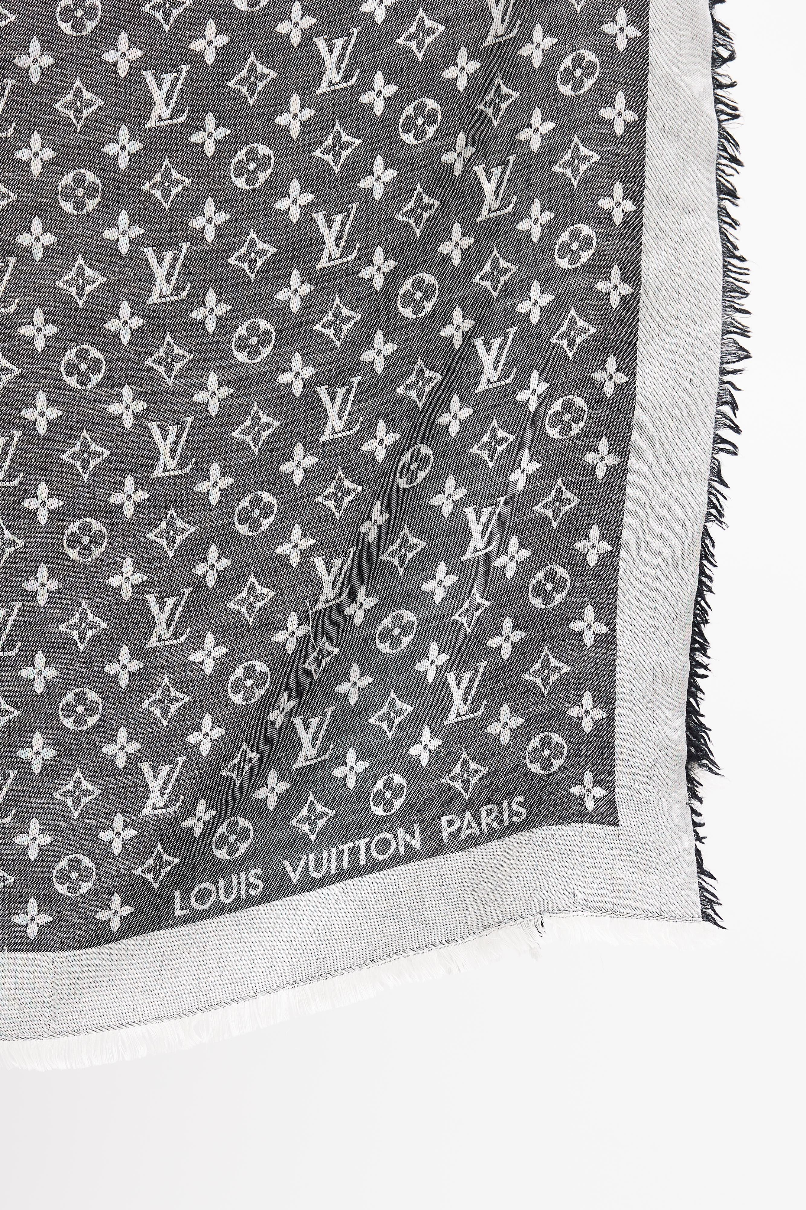 Pre-owned Louis Vuitton black Chale scarf featuring light grey monogram jacquard weave throughout, reverse light grey panel, woven logo, and fringe detailing throughout.