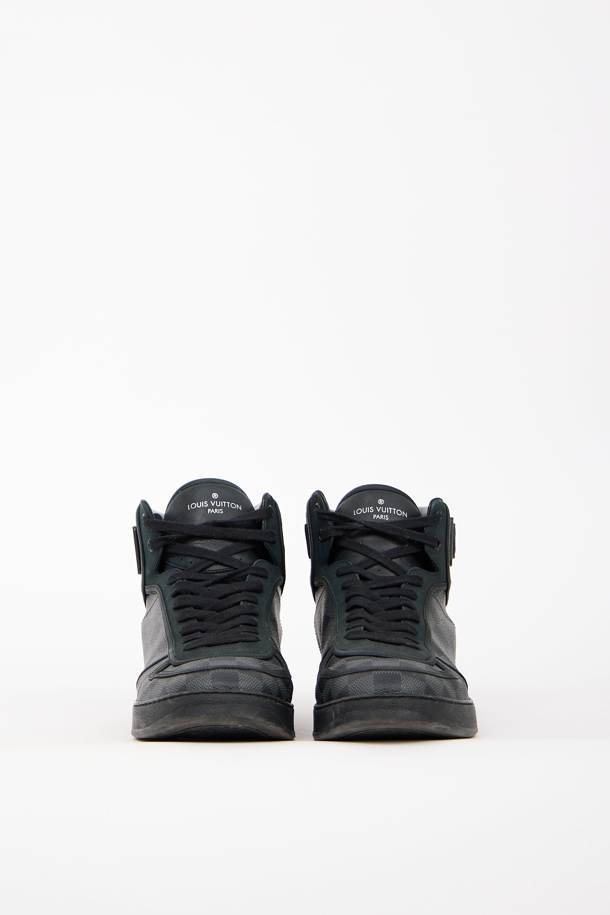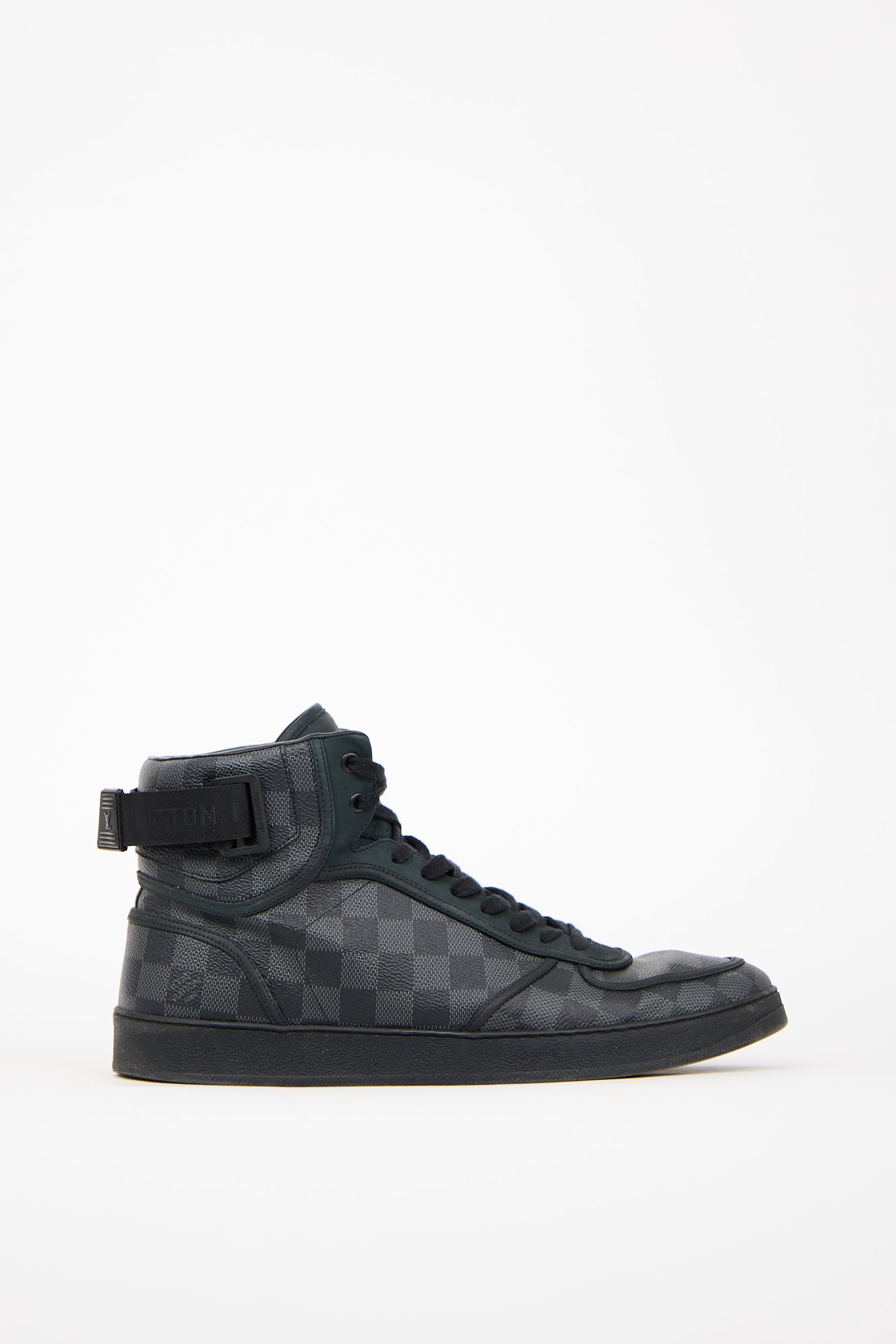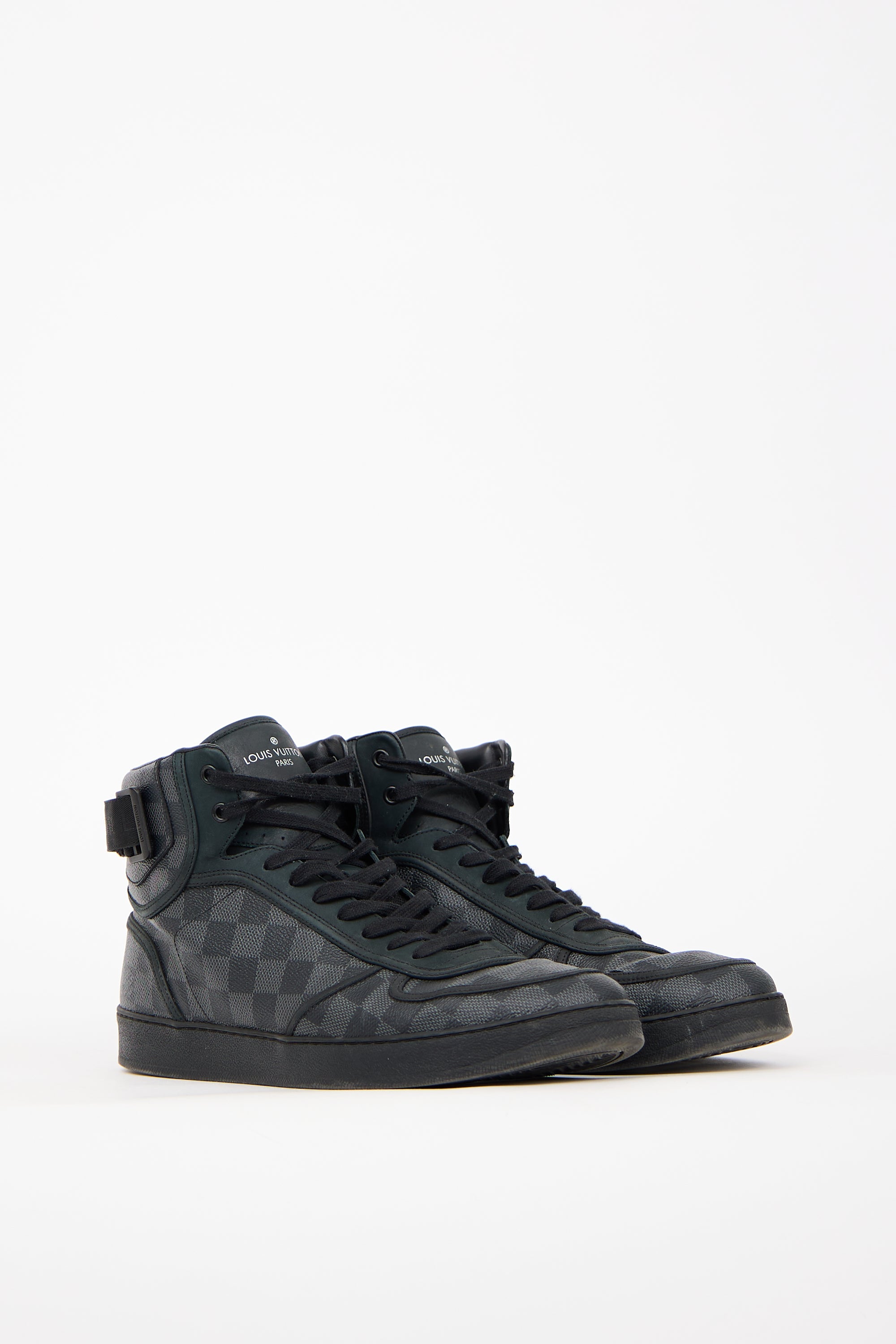 Pre-owned Louis Vuitton leather Damier Graphite Rivoli High Top sneakers featuring rounded toe, lace up front, Velcro ankle strap with tonal logo, and padded tongue and collar.