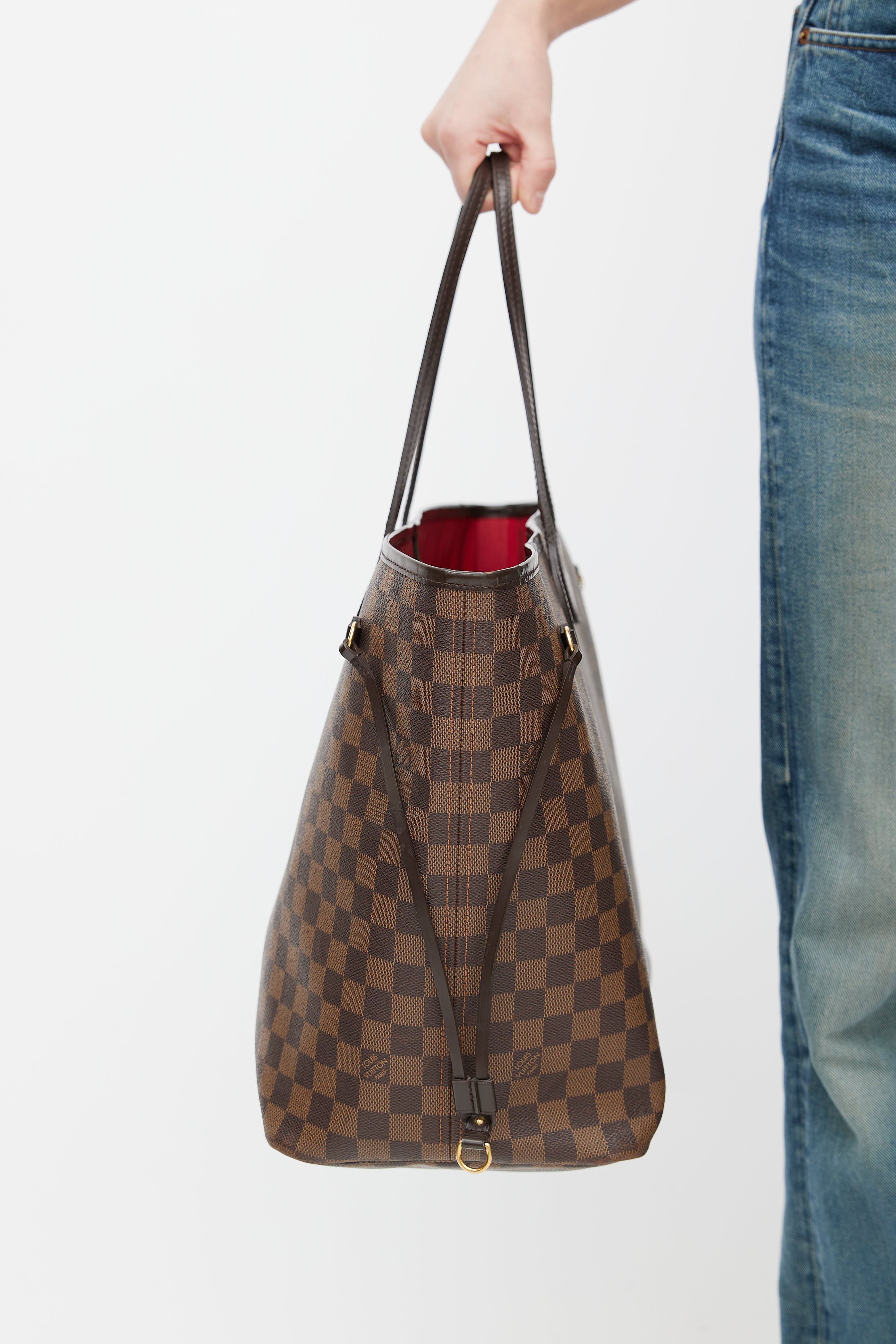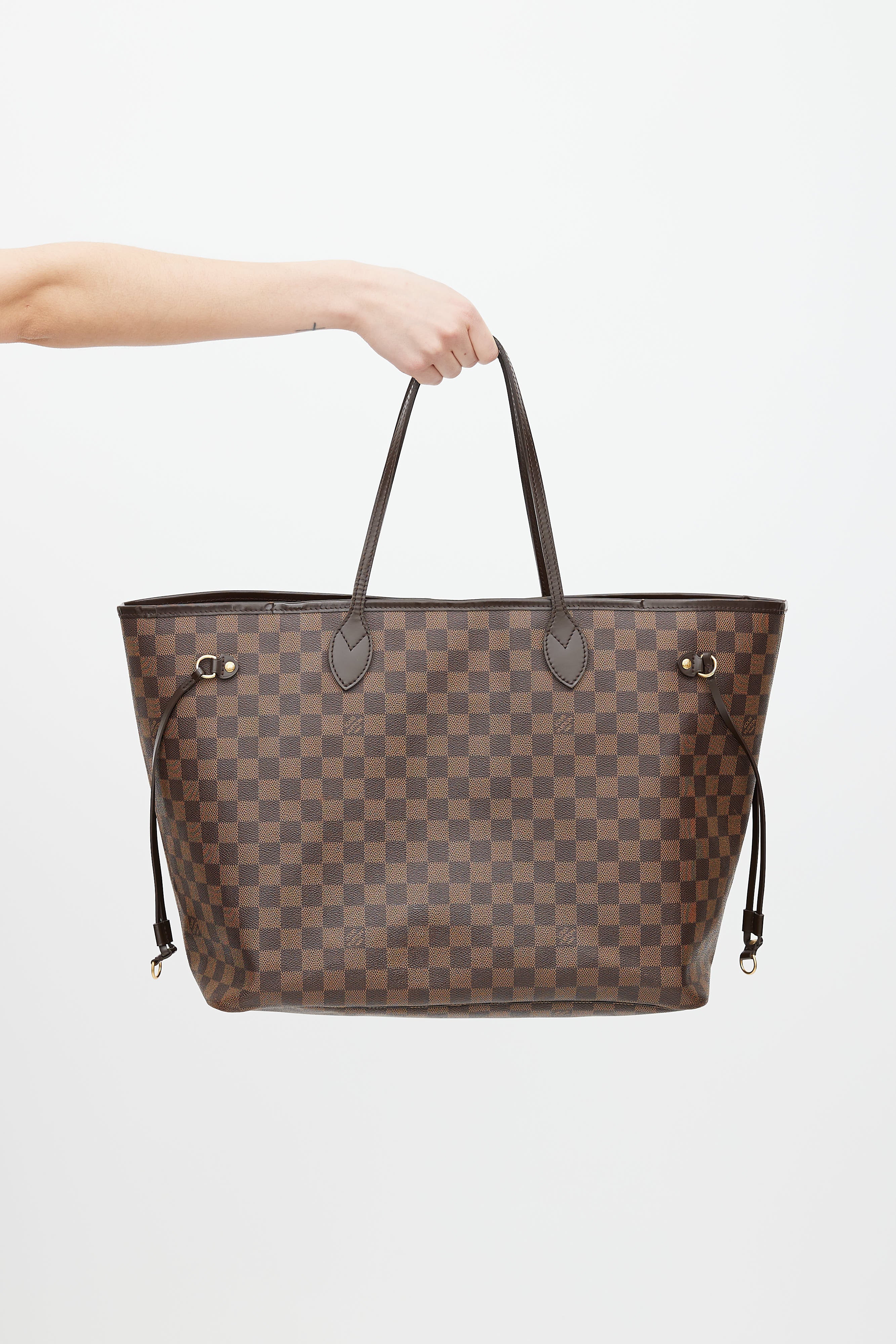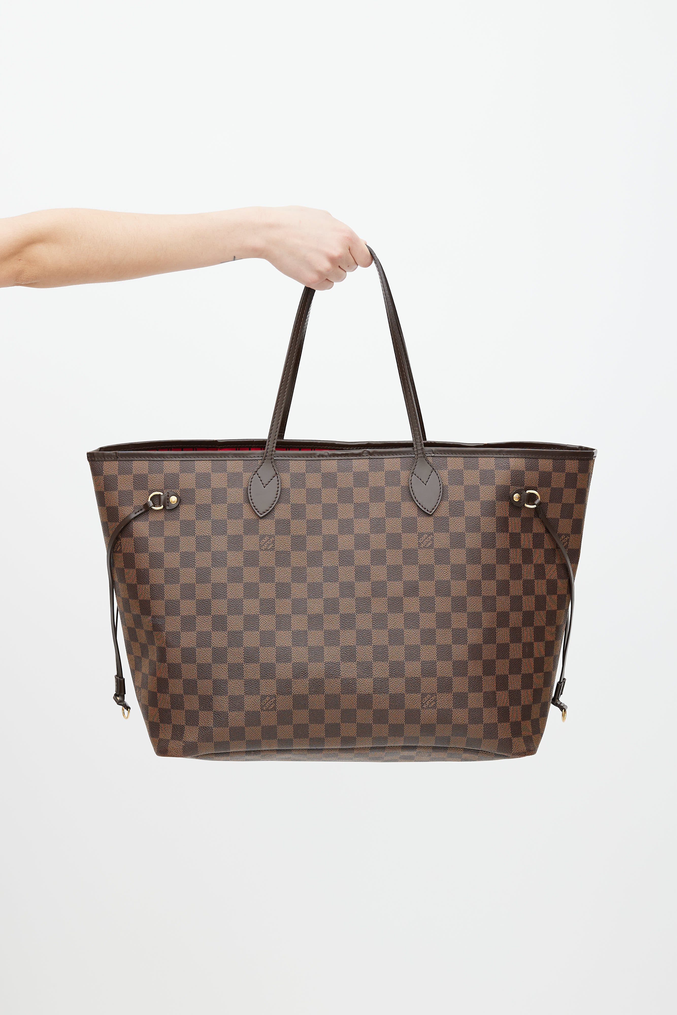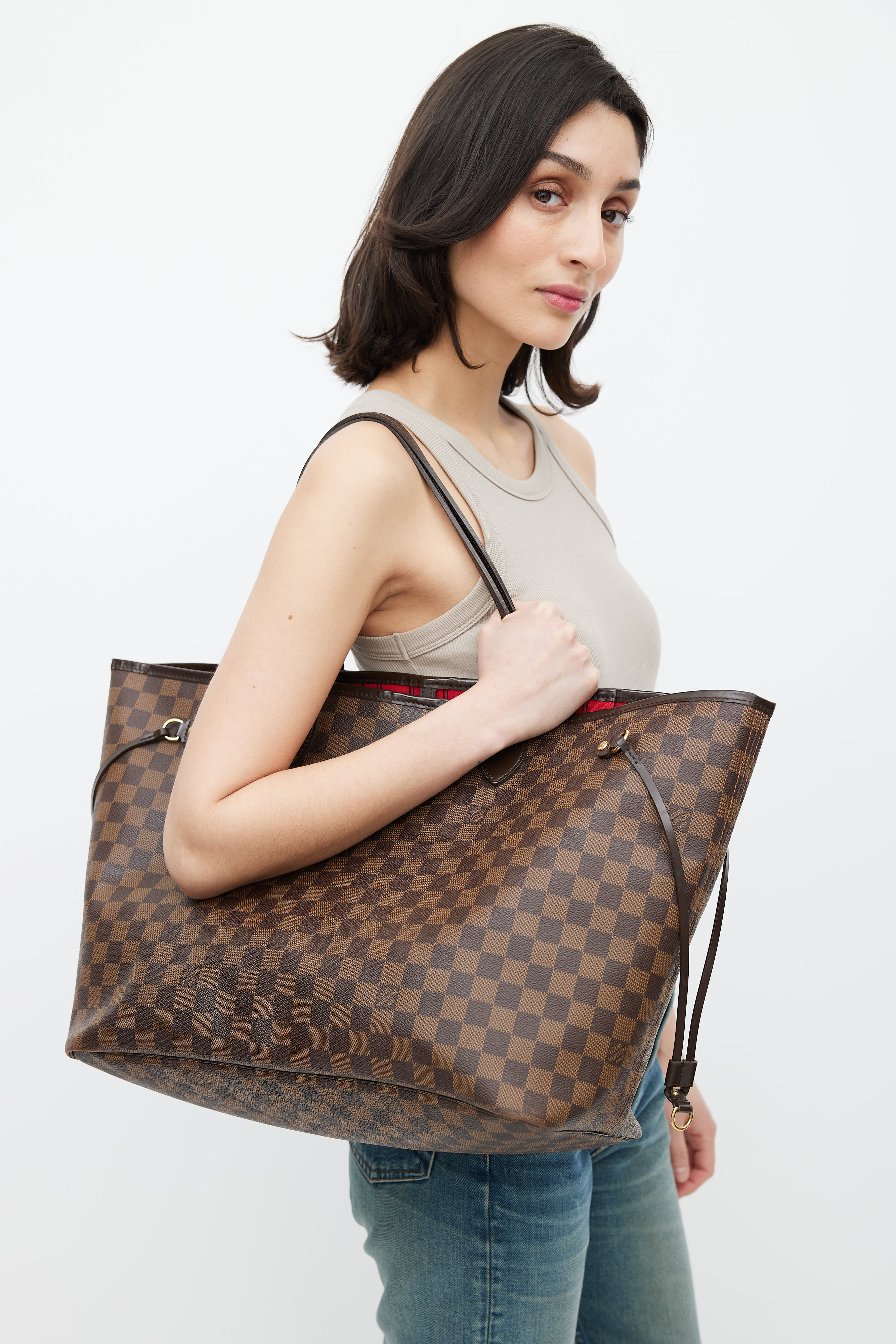 Pre-owned Louis Vuitton Damier Ebene Neverfull GM bag featuring brown Damier coated canvas, brown leather trim and handles, gold tone hardware, adjustable leather tabs at sides, red striped canvas lining, one main compartment, one interior pouch pocket, one interior D ring and top clasp closure.