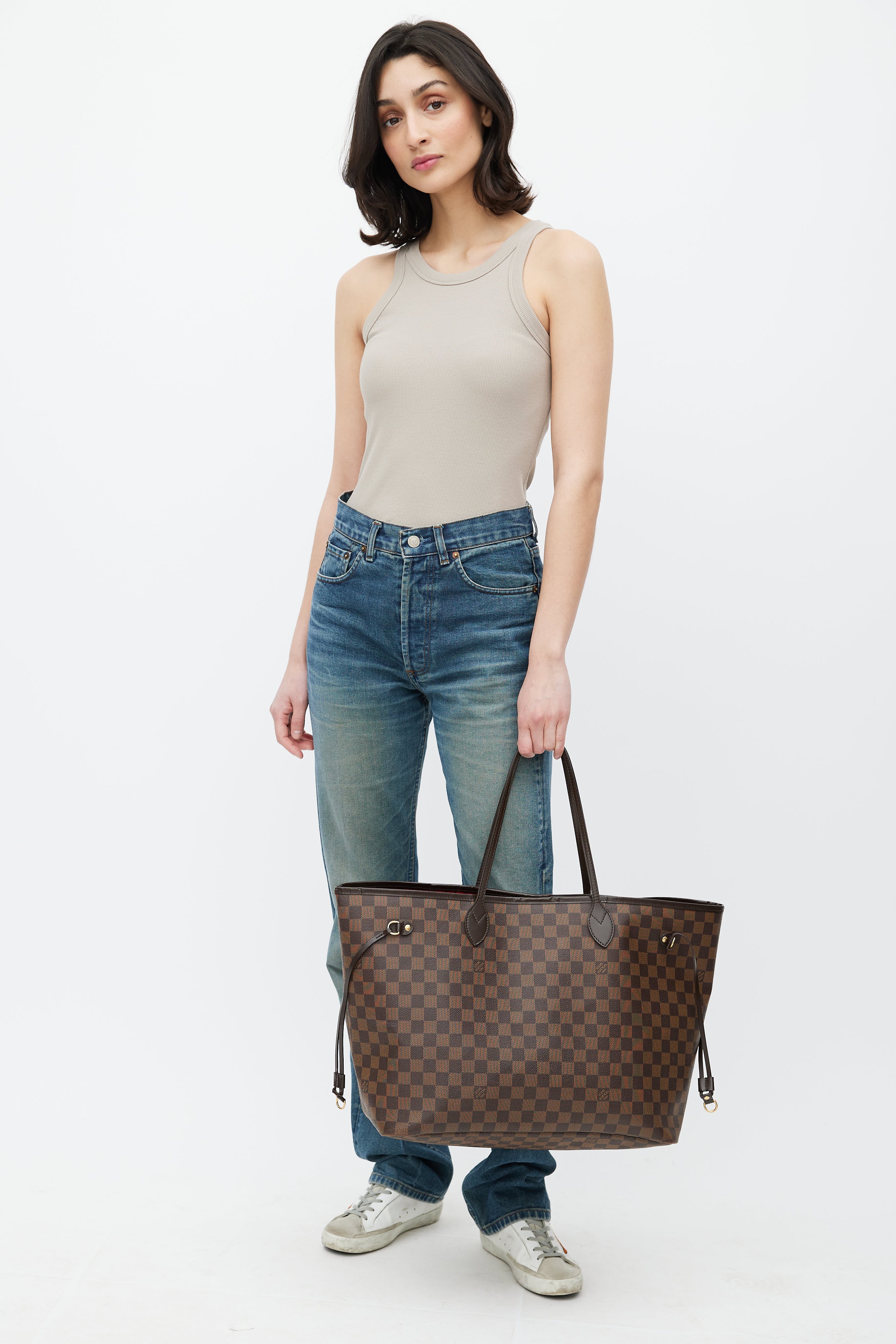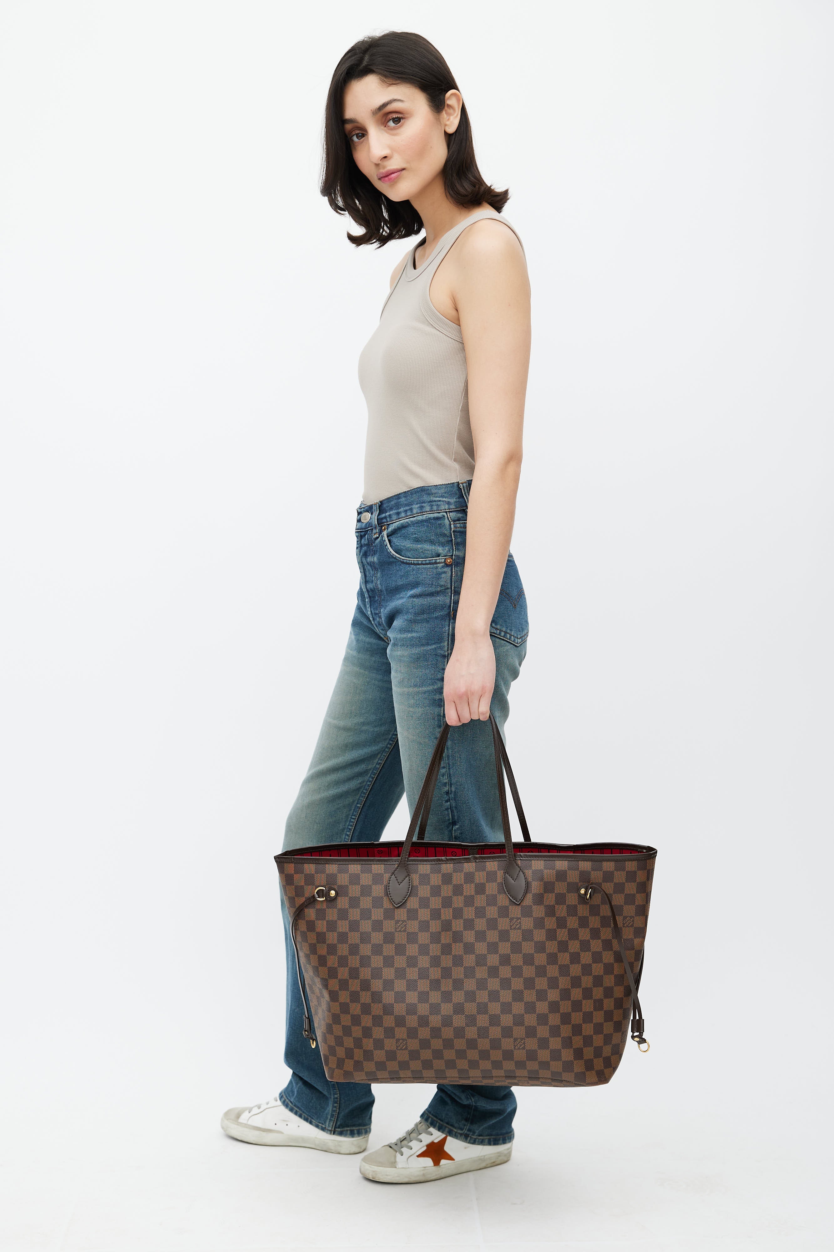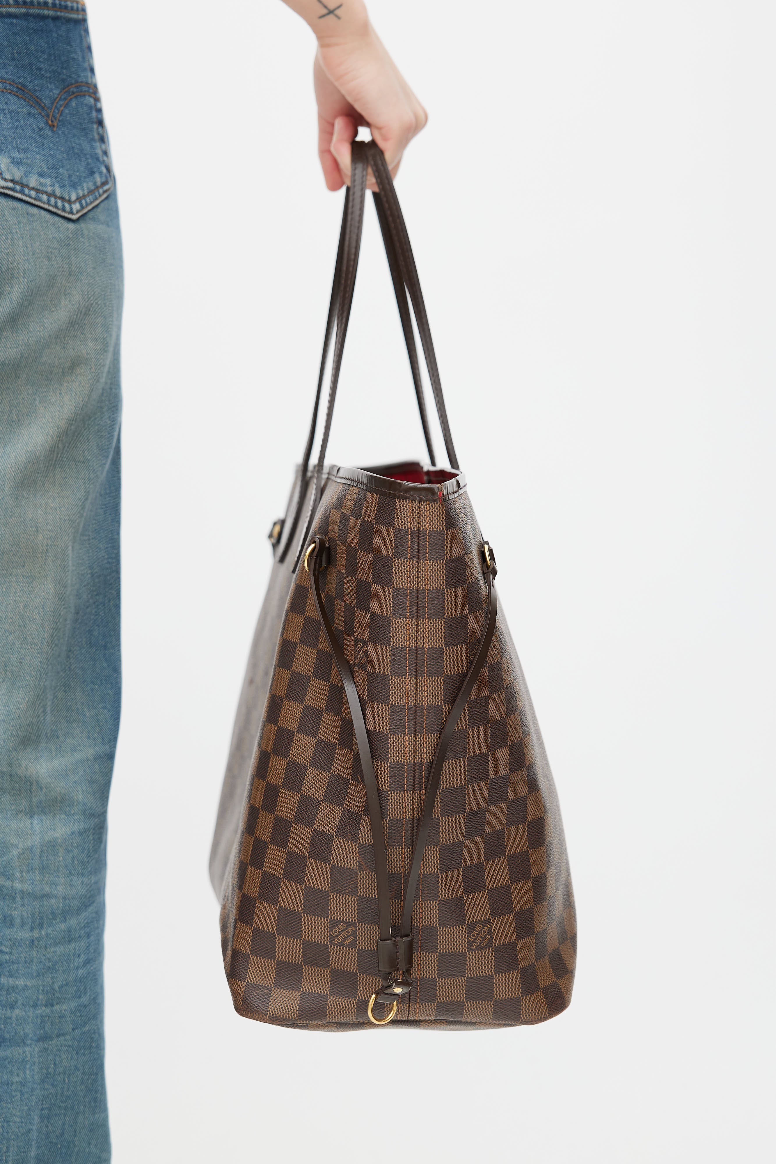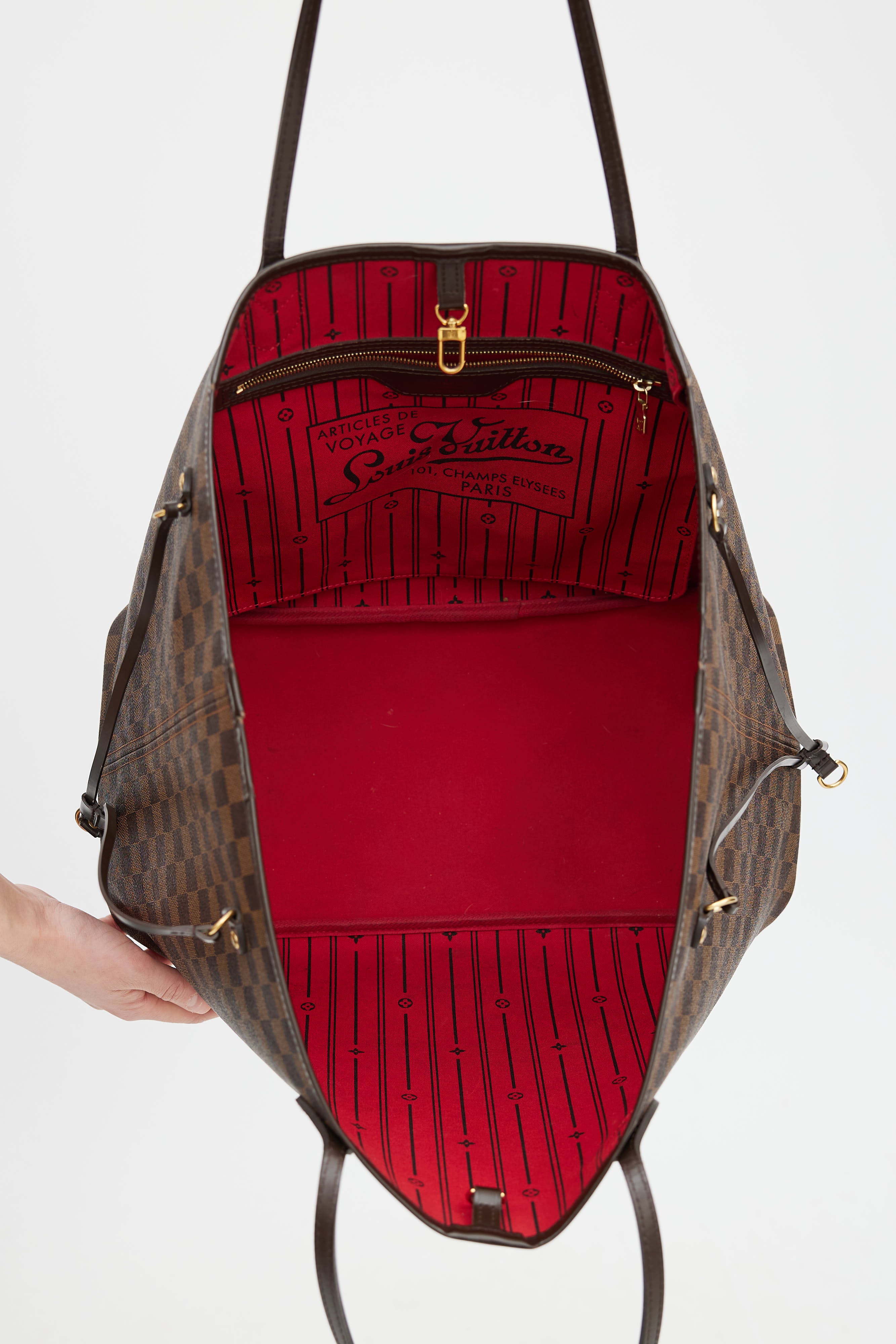 Pre-owned Louis Vuitton Damier Ebene Neverfull GM bag featuring brown Damier coated canvas, brown leather trim and handles, gold tone hardware, adjustable leather tabs at sides, red striped canvas lining, one main compartment, one interior pouch pocket, one interior D ring and top clasp closure.