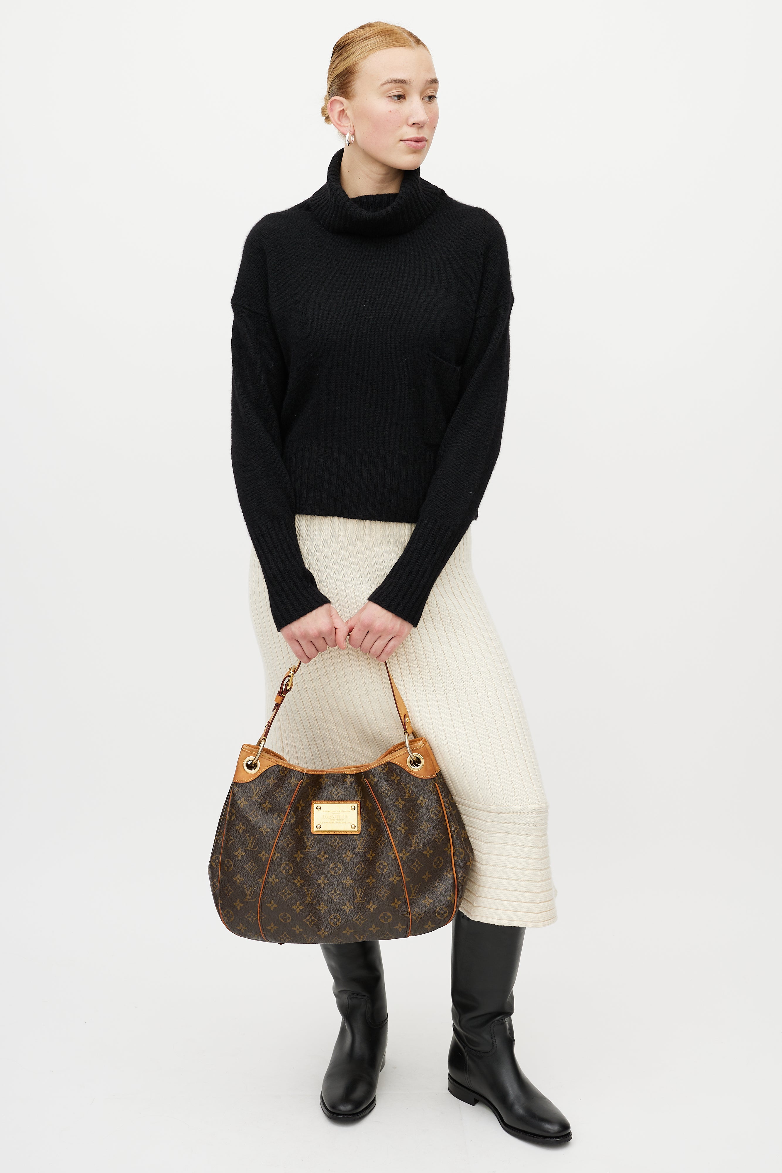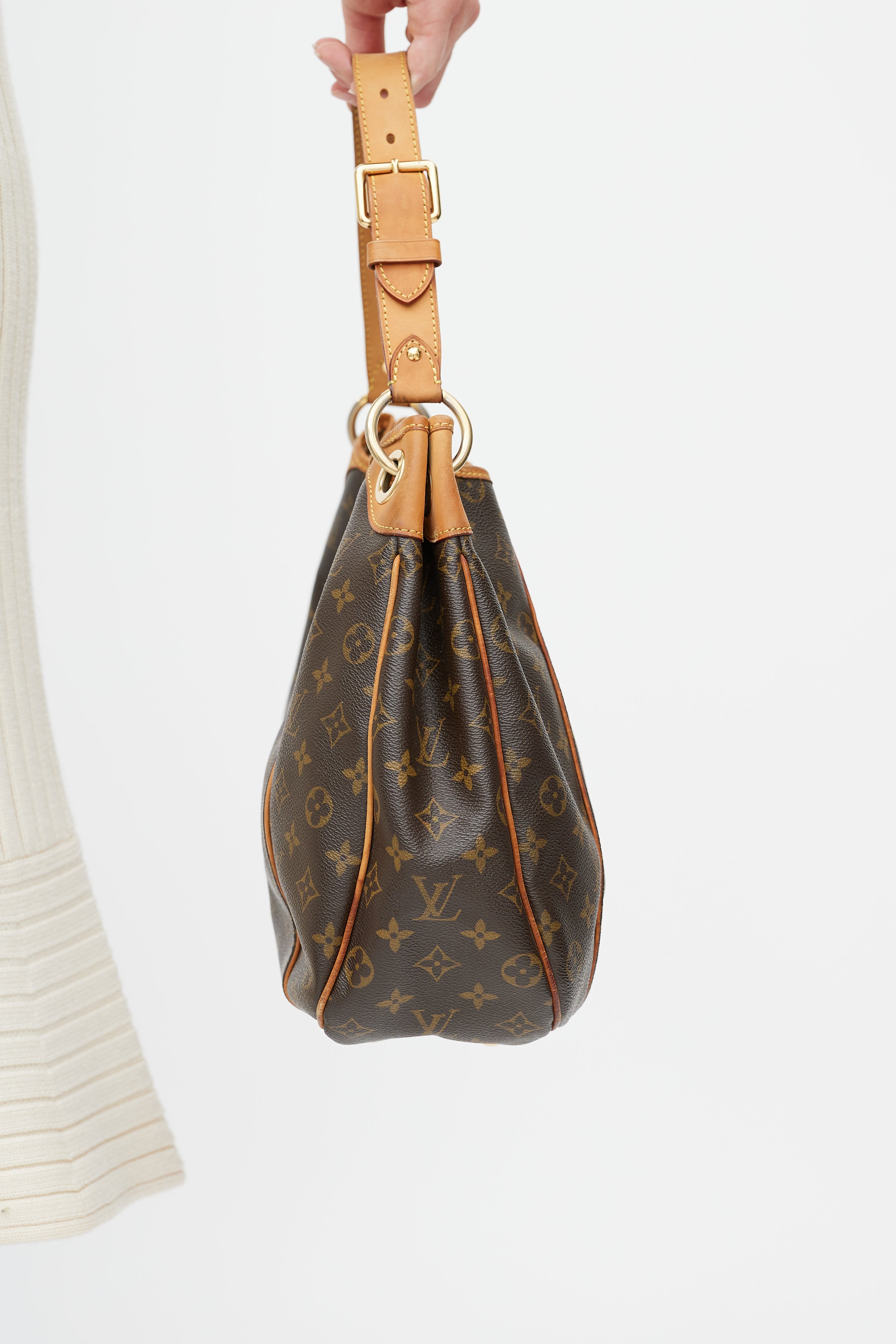 Pre-owned Louis Vuitton brown Galleria PM bag in monogram coated canvas featuring gold tone logo hardware at front, adjustable shoulder strap, one main compartment with two slip pockets and one flap pocket, gold tone protective feet at bottom of bag, and top magnetic snap closure.