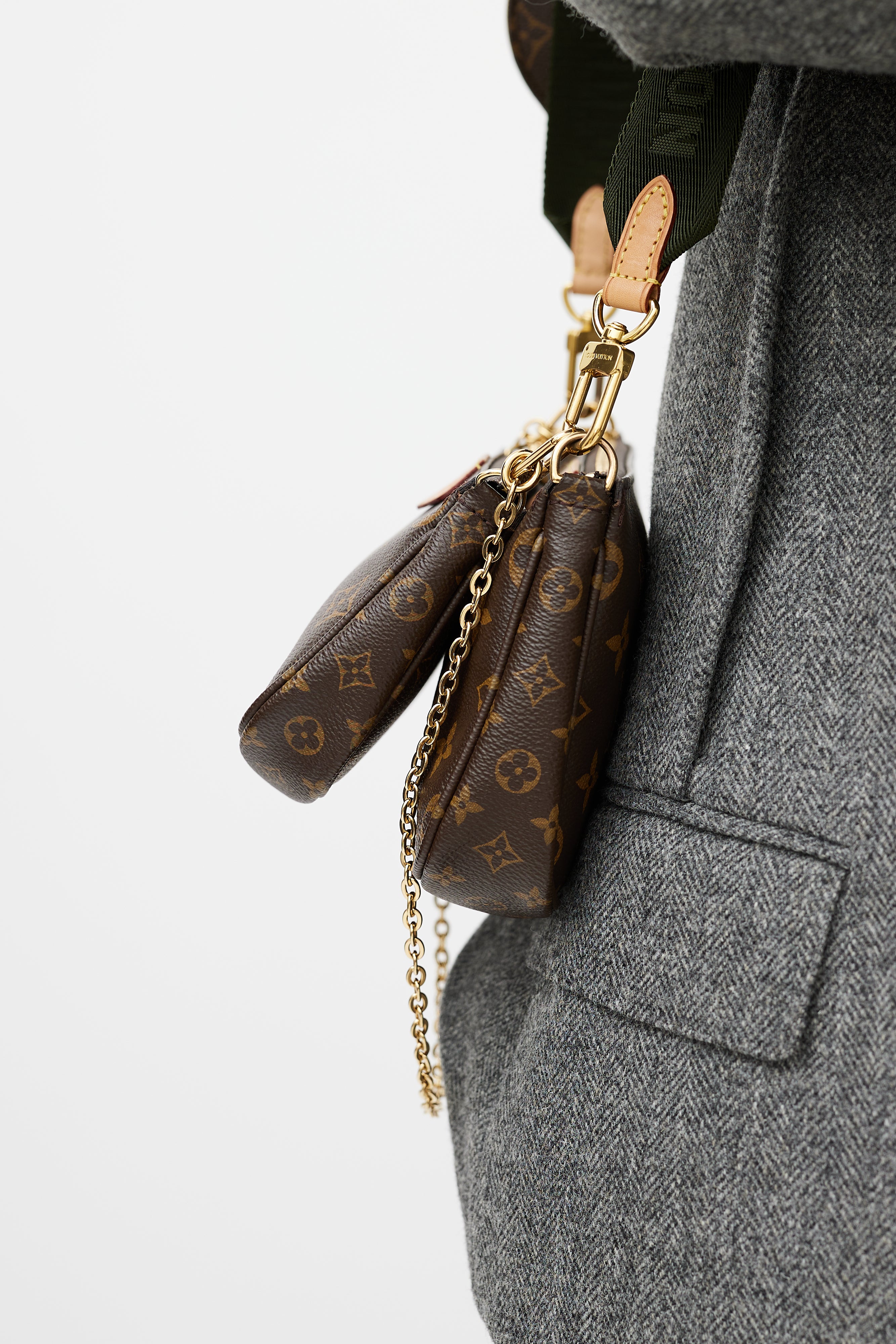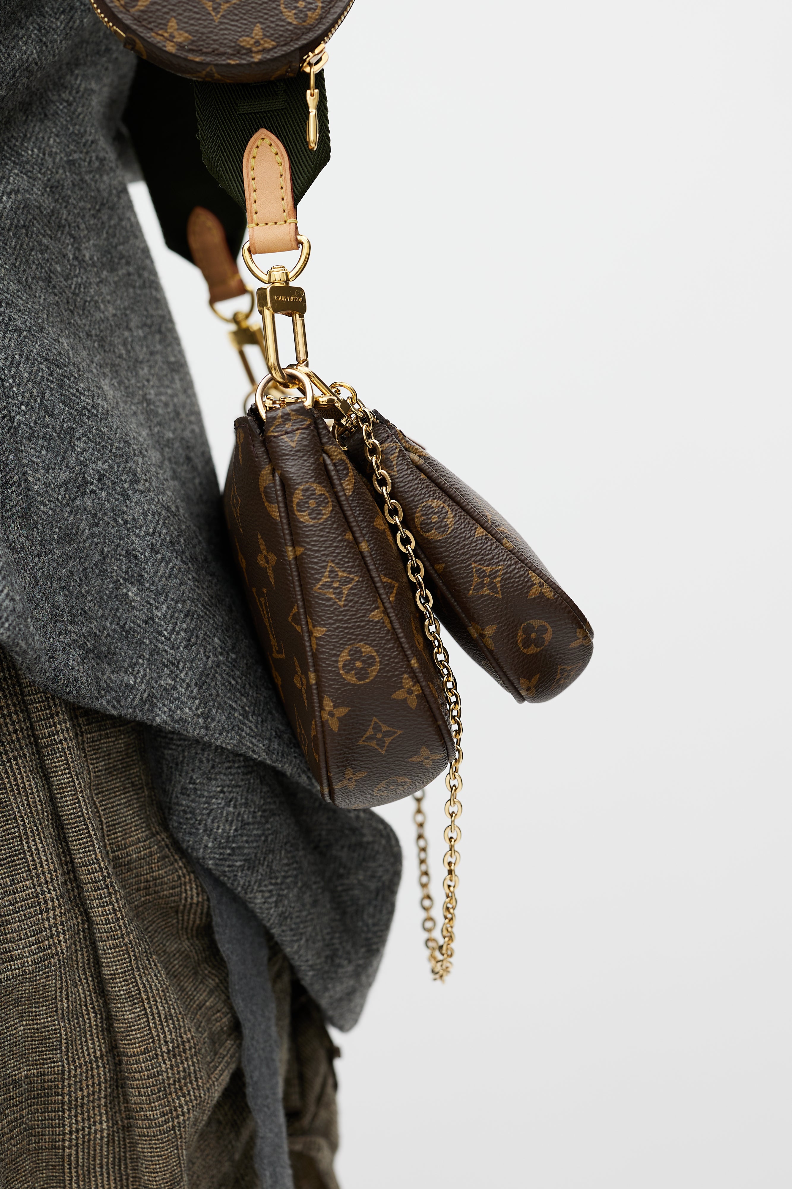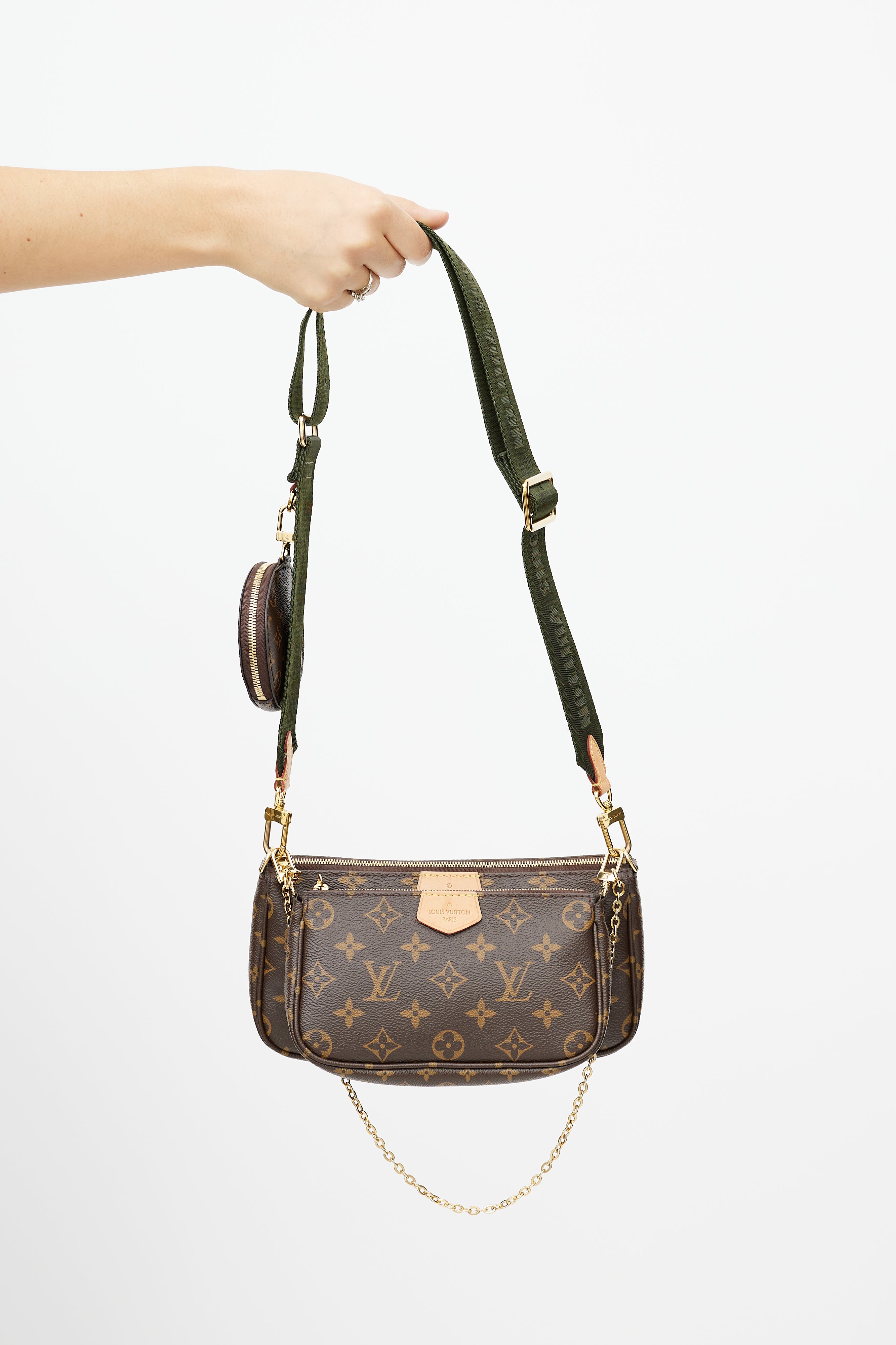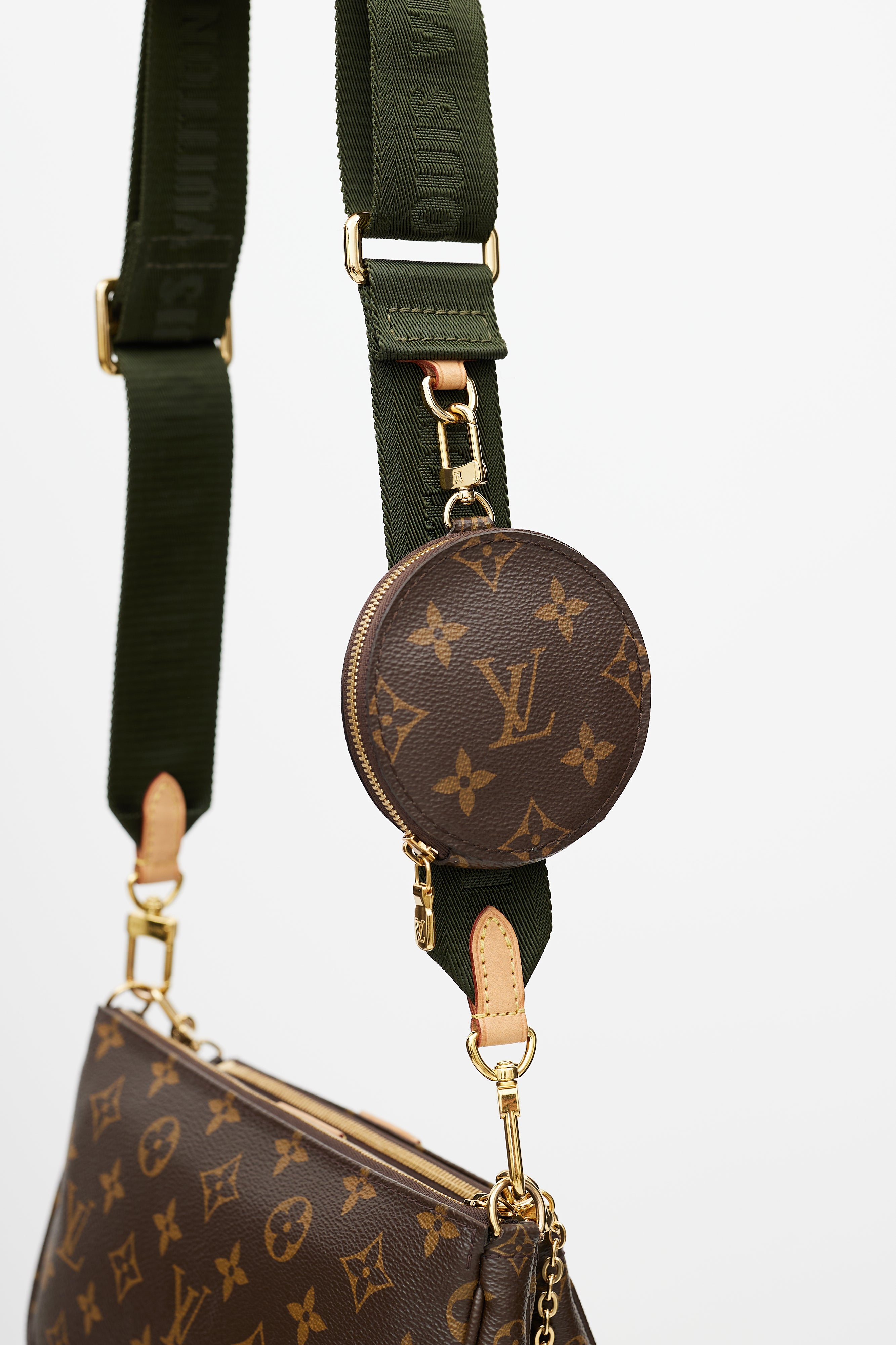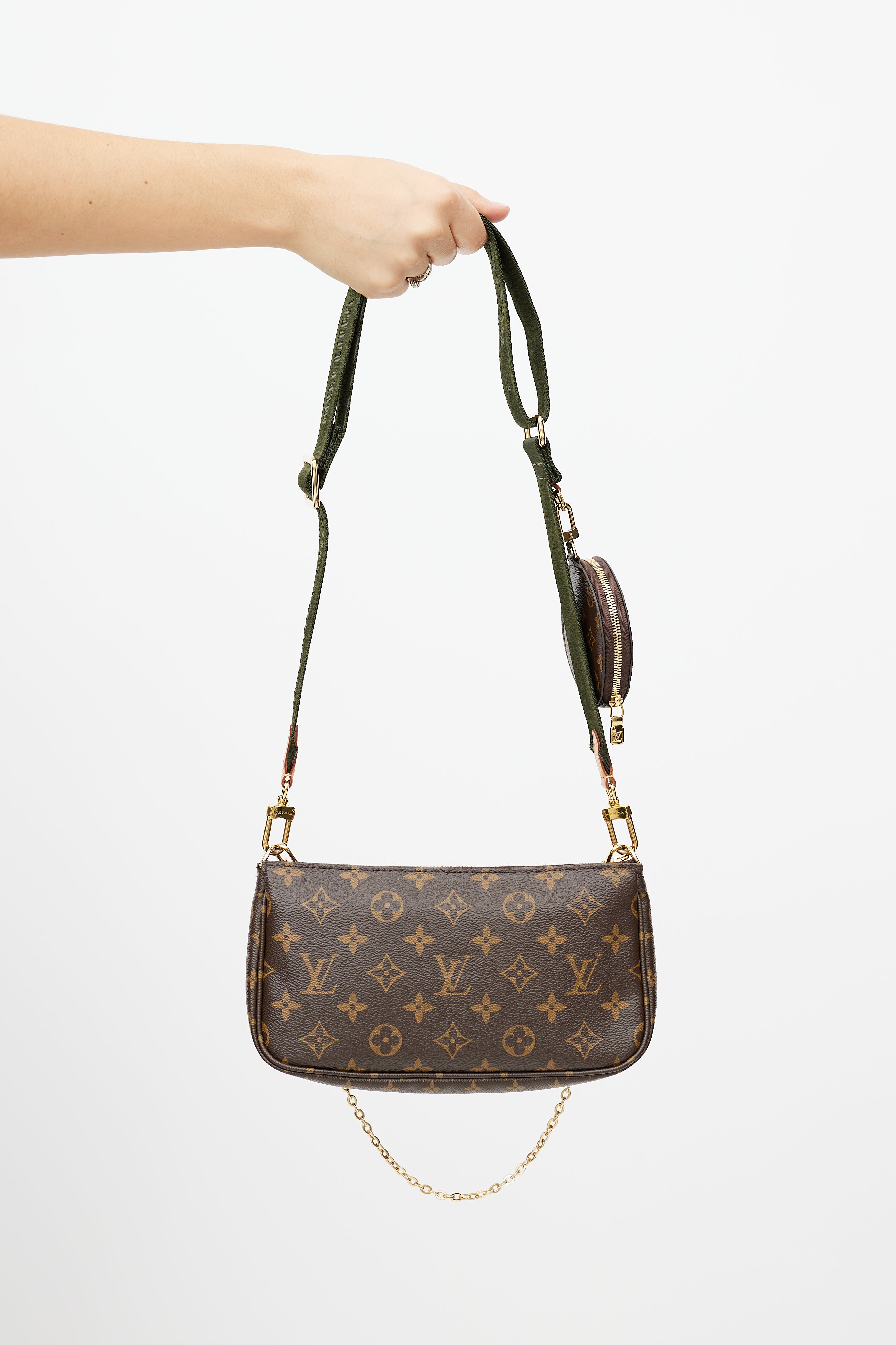 Pre-owned Louis Vuitton brown Multi Pochette Accessoires bag featuring Monogram coated canvas, leather logo tab at face, green detachable shoulder straps with logo intarsia, gold tone hardware, detachable chain link strap, top zip closure, single main compartment, interior slip pocket at main Pochette, and clasp attachment at round coin purse. Comes with original dust bag and box.