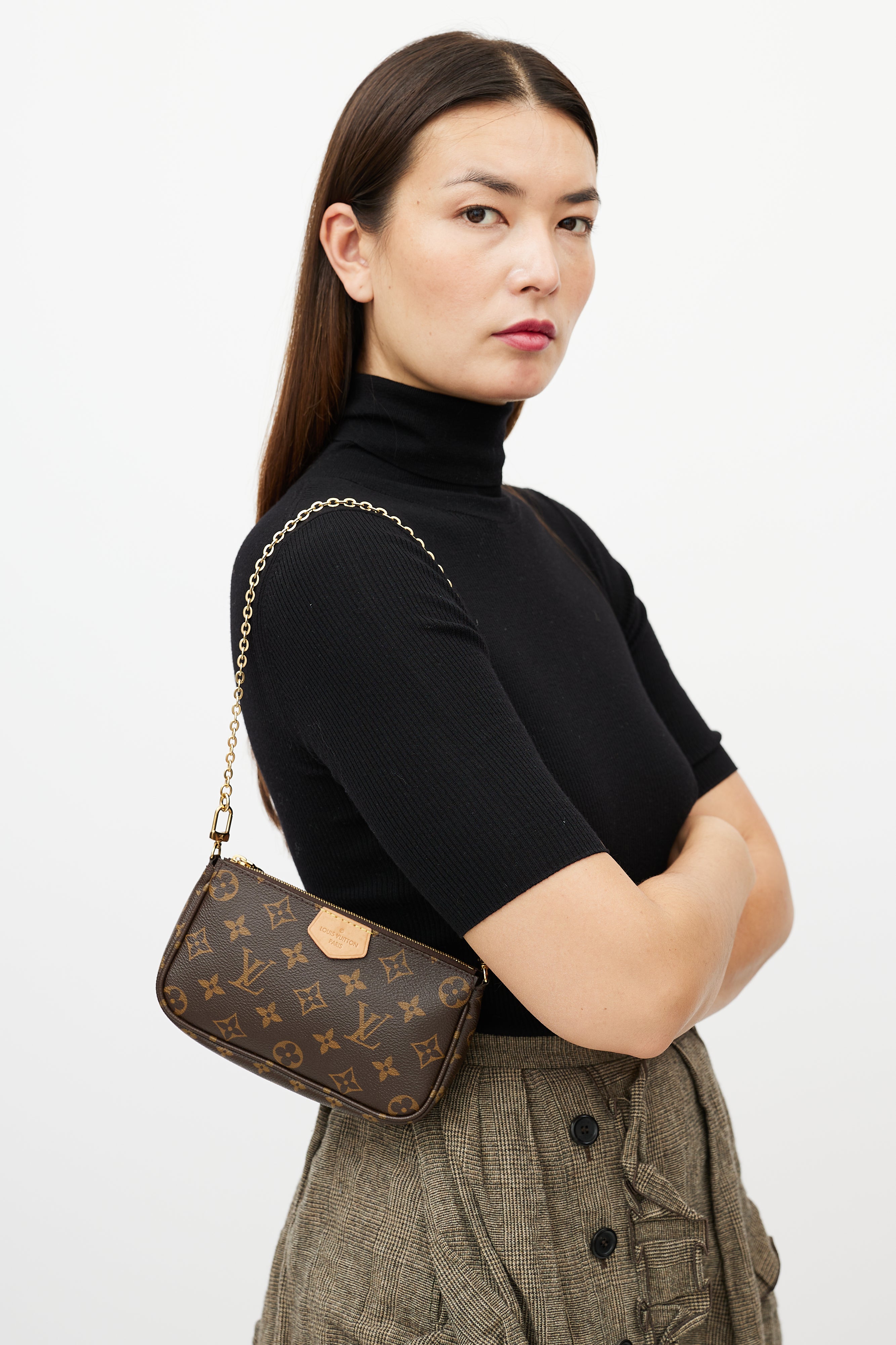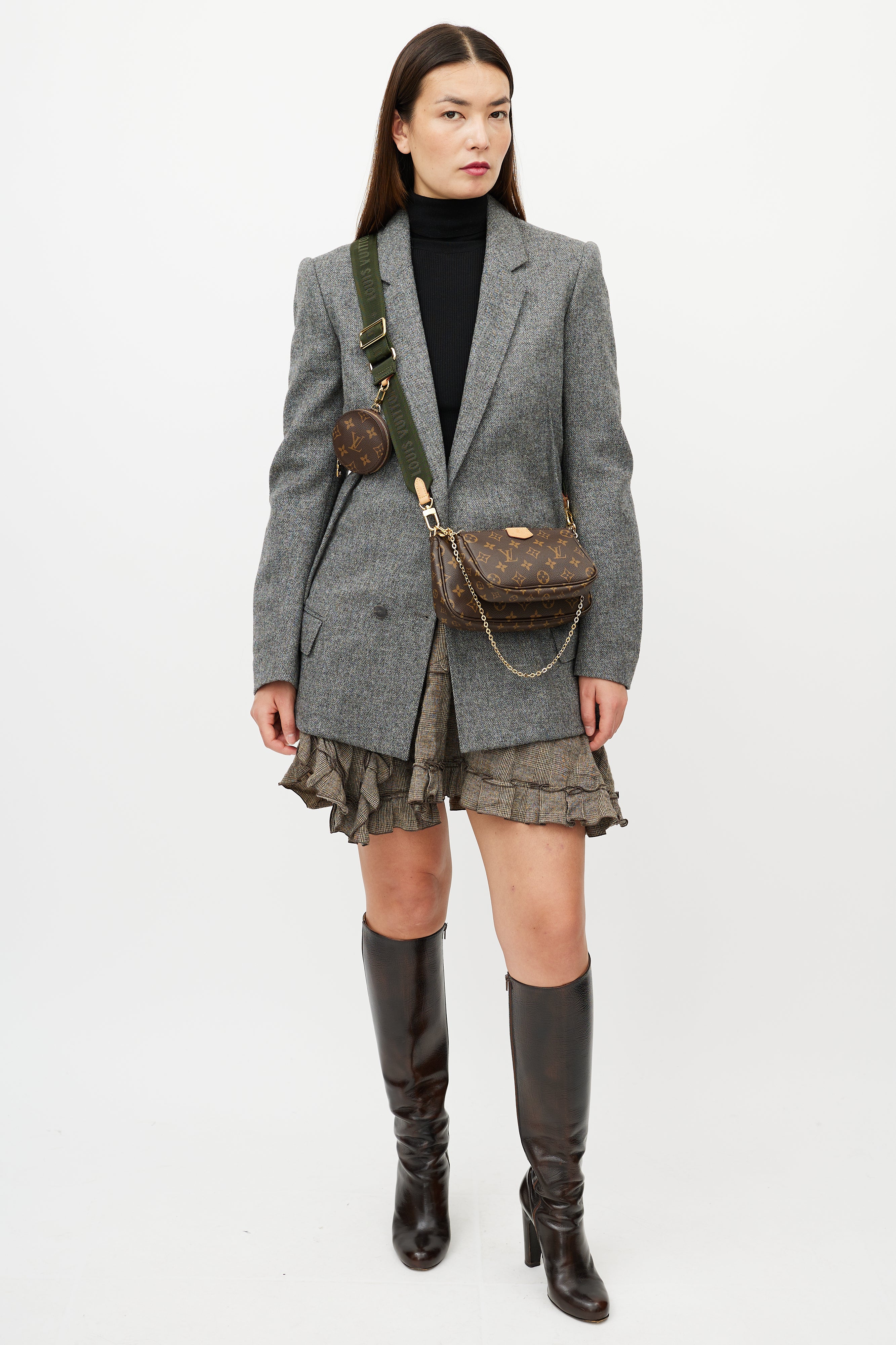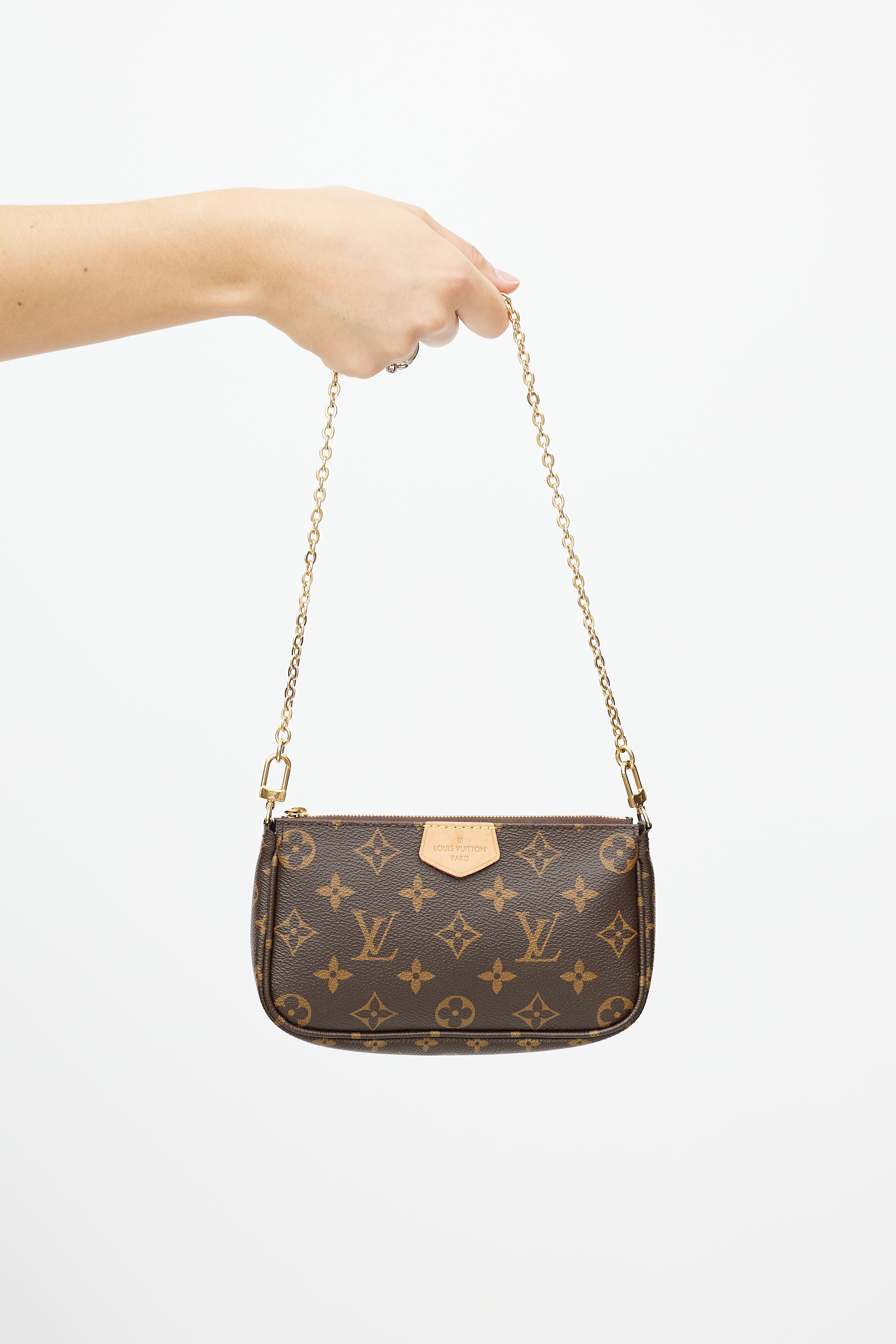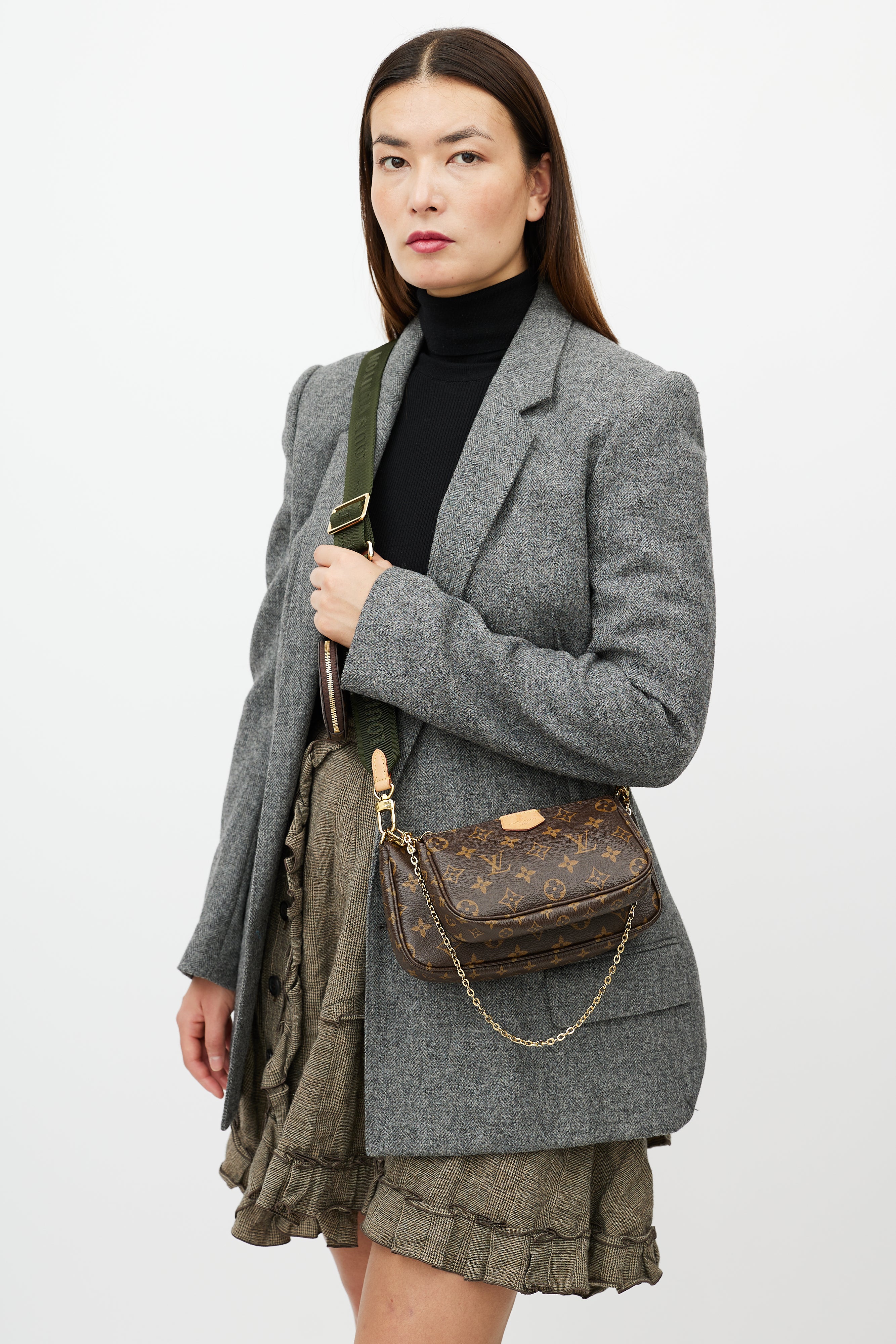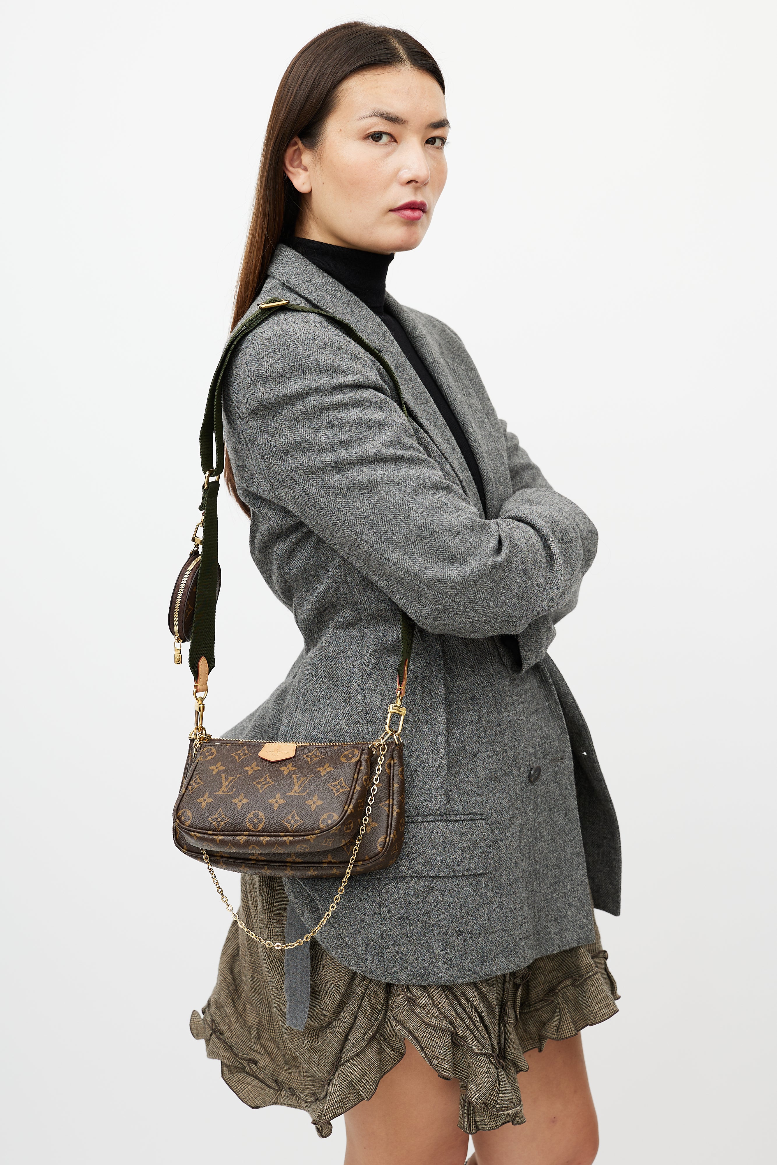 Pre-owned Louis Vuitton brown Multi Pochette Accessoires bag featuring Monogram coated canvas, leather logo tab at face, green detachable shoulder straps with logo intarsia, gold tone hardware, detachable chain link strap, top zip closure, single main compartment, interior slip pocket at main Pochette, and clasp attachment at round coin purse. Comes with original dust bag and box.
