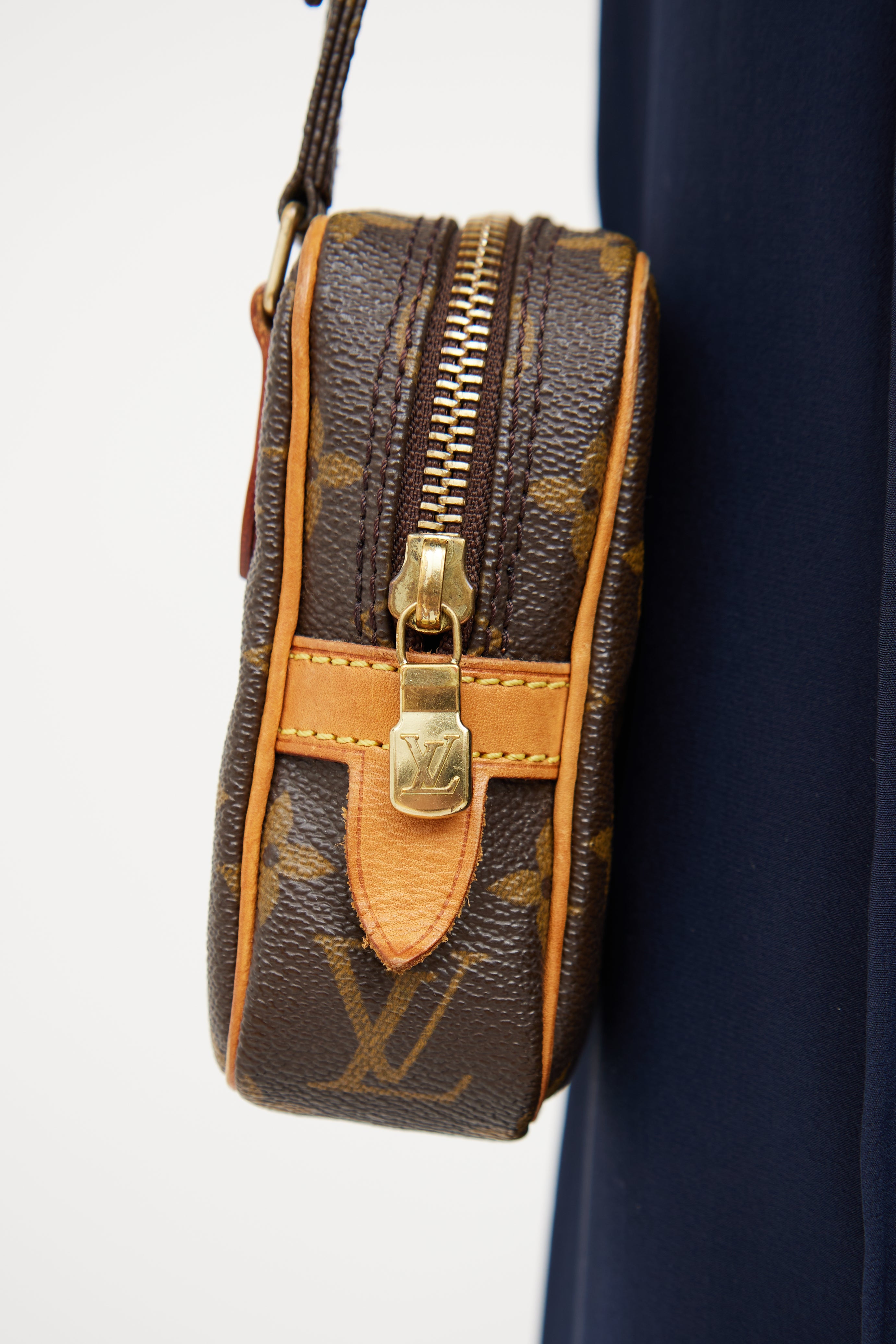 Pre-owned Louis Vuitton brown coated canvas Monogram Marly Bandouliere crossbody bag featuring gold-tone zip top entry, single interior compartment and thin adjustable shoulder strap.