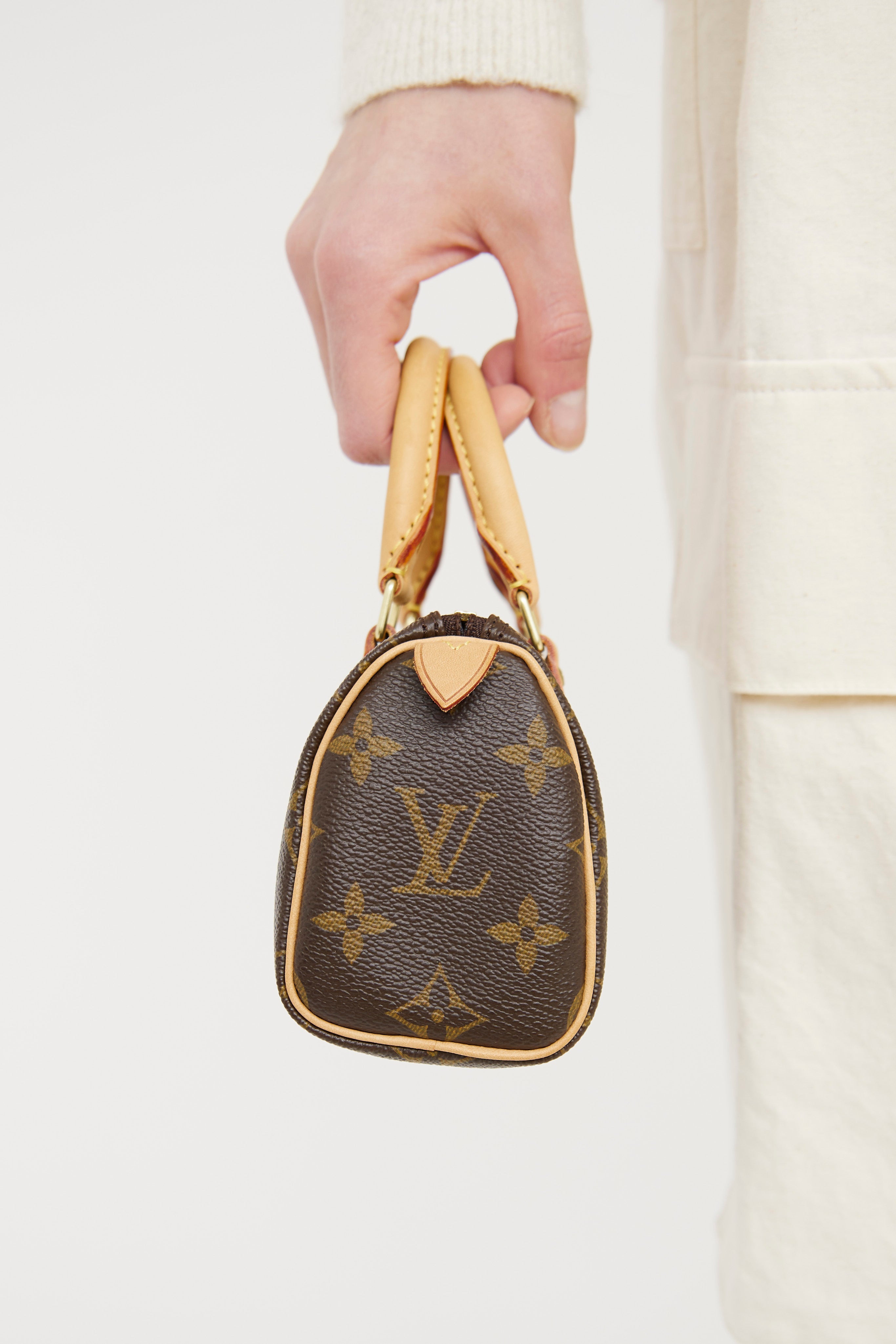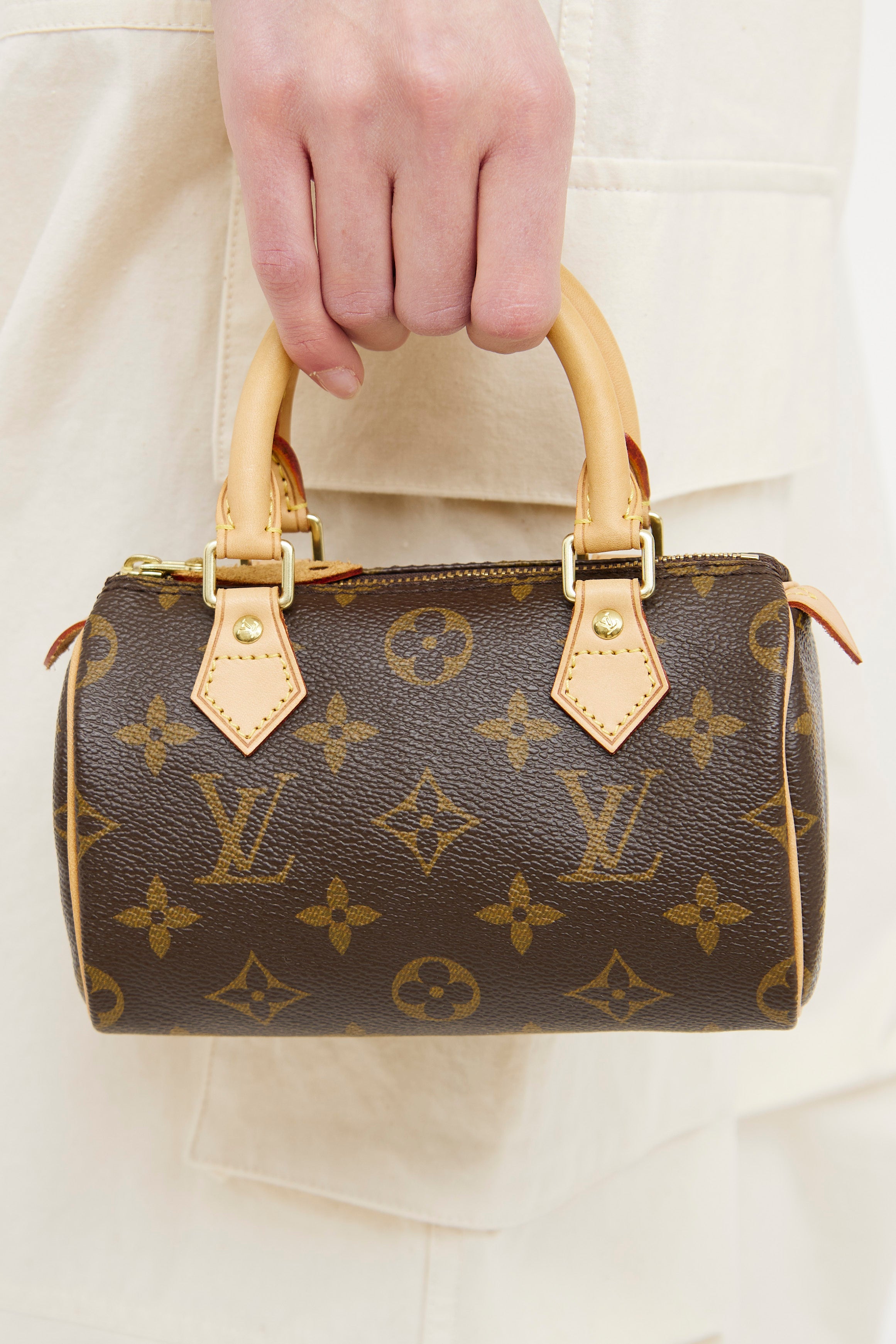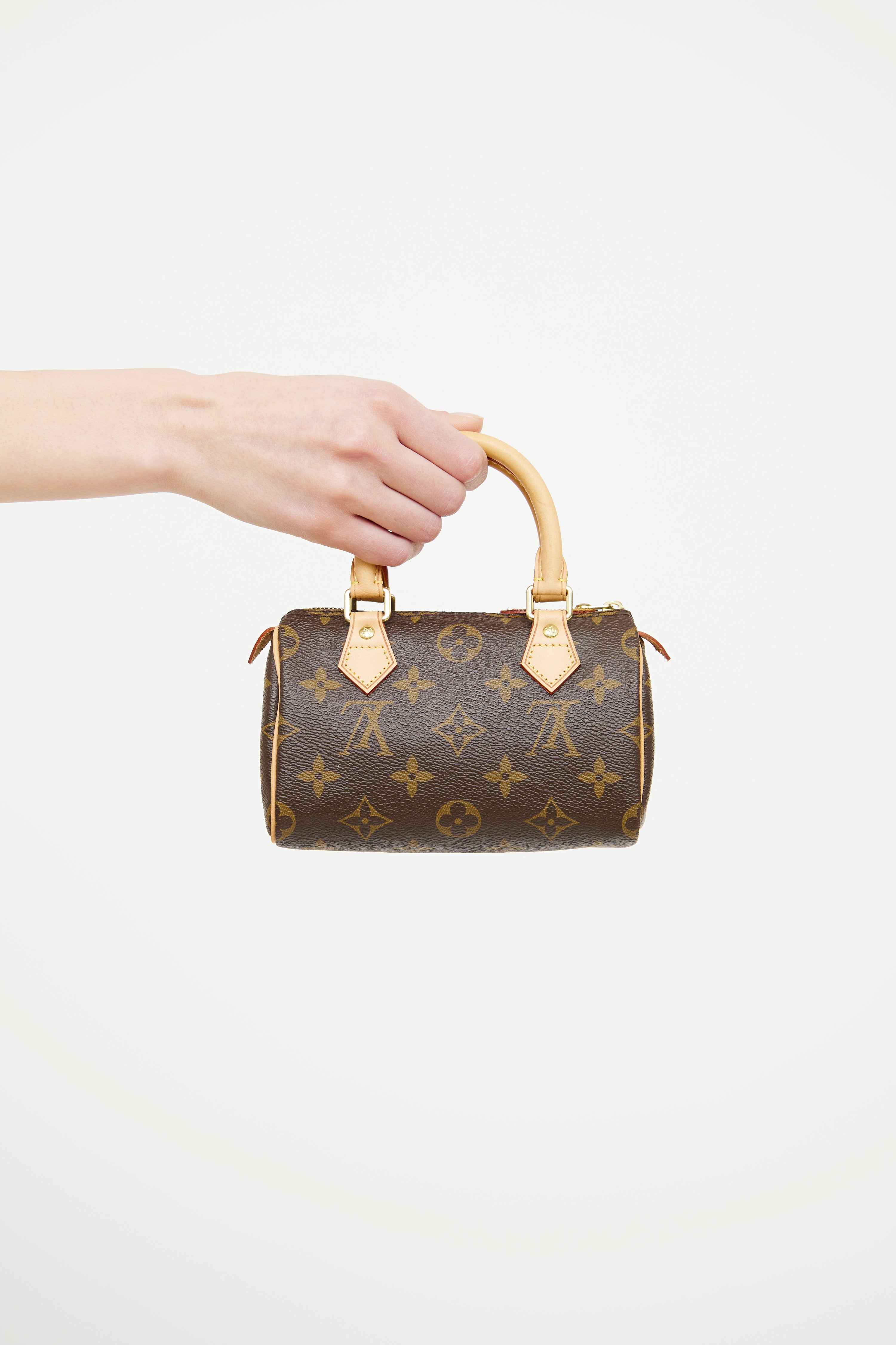 Pre-owned Louis Vuitton brown monogram Nano Speedy bag featuring coated canvas, dual rolled leather handles, top zip closure and interior lined brown canvas.