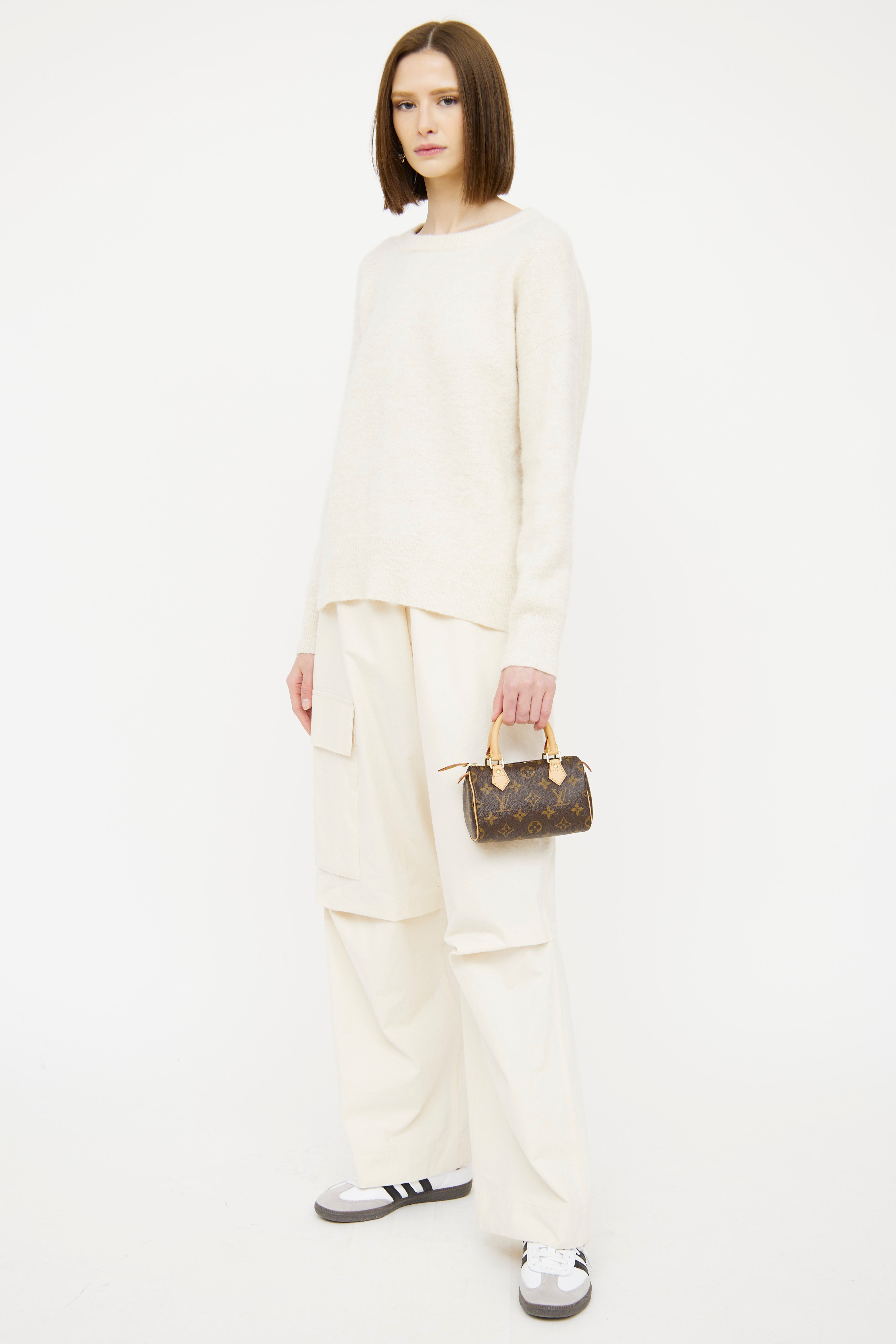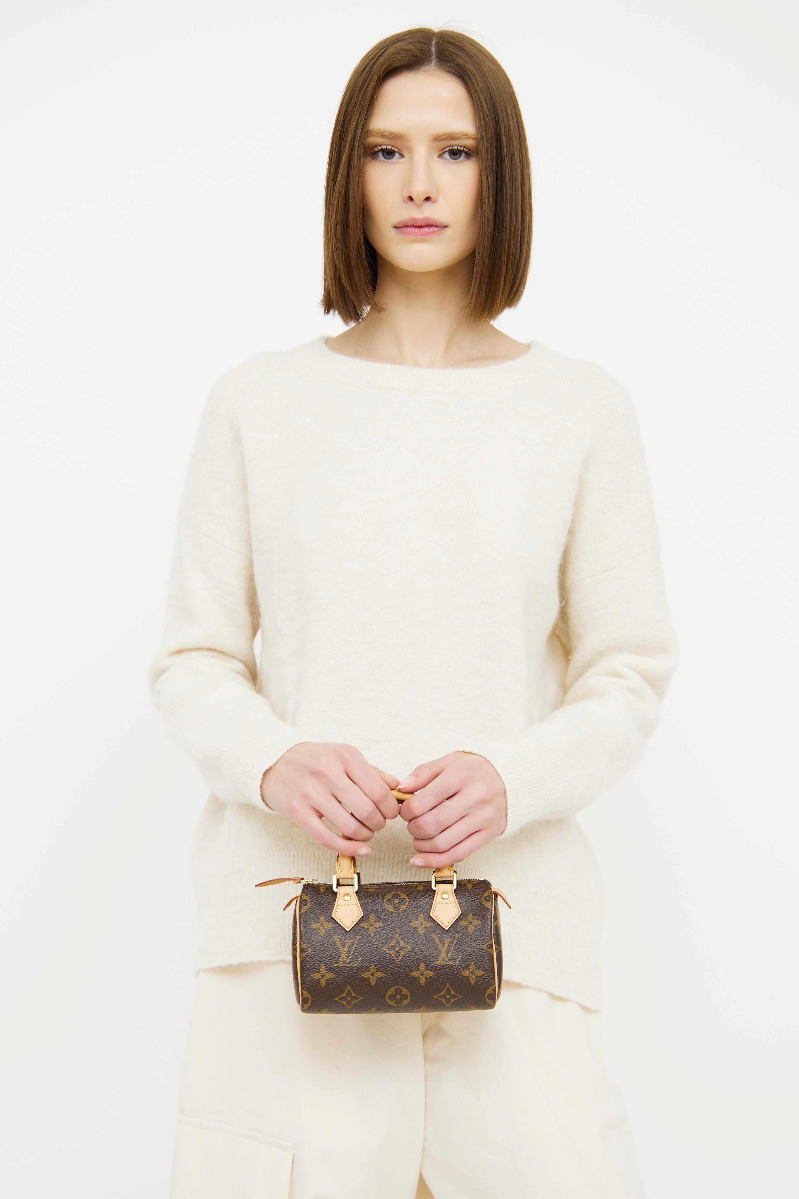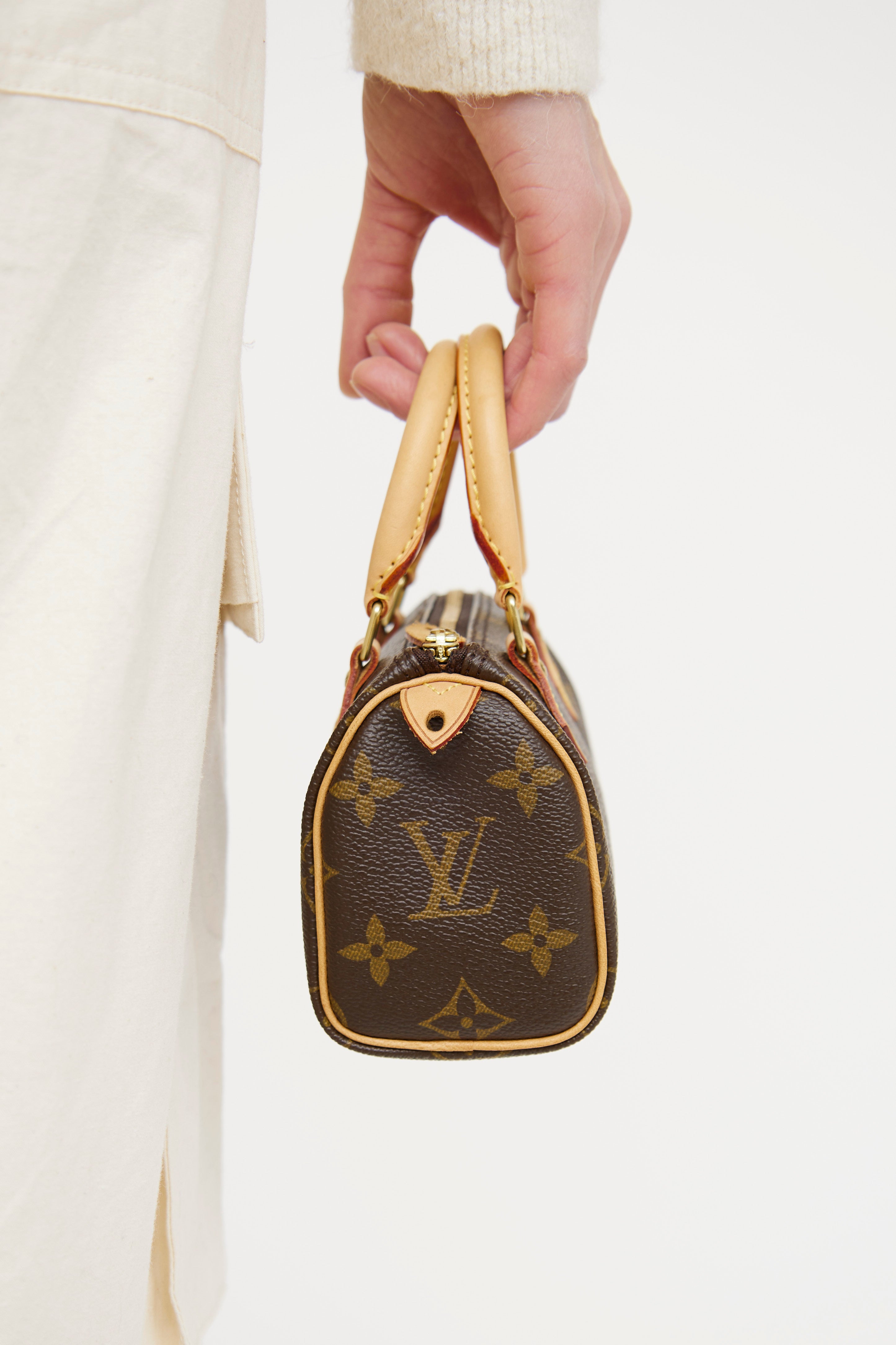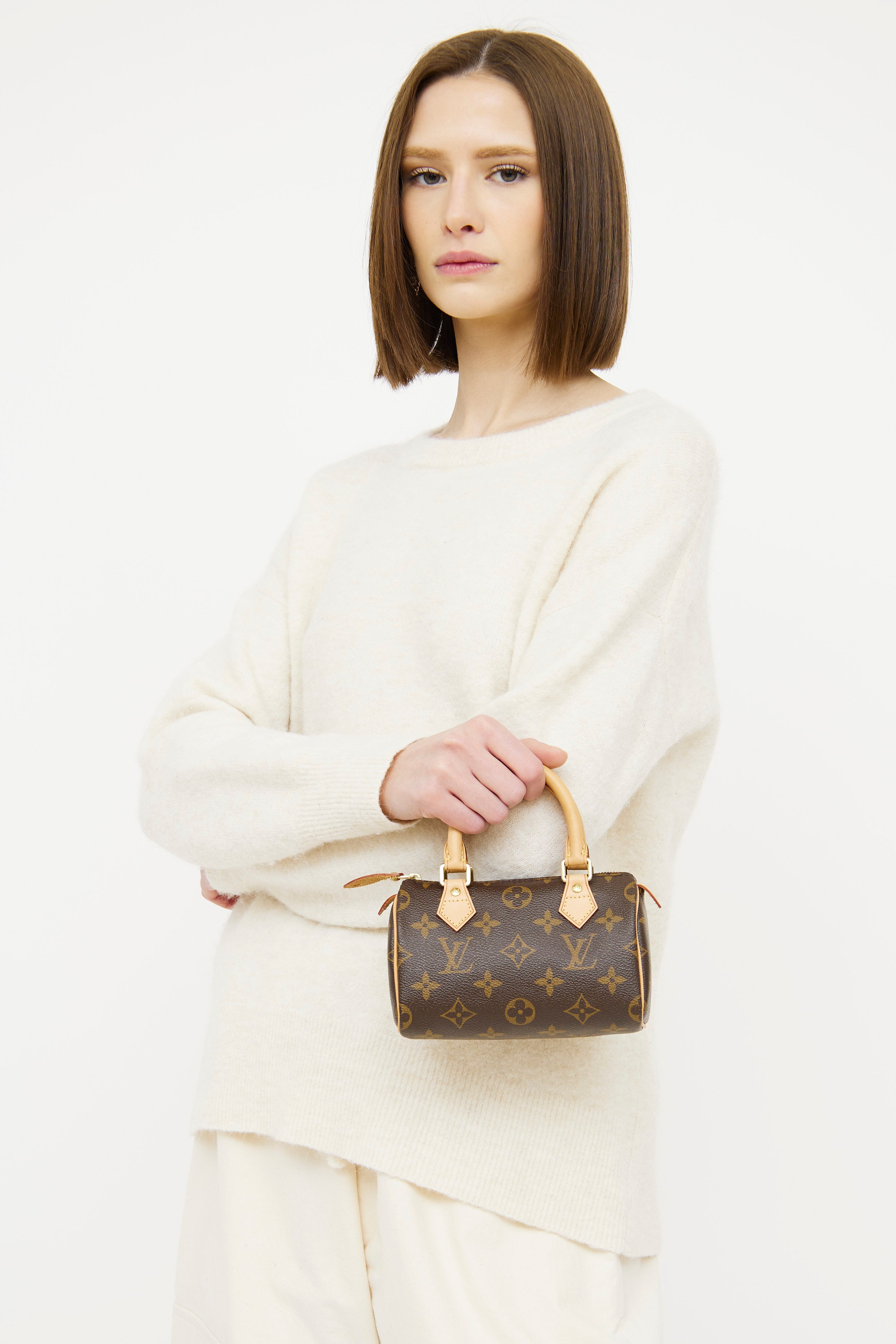 Pre-owned Louis Vuitton brown monogram Nano Speedy bag featuring coated canvas, dual rolled leather handles, top zip closure and interior lined brown canvas.