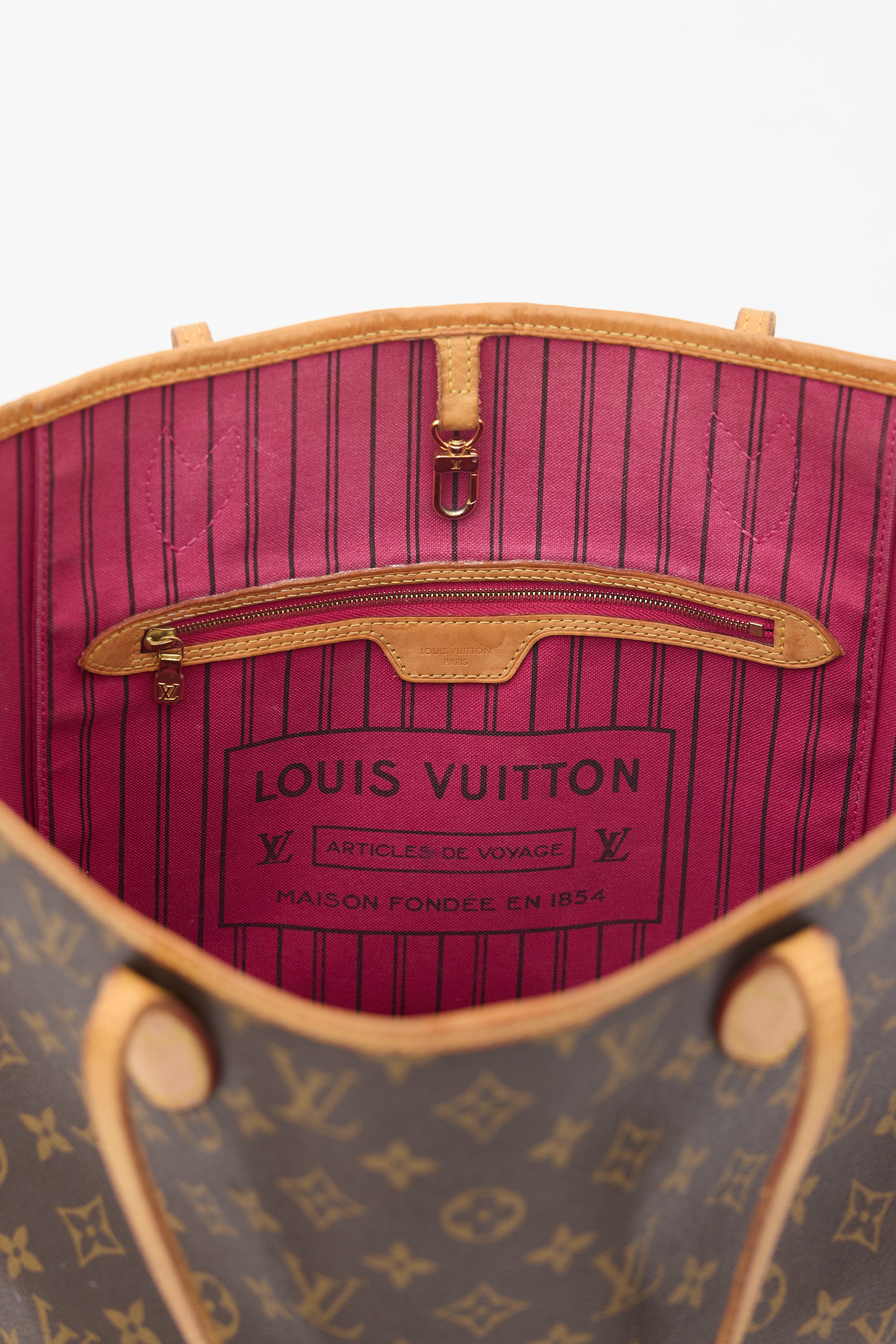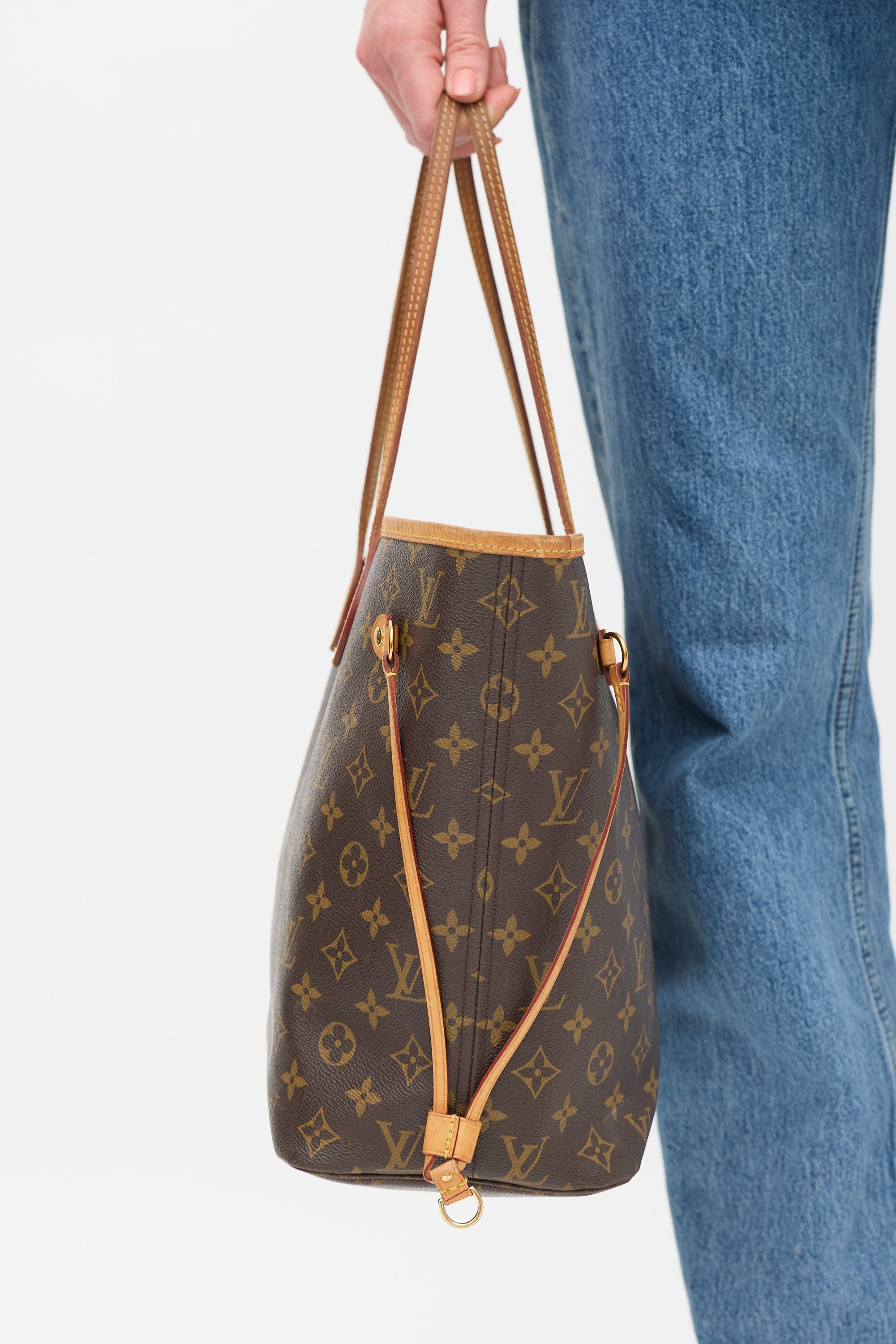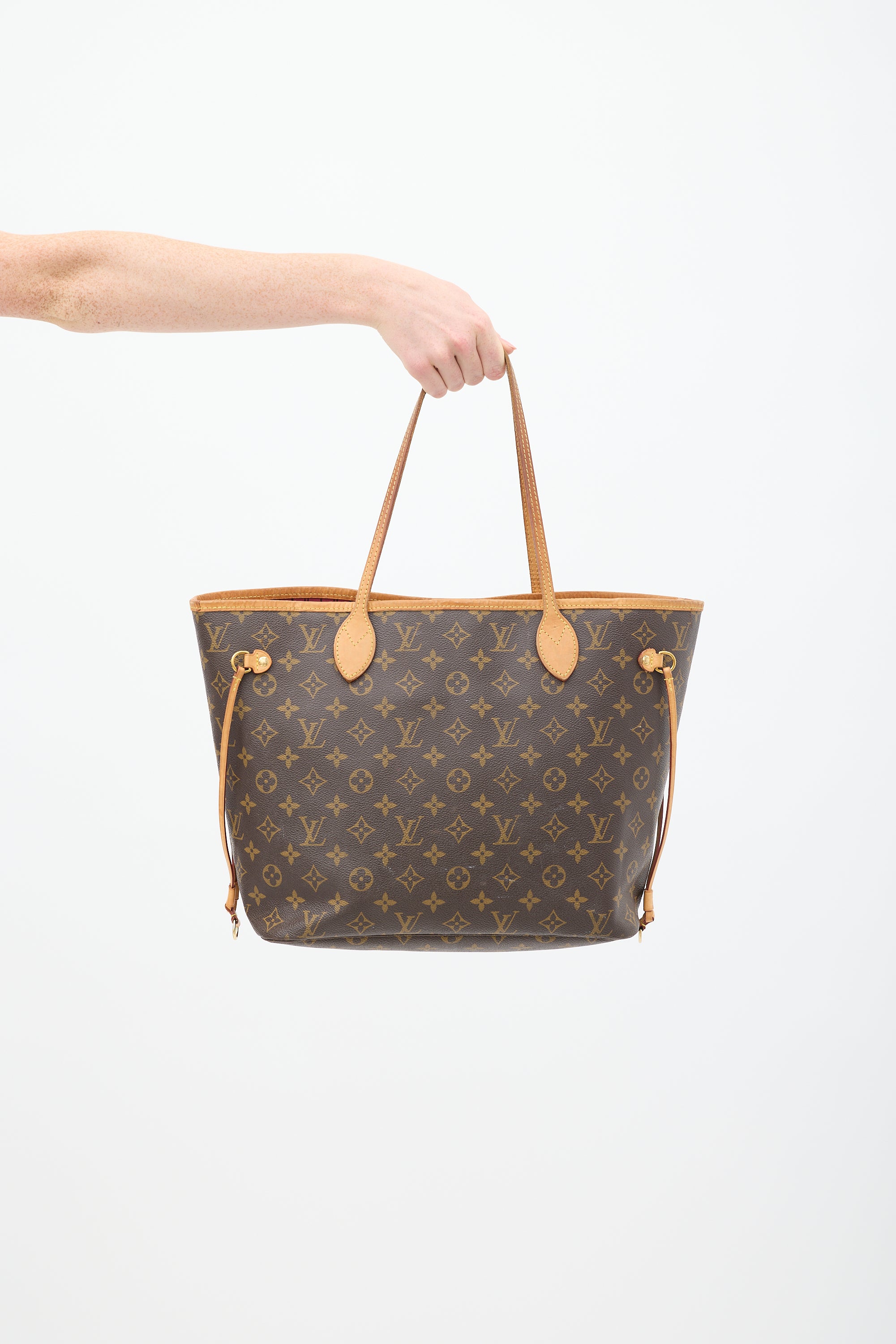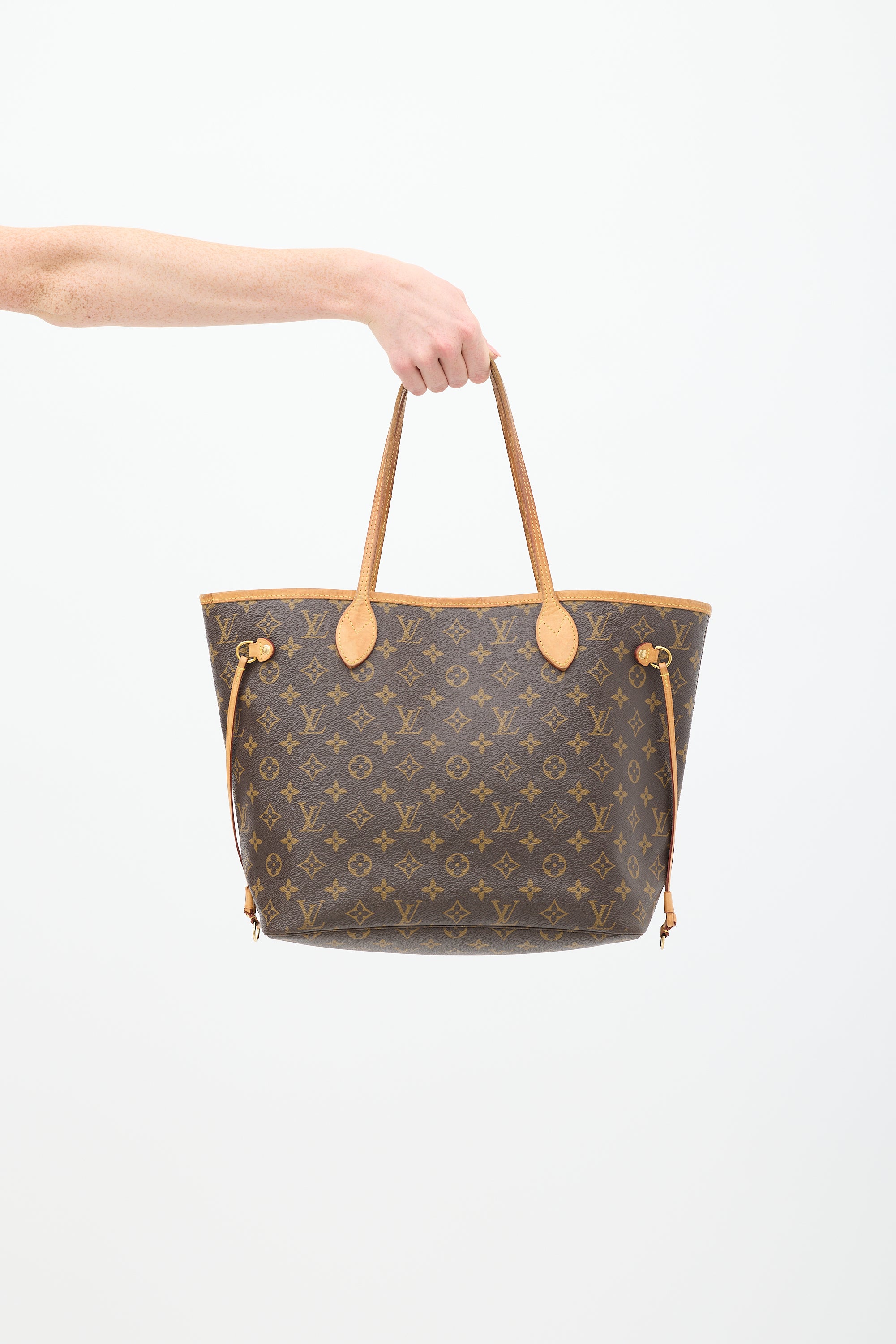 Pre-owned Louis Vuitton brown Neverfull MM bag in signature monogram coated canvas with Vachetta leather trim featuring gold tone hardware, dual flat thin top handles, adjustable leather trims at sides, open top, top hook clasp closure, and one lined main compartment with single zip pocket. Comes with original dust bag.