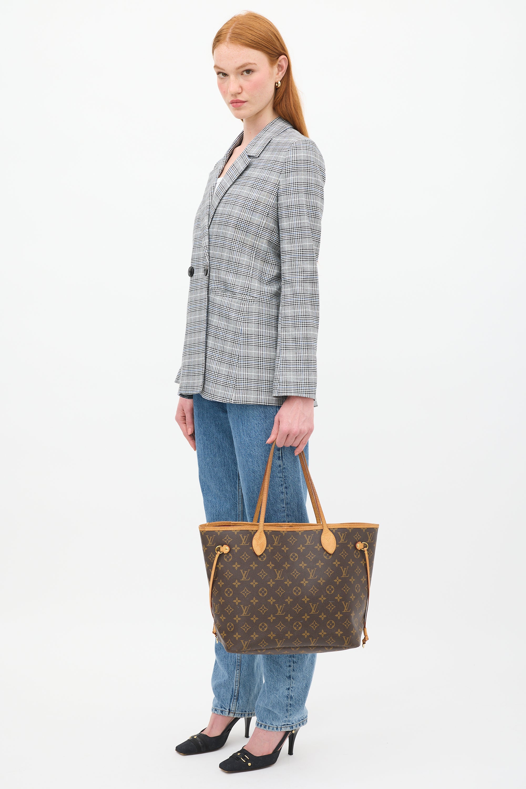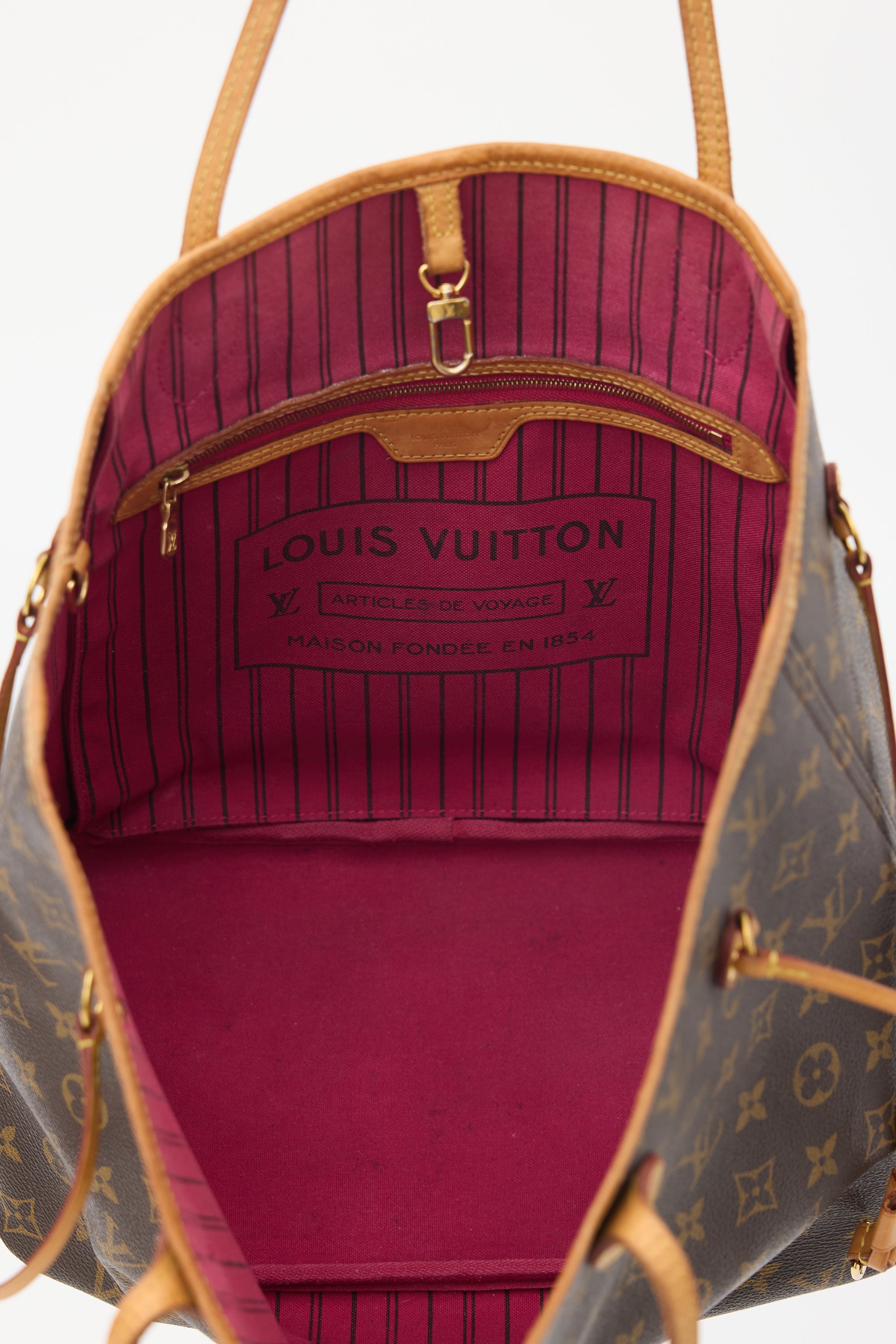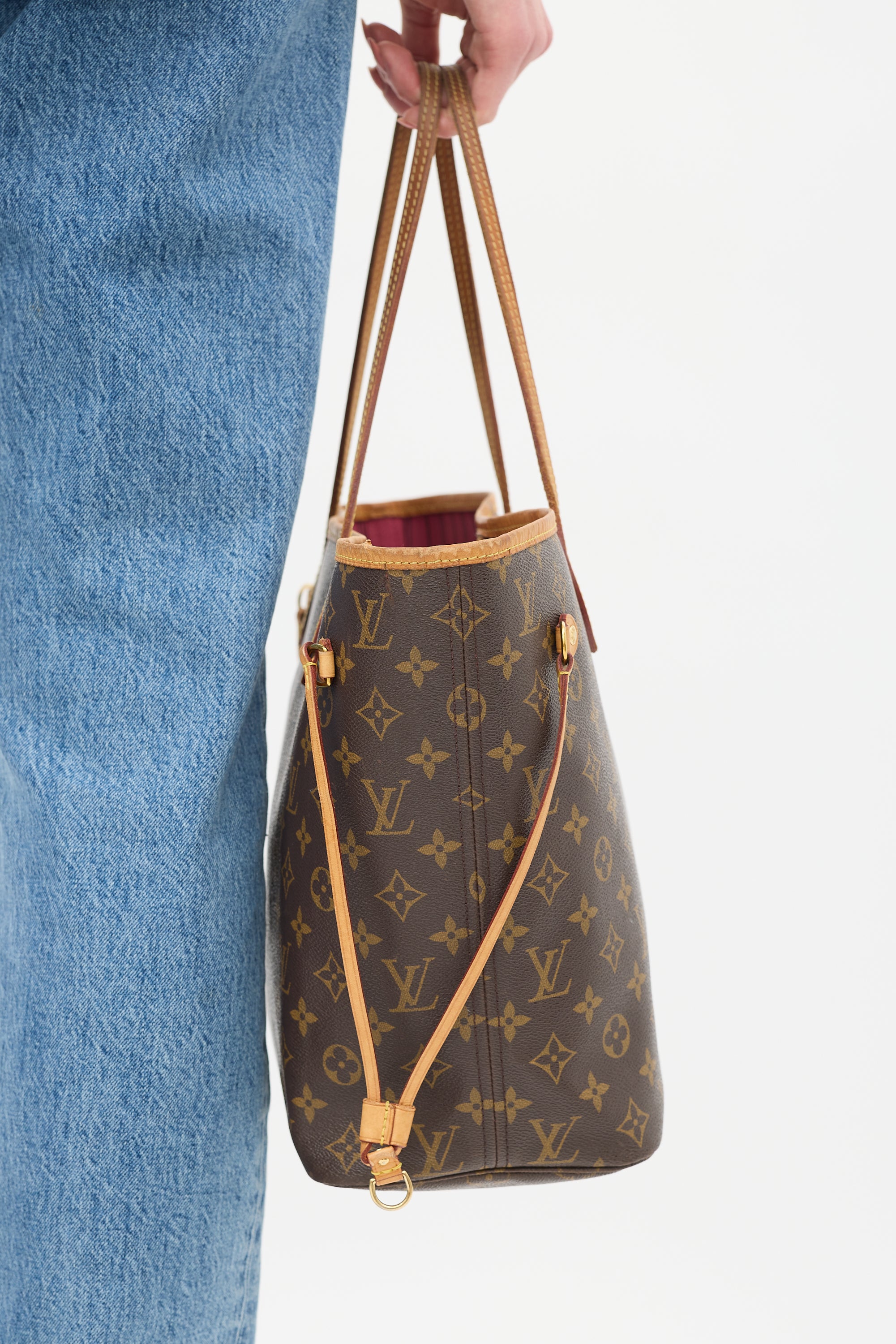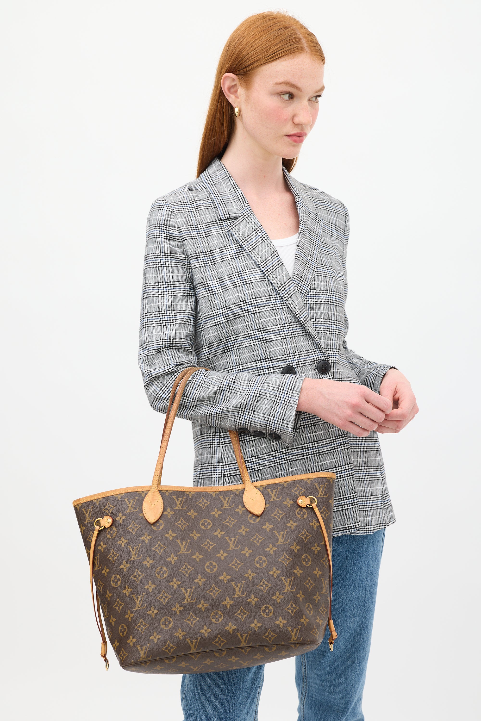 Pre-owned Louis Vuitton brown Neverfull MM bag in signature monogram coated canvas with Vachetta leather trim featuring gold tone hardware, dual flat thin top handles, adjustable leather trims at sides, open top, top hook clasp closure, and one lined main compartment with single zip pocket. Comes with original dust bag.