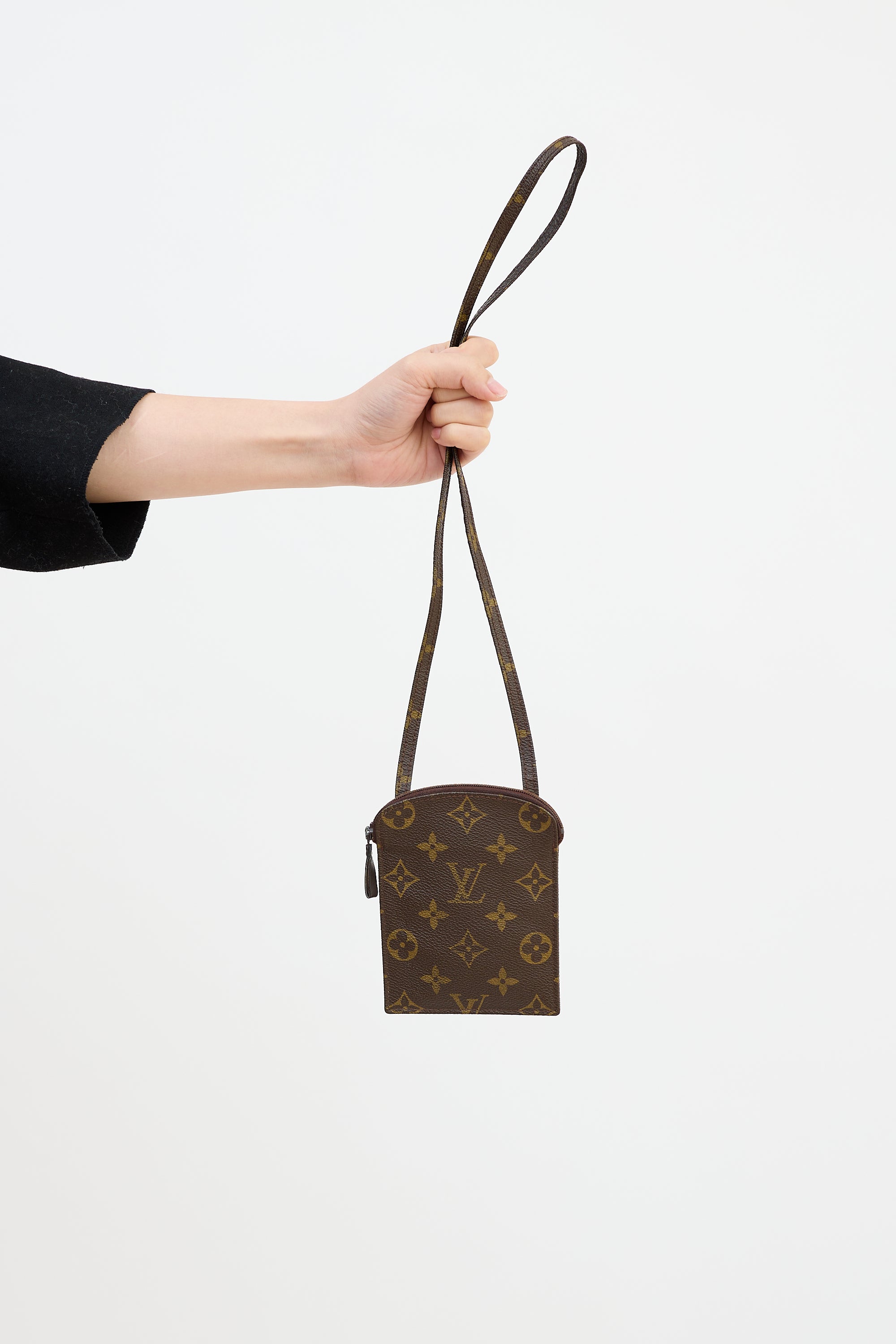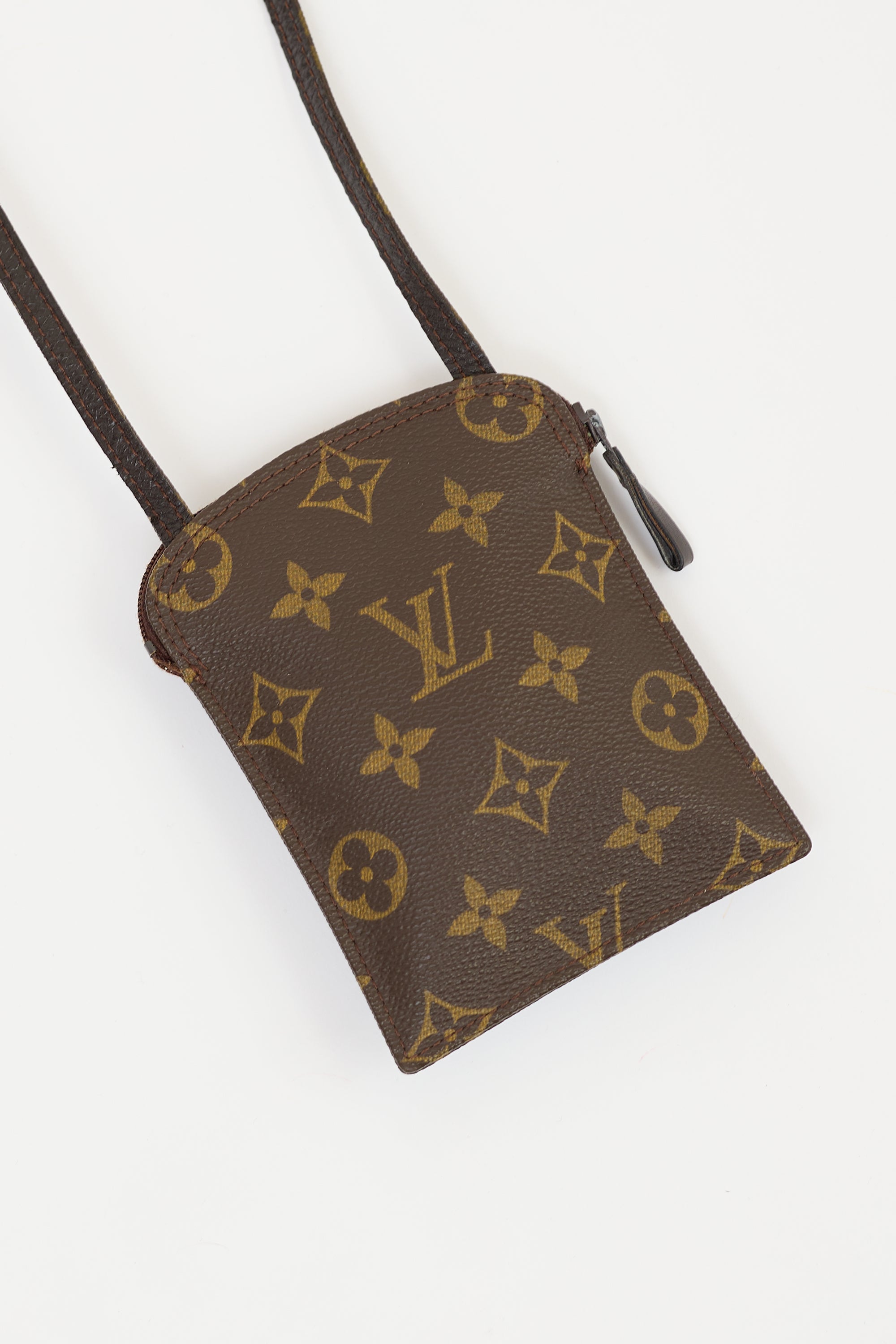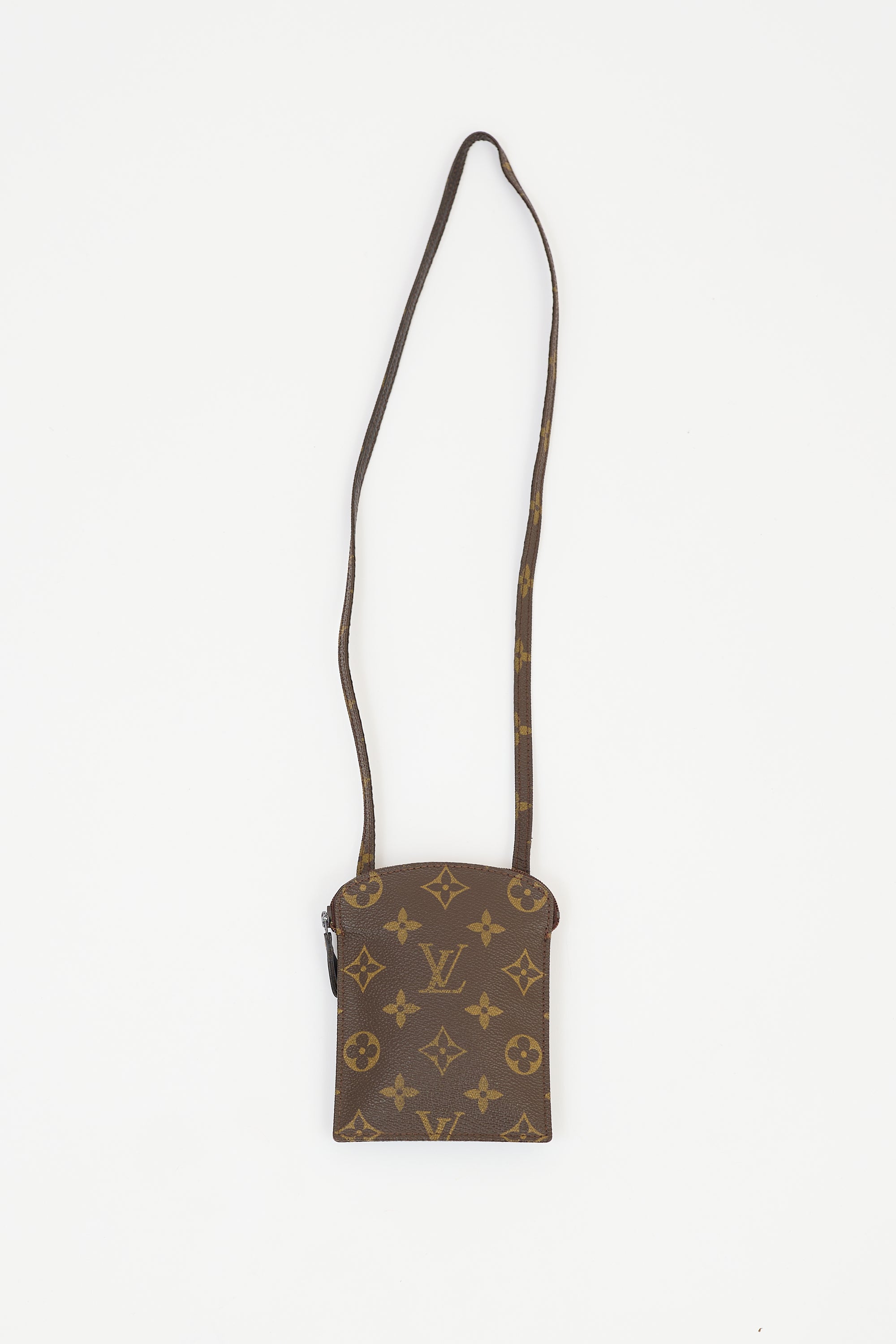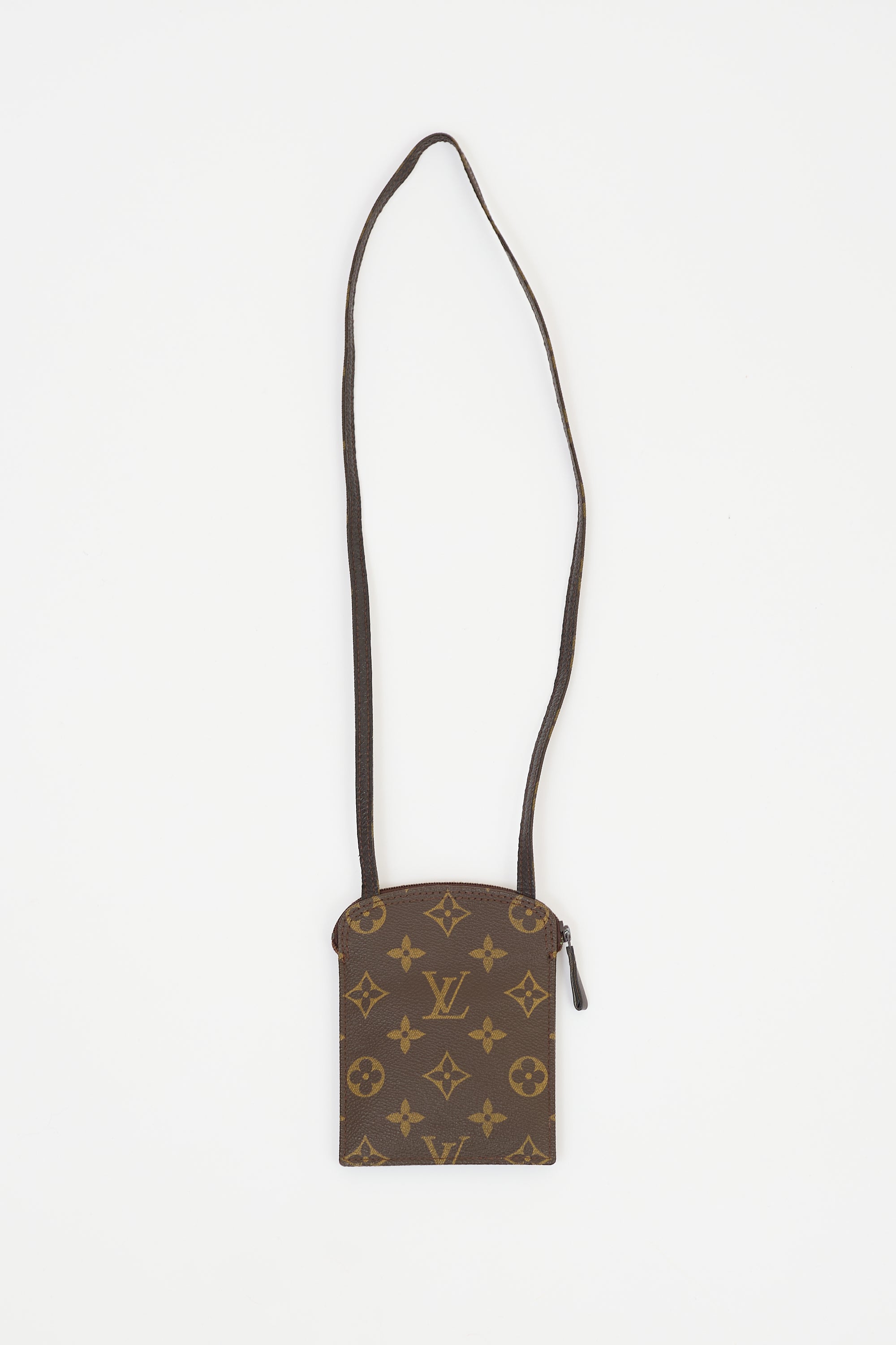 Pre-owned Louis Vuitton brown Monogram Secret Pochette Passport Holder featuring signature monogram coated canvas, tonal hardware, attached and fixed single strap, and one main compartment with top zip closure.