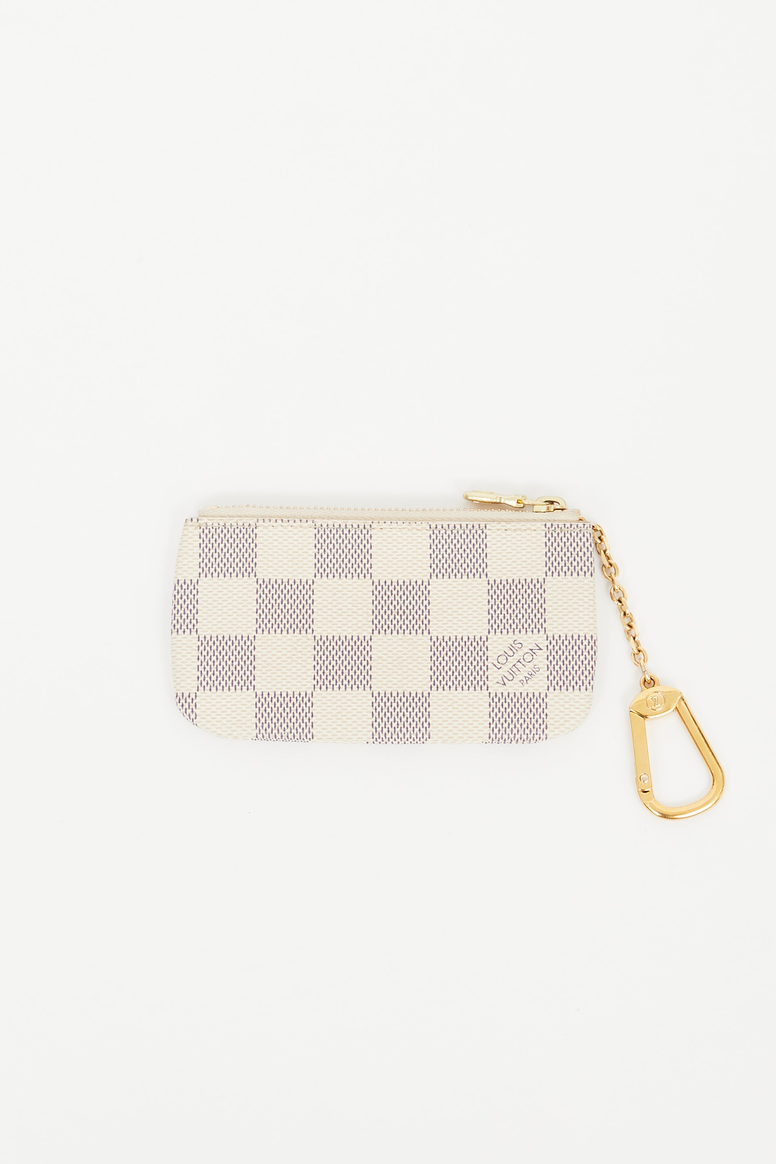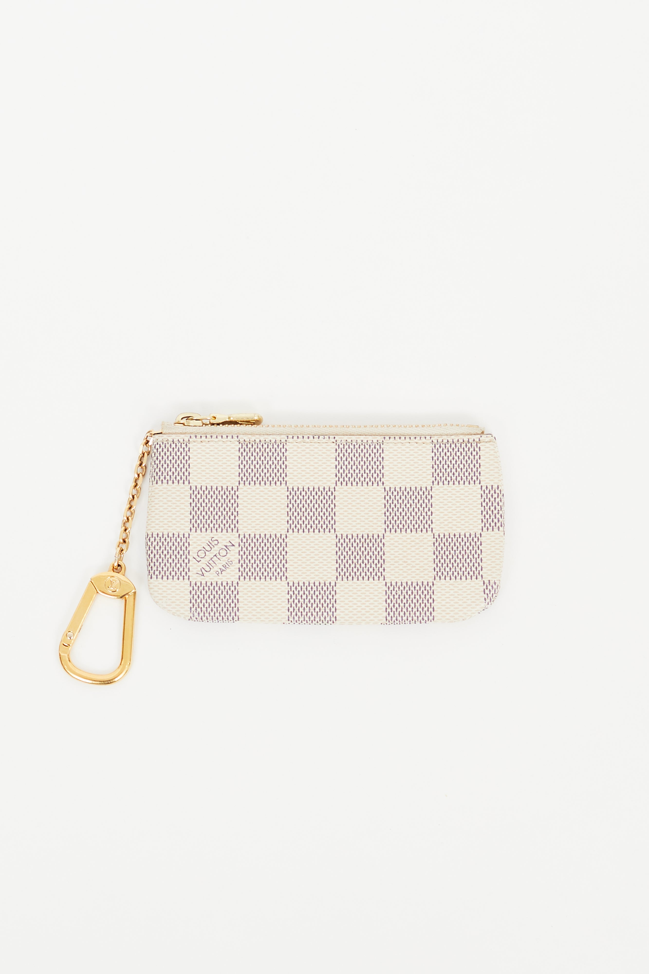 Pre-owned Louis Vuitton cream Key Pouch featuring Damier Azur coated canvas, gold tone hardware, zip closure, key clasp, and one main compartment.