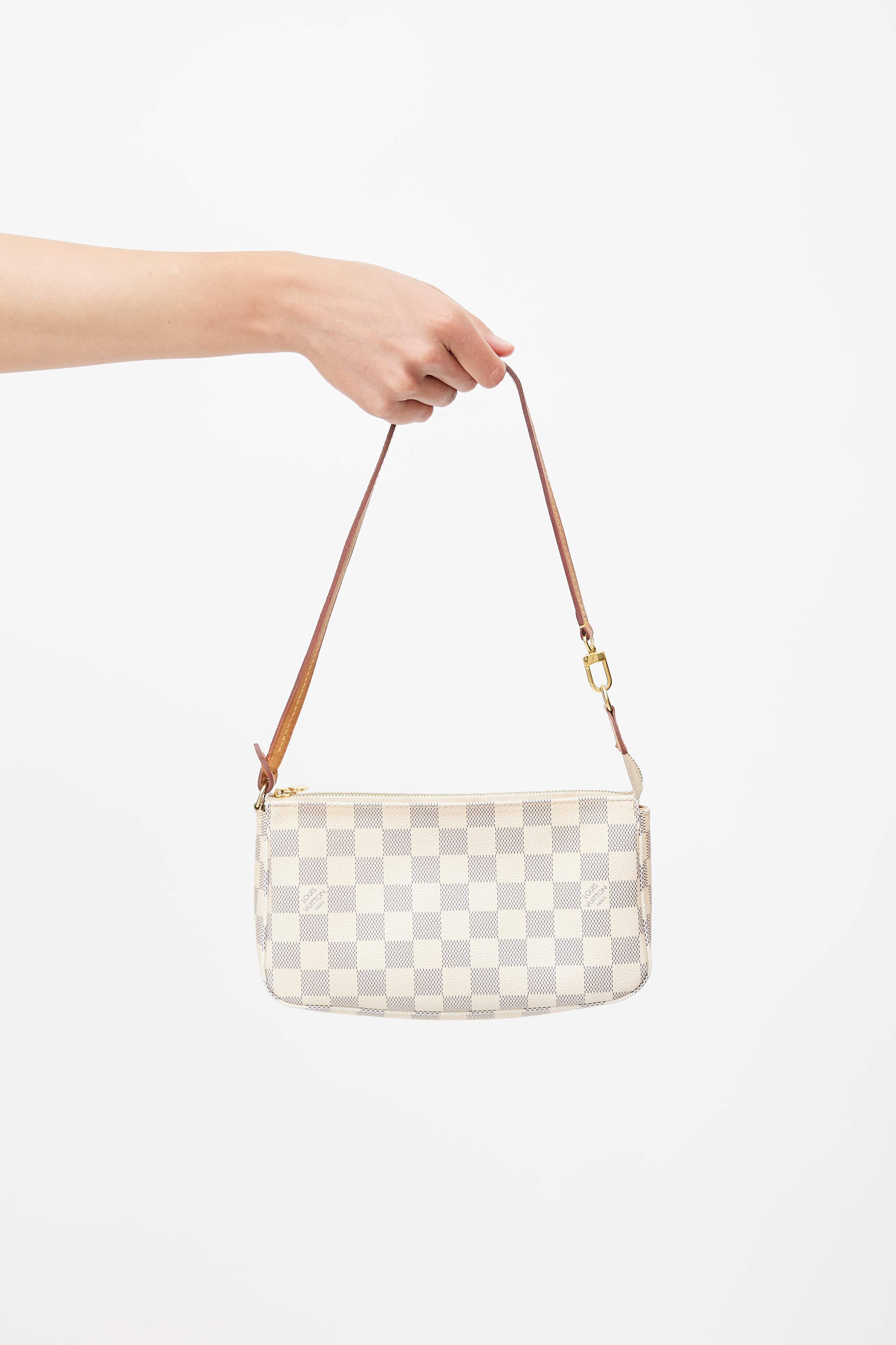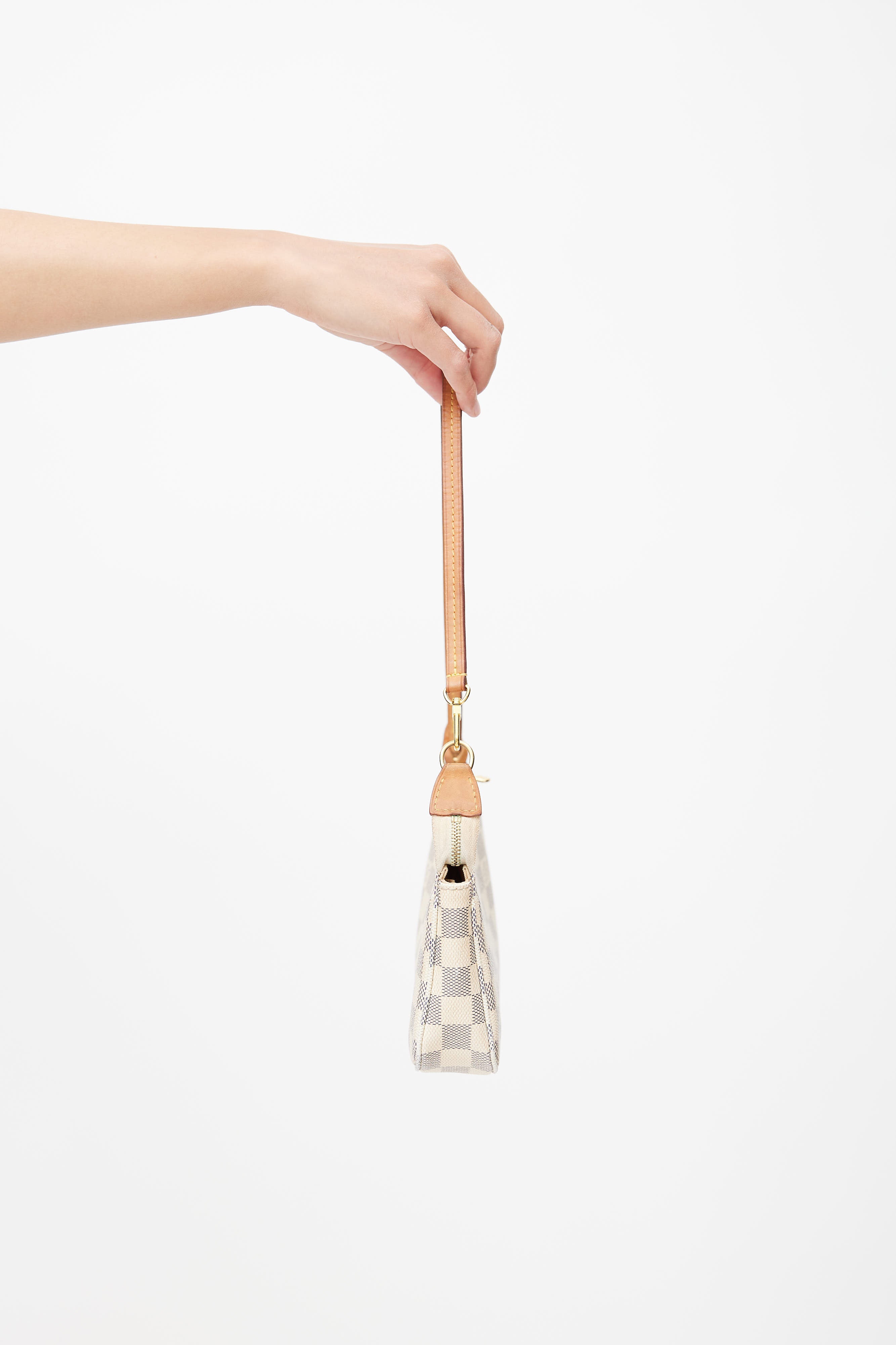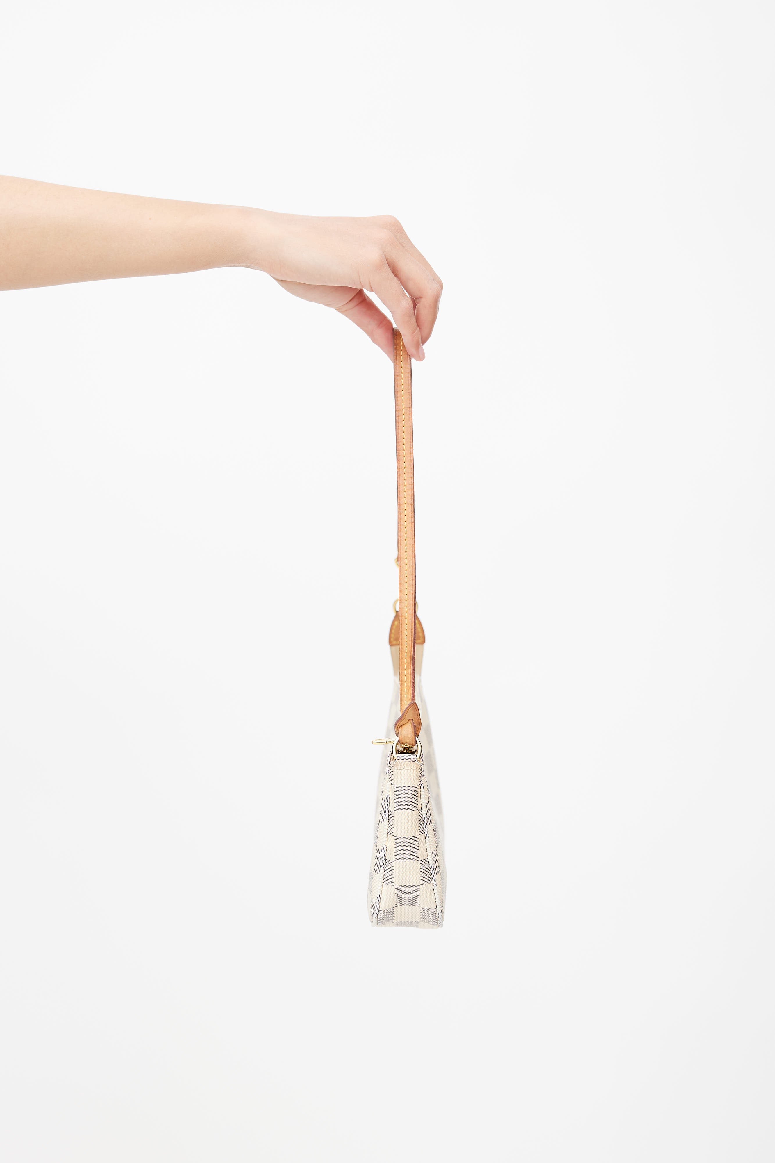 Pre-owned Louis Vuitton Pochette Accessoires bag in cream featuring signature Damier Azur canvas, detachable brown strap, gold tone hardware, top zip closure, canvas lined single compartment, and interior slip pocket. Original dust bag included.
