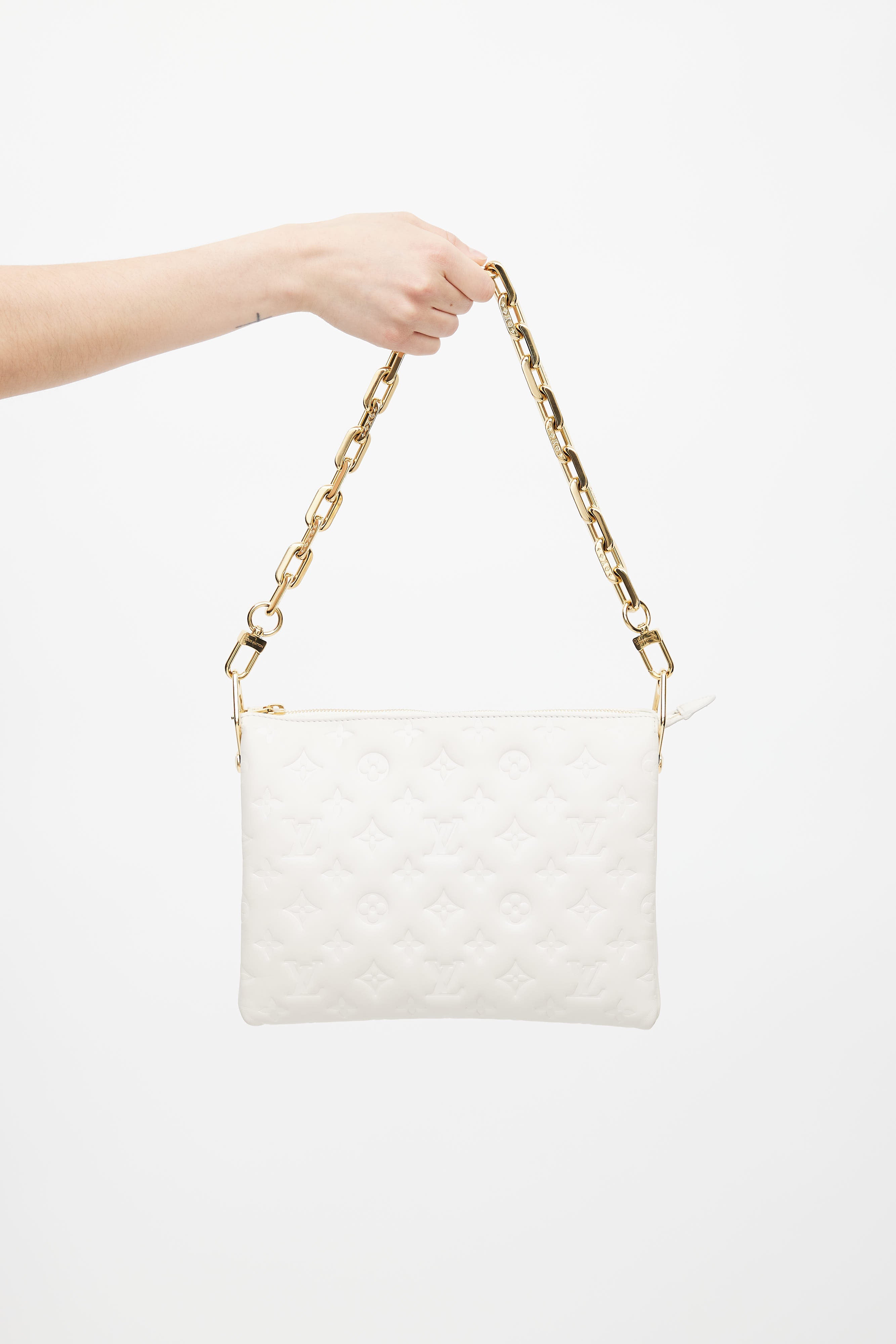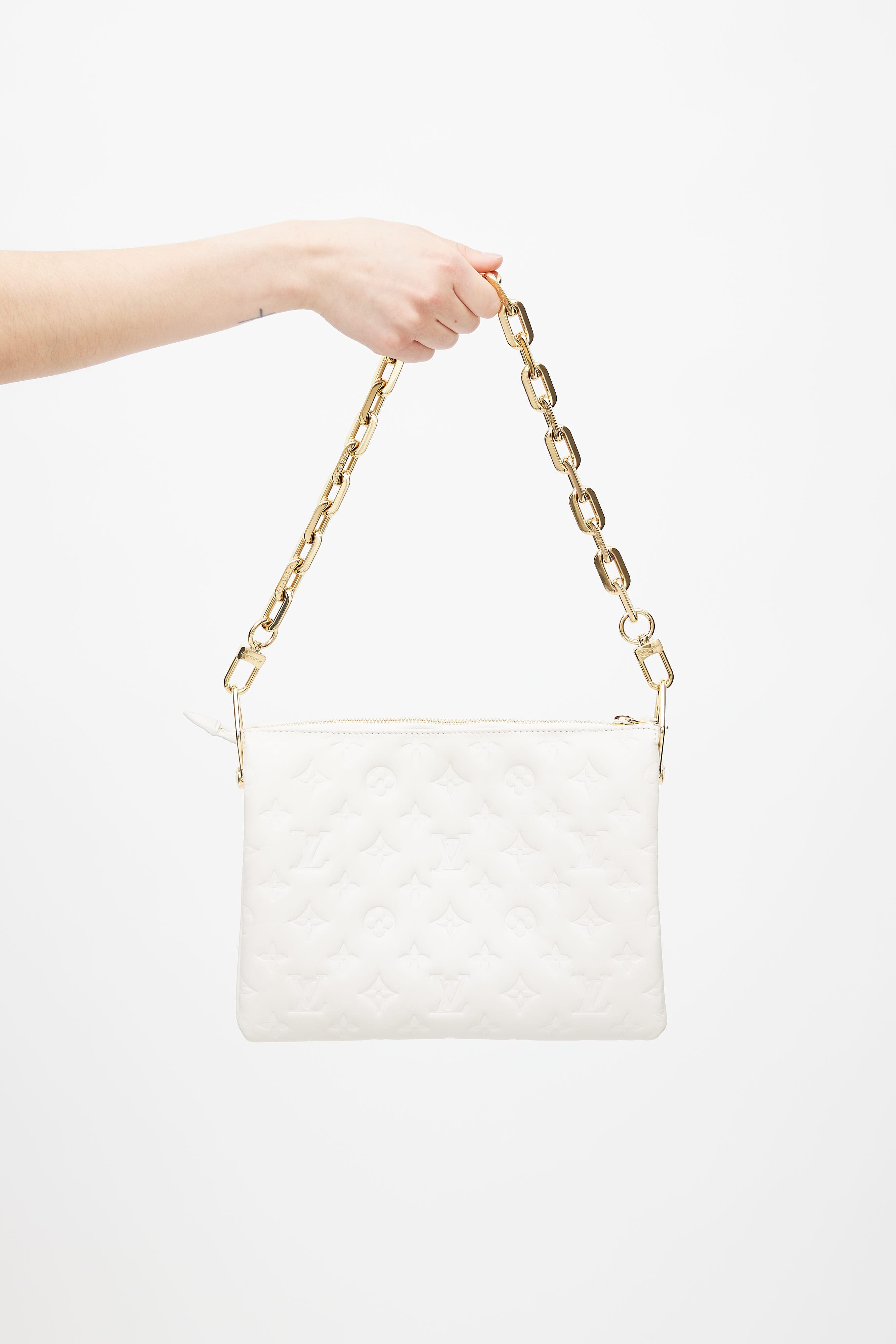 Pre-owned Louis Vuitton cream Coussin PM shoulder bag featuring embossed Monogram throughout, accordion sides, three main compartments, gold tone hardware, zip closure at bag, and suede lining. Comes with detachable chain link and canvas strap. Original dust bag and box included.