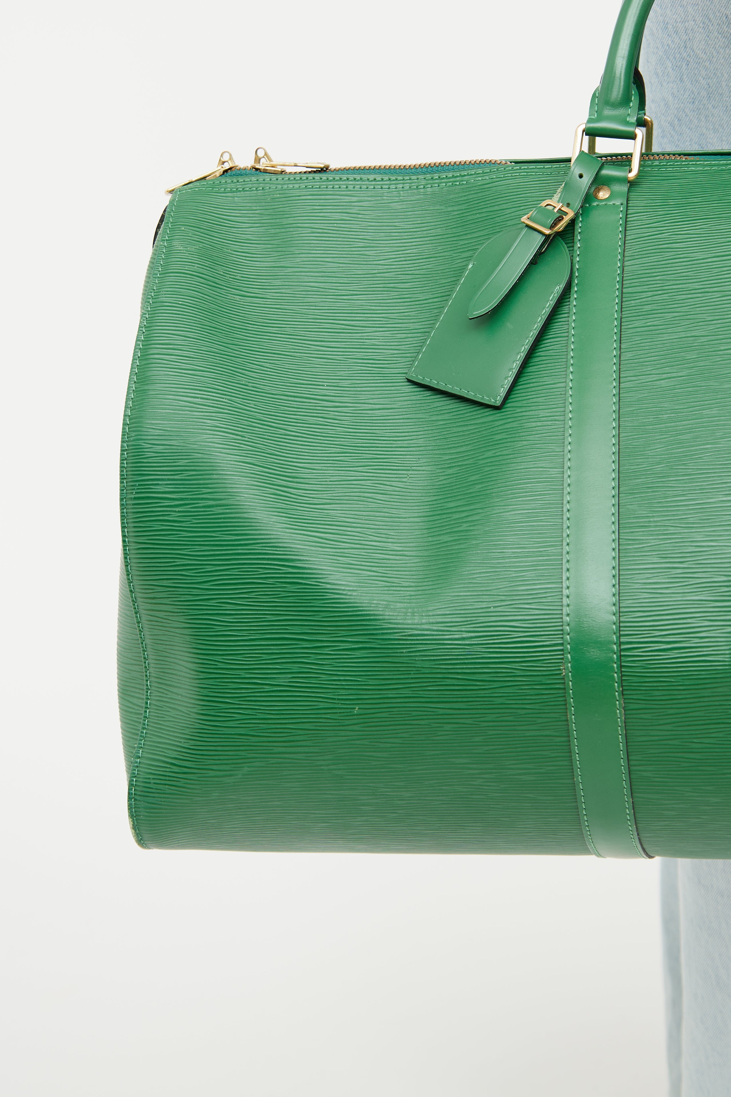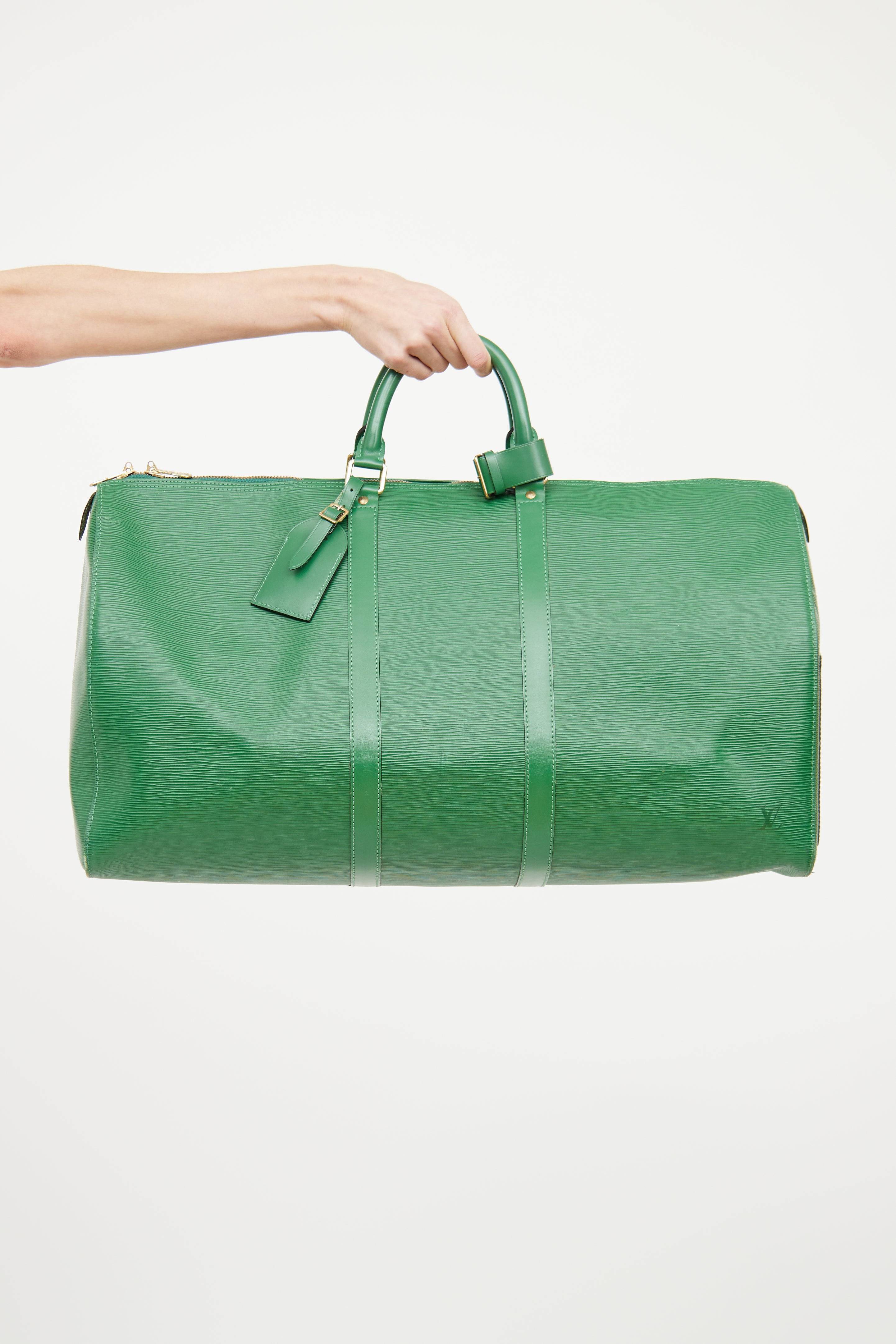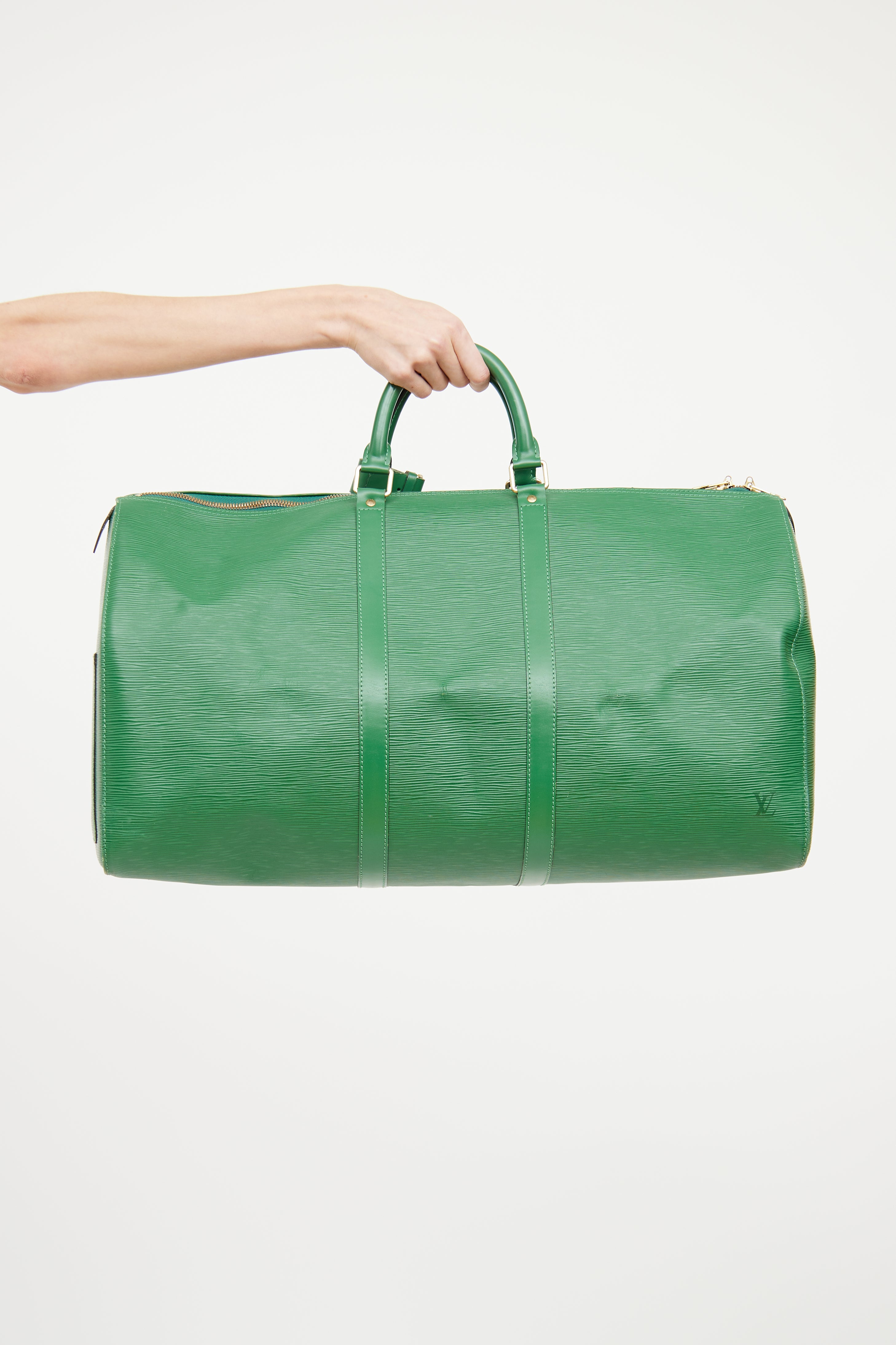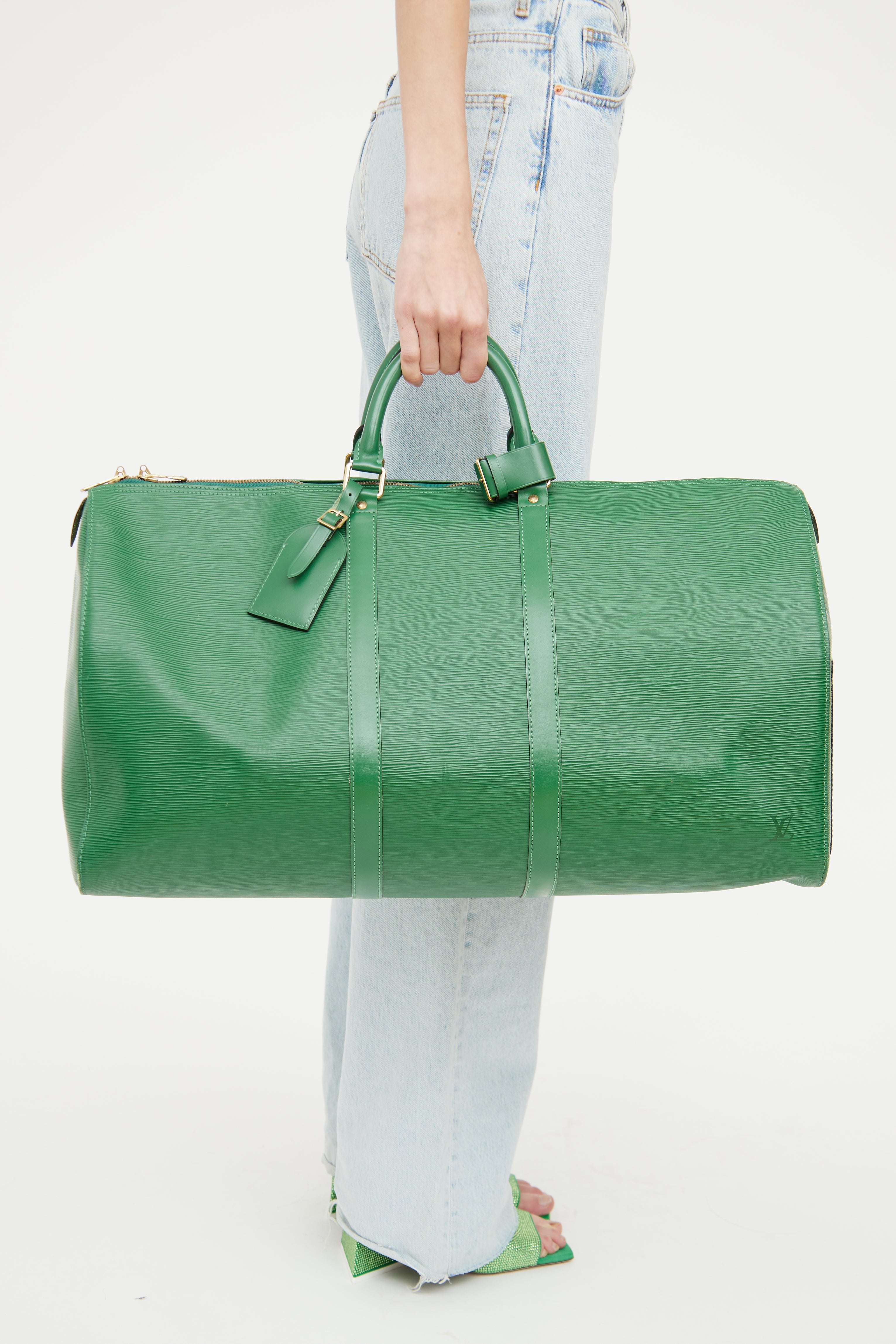 Pre-owned Louis Vuitton green Epi leather Keepall 50 duffle bag featuring gold tone hardware, dual rolled top handles, luggage tag, one exterior side slip pocket, debossed logo at front right corner, top double zip closure, and one main compartment.