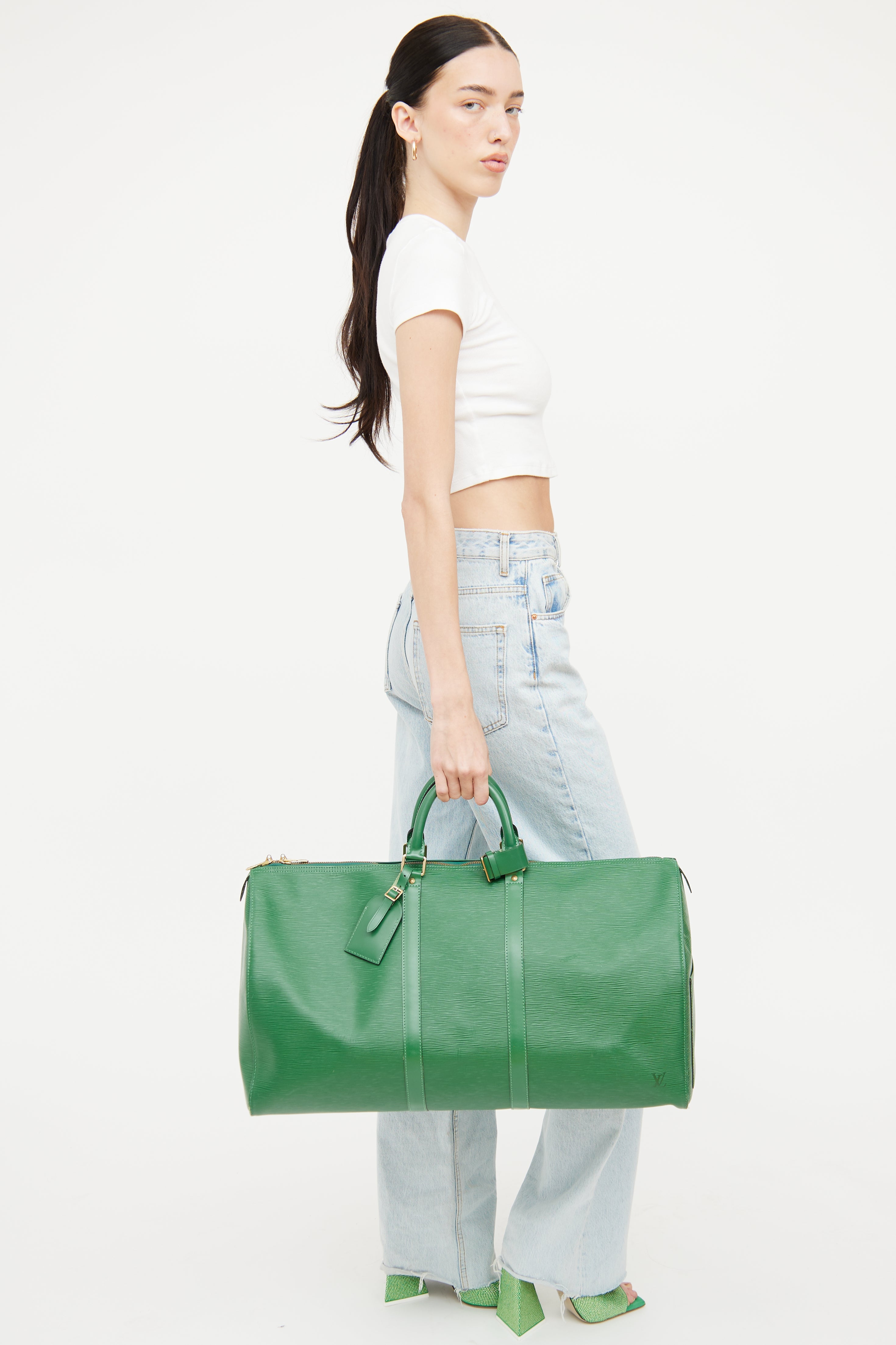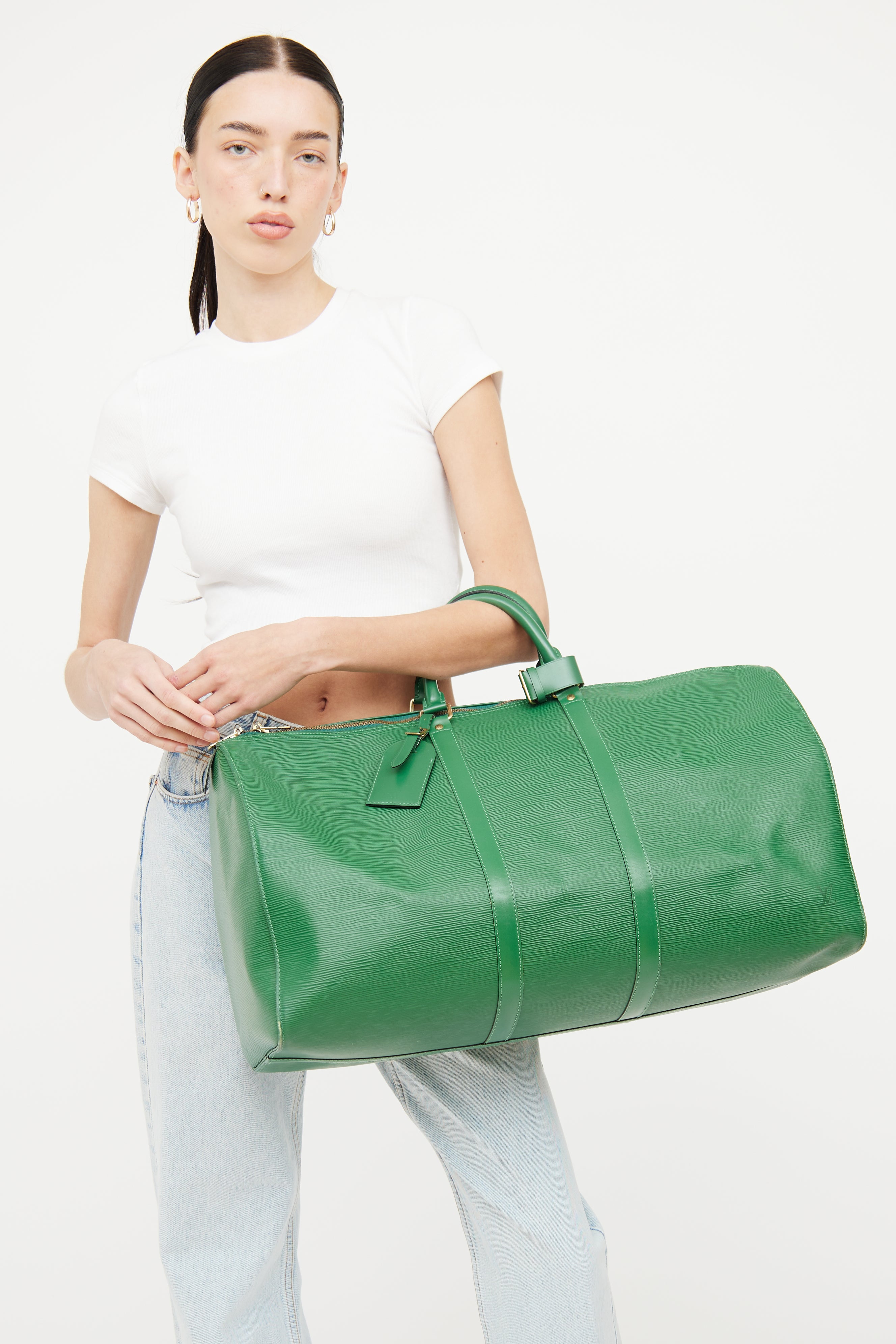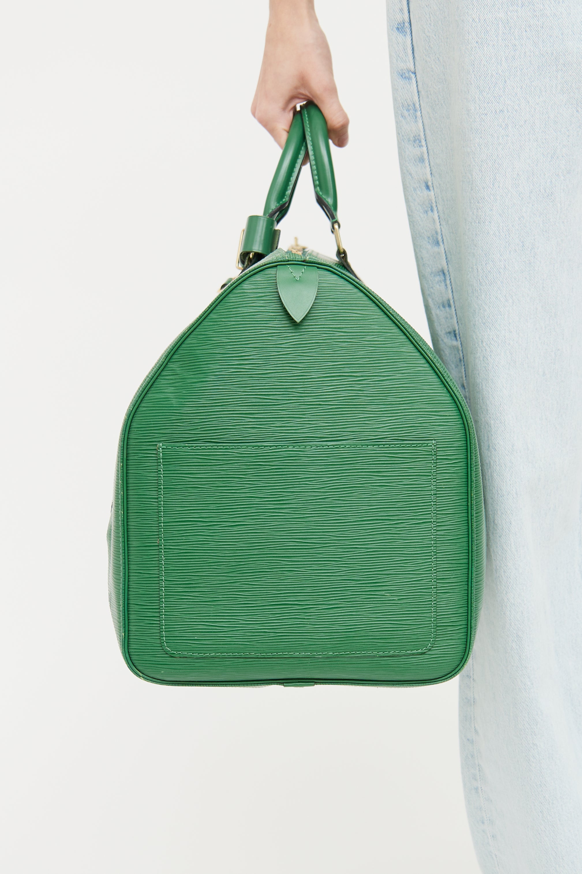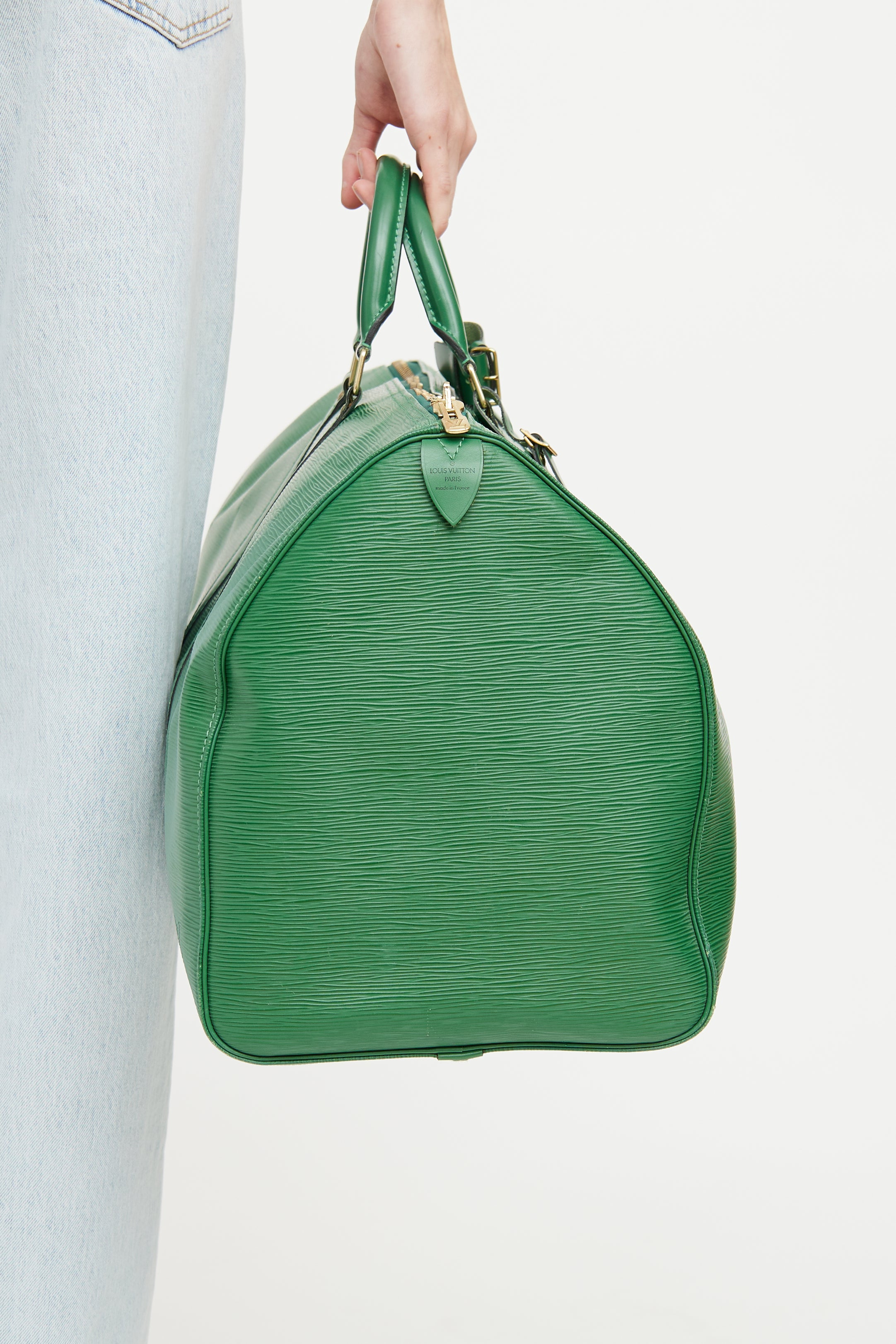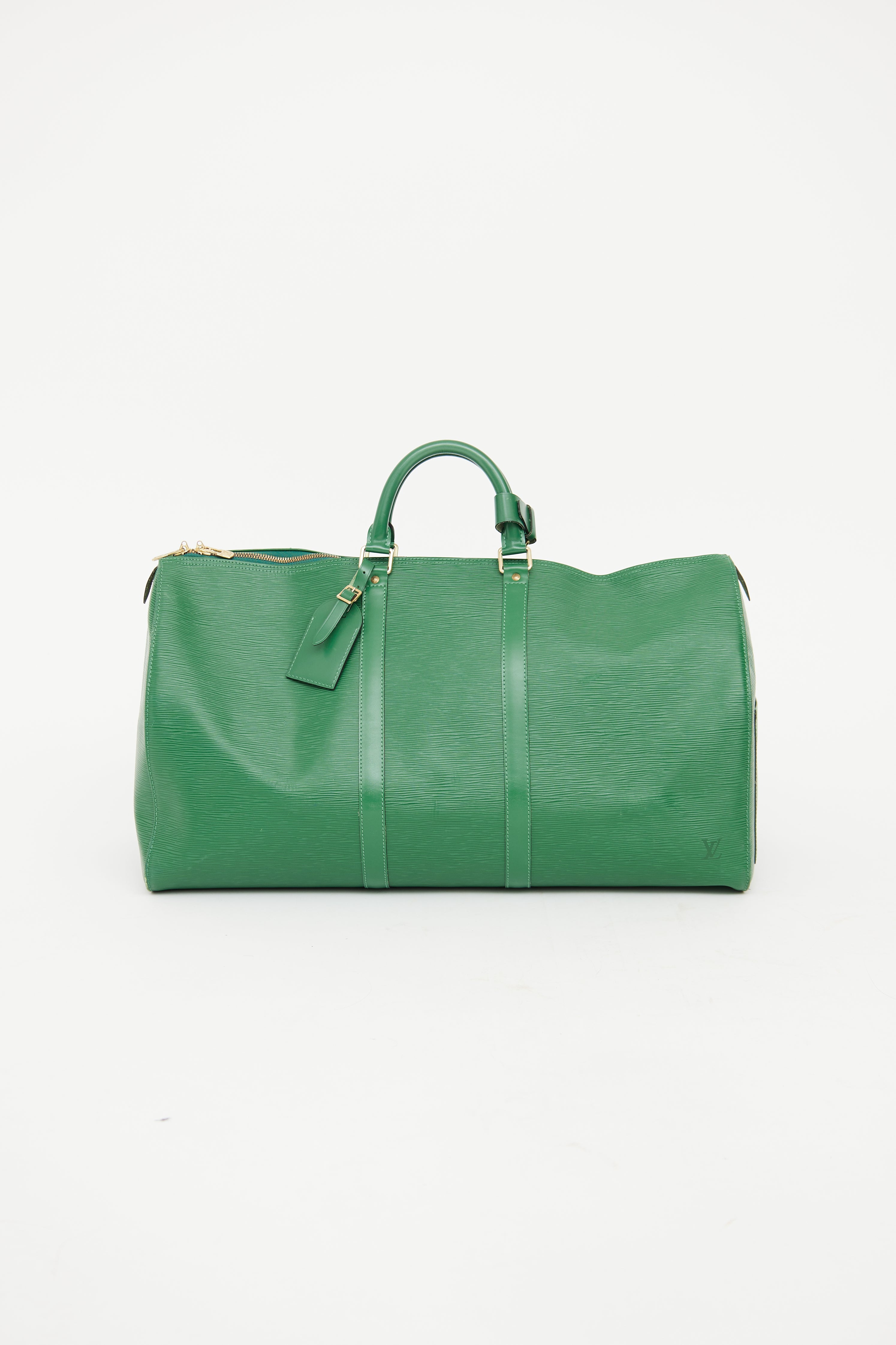 Pre-owned Louis Vuitton green Epi leather Keepall 50 duffle bag featuring gold tone hardware, dual rolled top handles, luggage tag, one exterior side slip pocket, debossed logo at front right corner, top double zip closure, and one main compartment.