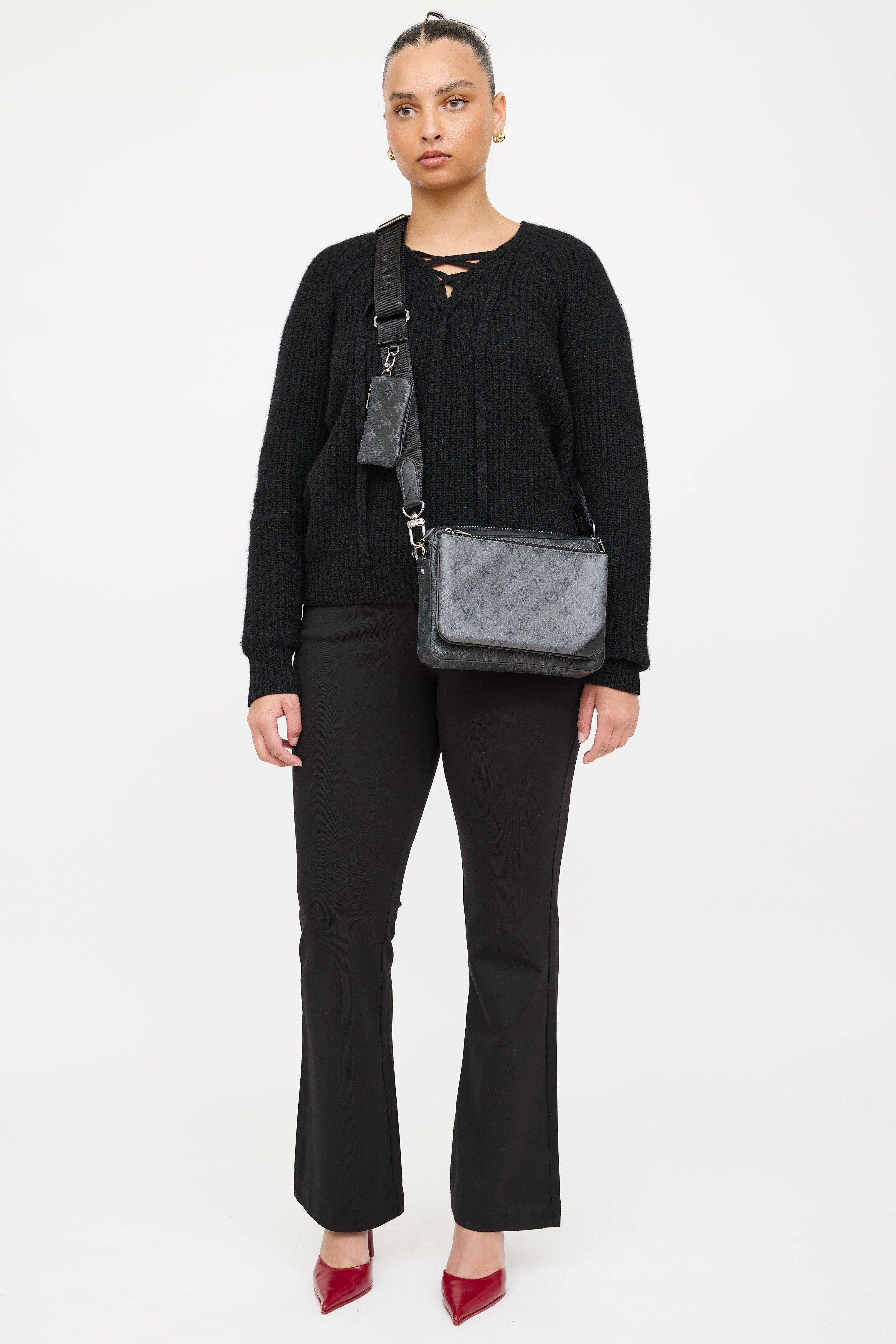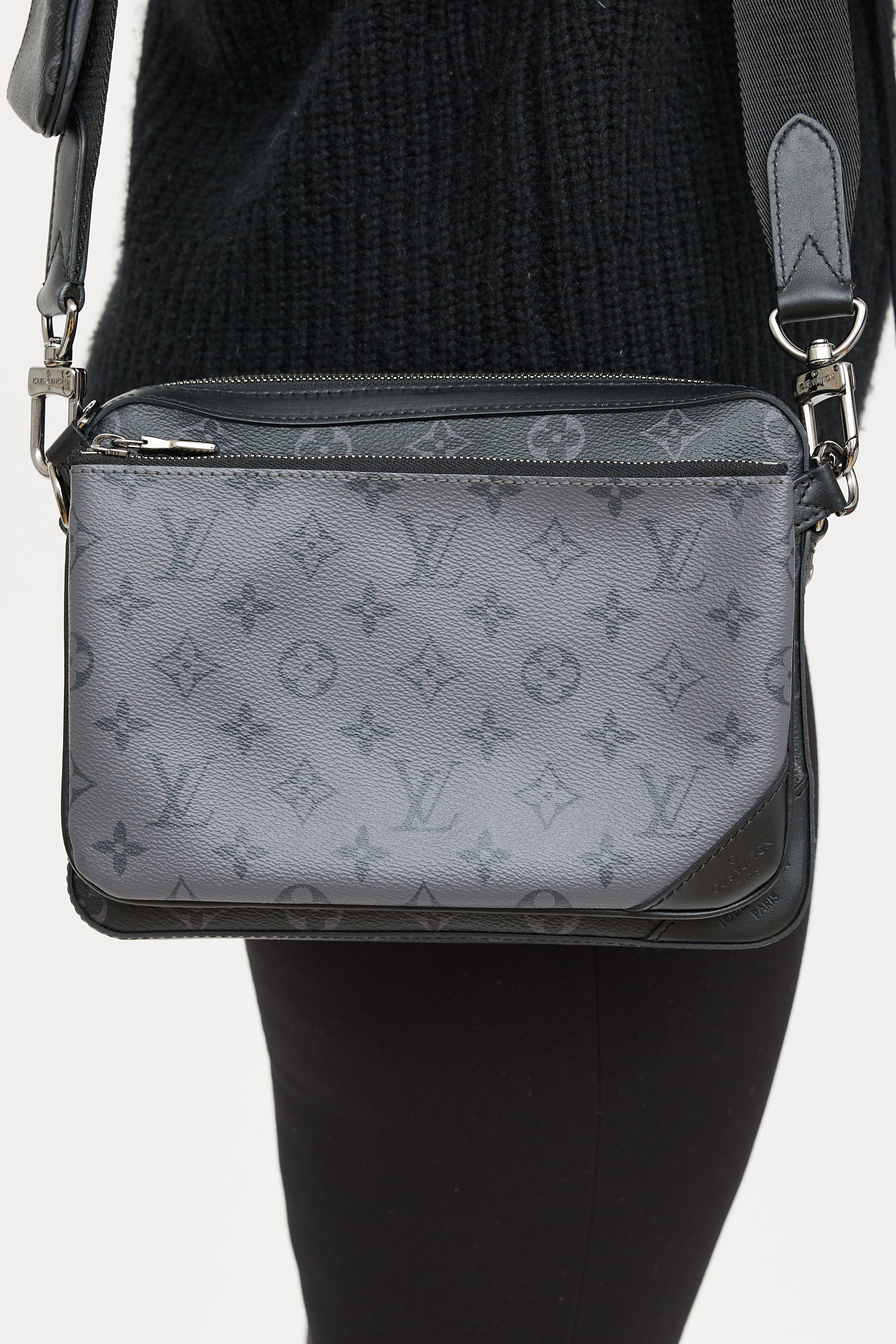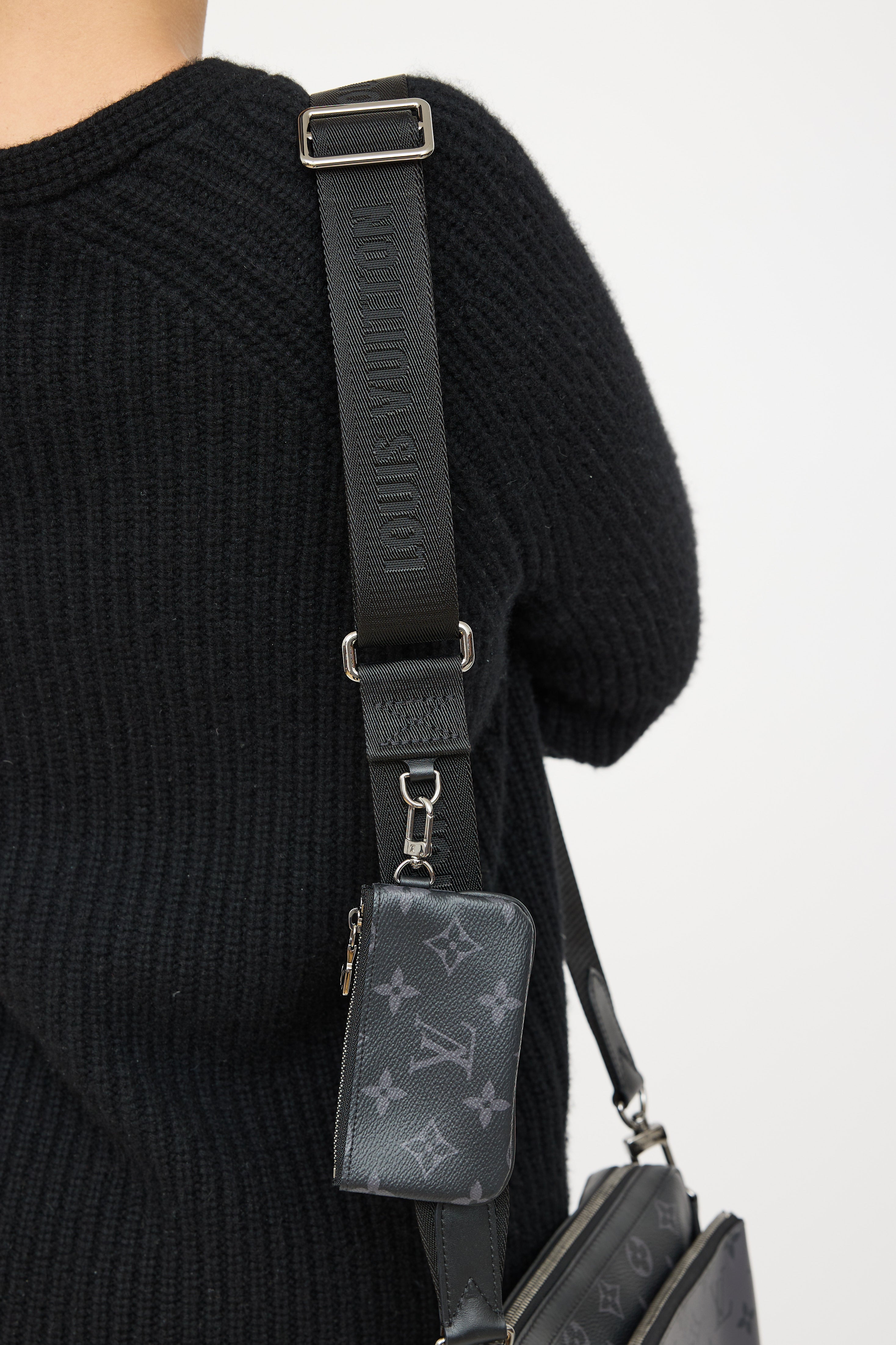 Pre-owned Louis Vuitton black Eclipse Trio messenger bag in monogram coated canvas featuring a grey reverse monogram removable zip pouch at front, one main compartment with one slip pocket, removable webbed shoulder strap with reverse monogram coin pouch, debossed logo at corner, and top zip closure.