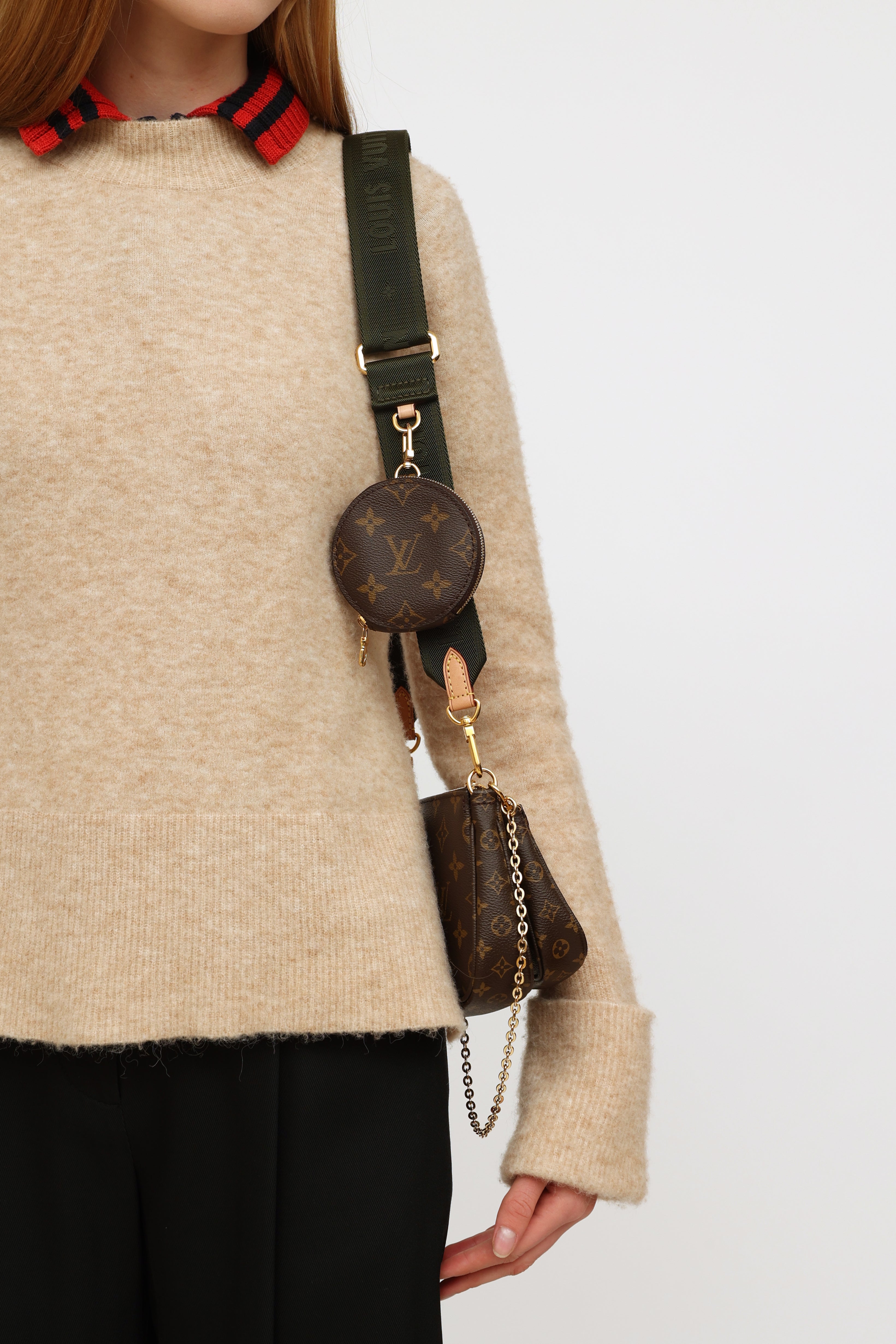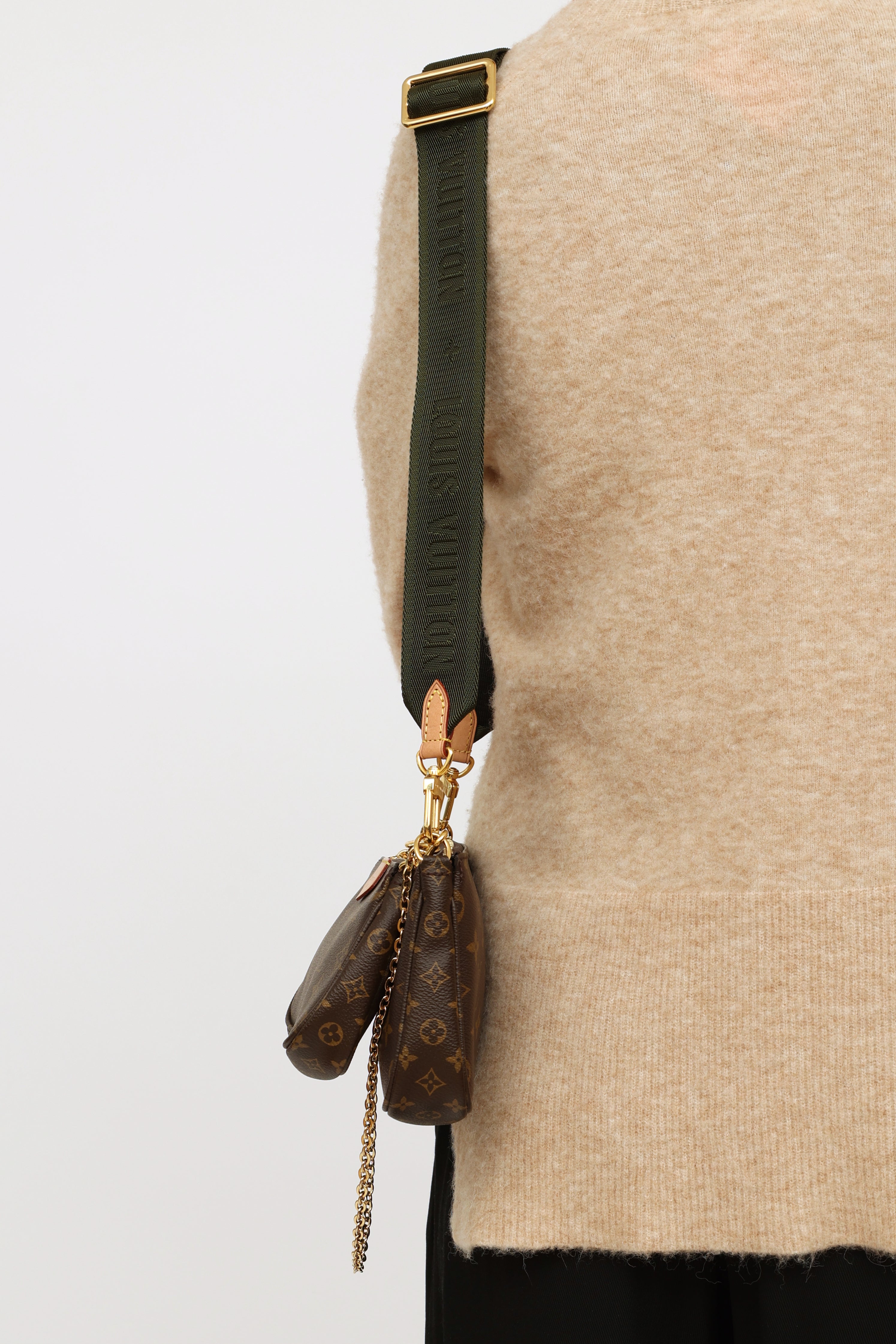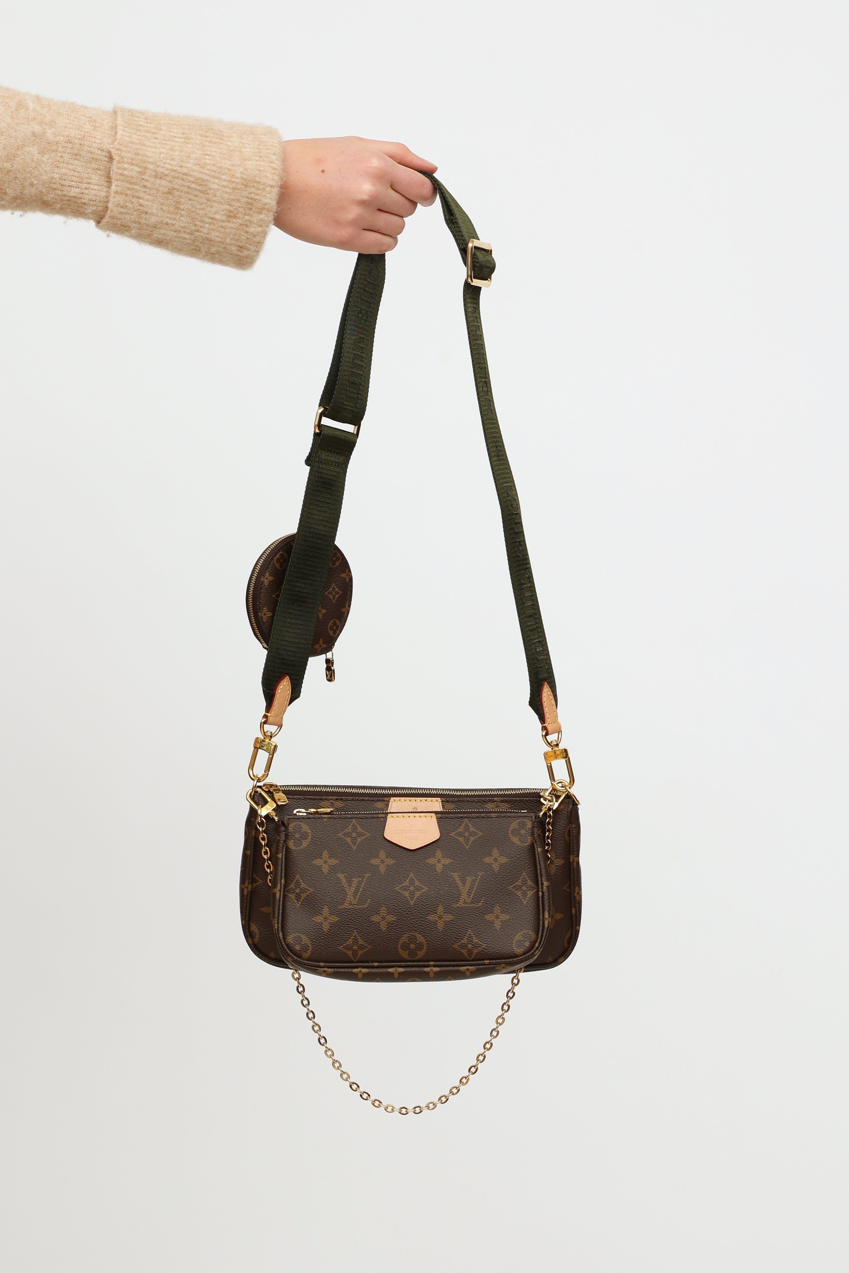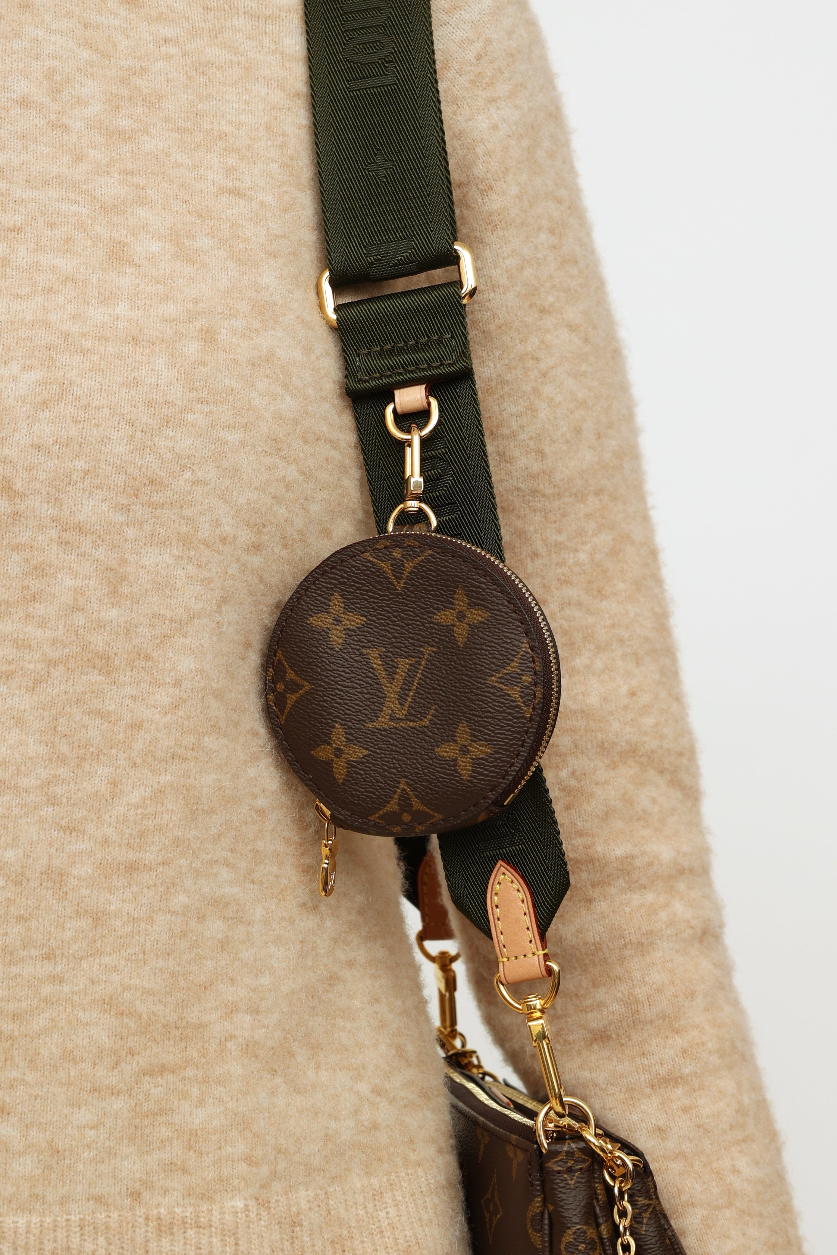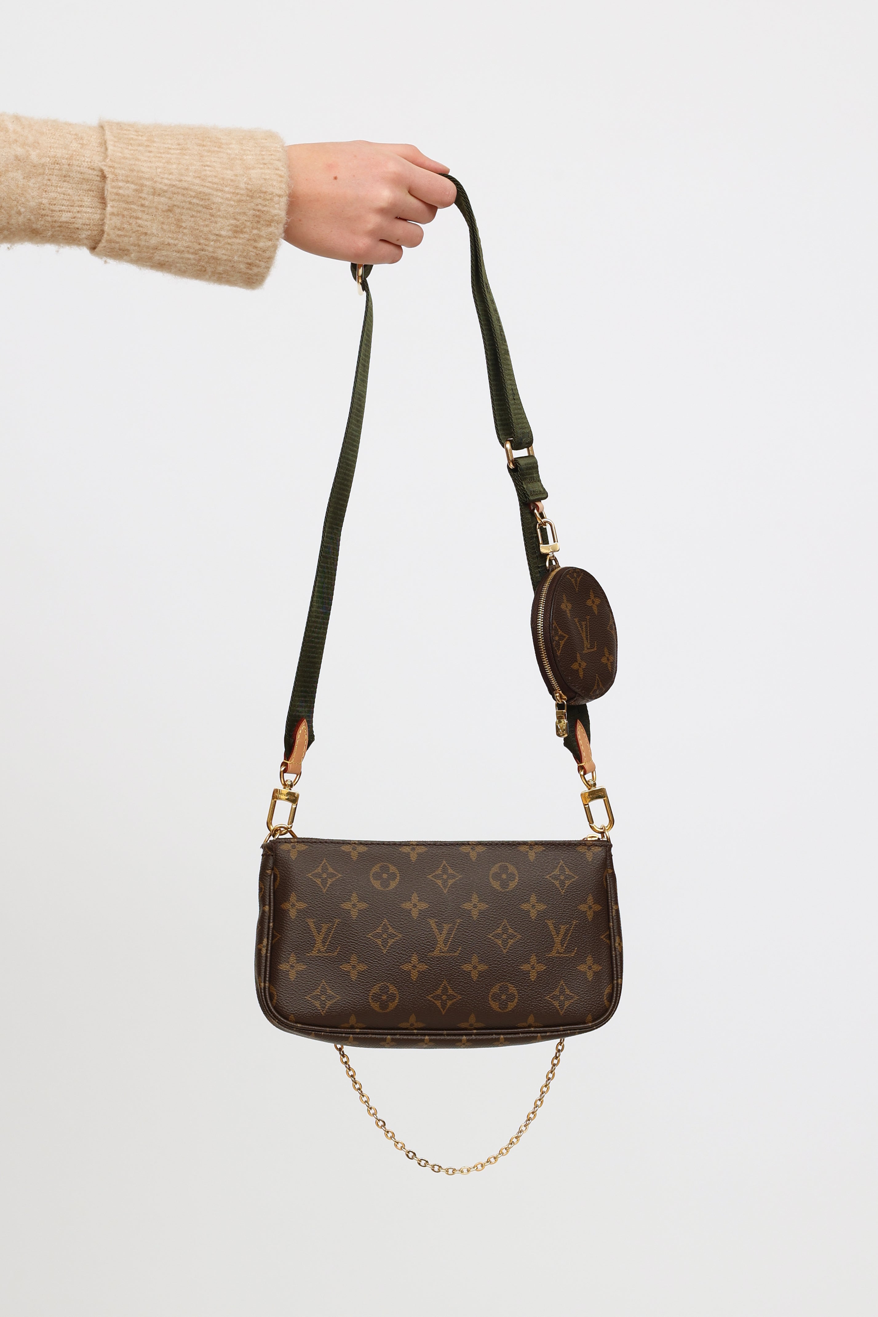 Pre-owned Louis Vuitton Multi Pochette bag in brown coated canvas monogram featuring three attached Pochette Accessoires, Mini Pochette Accessoires and Round Coin Purse, adjustable removable khaki green webbing shoulder strap, gold-tone hardware and natural leather trims. Can be worn multiple ways: over the shoulder, crossbody, or as a clutch. From the 2020 collection.