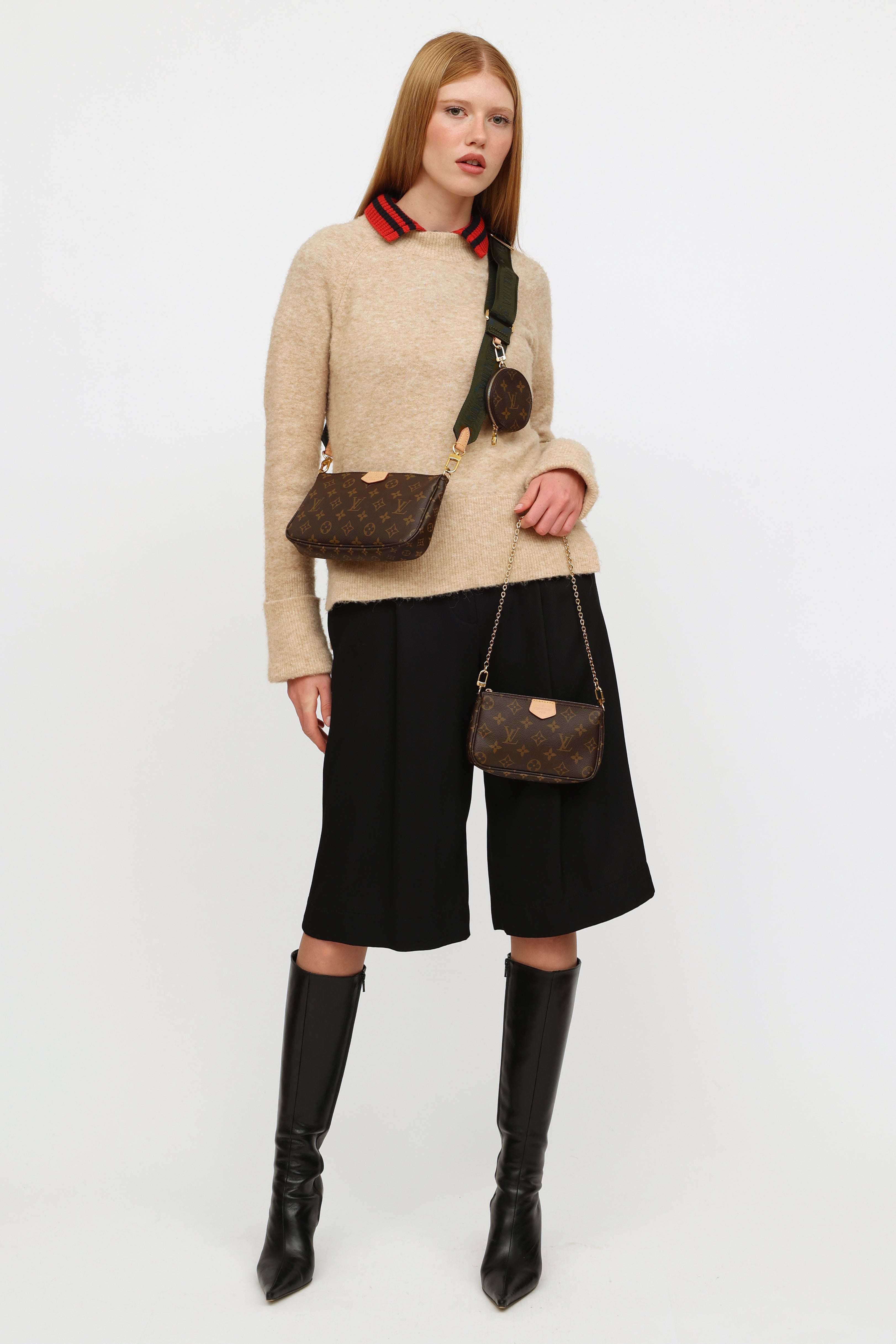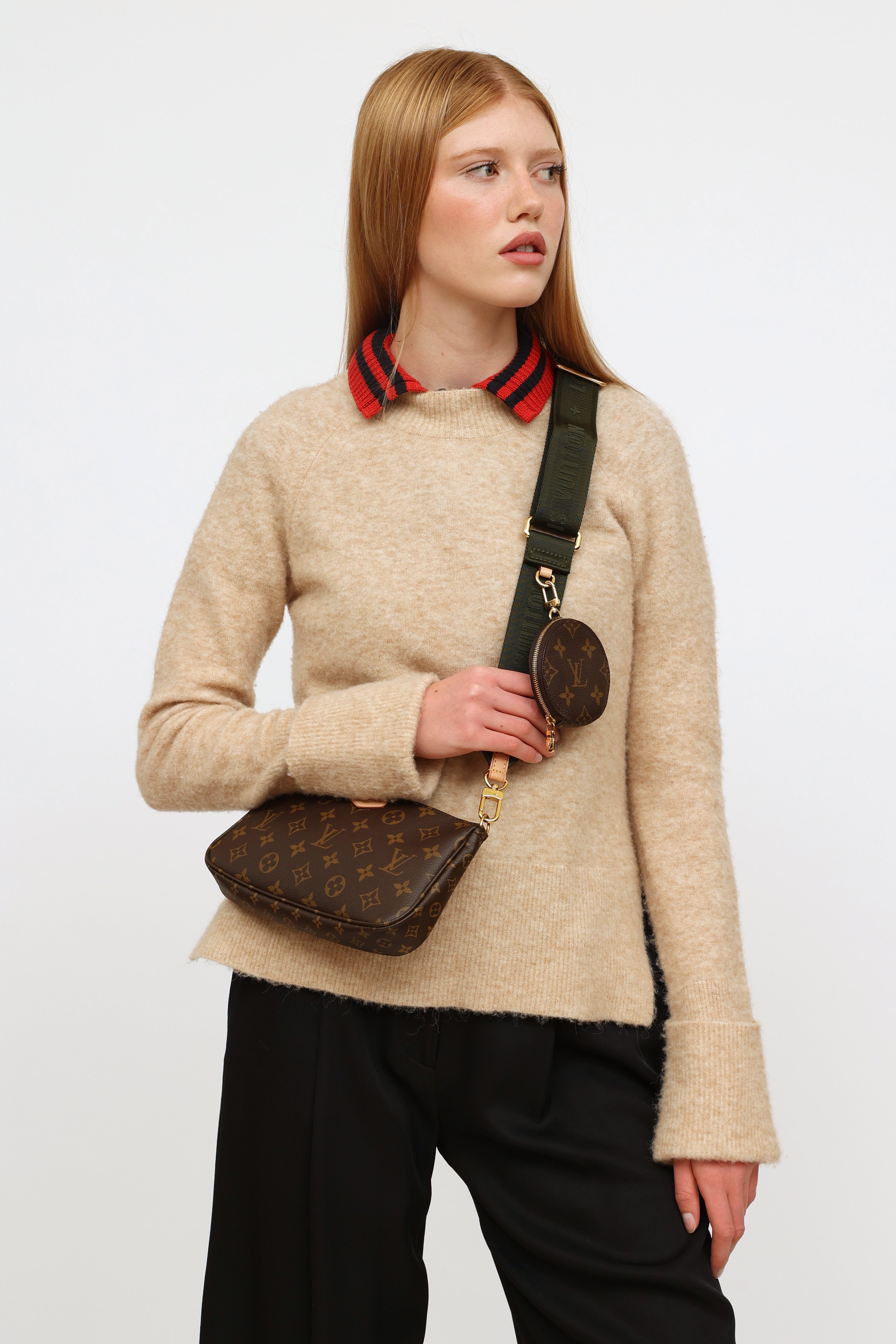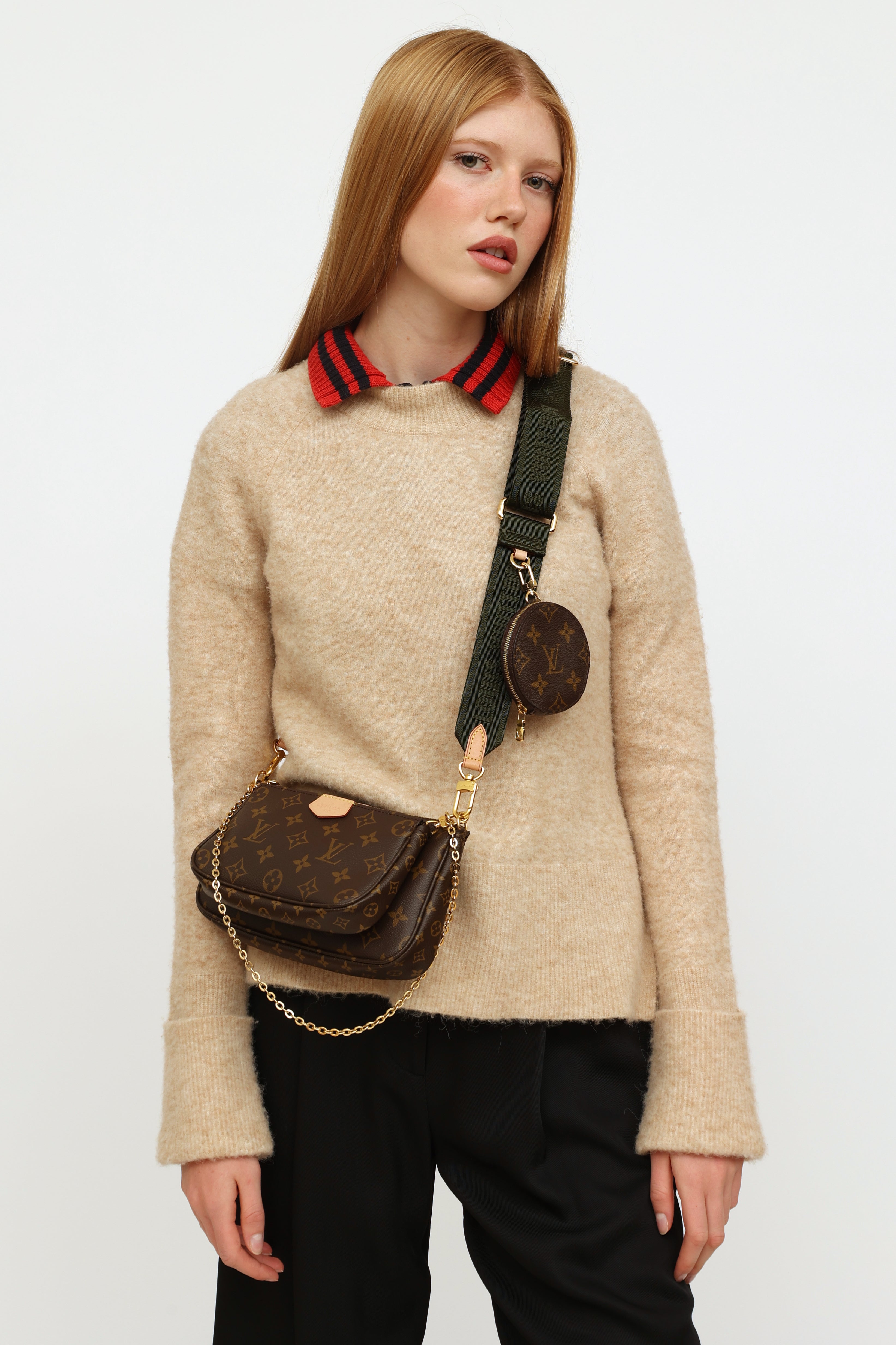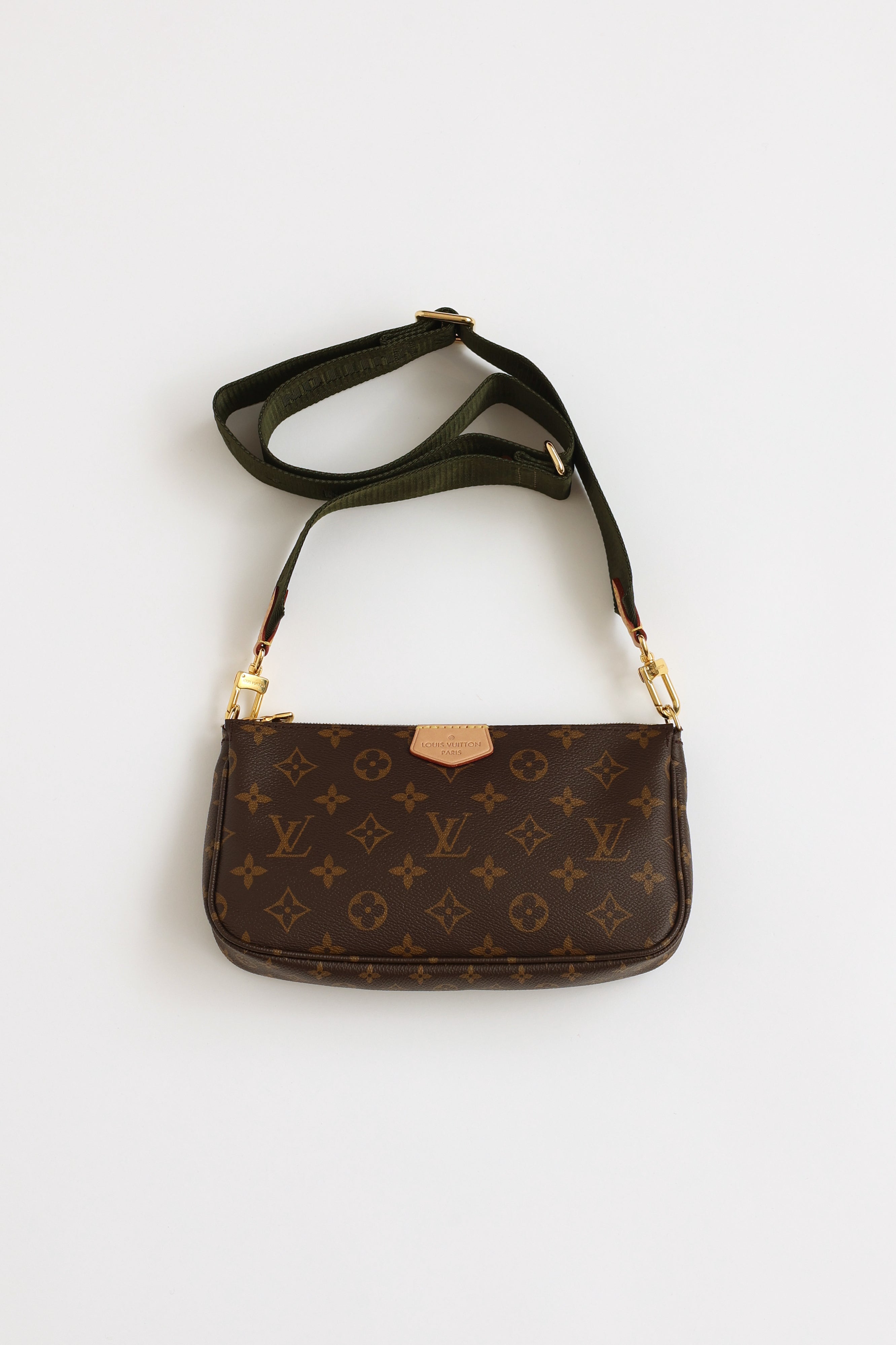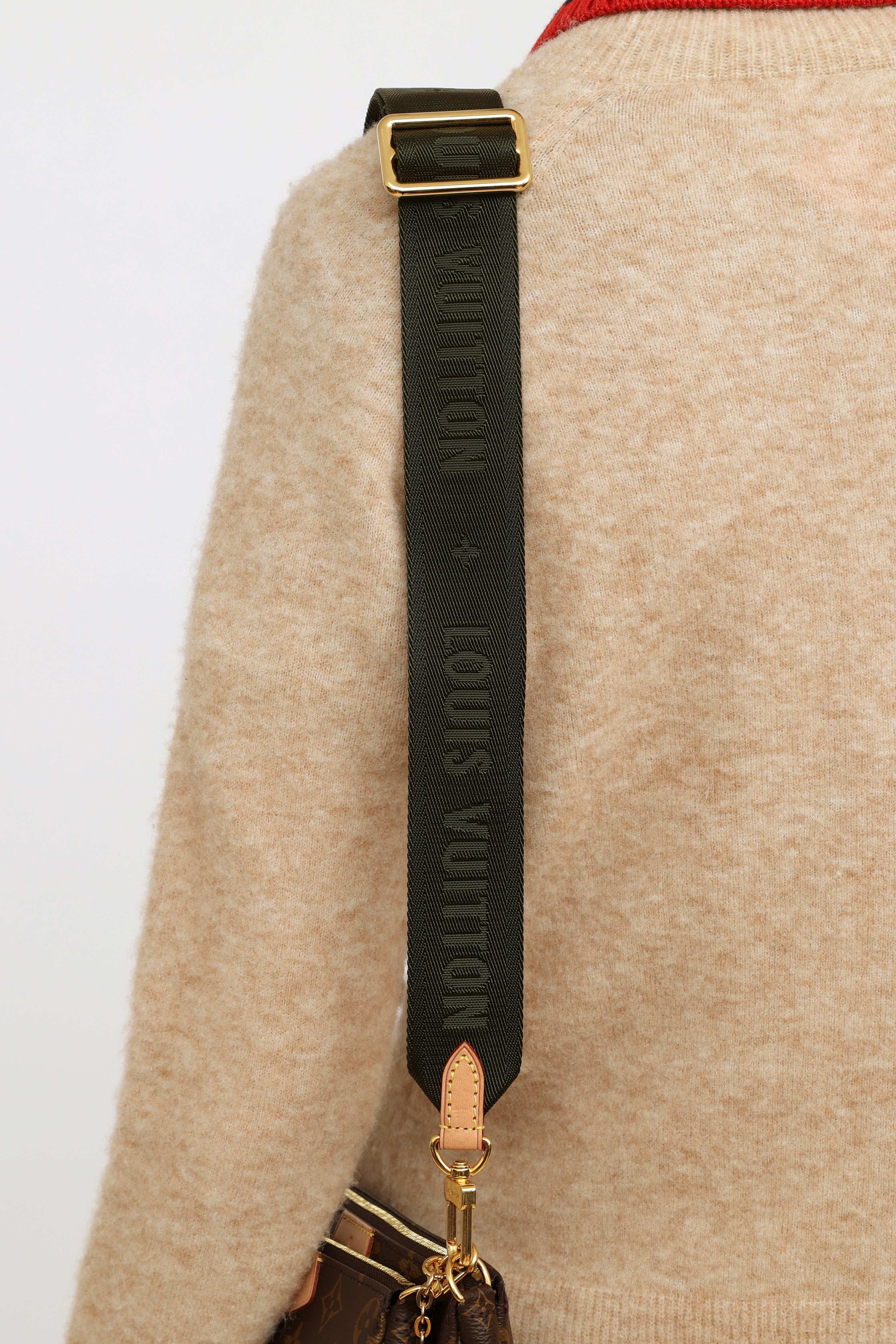 Pre-owned Louis Vuitton Multi Pochette bag in brown coated canvas monogram featuring three attached Pochette Accessoires, Mini Pochette Accessoires and Round Coin Purse, adjustable removable khaki green webbing shoulder strap, gold-tone hardware and natural leather trims. Can be worn multiple ways: over the shoulder, crossbody, or as a clutch. From the 2020 collection.
