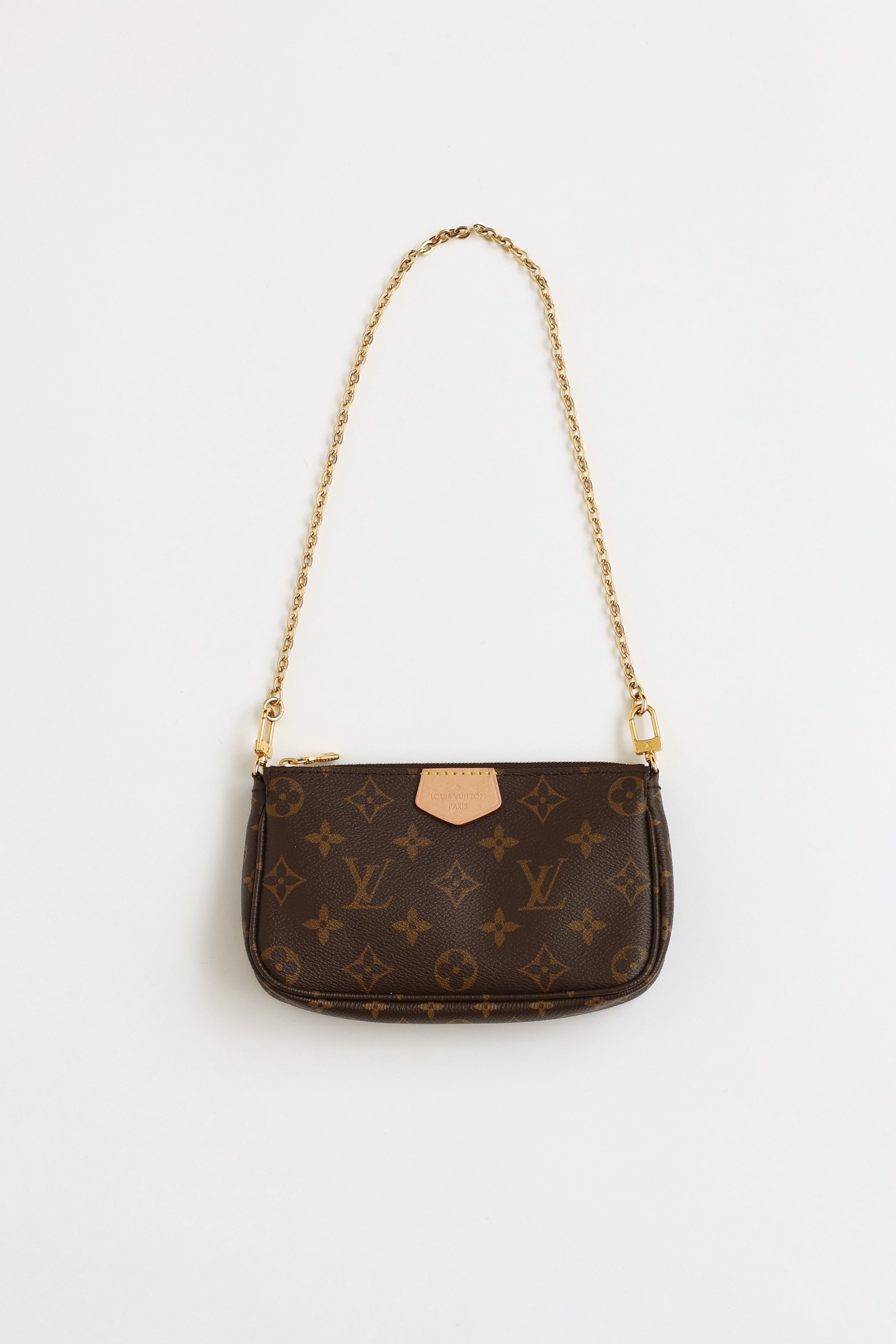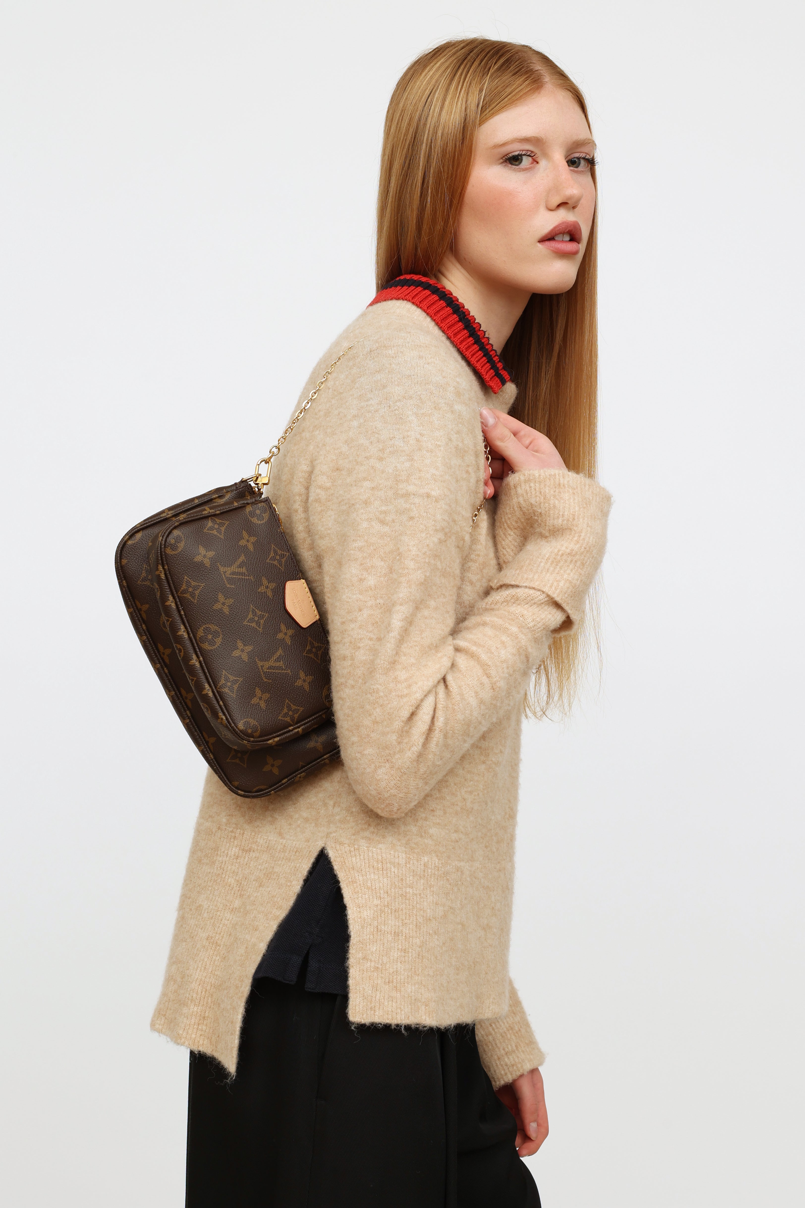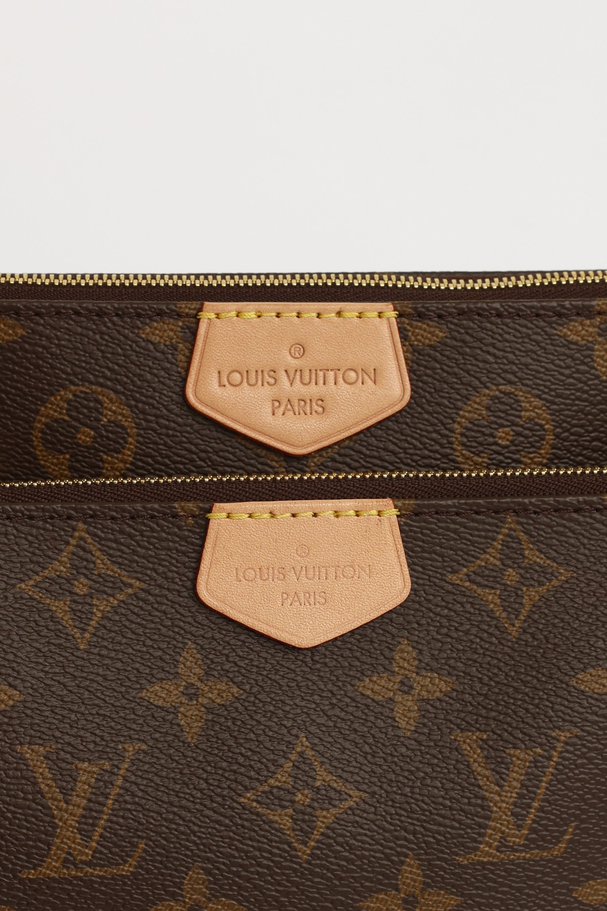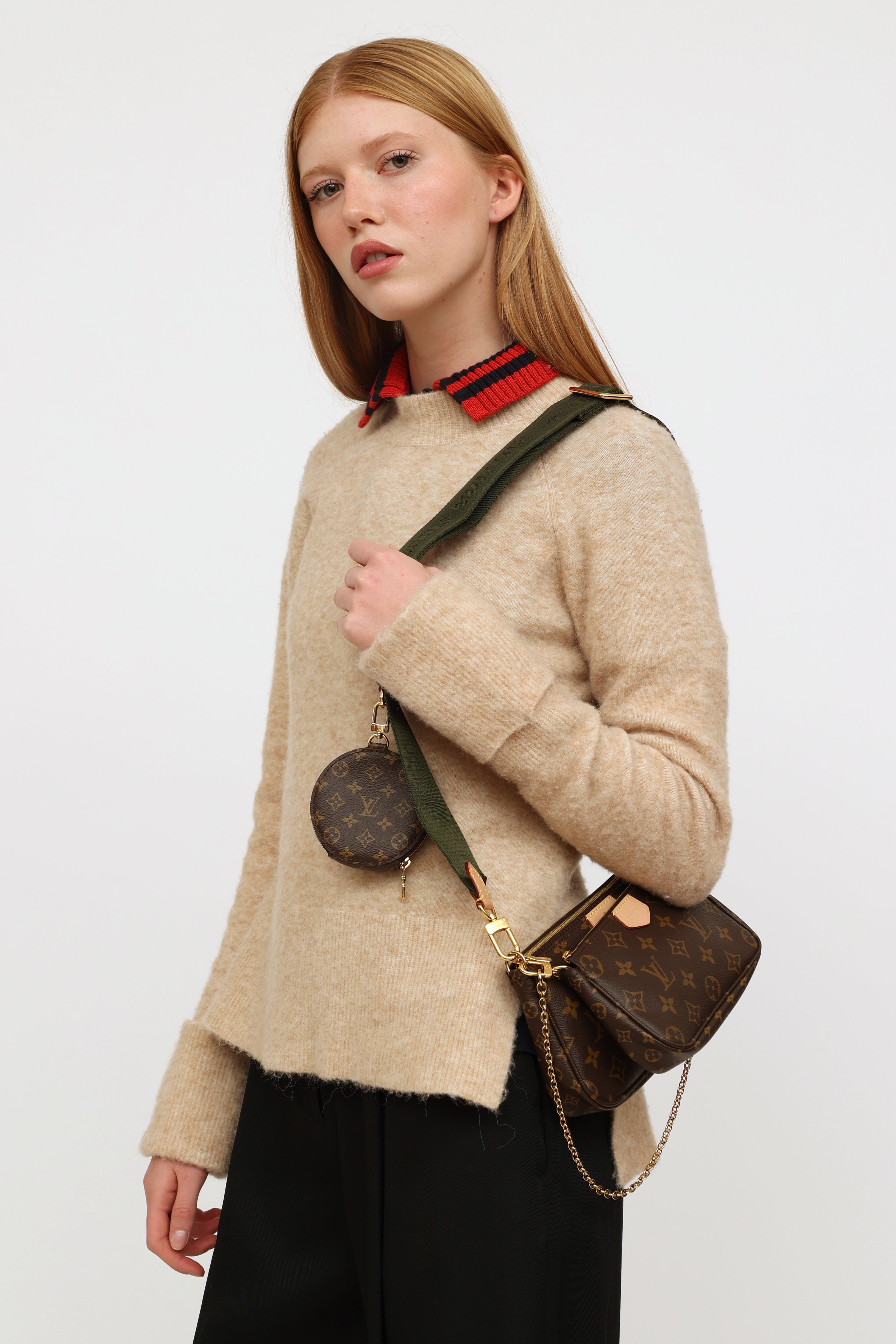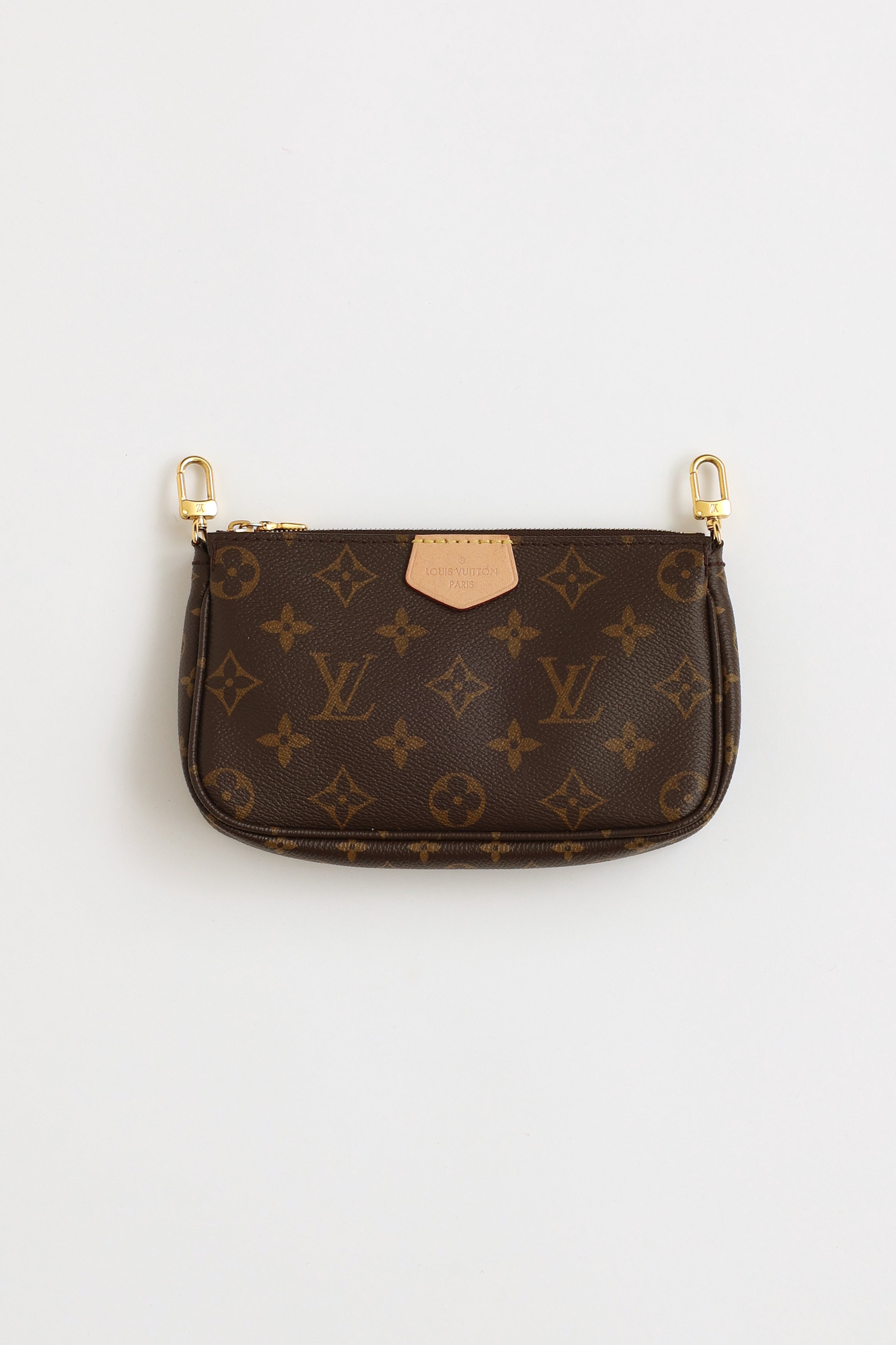 Pre-owned Louis Vuitton Multi Pochette bag in brown coated canvas monogram featuring three attached Pochette Accessoires, Mini Pochette Accessoires and Round Coin Purse, adjustable removable khaki green webbing shoulder strap, gold-tone hardware and natural leather trims. Can be worn multiple ways: over the shoulder, crossbody, or as a clutch. From the 2020 collection.