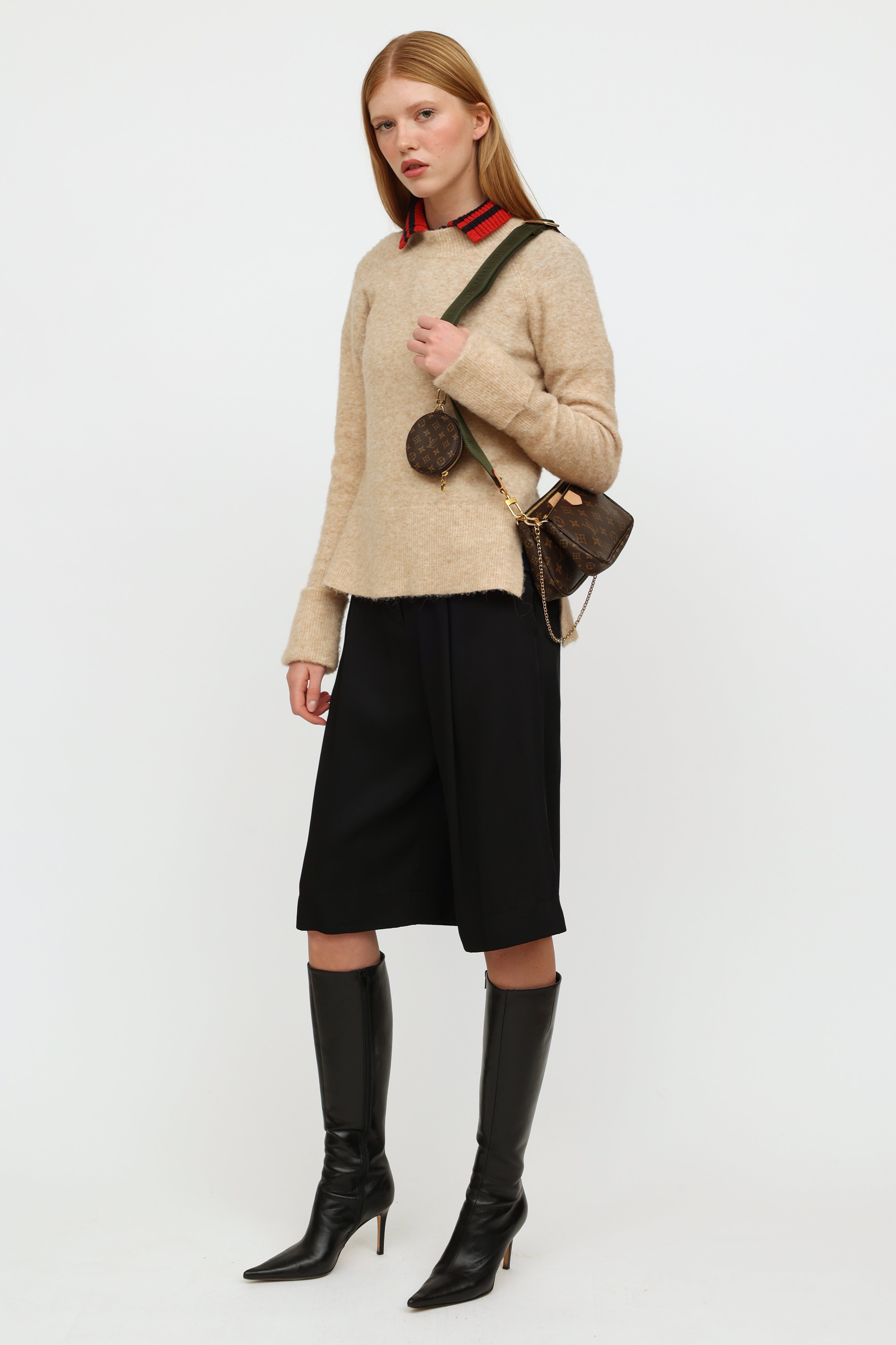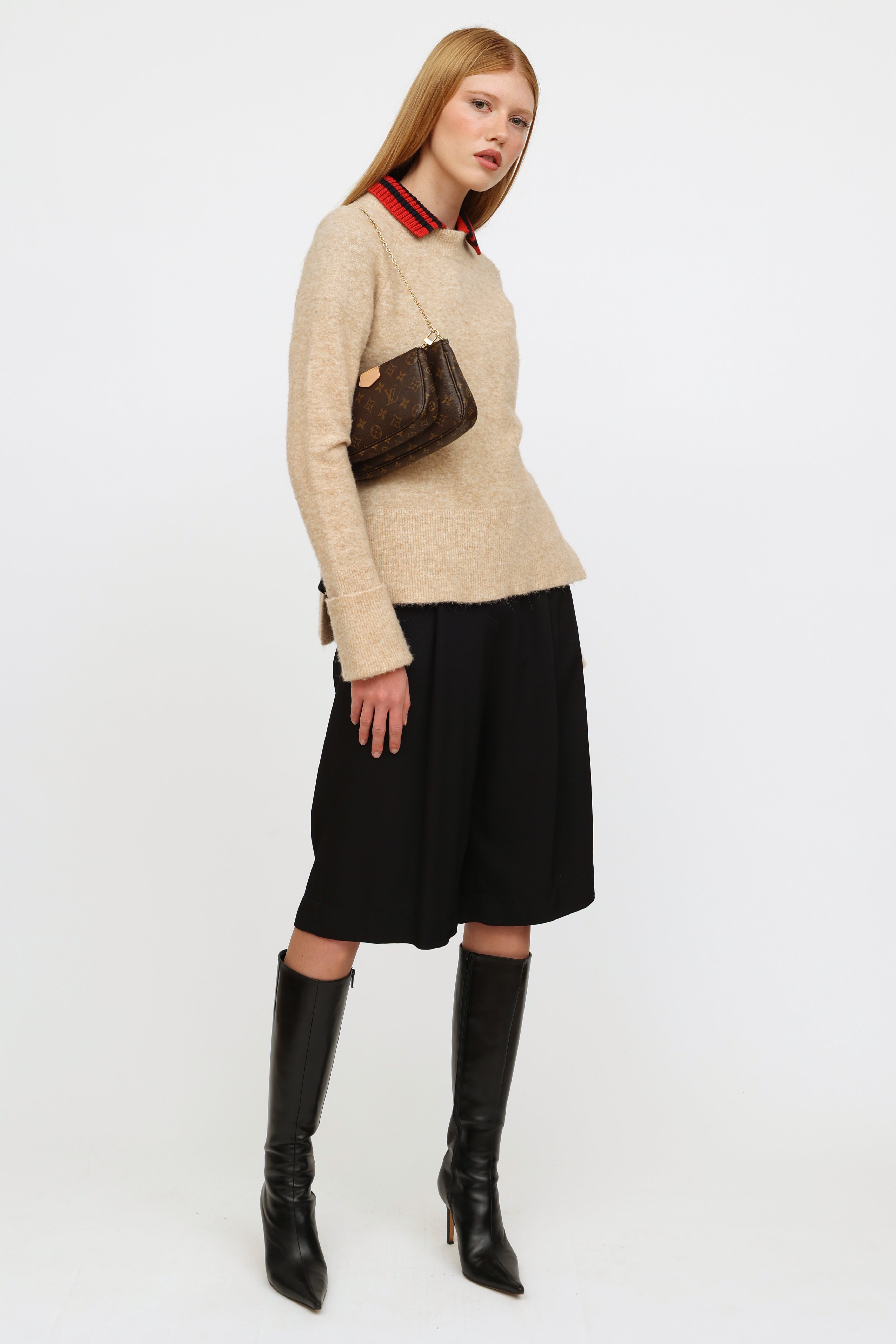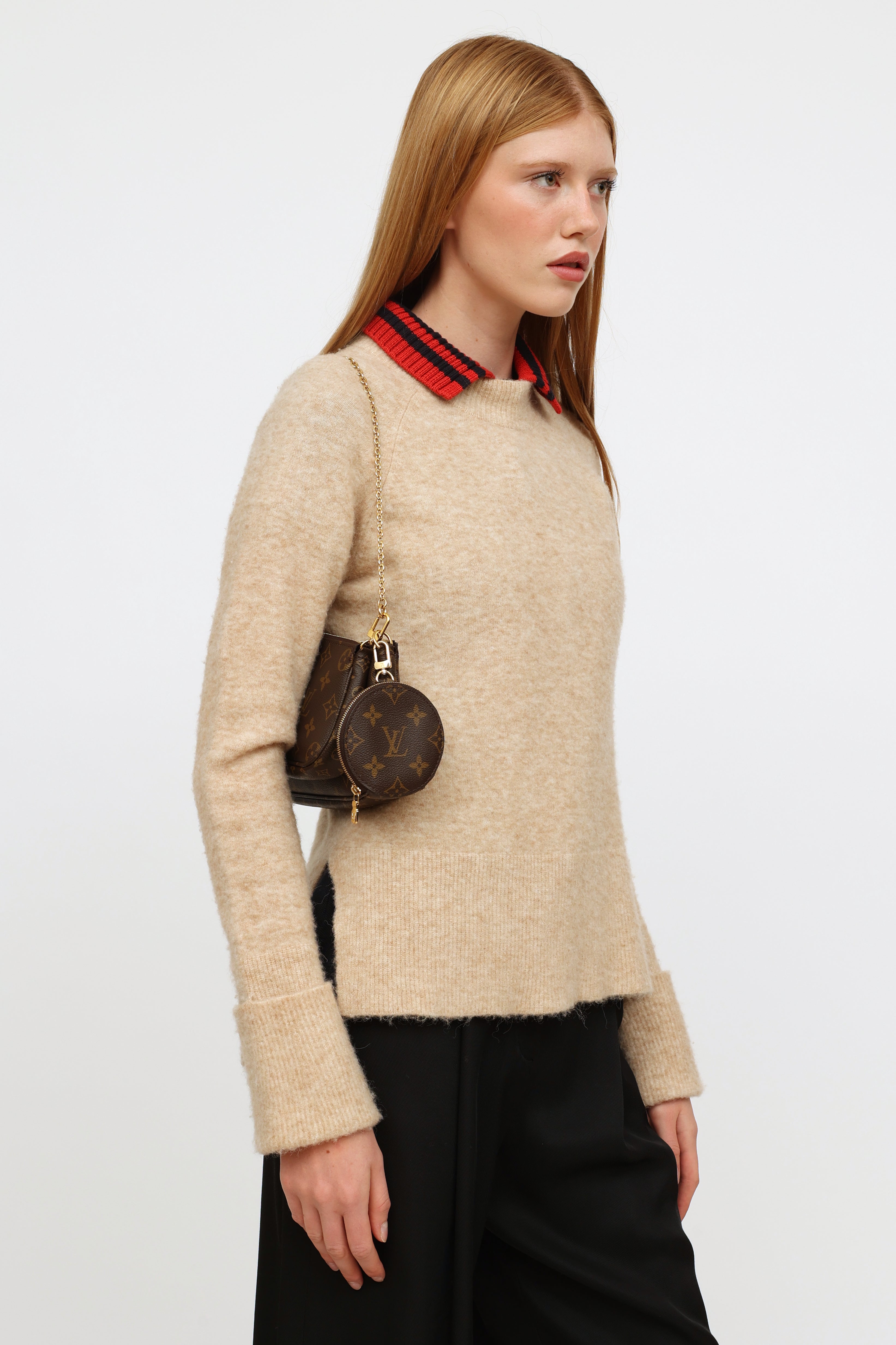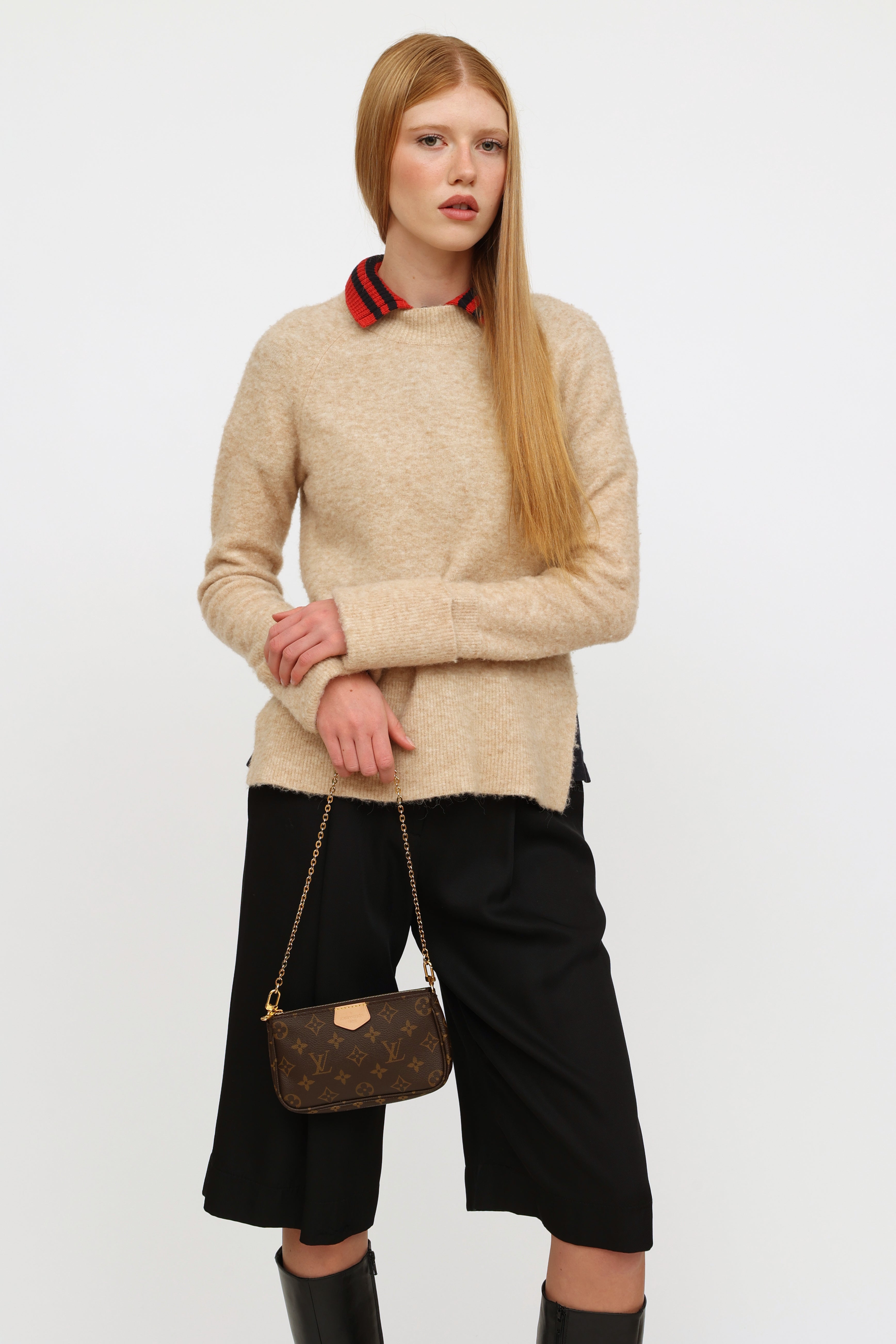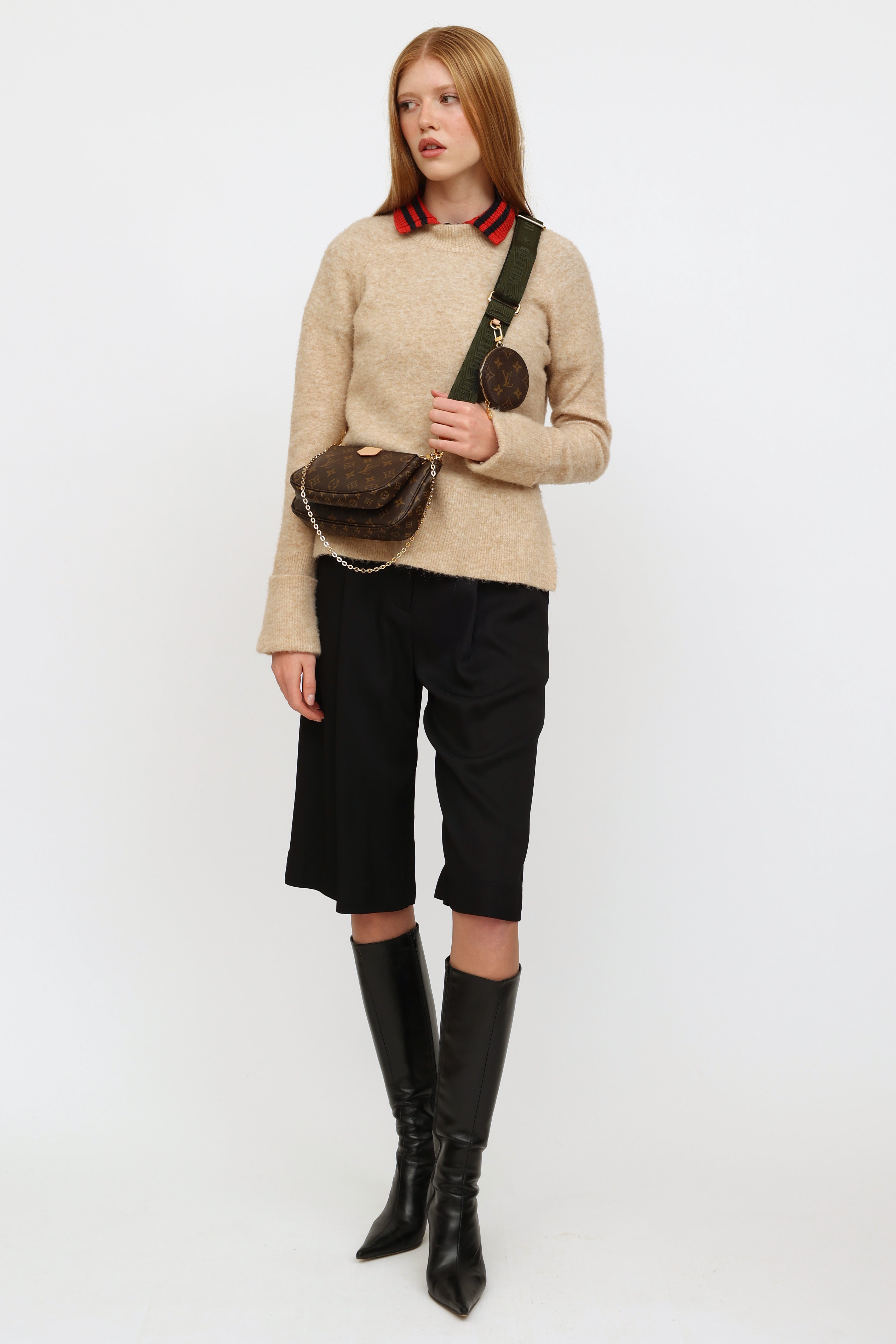 Pre-owned Louis Vuitton Multi Pochette bag in brown coated canvas monogram featuring three attached Pochette Accessoires, Mini Pochette Accessoires and Round Coin Purse, adjustable removable khaki green webbing shoulder strap, gold-tone hardware and natural leather trims. Can be worn multiple ways: over the shoulder, crossbody, or as a clutch. From the 2020 collection.