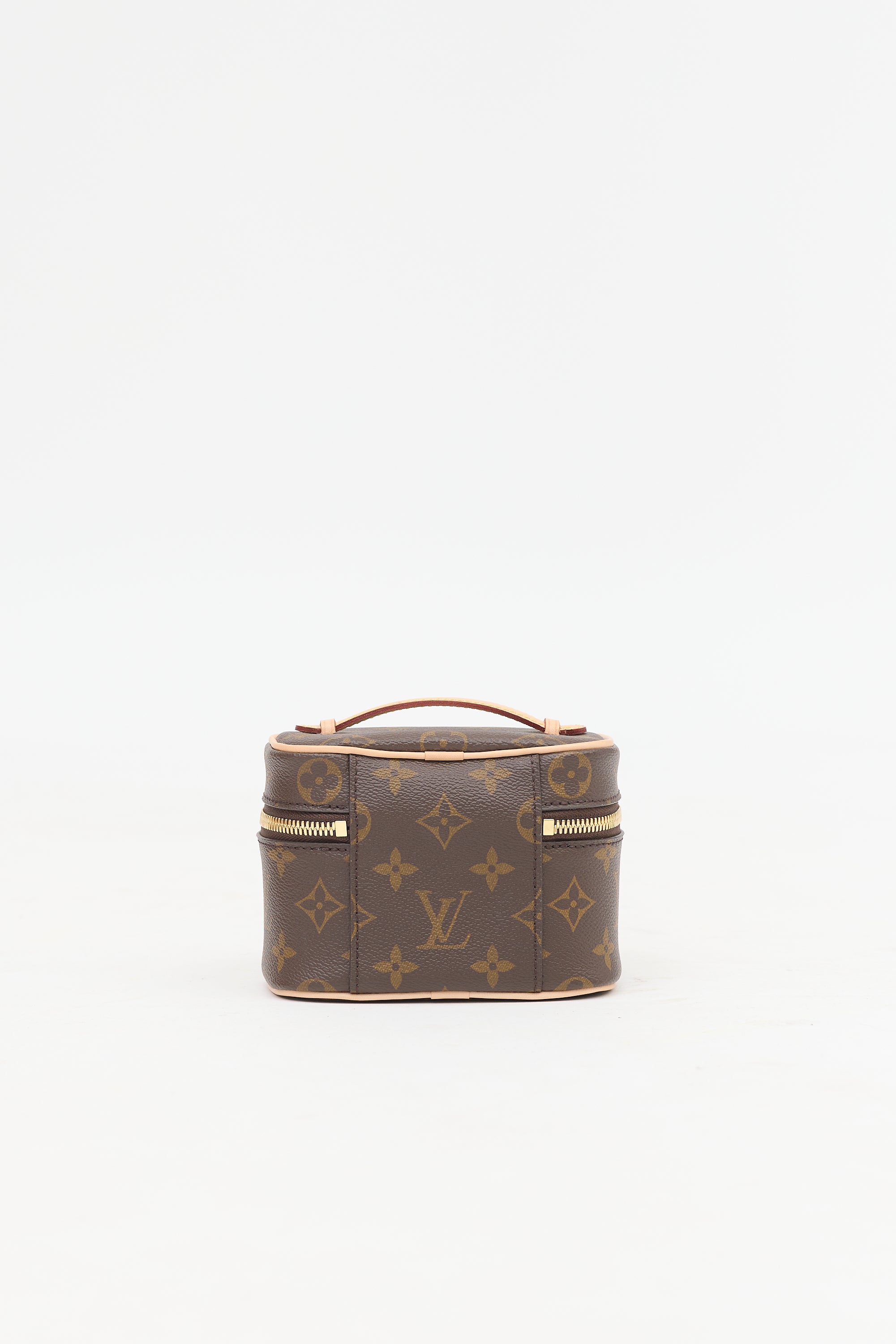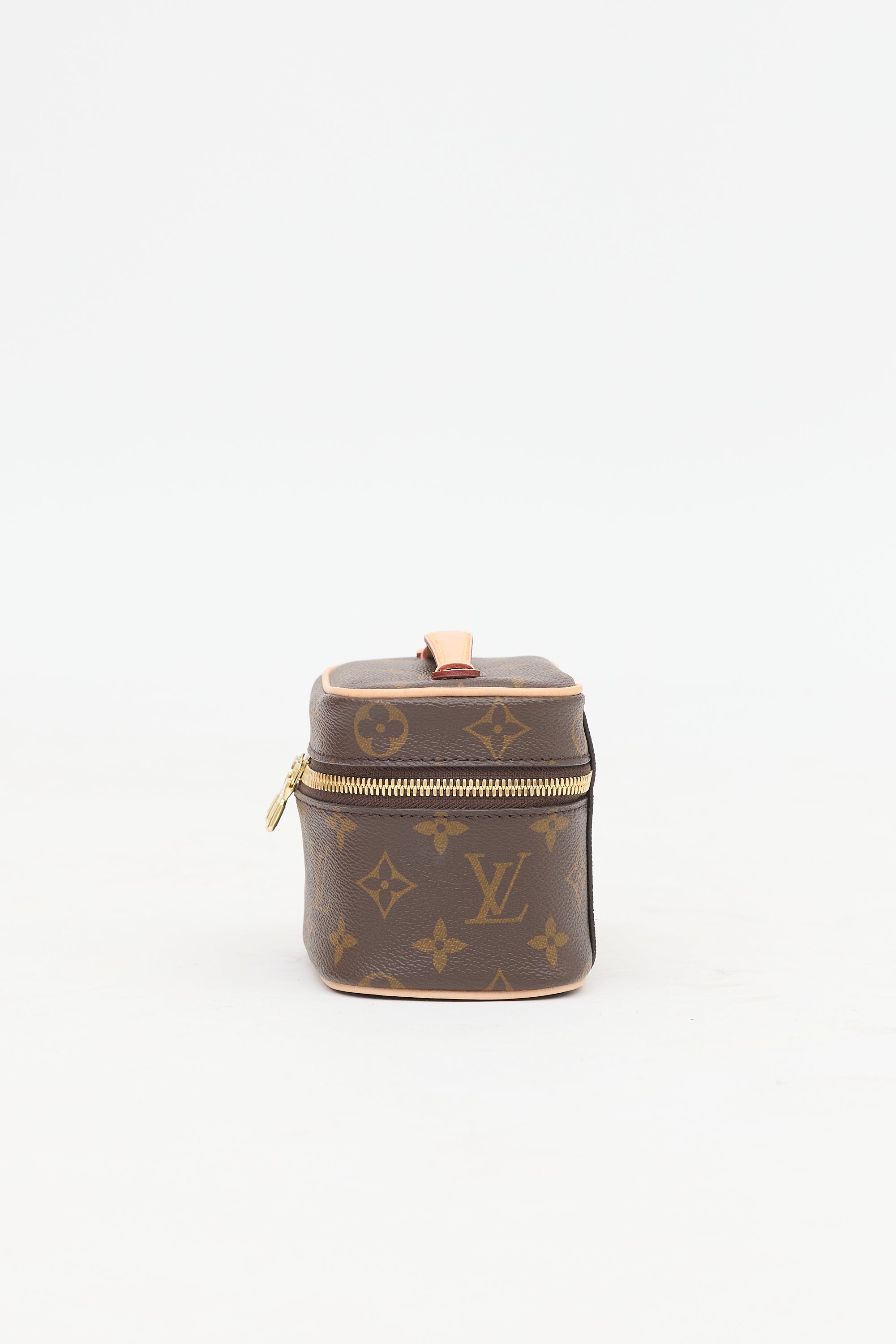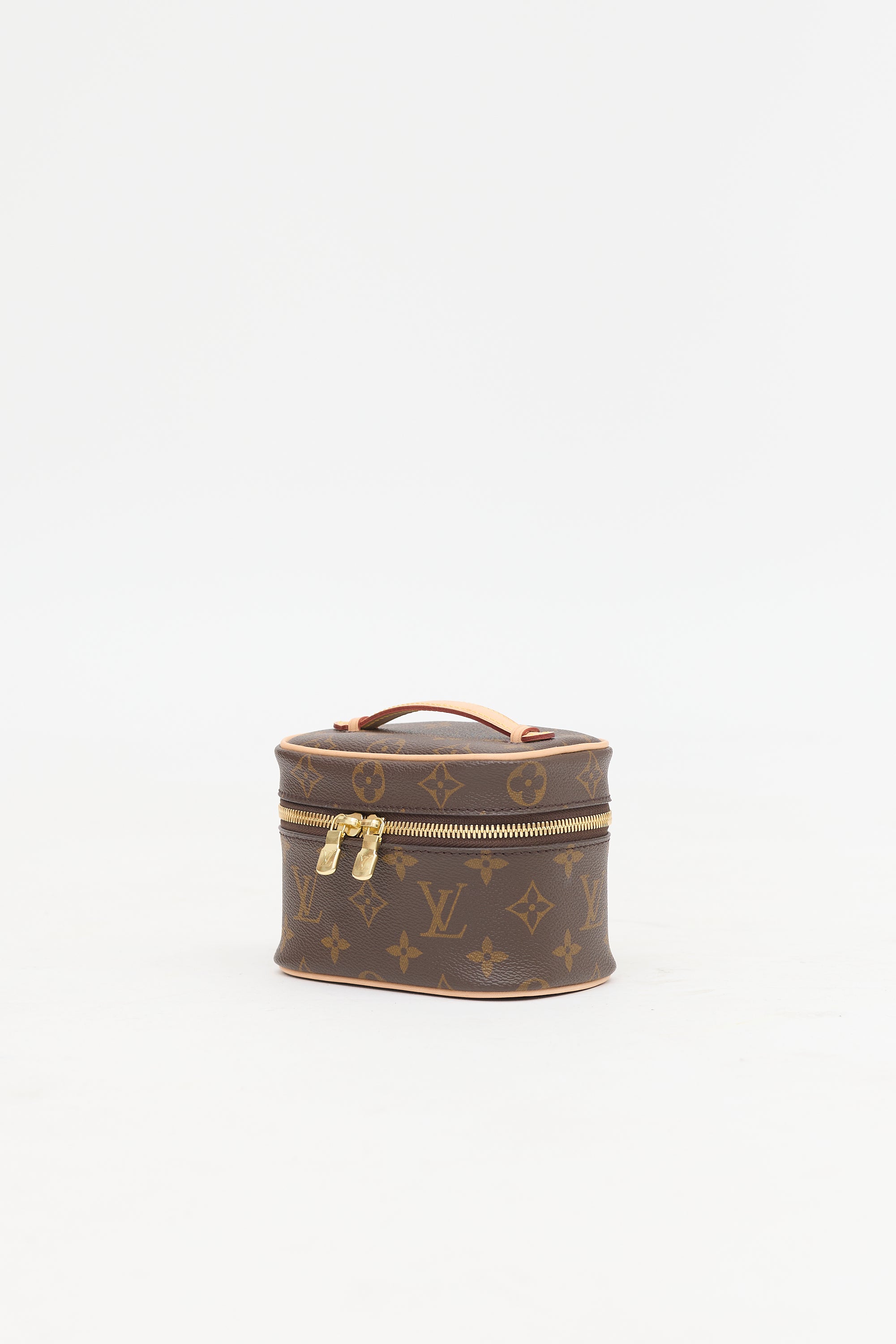 Pre-owned Louis Vuitton brown monogram coated canvas Nice Nano vanity case featuring gold tone hardware, flat top handle, zip around closure, and single lined compartment. Comes with original dust bag and box.