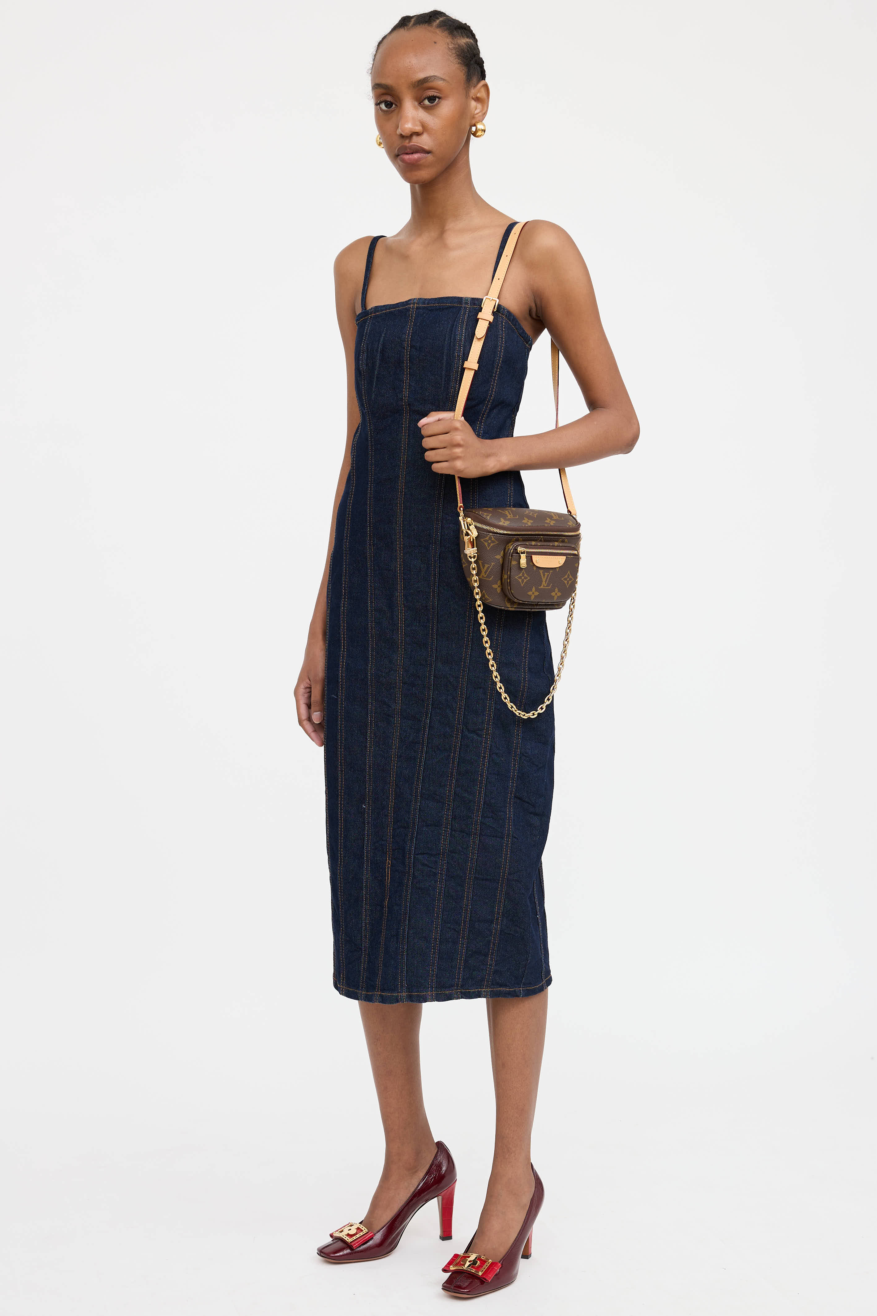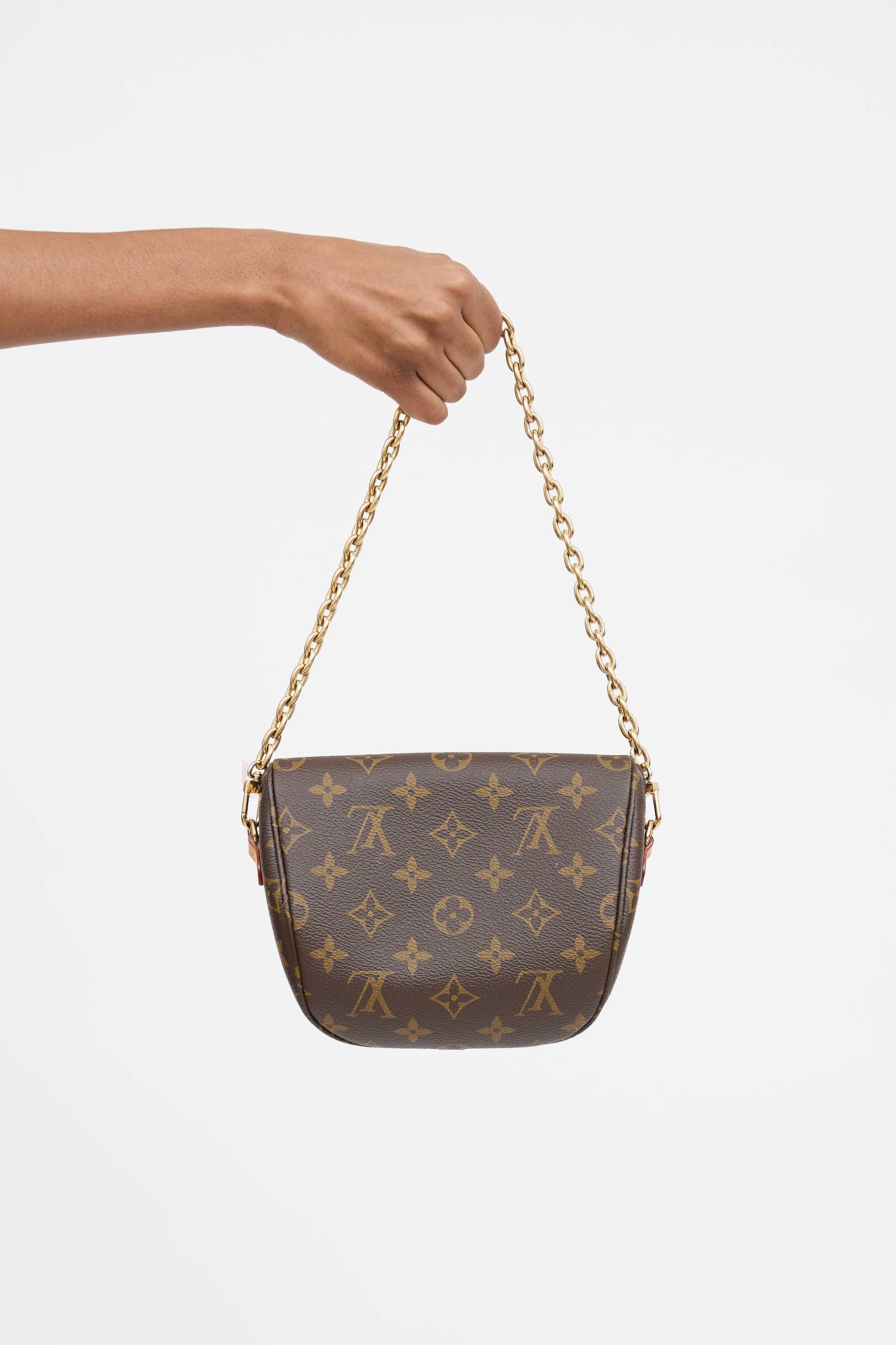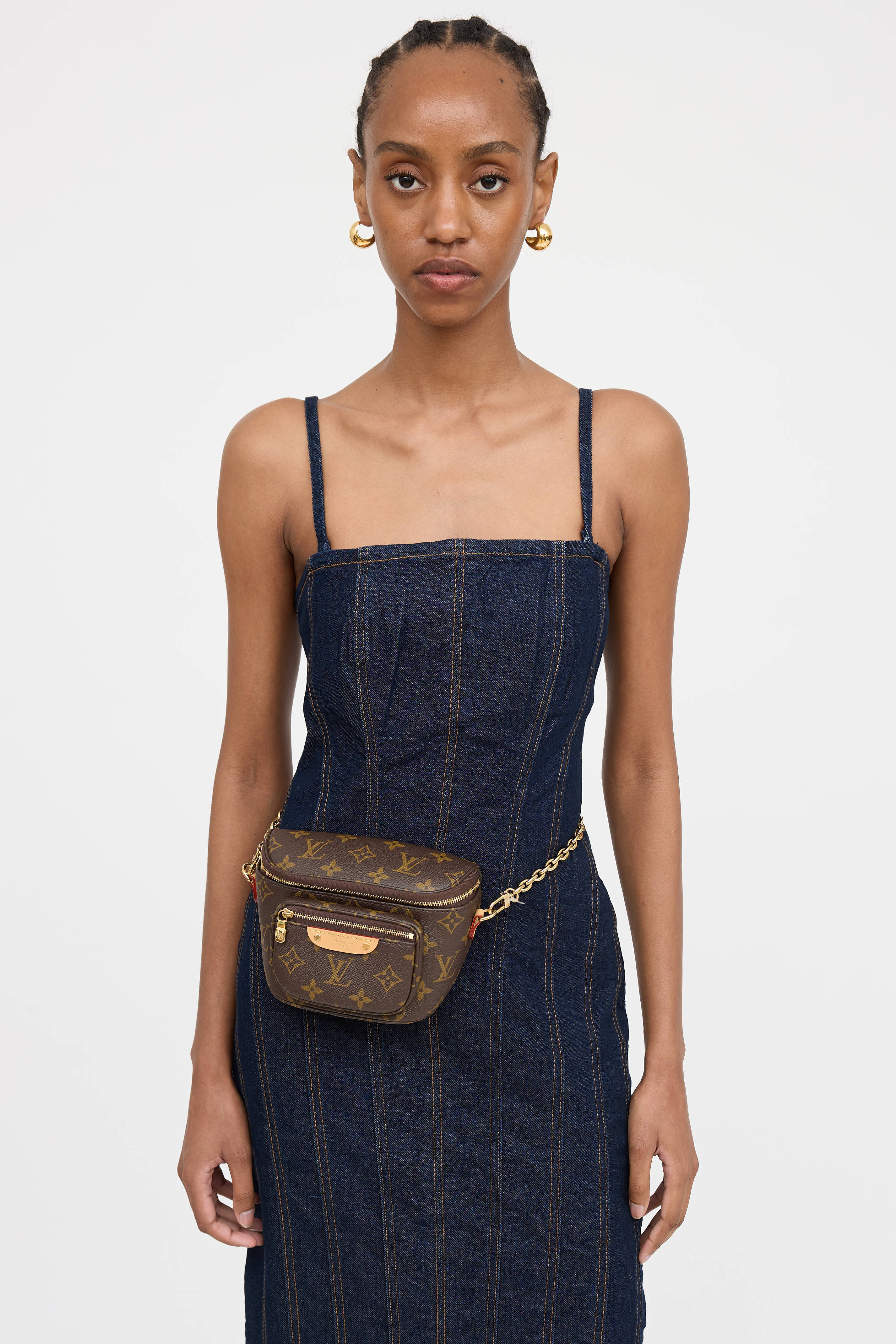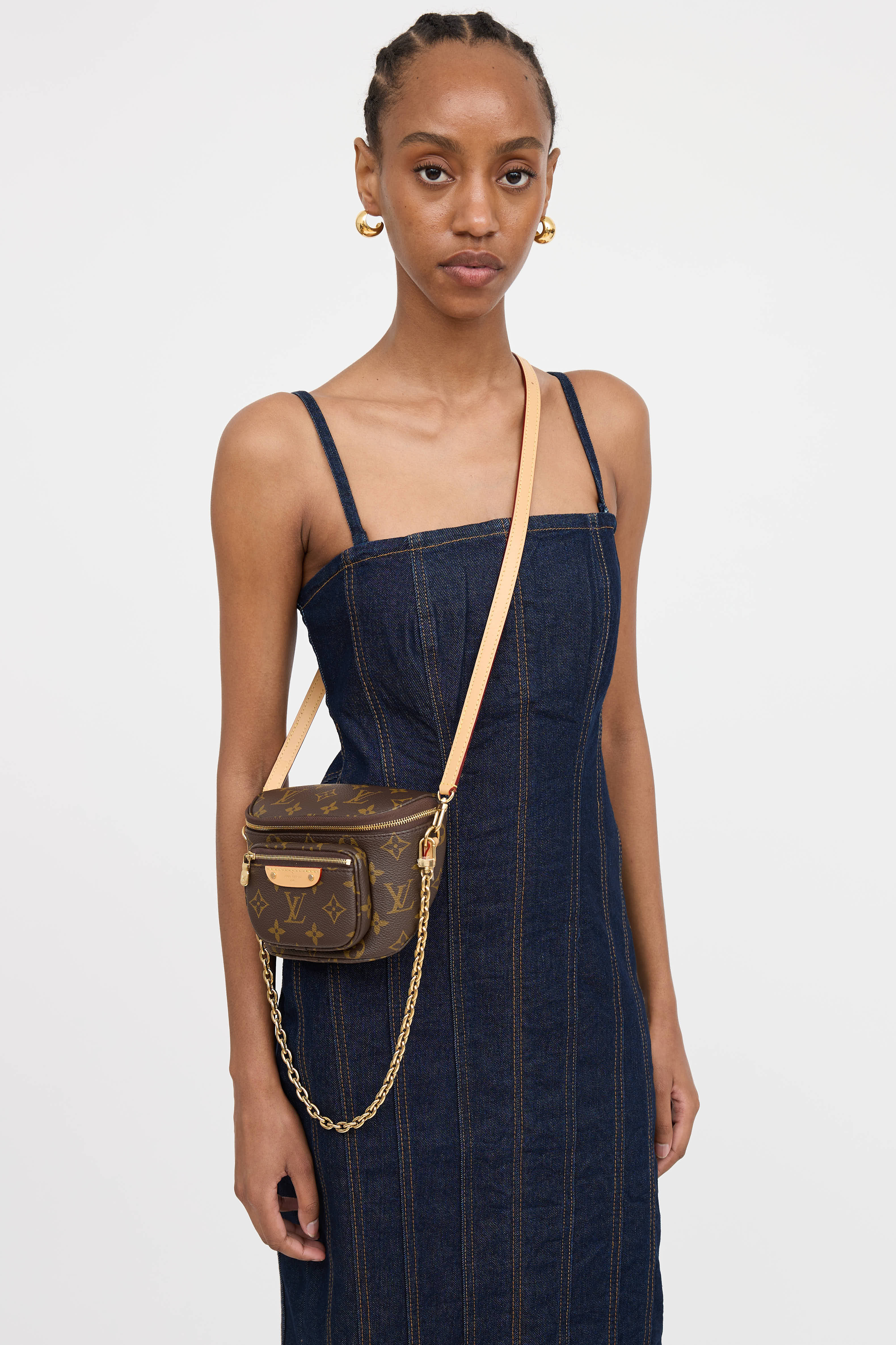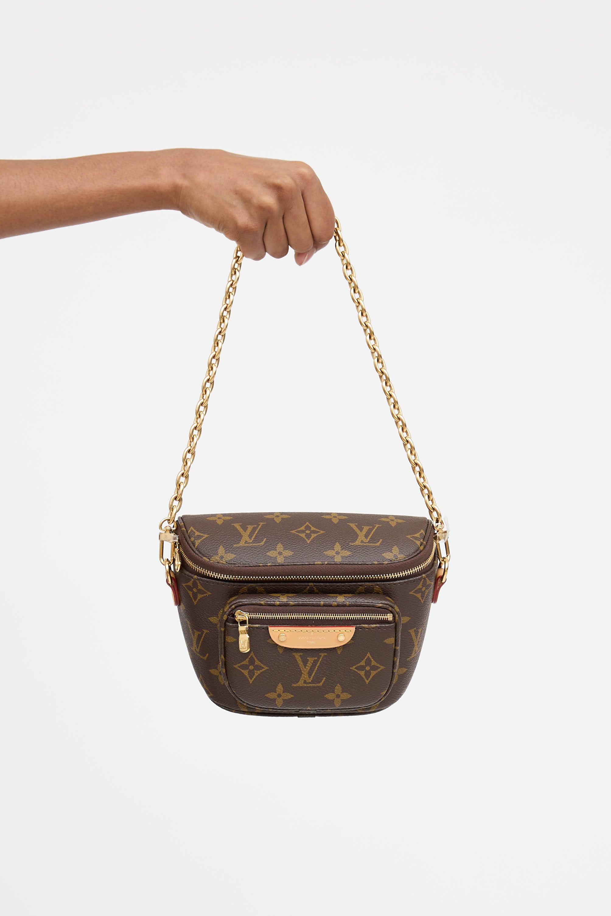 Pre-owned Louis Vuitton brown monogram mini Bumbag featuring detachable gold tone chain link, detachable and adjustable leather crossbody strap, zip pocket at front, and top zip closure with one main compartment.