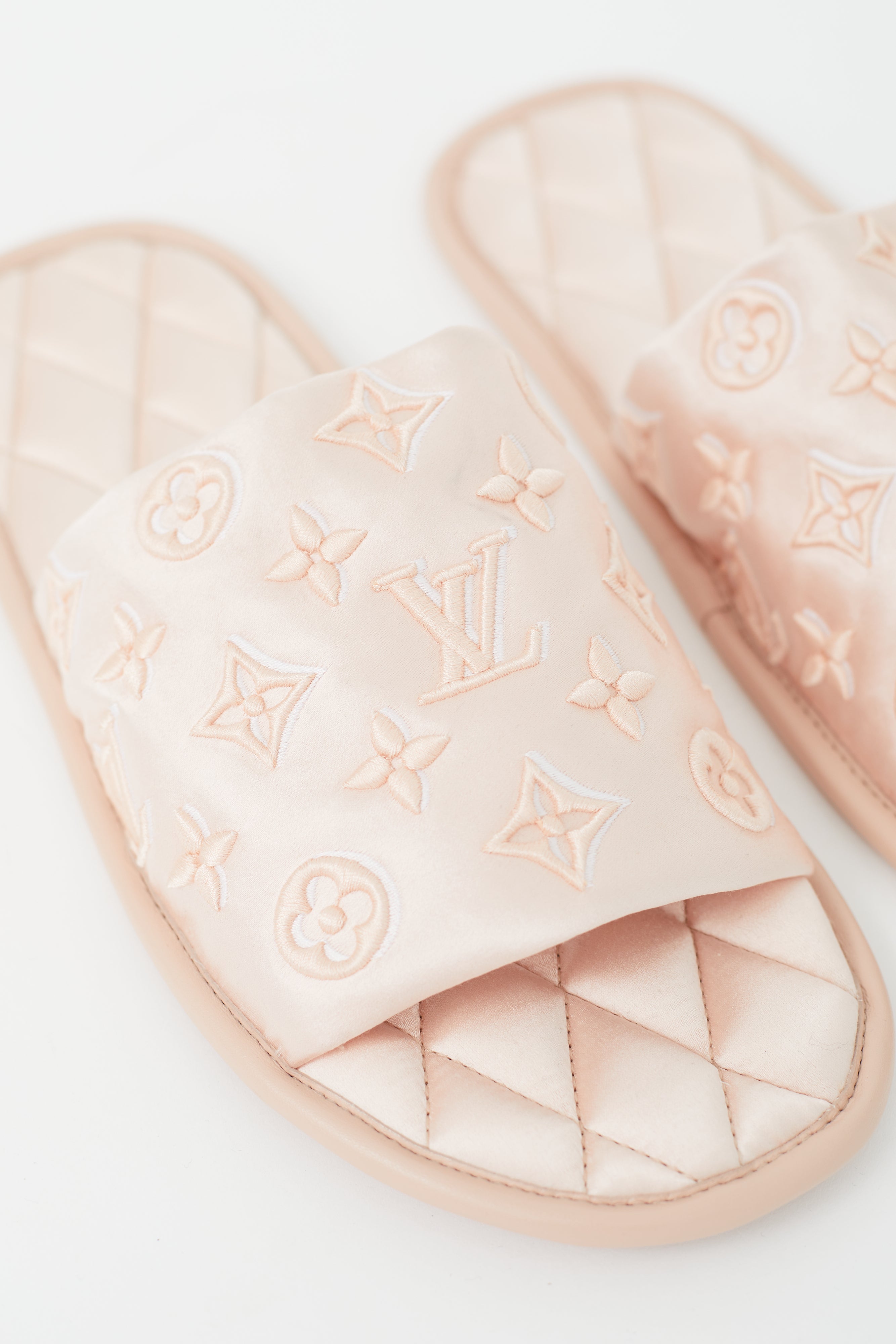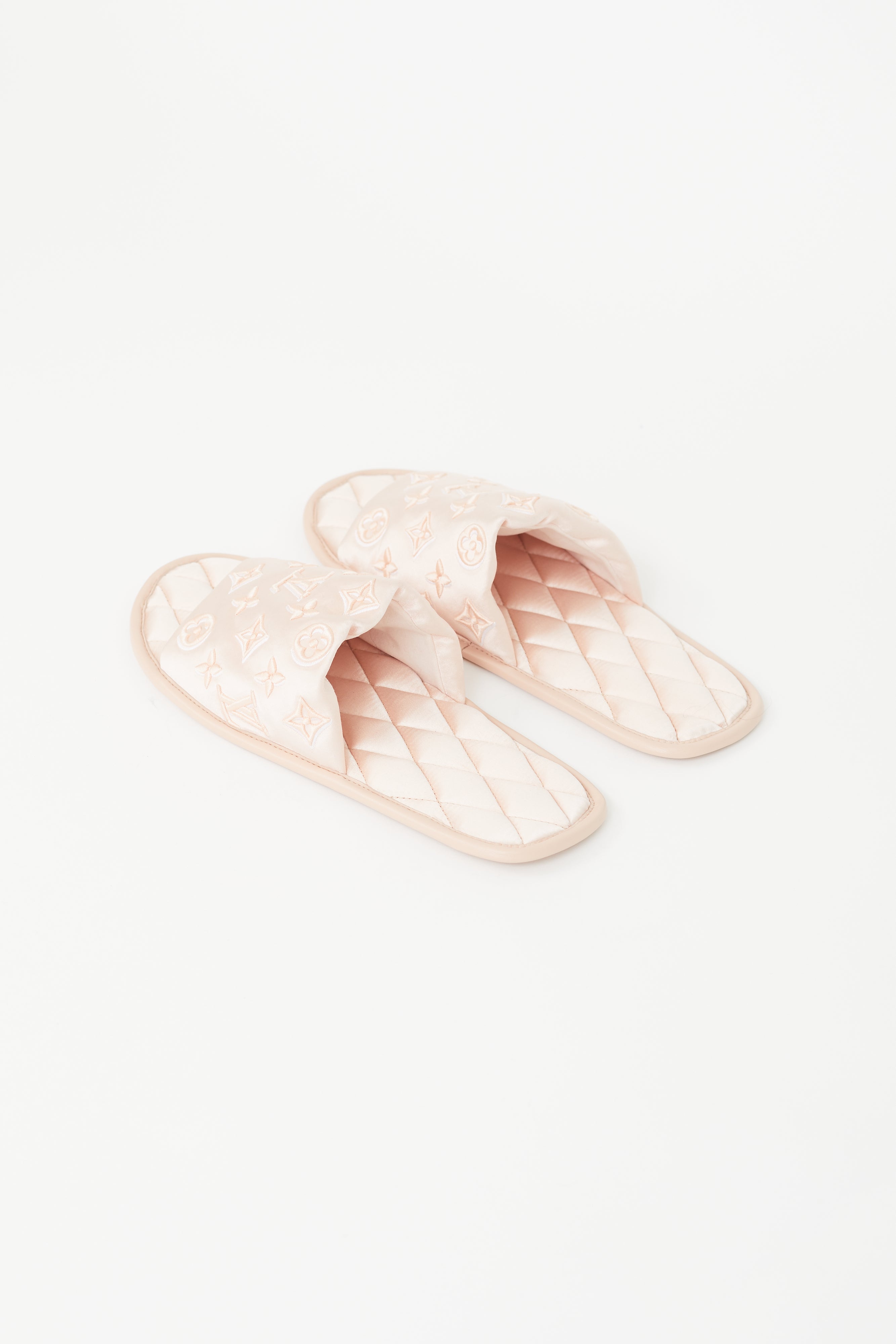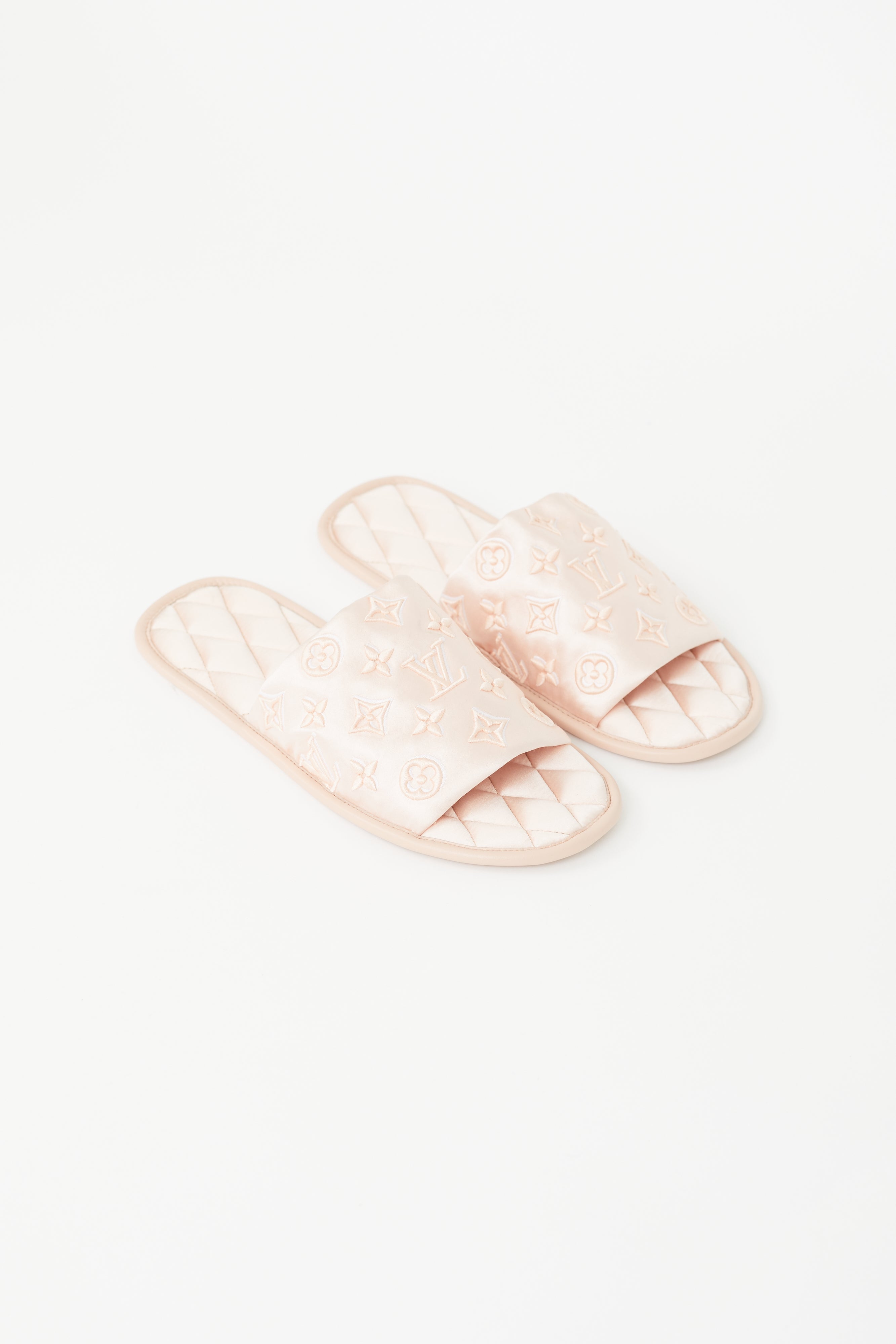 Pre-owned Louis Vuitton pink satin slippers featuring a tonal monogram throughout, open round toe, quilted insole, and leather outsole with gold embossed logo.