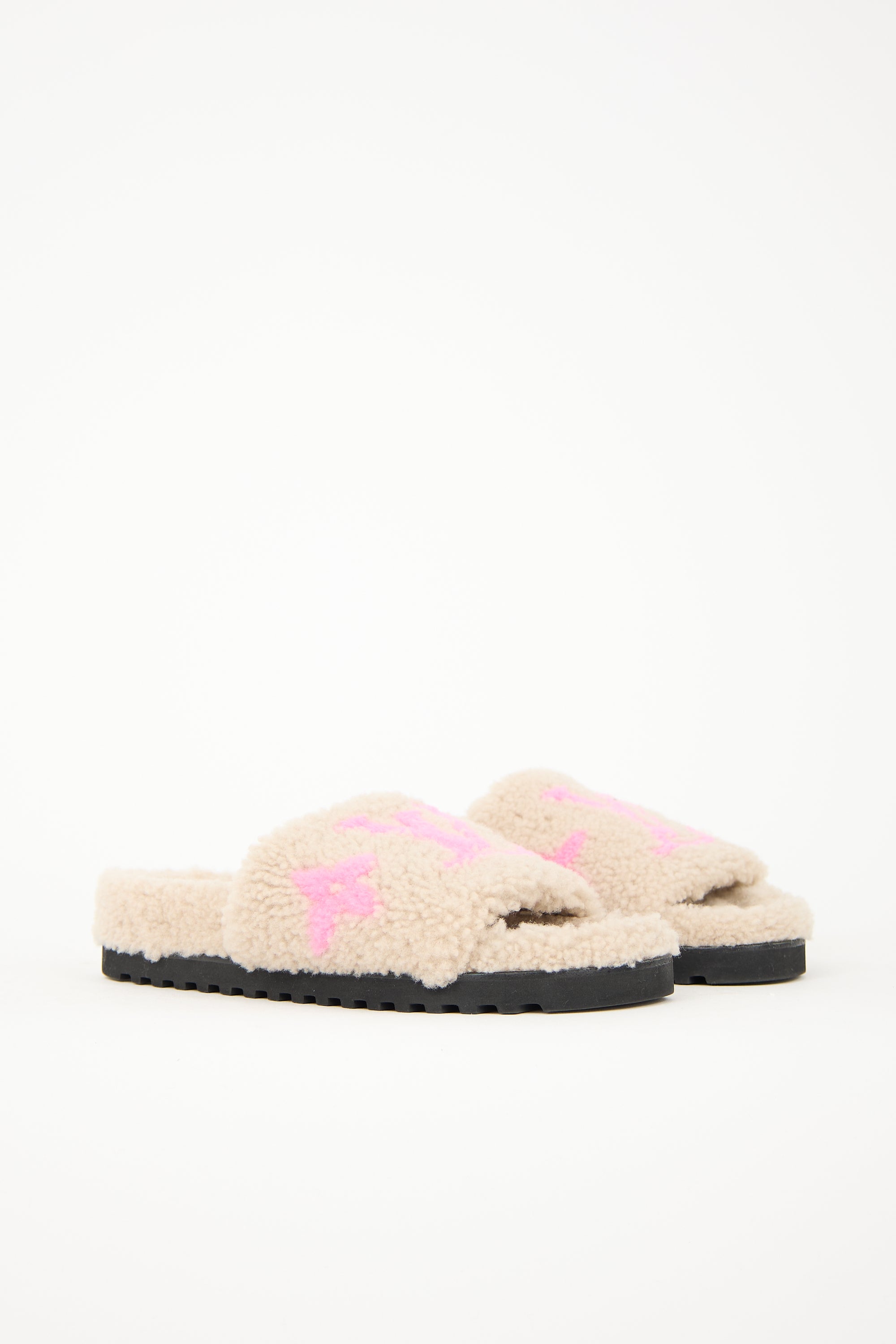 Pre-owned Louis Vuitton beige and pink shearling Bom Dia slides featuring open rounded toe, logo strap, and rubber outsole.