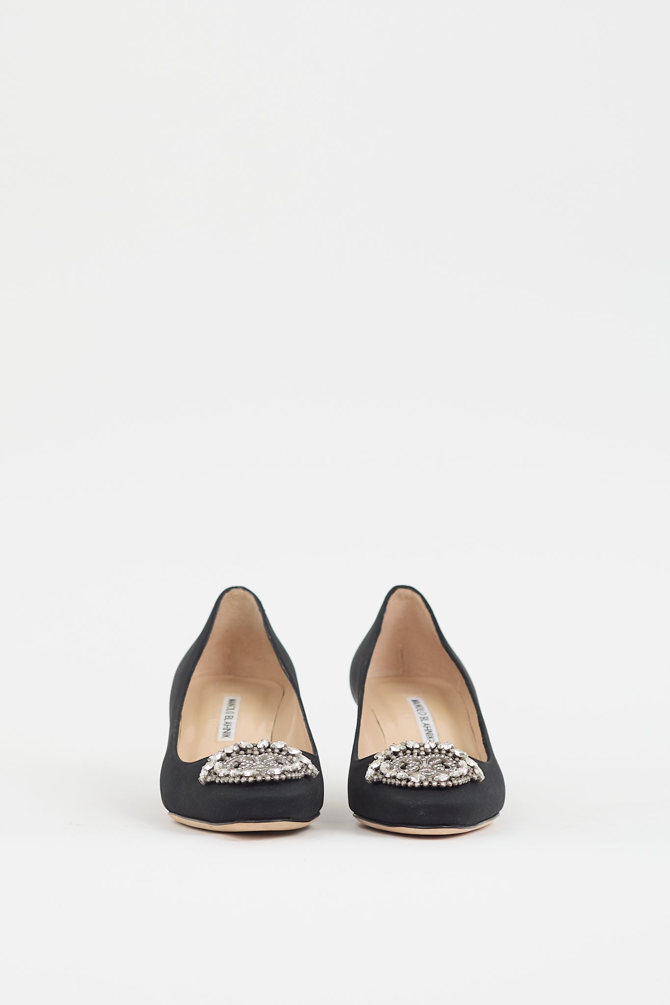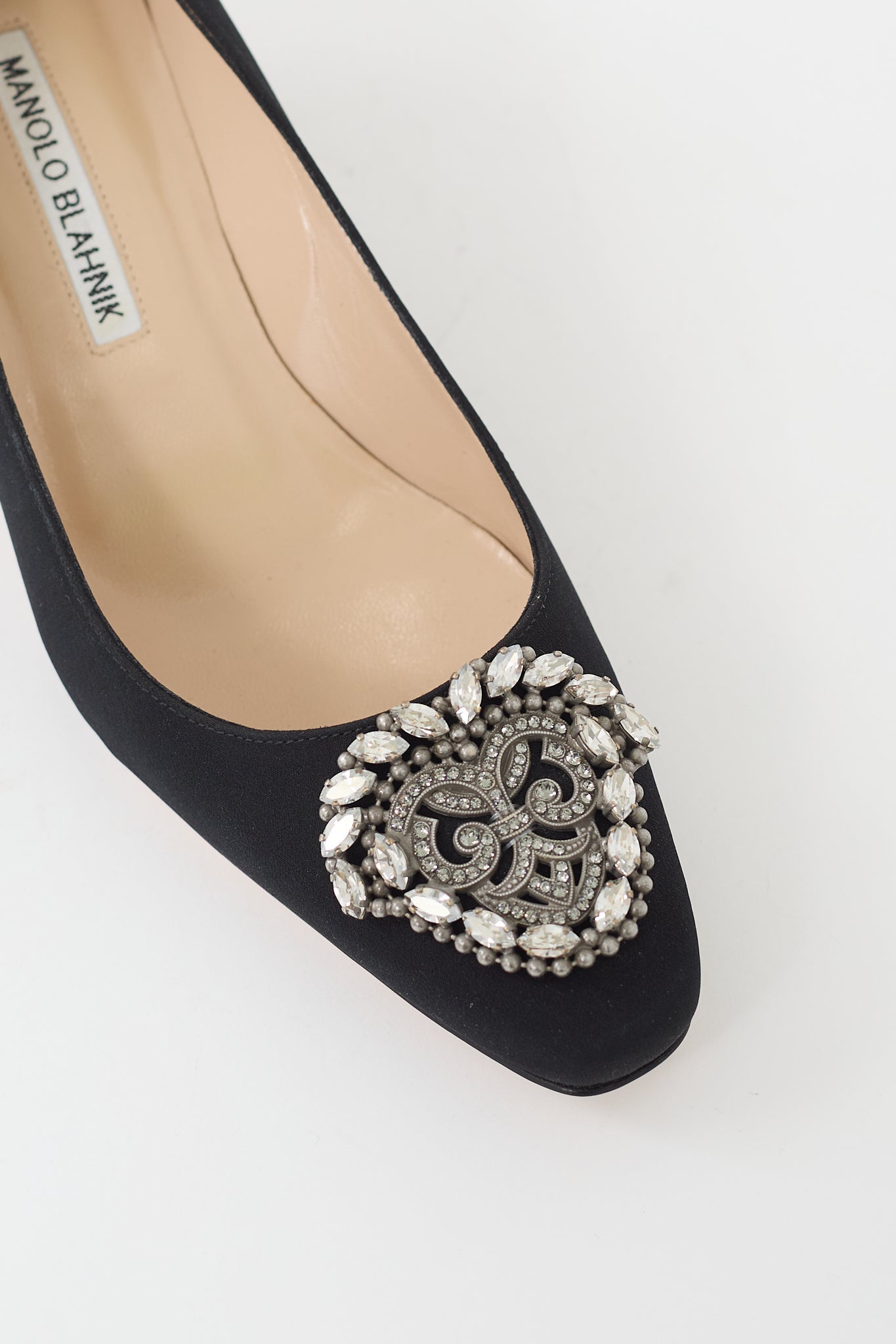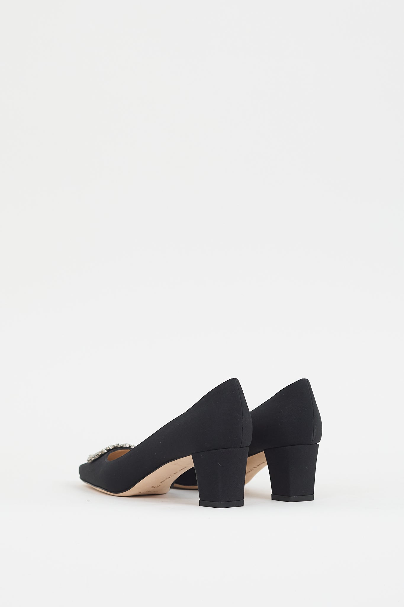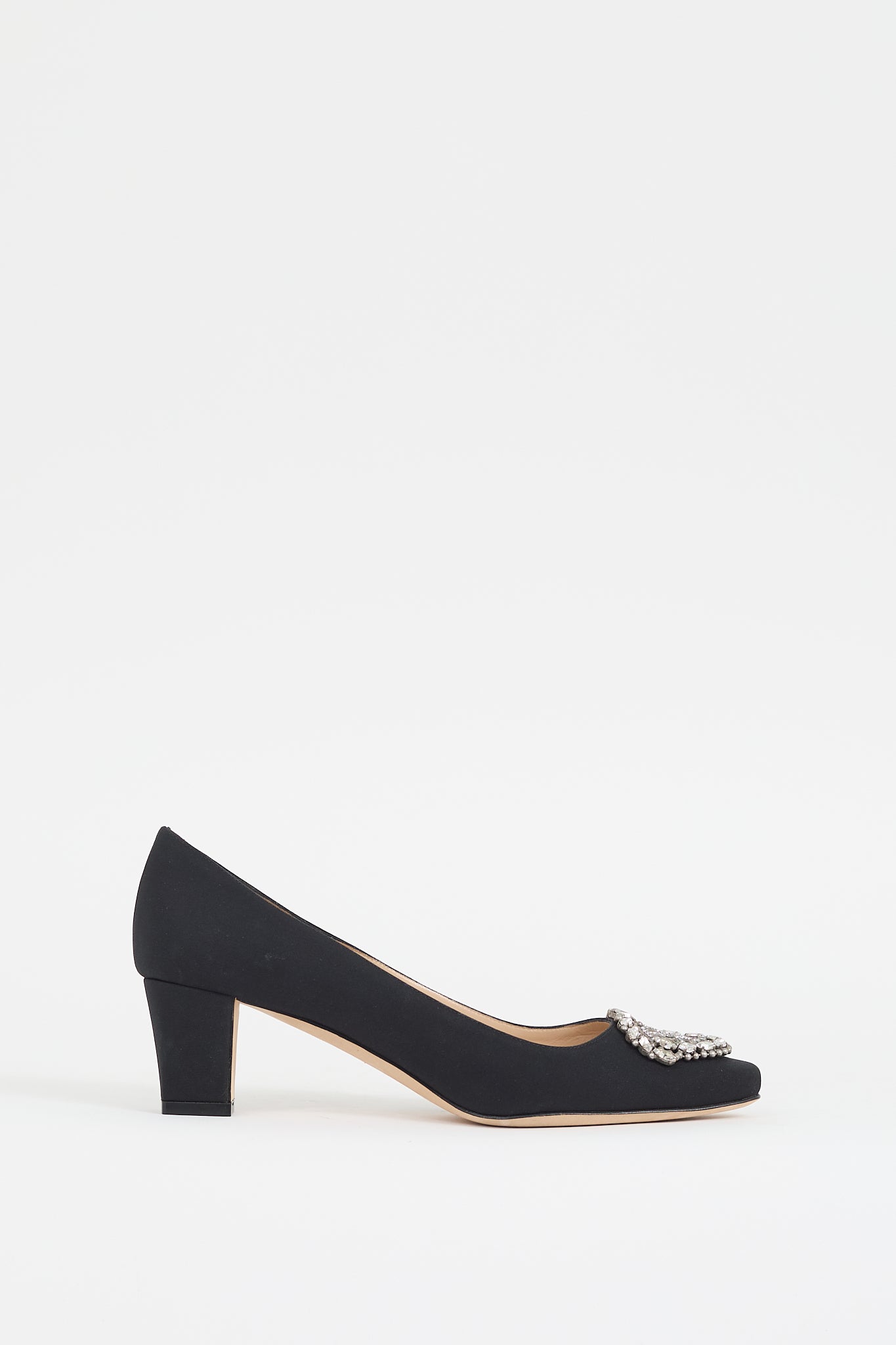 Pre-owned Manolo Blahnik black Okkato pumps featuring Crêpe De Chine upper, elongated square toe, jewel buckle at toe, slip on entry, and covered block heel.