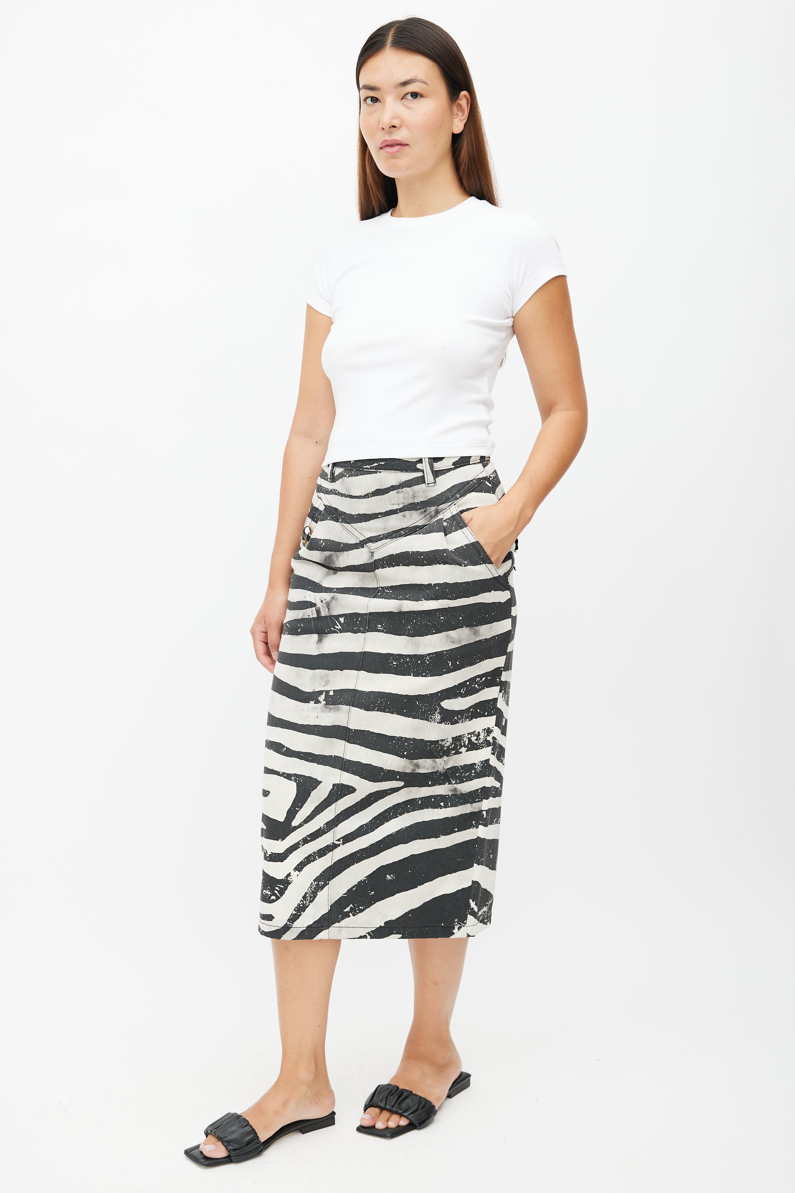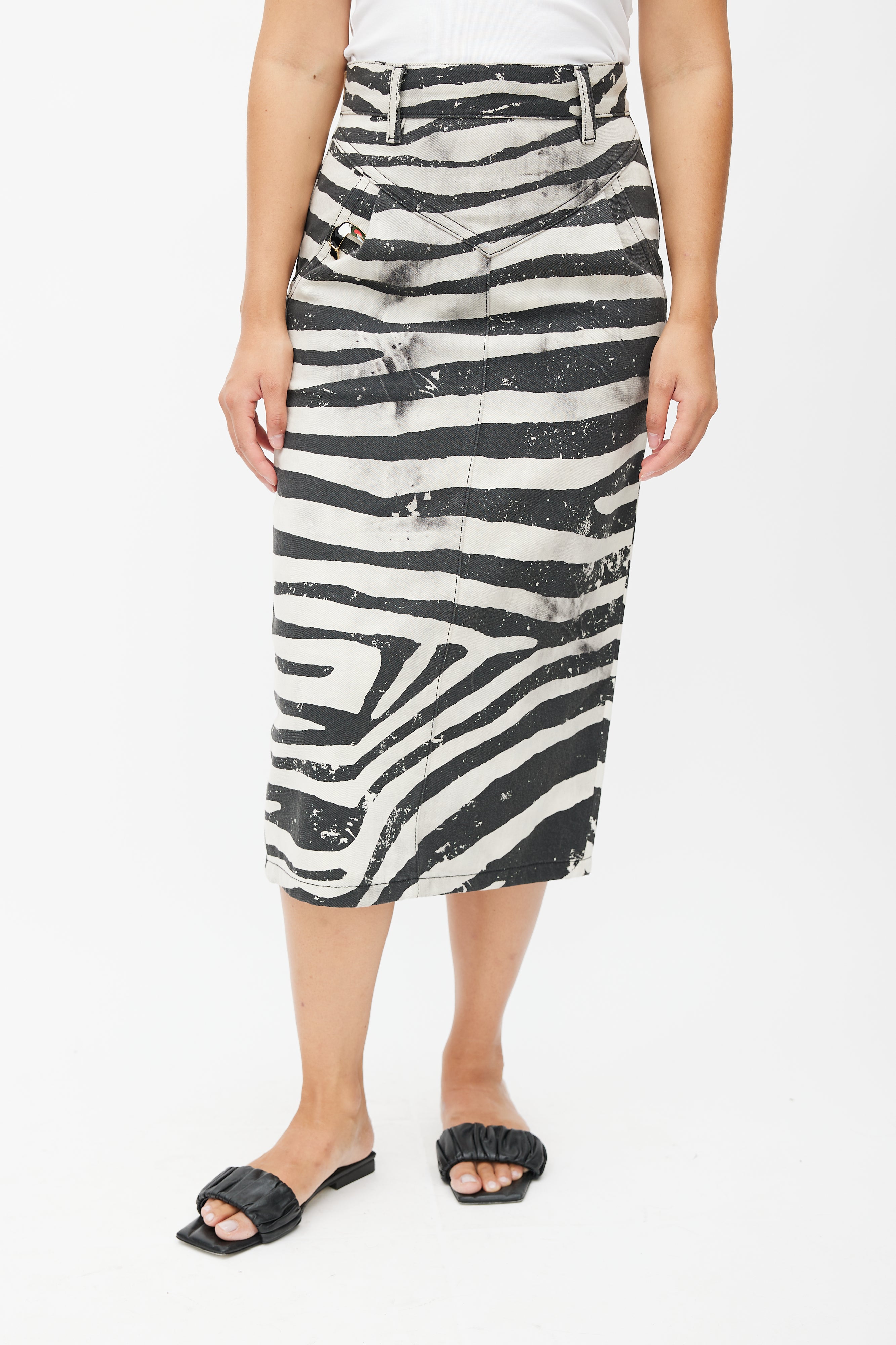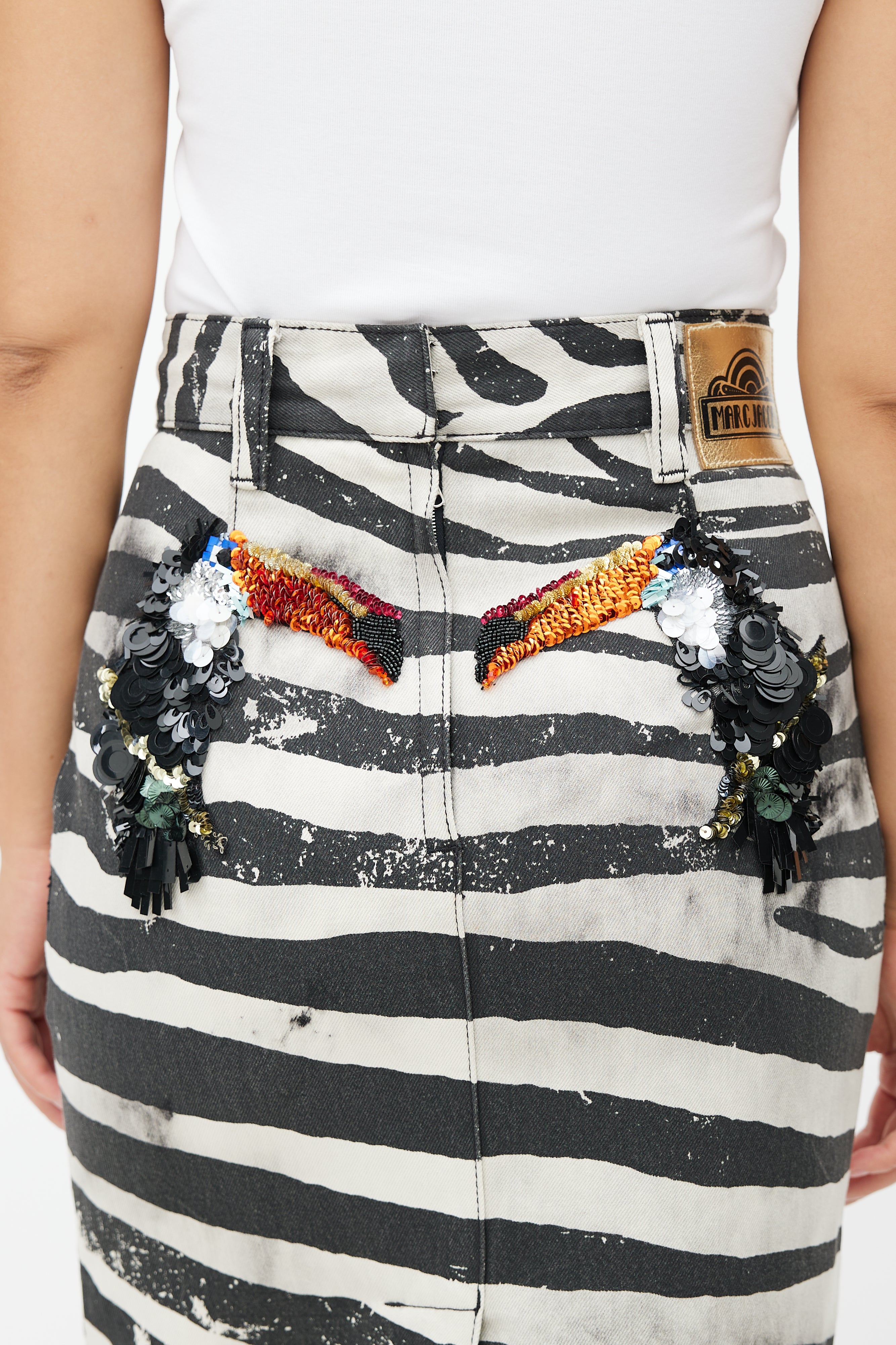 Pre-owned Marc Jacobs black skirt featuring a zebra print throughout, two slash pockets at hip with removable pin, slit at hem, embossed leather logo tab at waist, and multicolour Toucan sequin detail at back with zip closure.