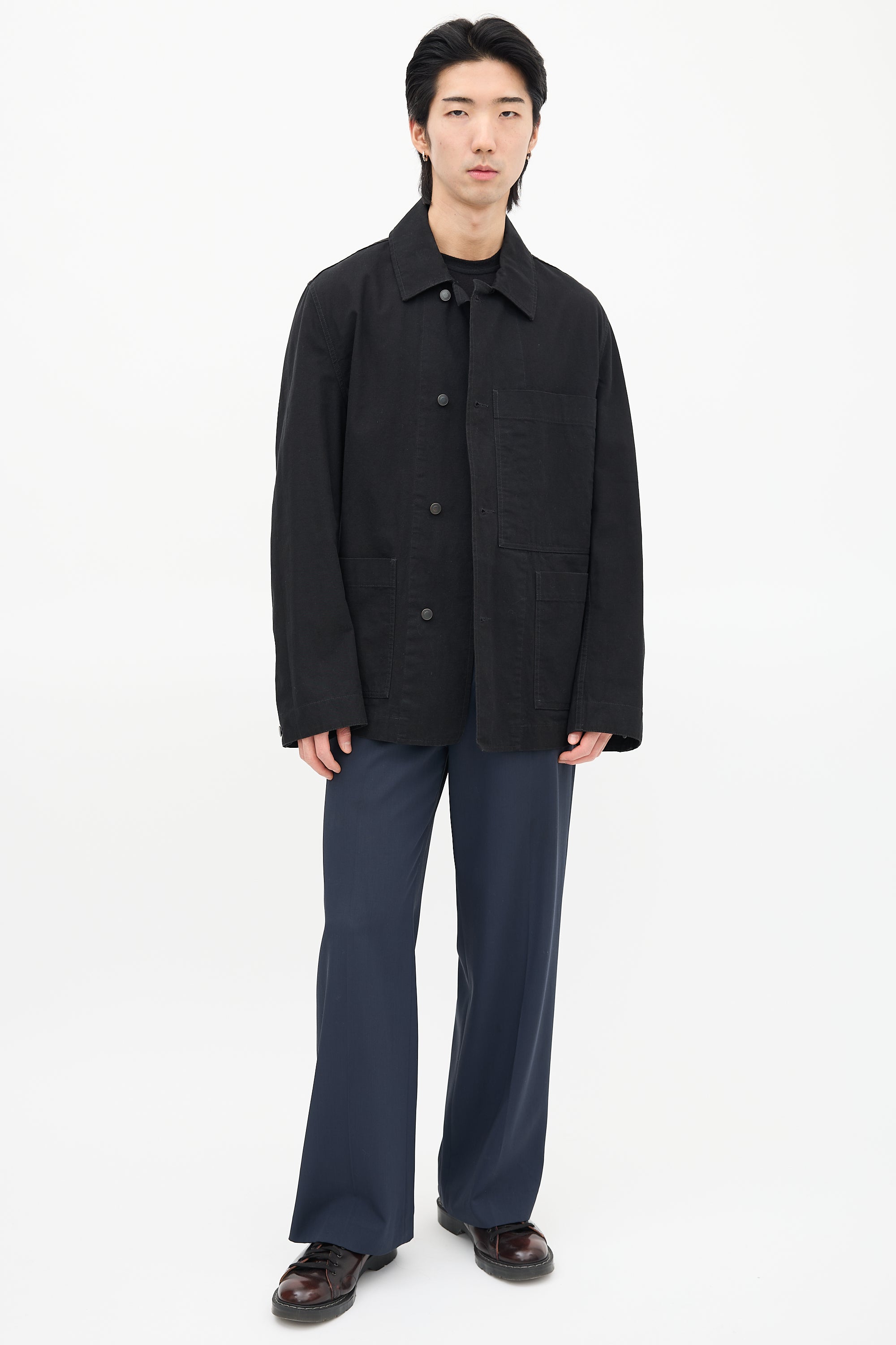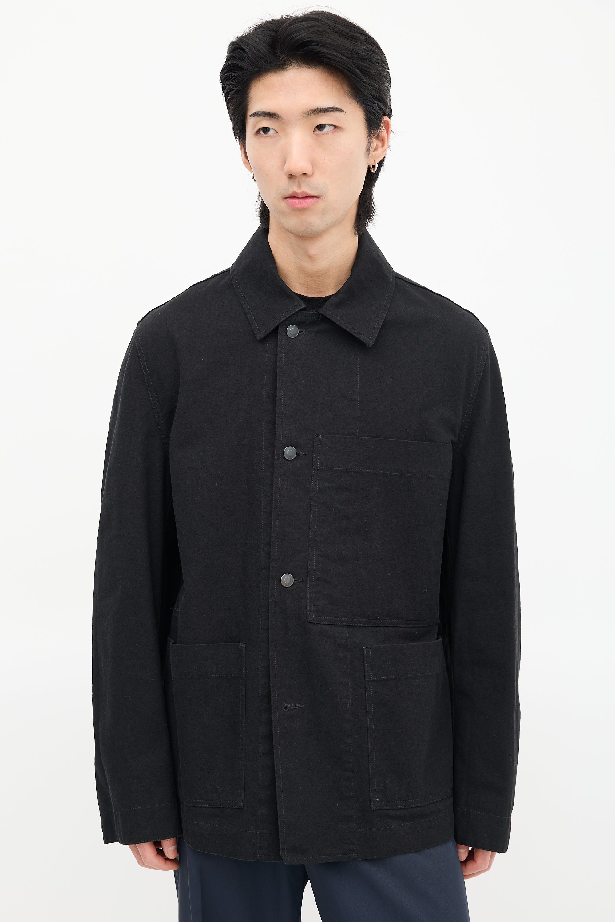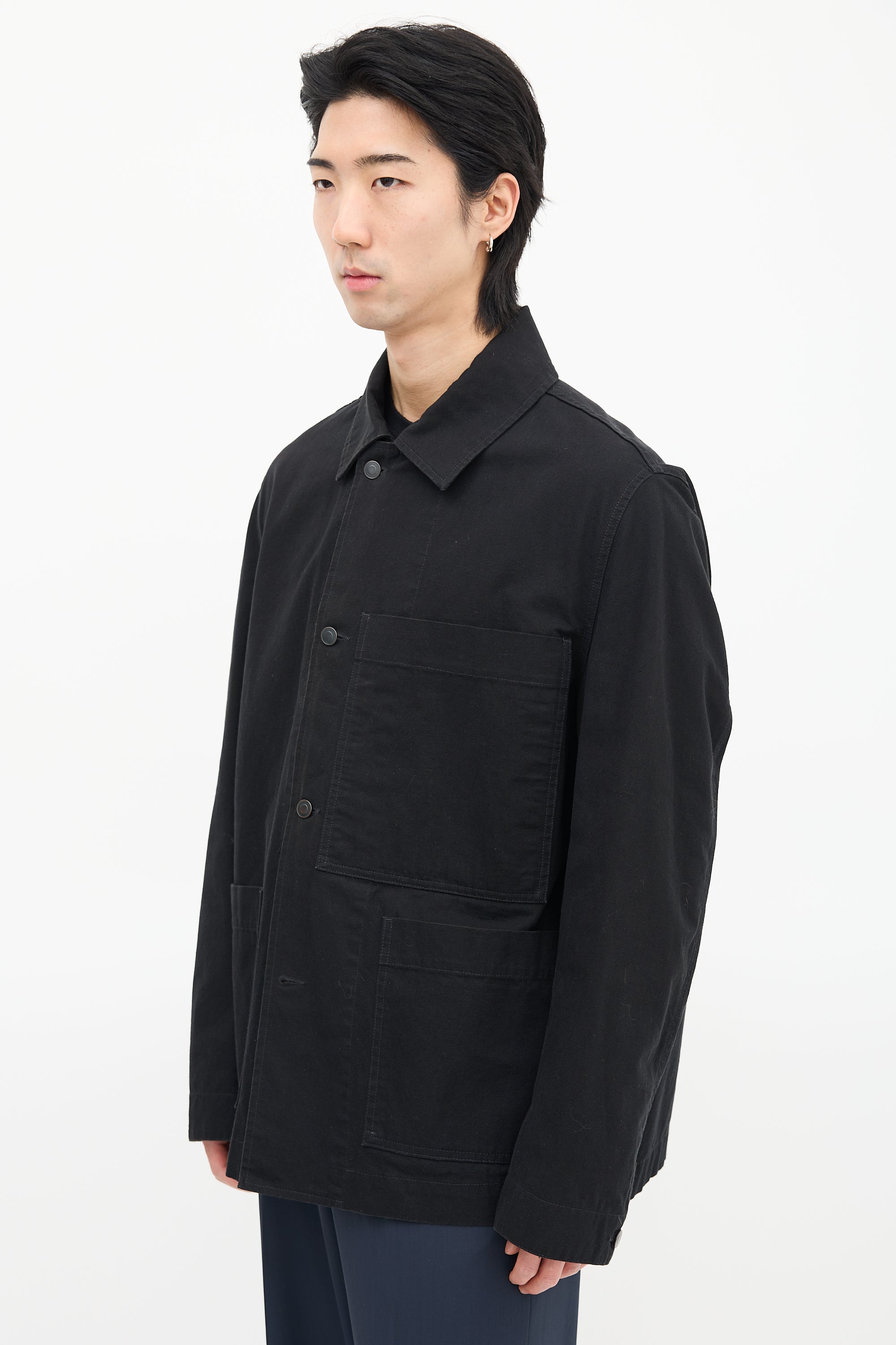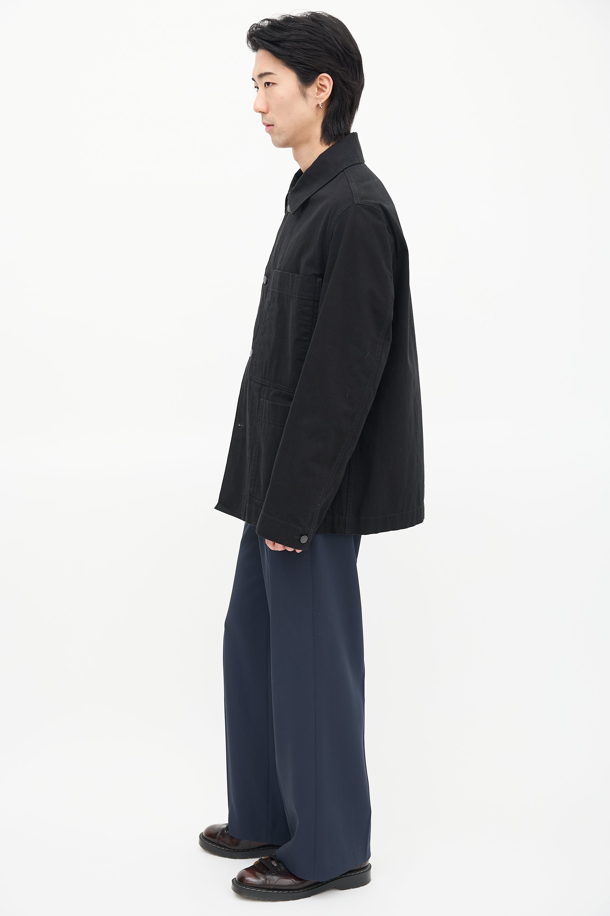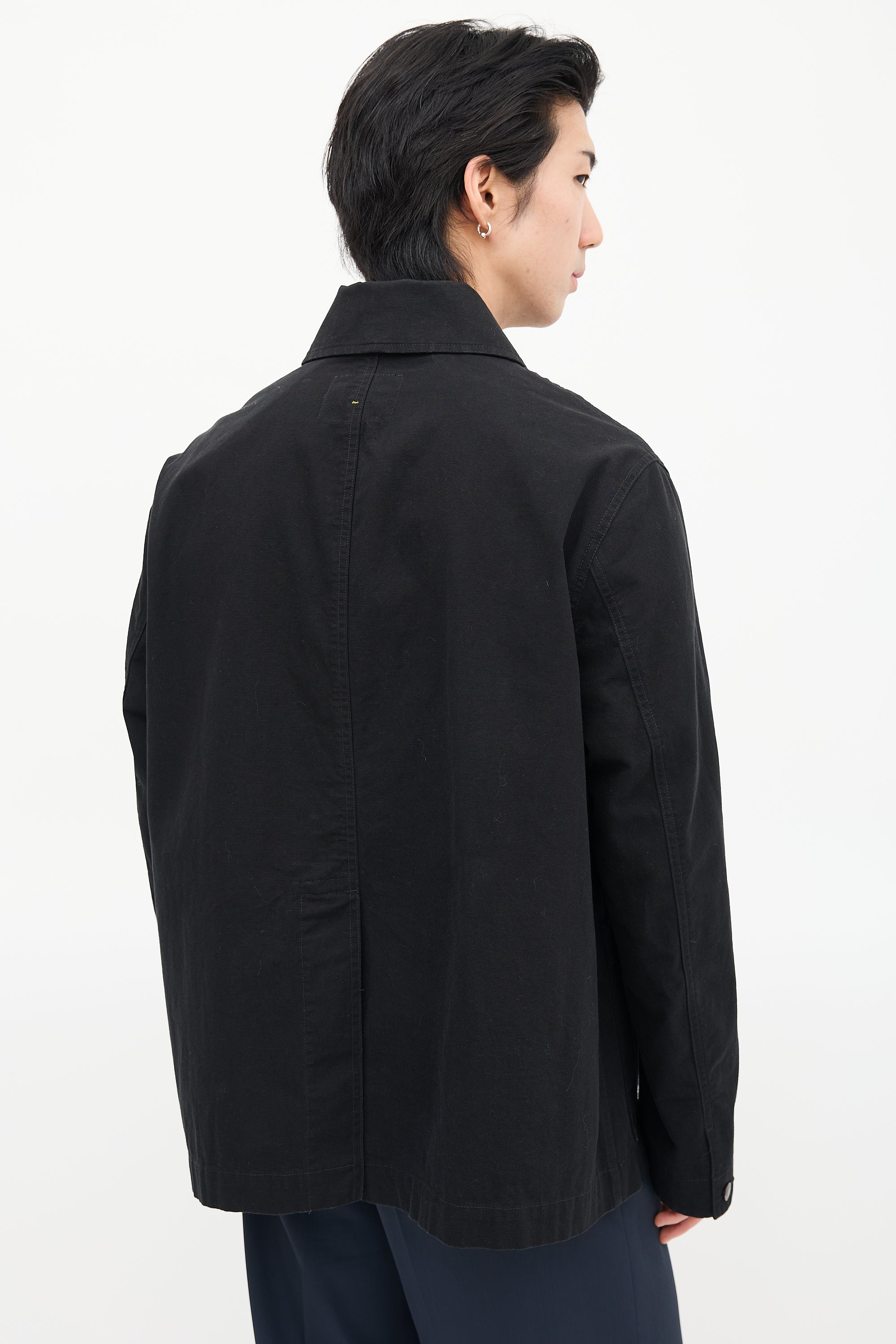 Pre-owned MHL by Margaret Howell black canvas work jacket featuring spread collar, button up front, three patch pockets at front, buttoned cuffs, and back vent. Unlined.