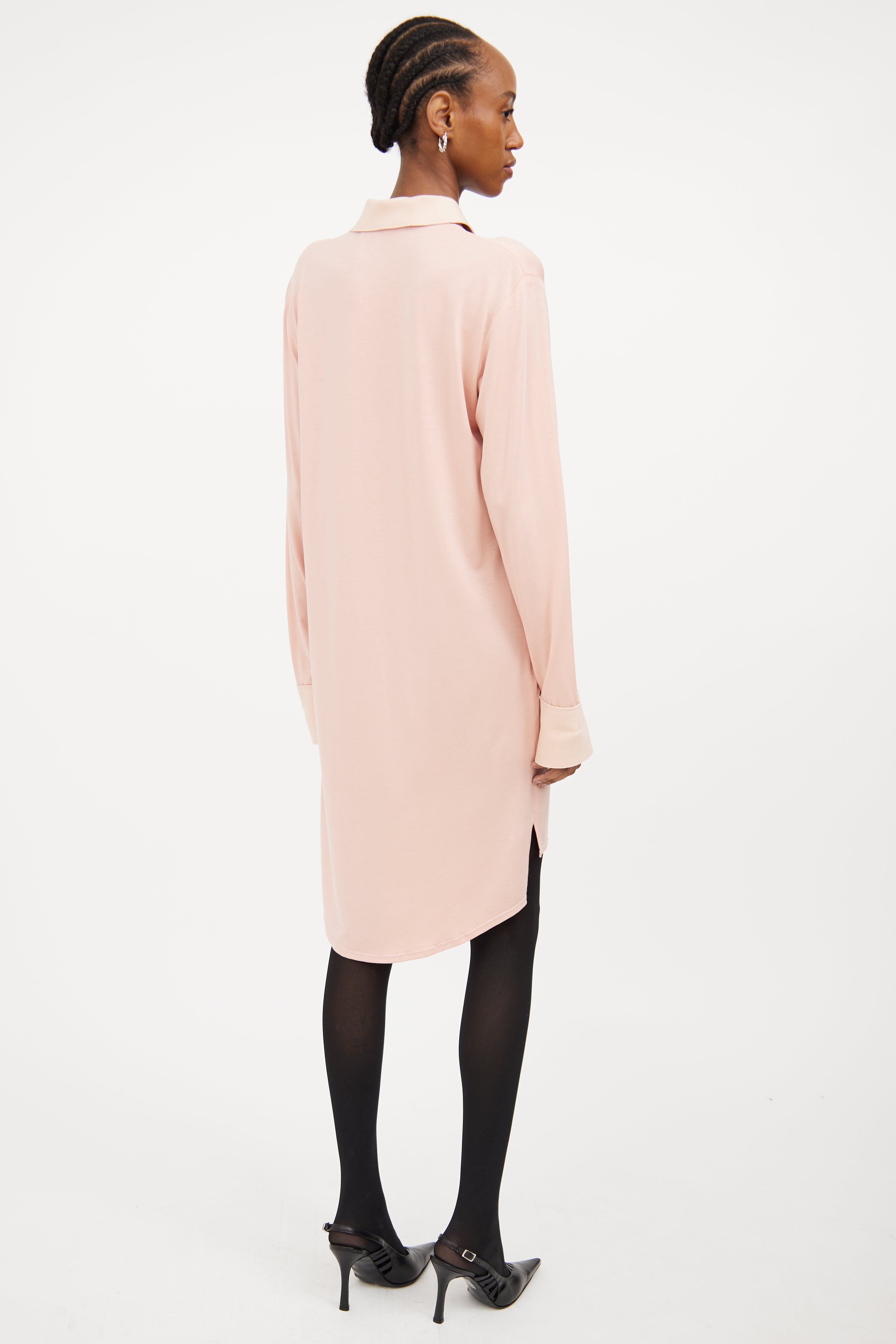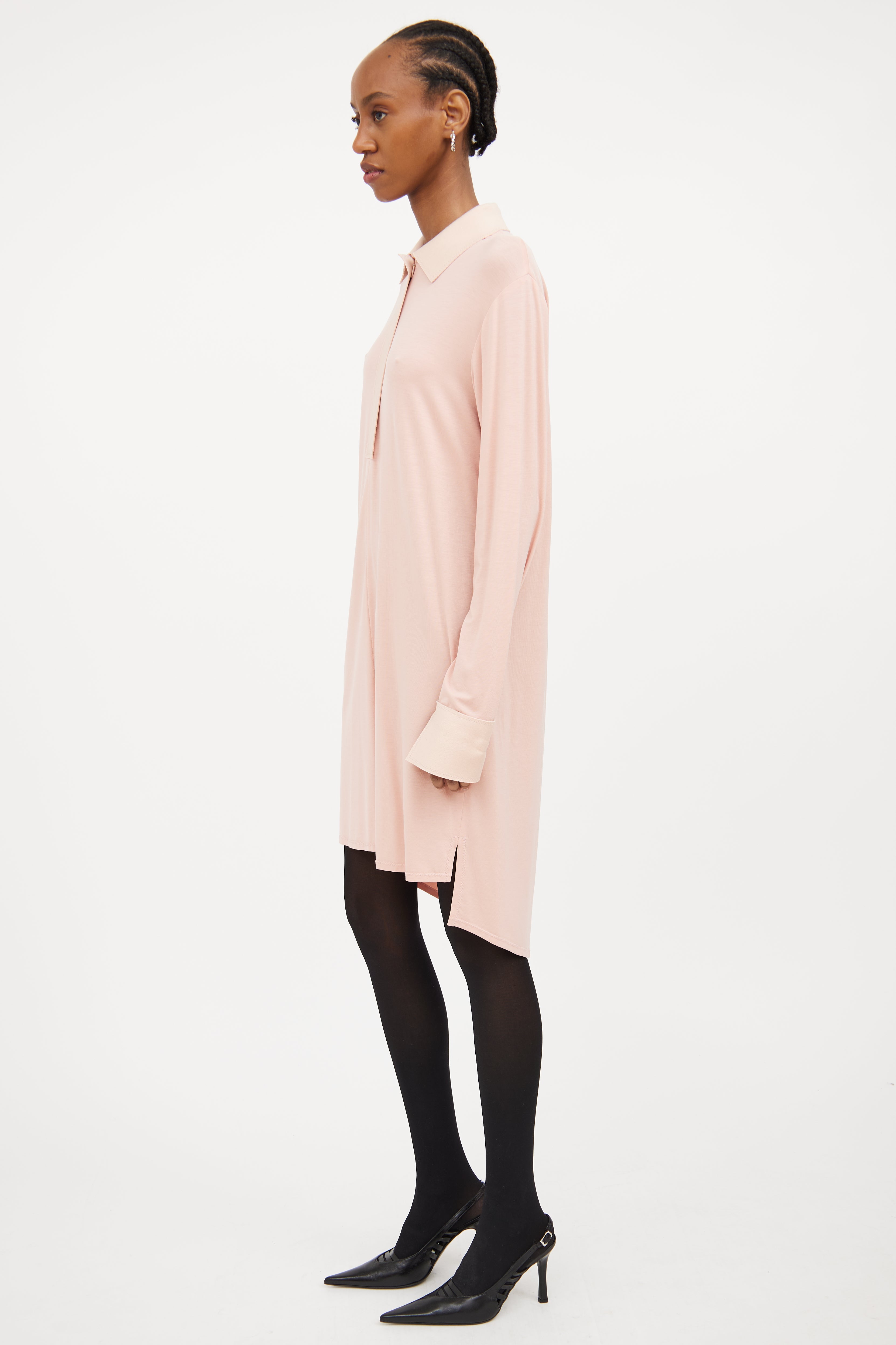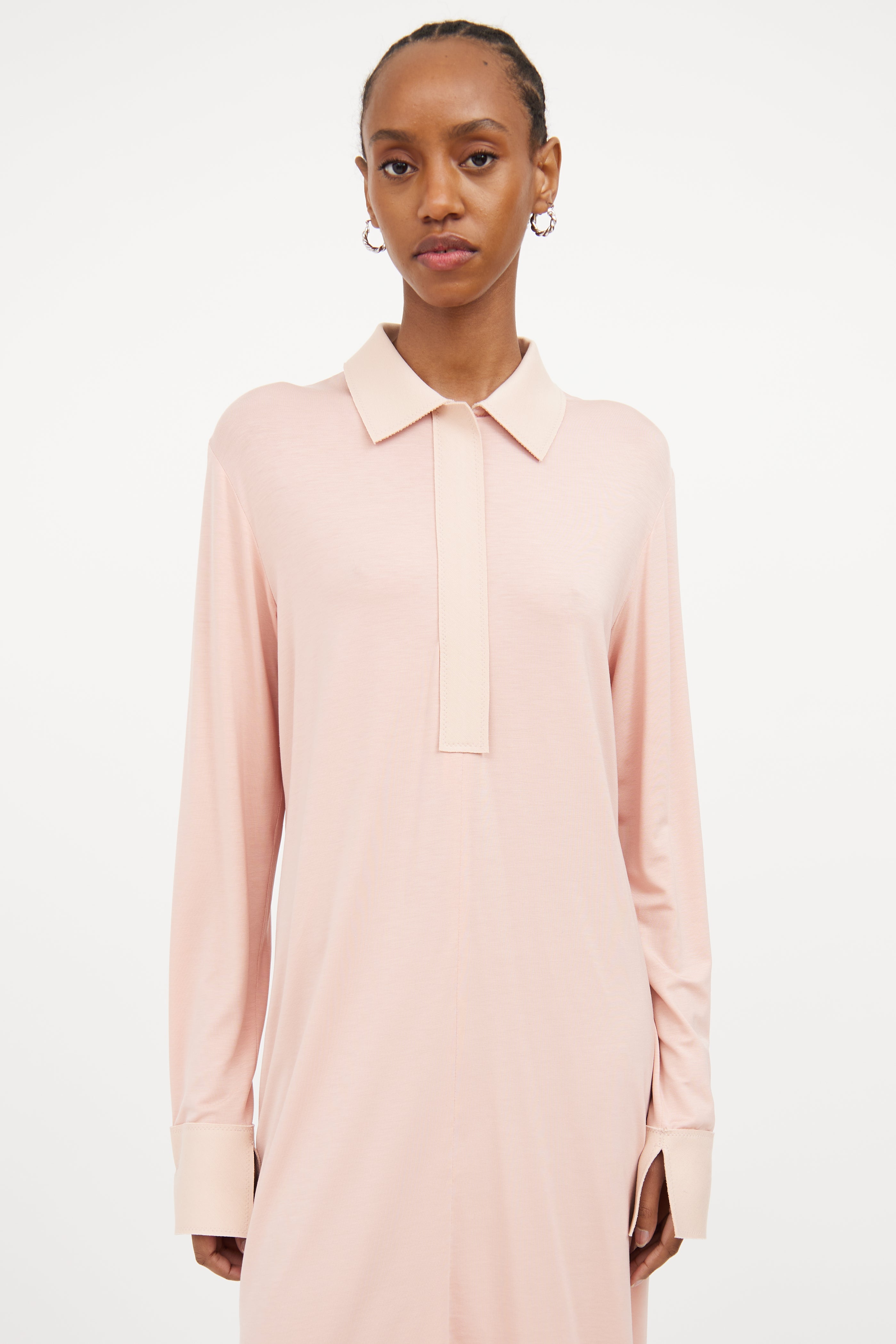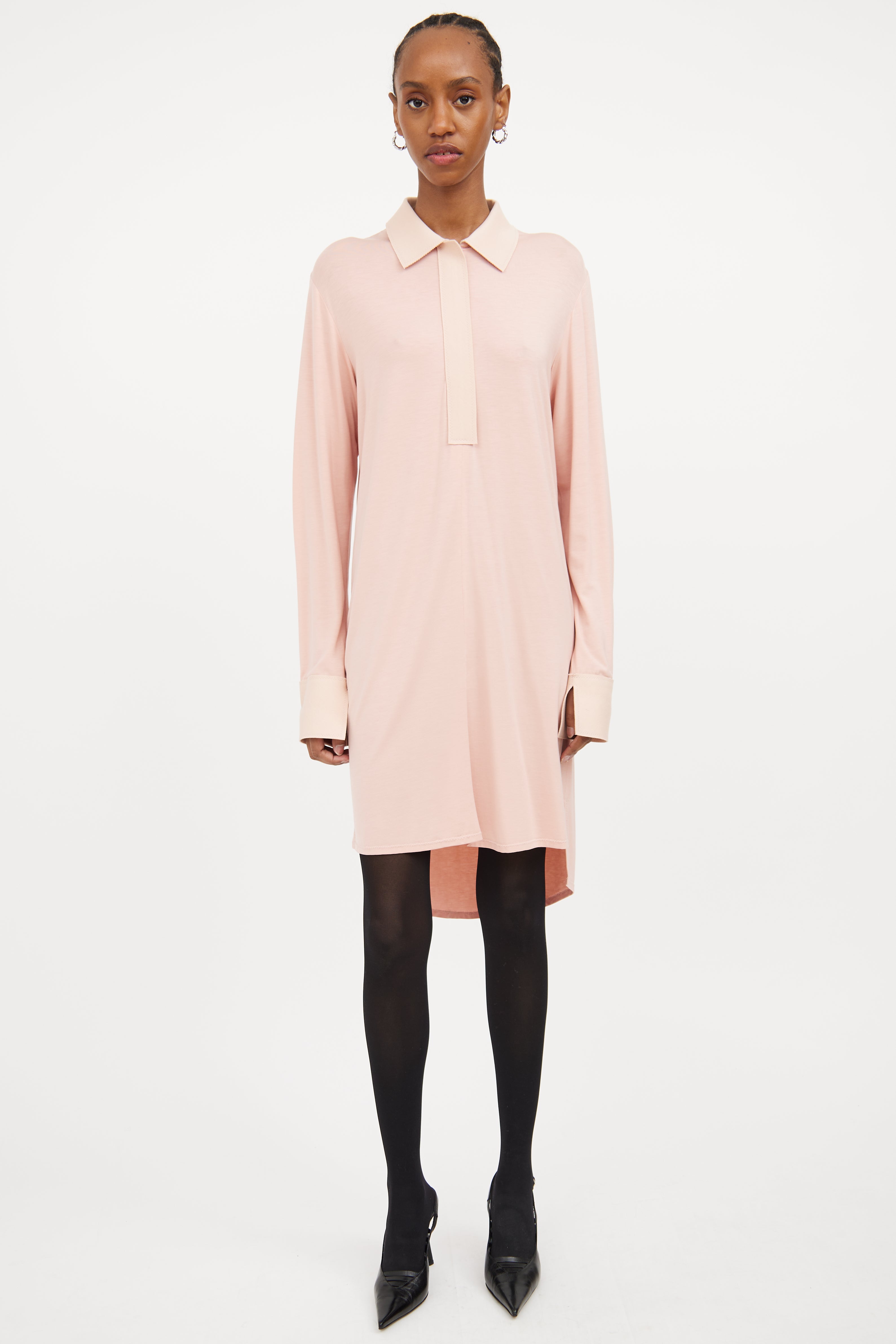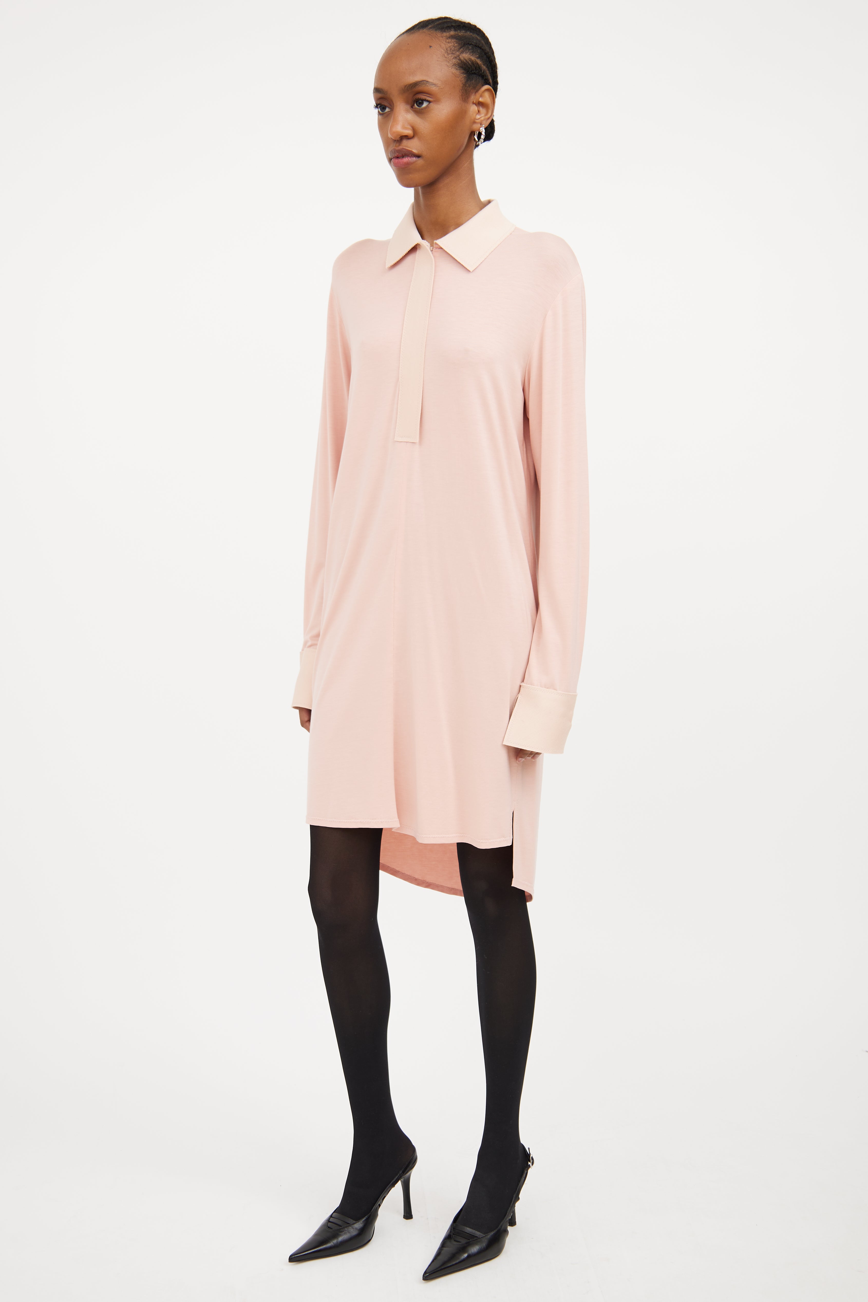 Pre-owned Marie Saint Pierre pink midi dress featuring a pointed collar, long sleeves, high low hem, and quarter zip closure.